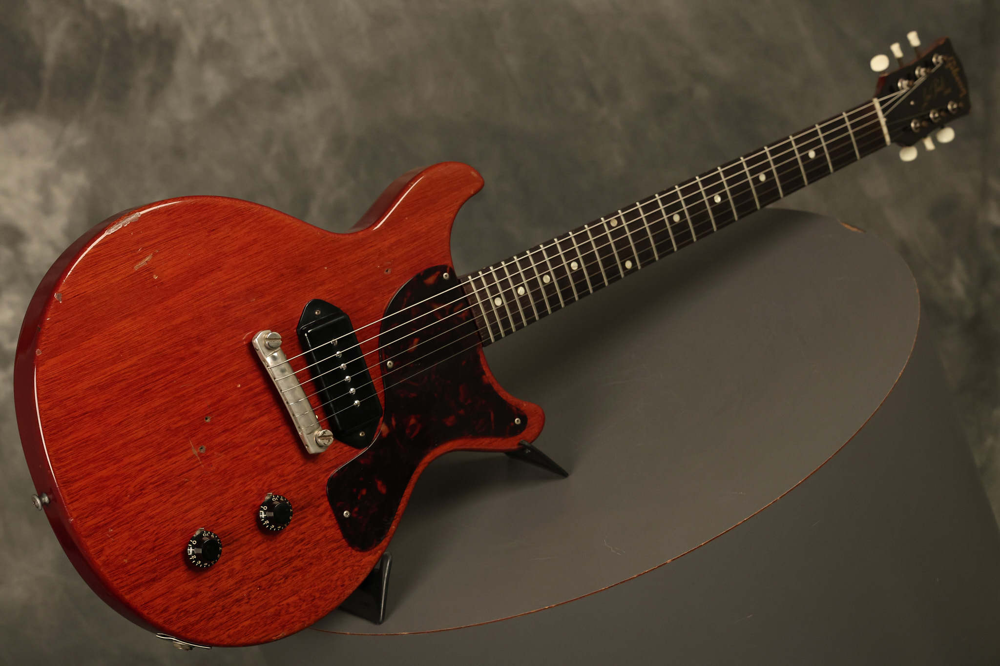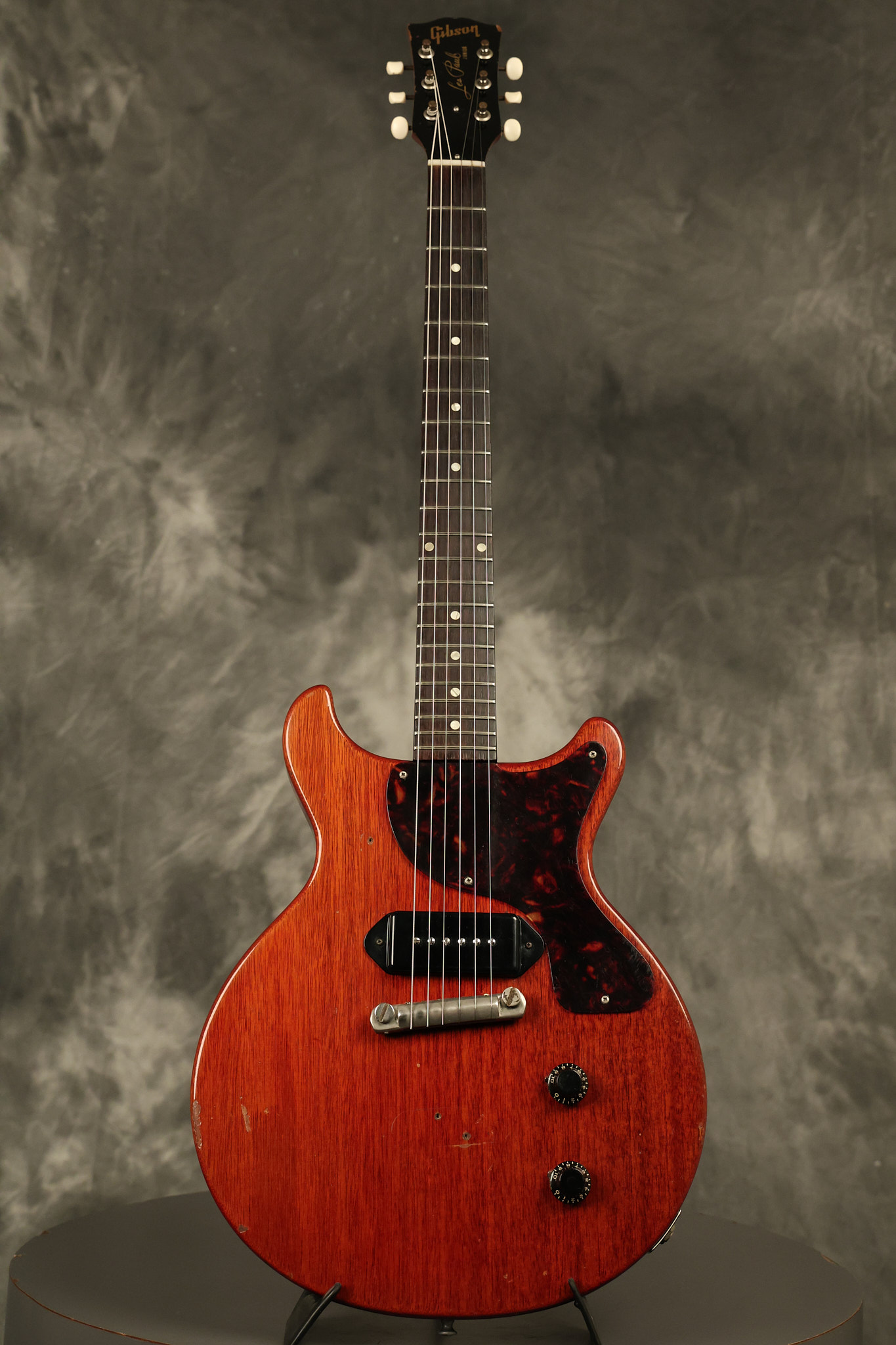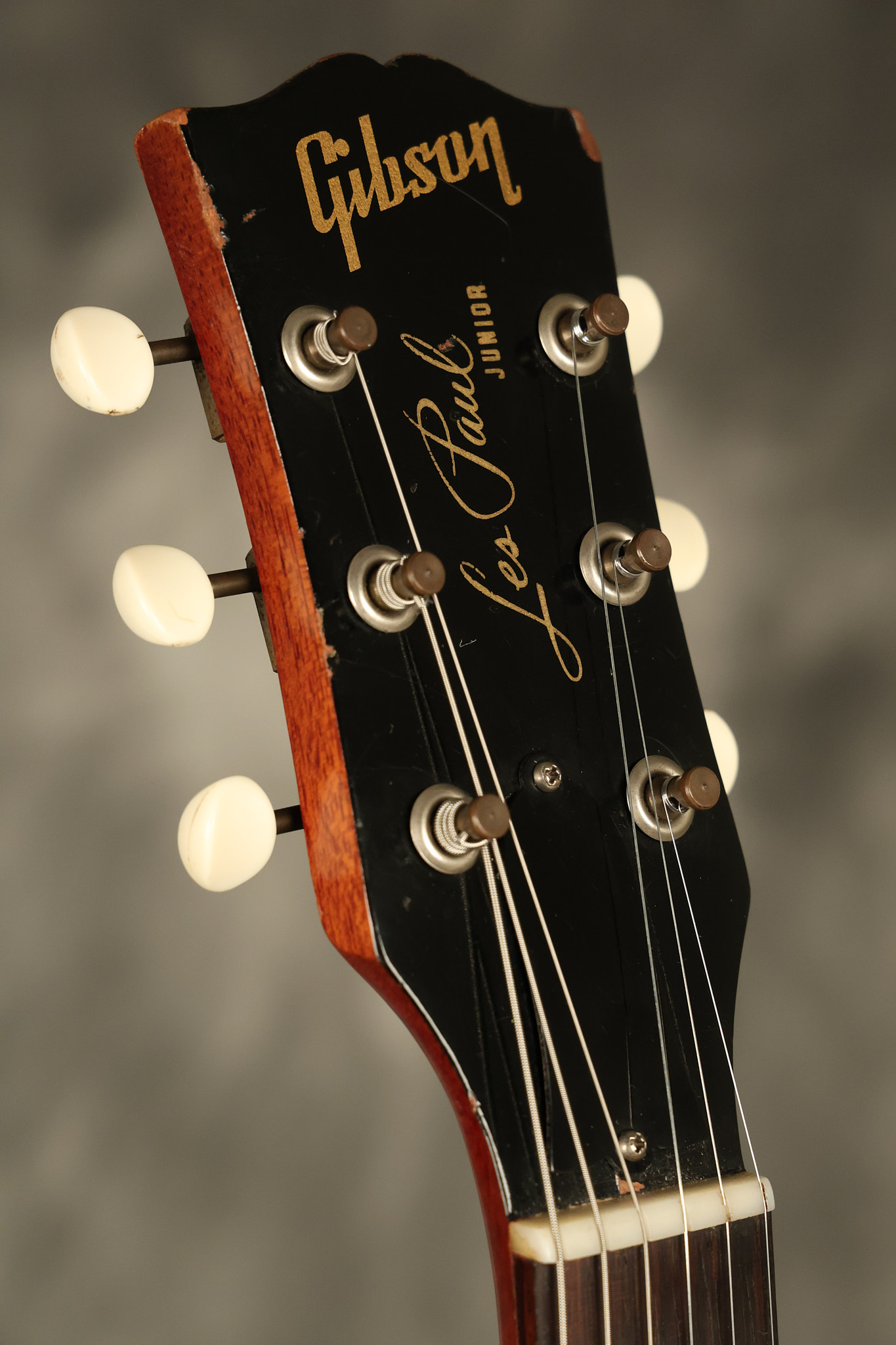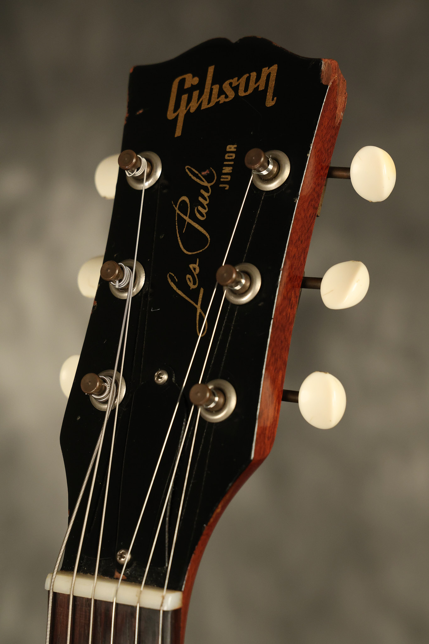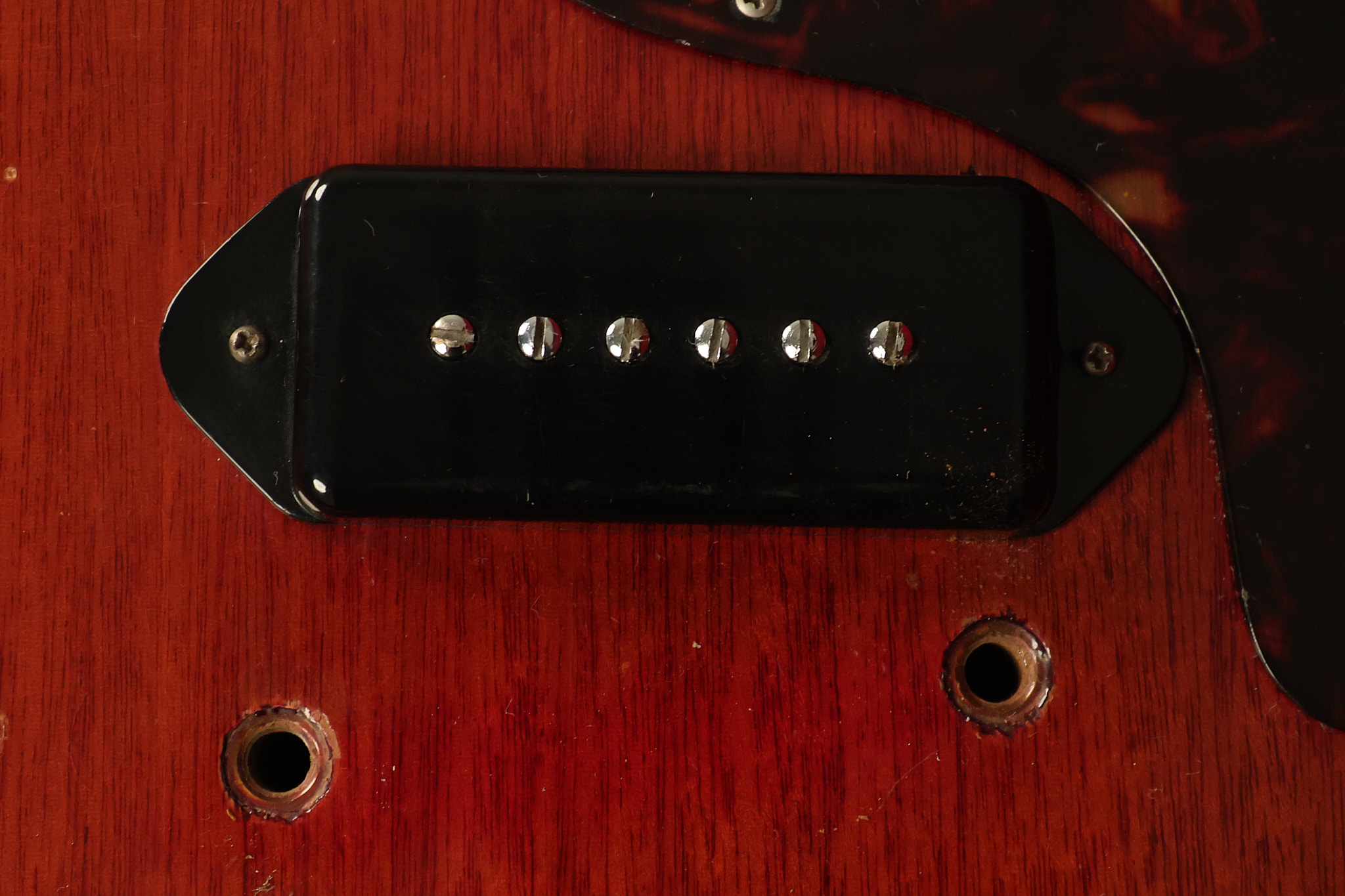 1959 Gibson double-cut Les Paul Junior in its original Cherry finish. It has a great playing neck with great frets. It's all original and includes a later Gibson hardshell case. There are some extra screw holes on the top of the body where something was secured at one time. There are nicks + dings, a small chip out of the top corner of the headstock, a small chip out of the top edge of the pickup cavity, minor finish checking and other cosmetic wear. The guitar itself remains structurally sound. All electronics work and sound great.