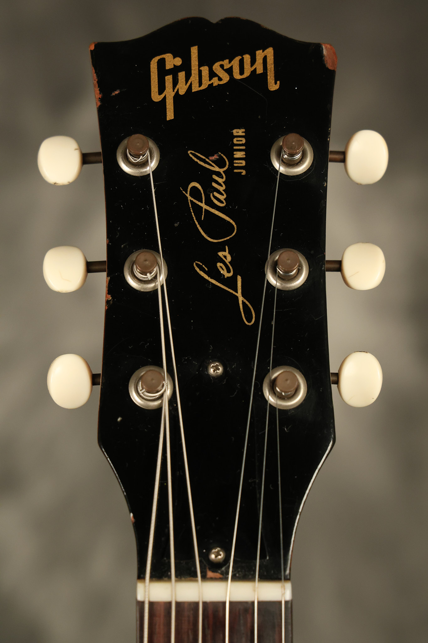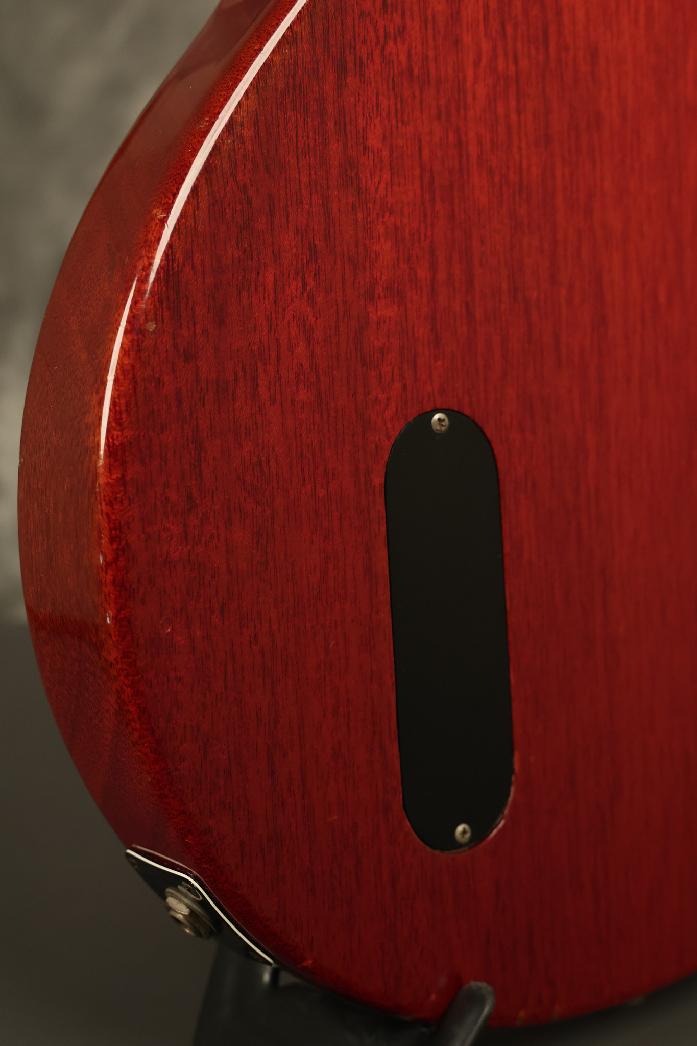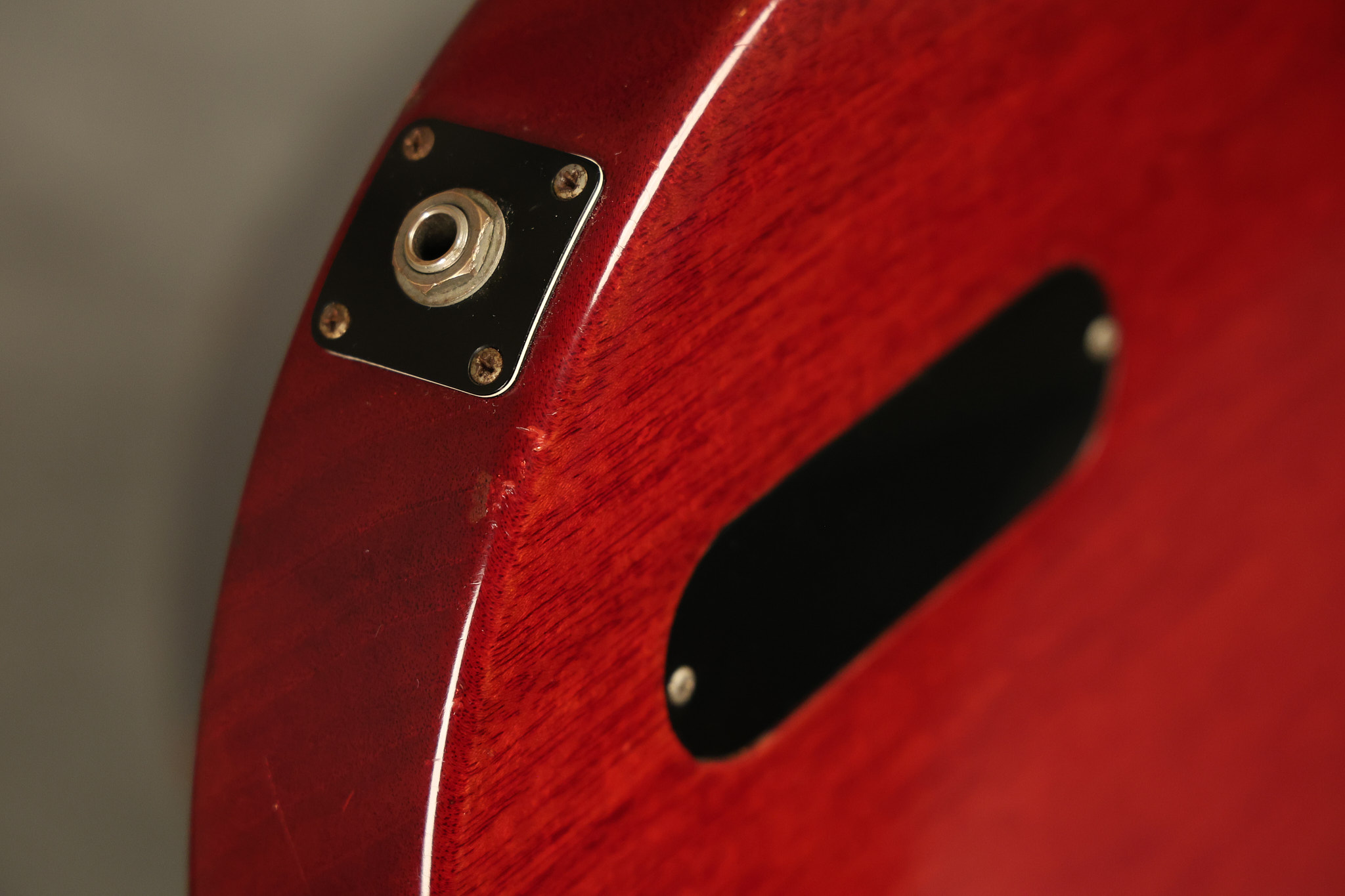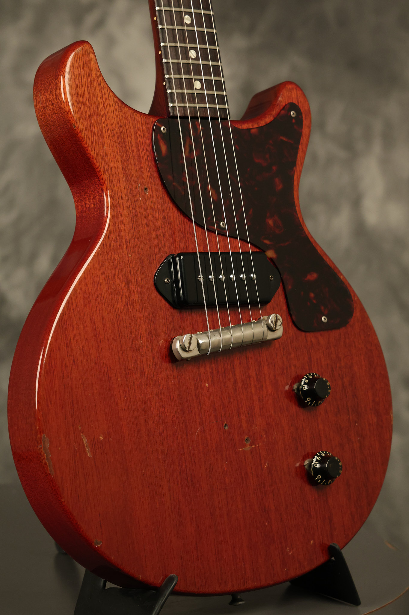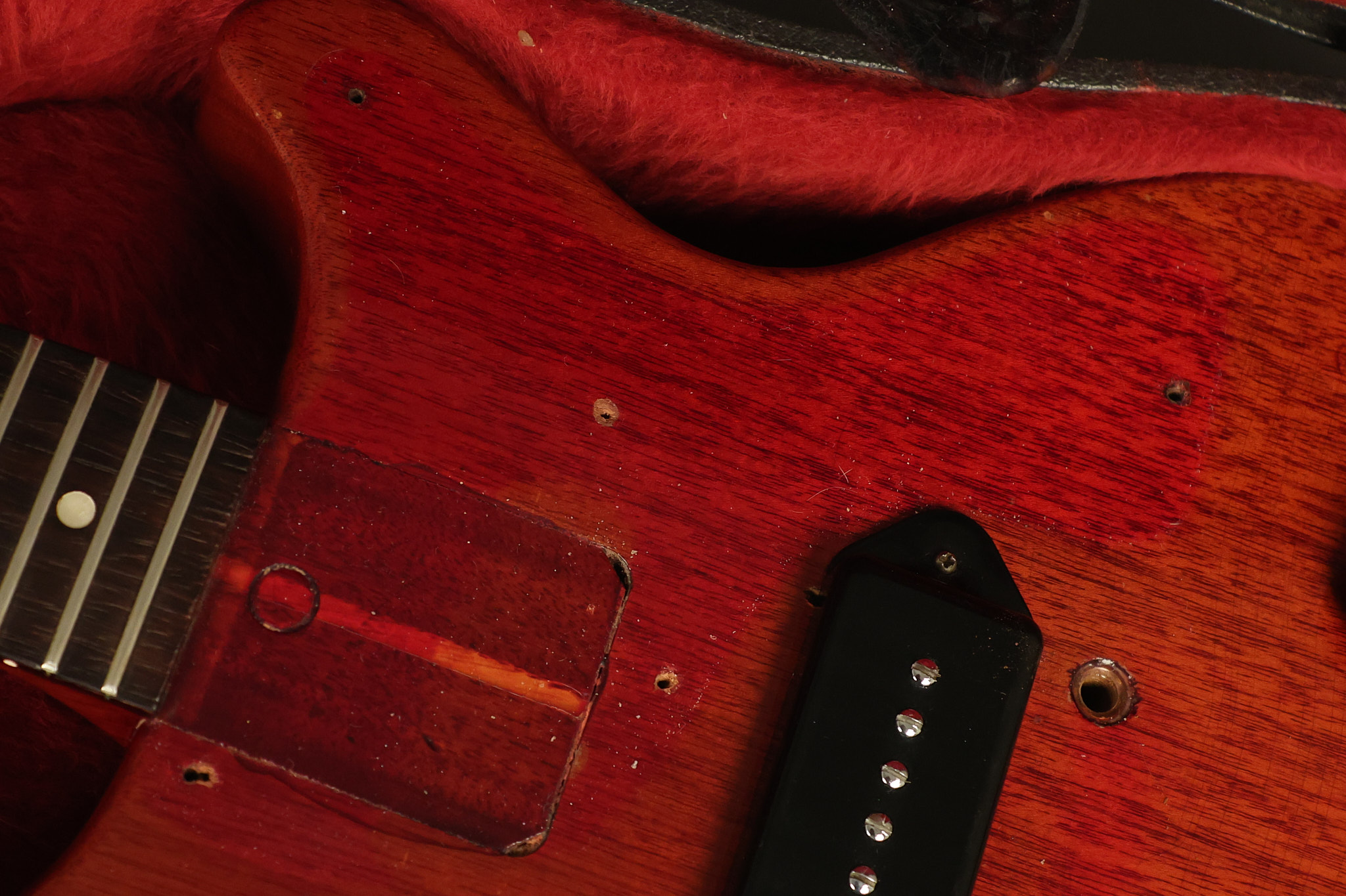 1959 Gibson double-cut Les Paul Junior in its original Cherry finish. It has a great playing neck with great frets. It's all original and includes a later Gibson hardshell case. There are some extra screw holes on the top of the body where something was secured at one time. There are nicks + dings, a small chip out of the top corner of the headstock, a small chip out of the top edge of the pickup cavity, minor finish checking and other cosmetic wear. The guitar itself remains structurally sound. All electronics work and sound great.