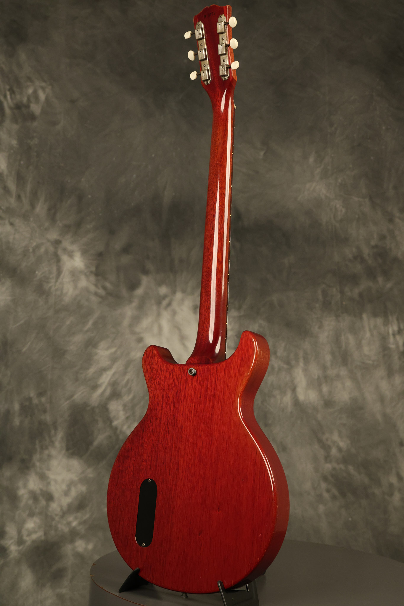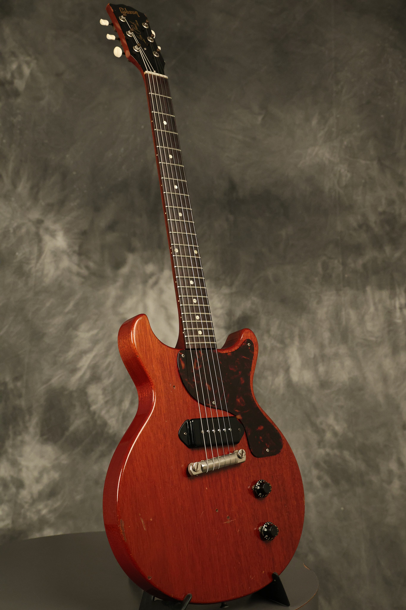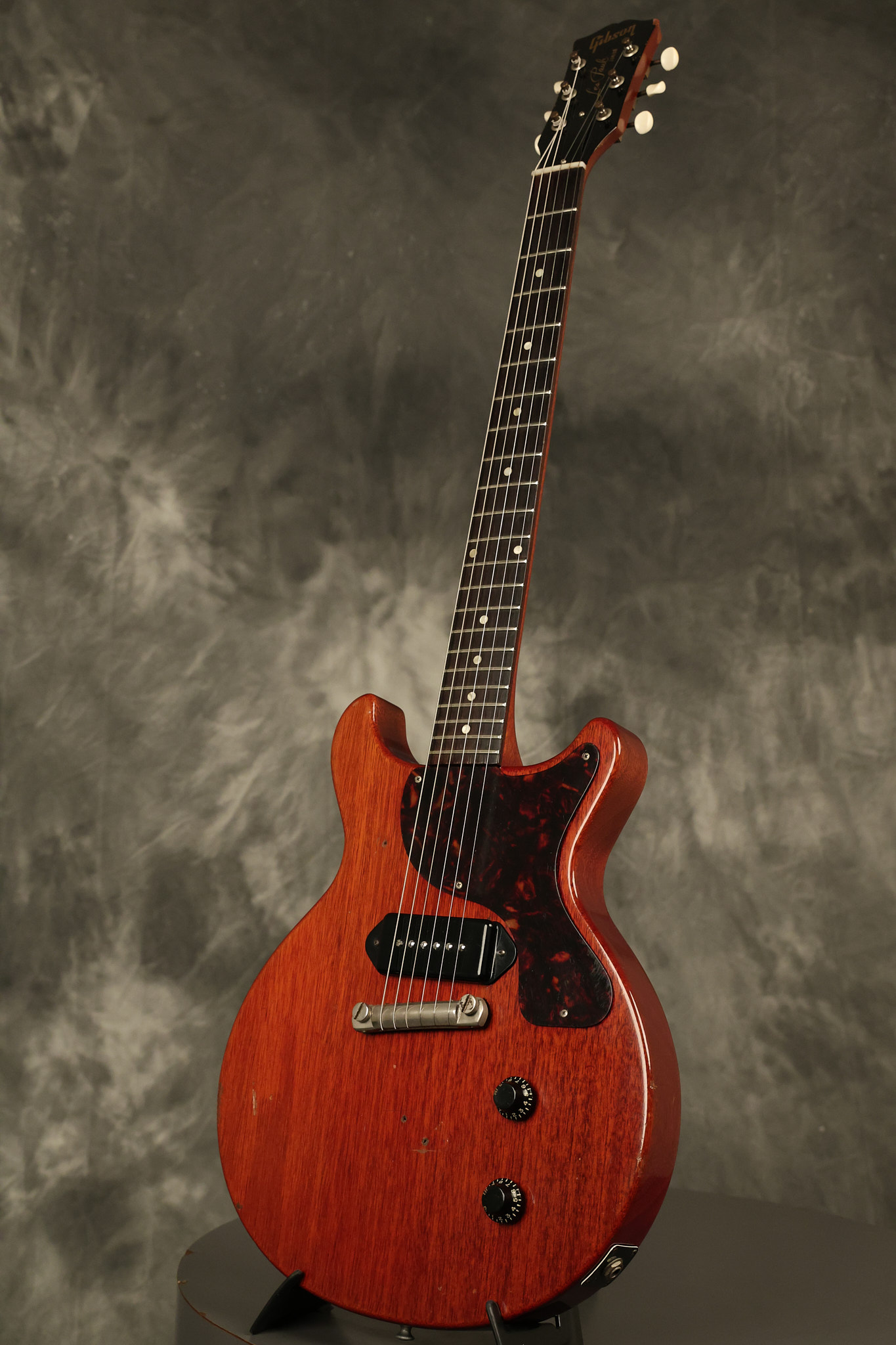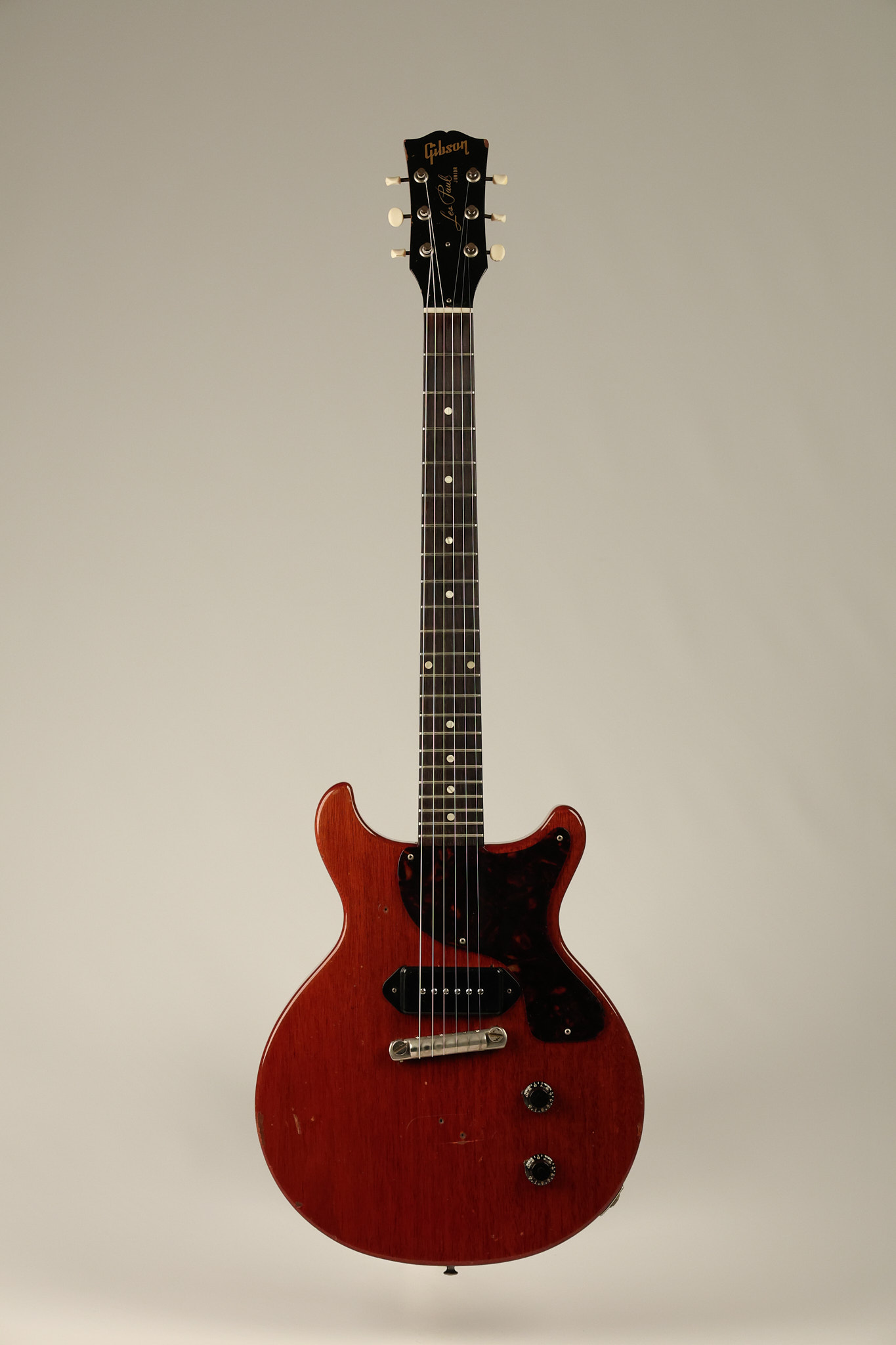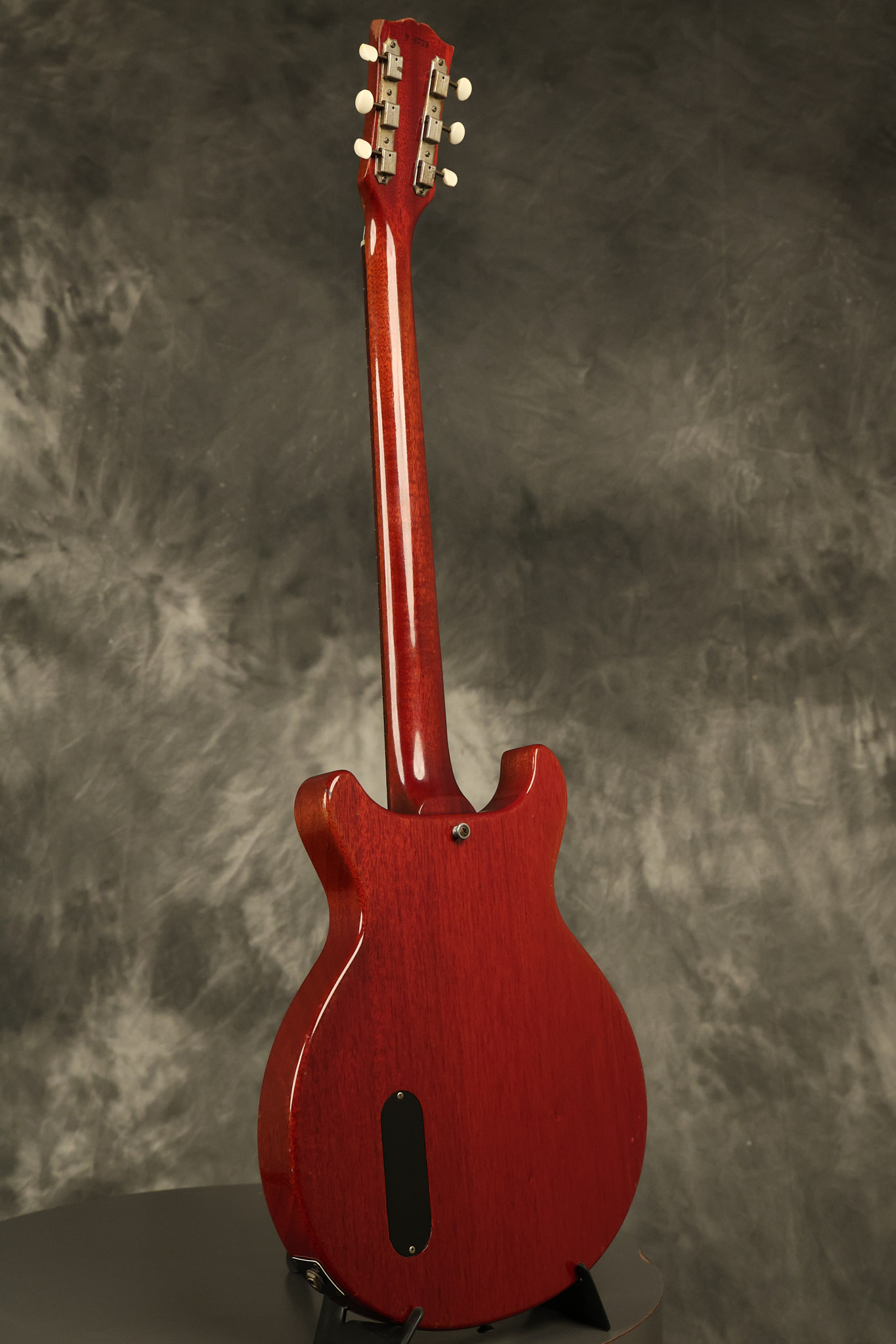 1959 Gibson double-cut Les Paul Junior in its original Cherry finish. It has a great playing neck with great frets. It's all original and includes a later Gibson hardshell case. There are some extra screw holes on the top of the body where something was secured at one time. There are nicks + dings, a small chip out of the top corner of the headstock, a small chip out of the top edge of the pickup cavity, minor finish checking and other cosmetic wear. The guitar itself remains structurally sound. All electronics work and sound great.