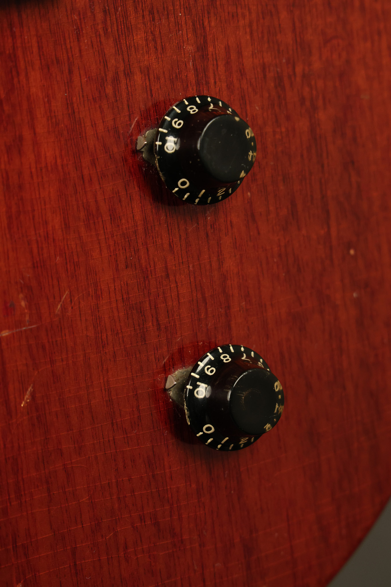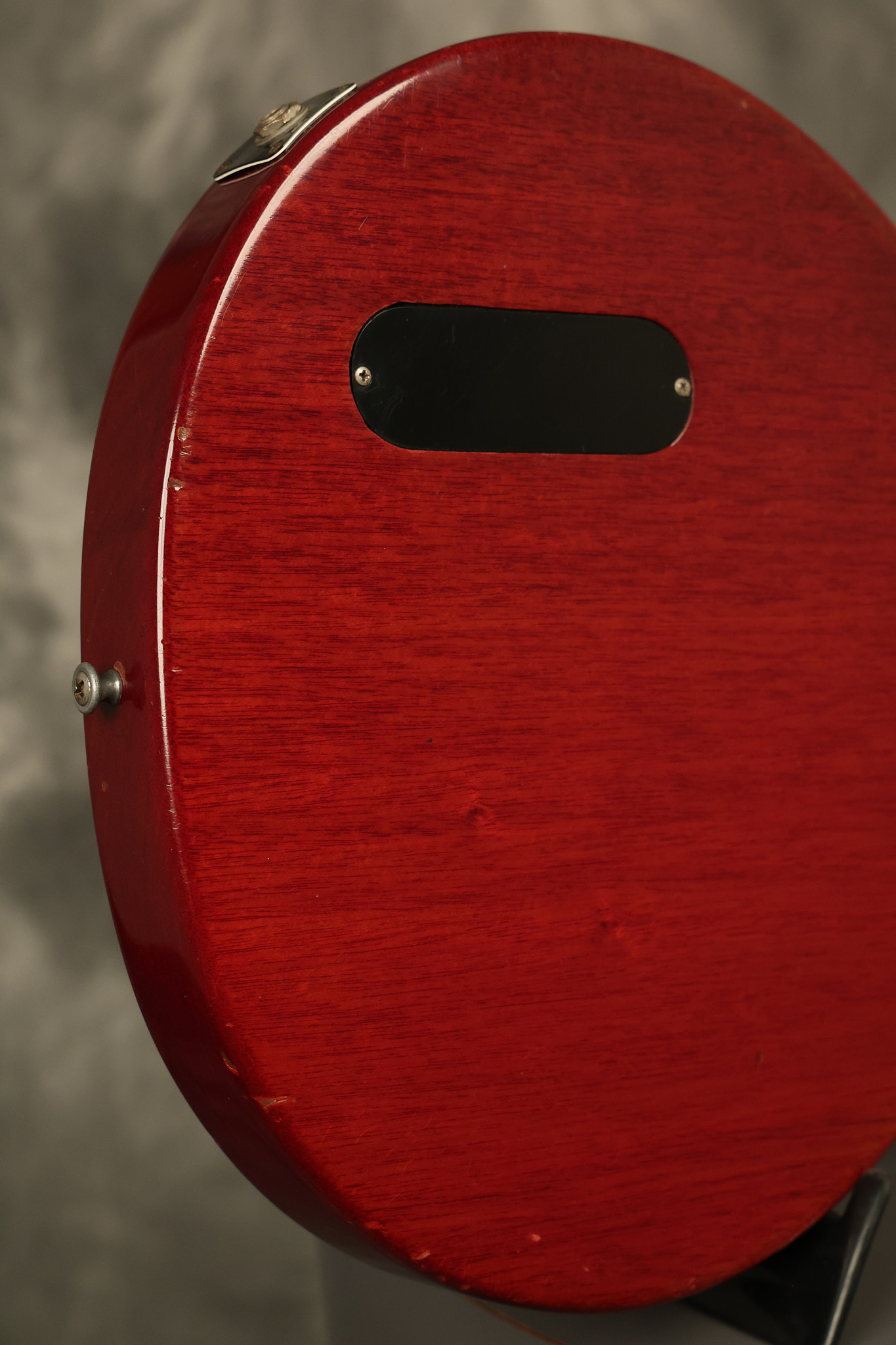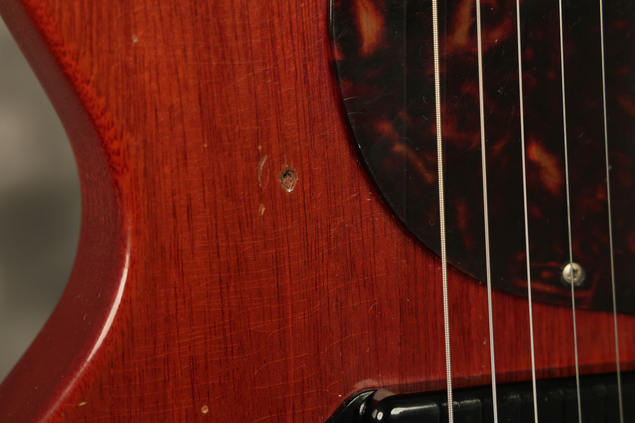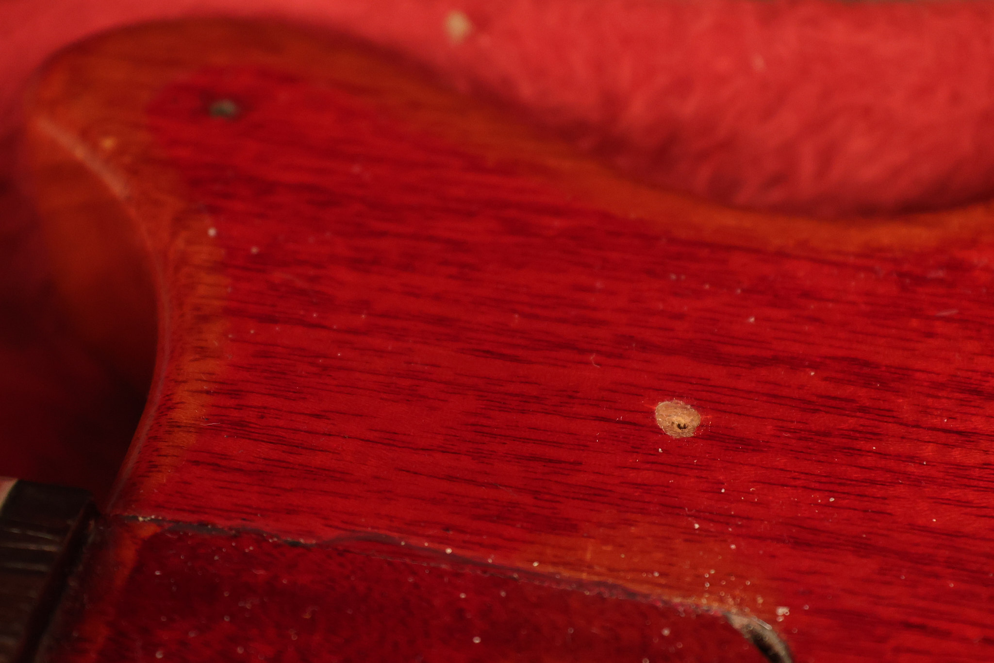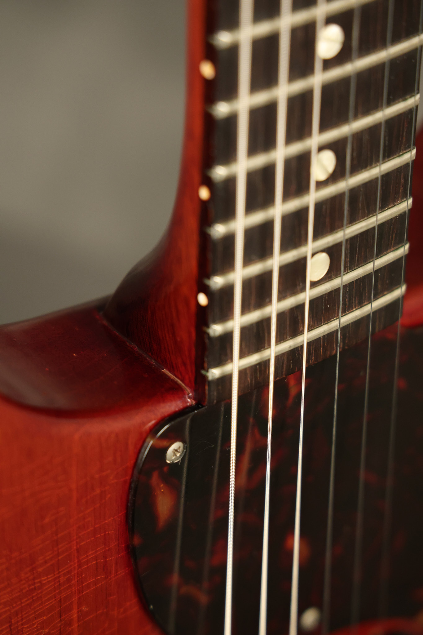 1959 Gibson double-cut Les Paul Junior in its original Cherry finish. It has a great playing neck with great frets. It's all original and includes a later Gibson hardshell case. There are some extra screw holes on the top of the body where something was secured at one time. There are nicks + dings, a small chip out of the top corner of the headstock, a small chip out of the top edge of the pickup cavity, minor finish checking and other cosmetic wear. The guitar itself remains structurally sound. All electronics work and sound great.