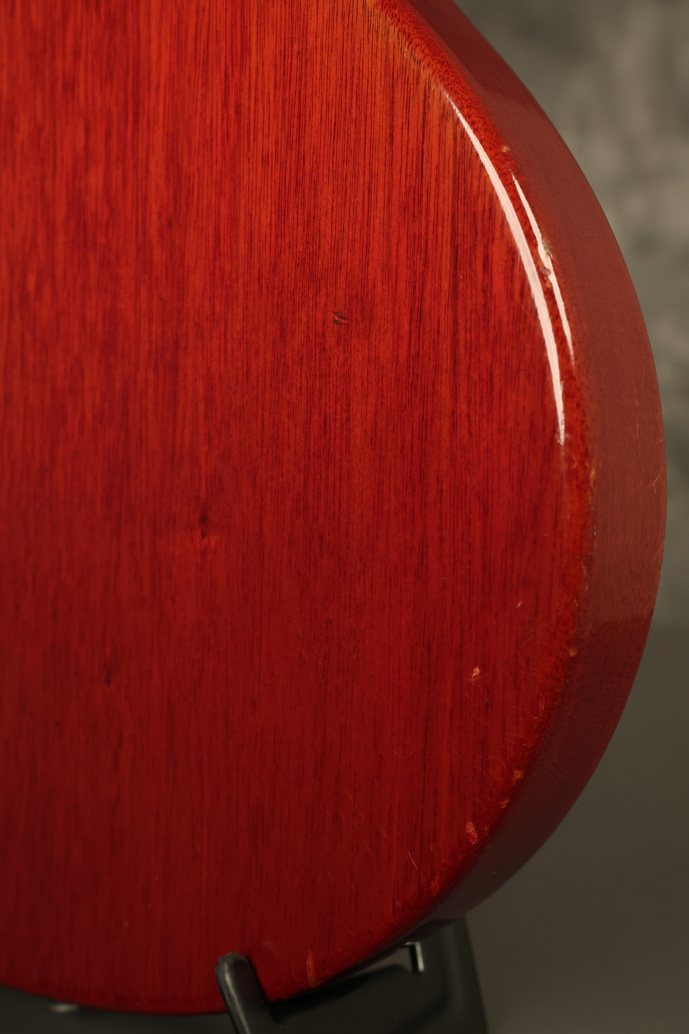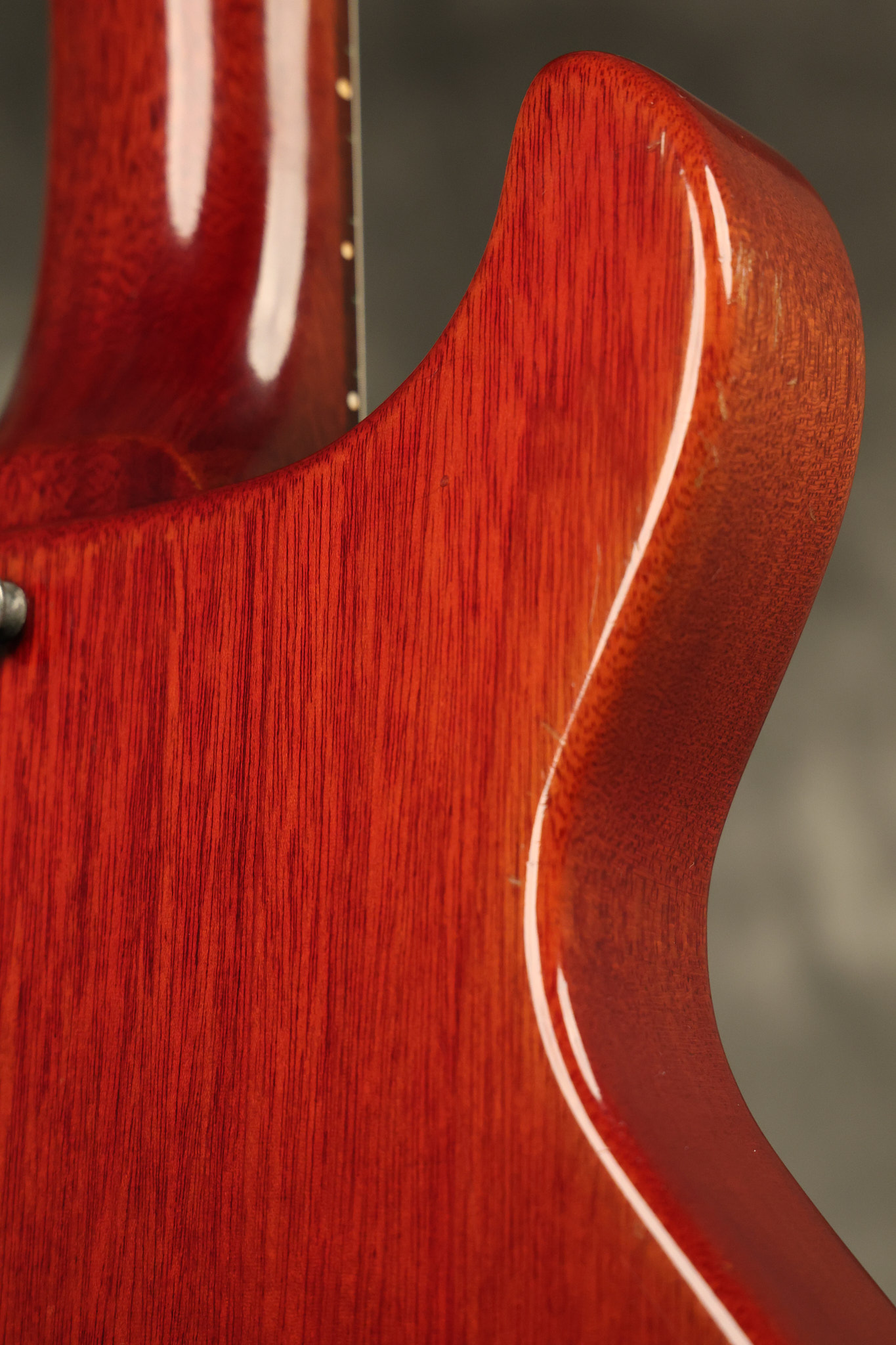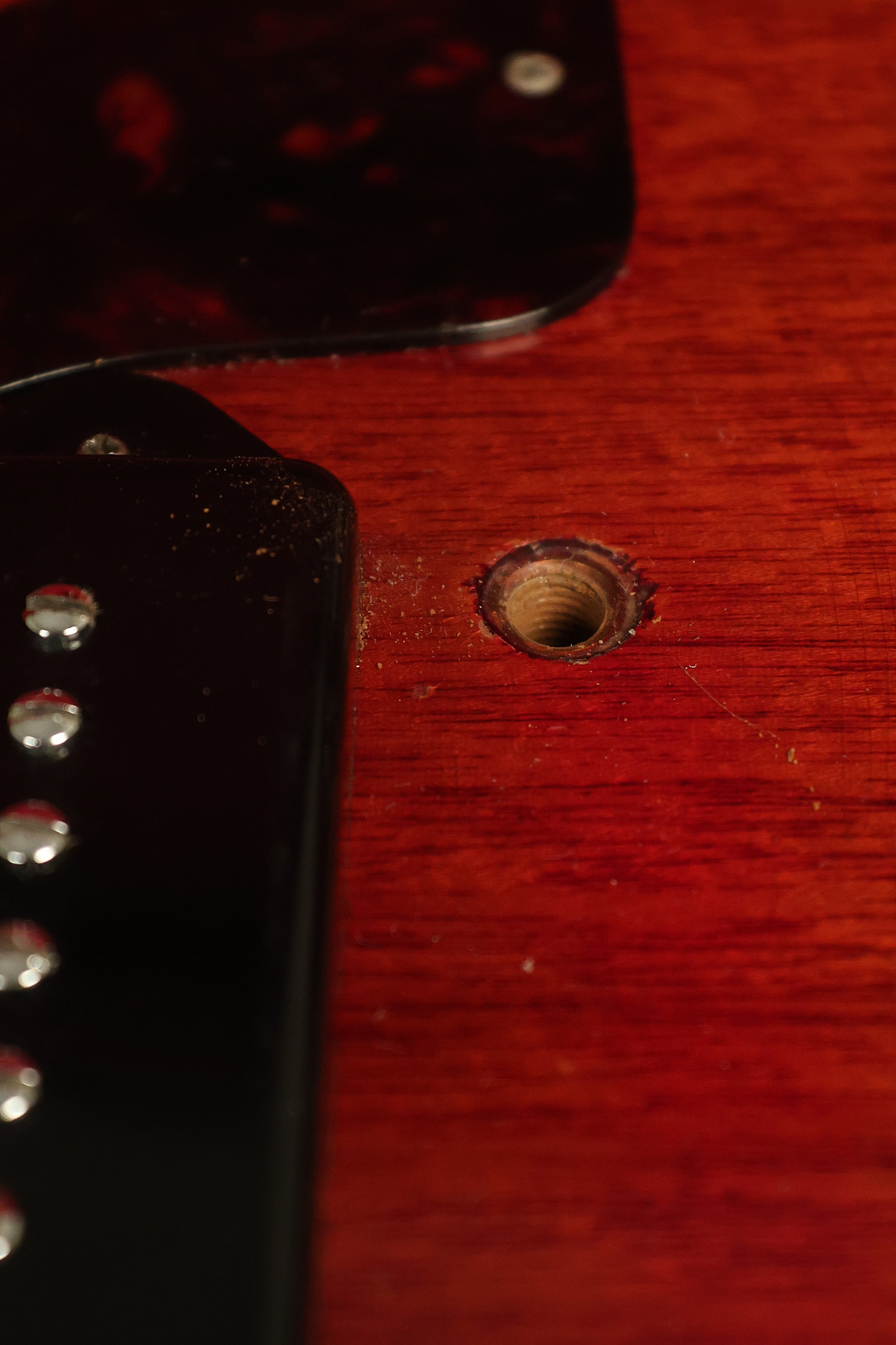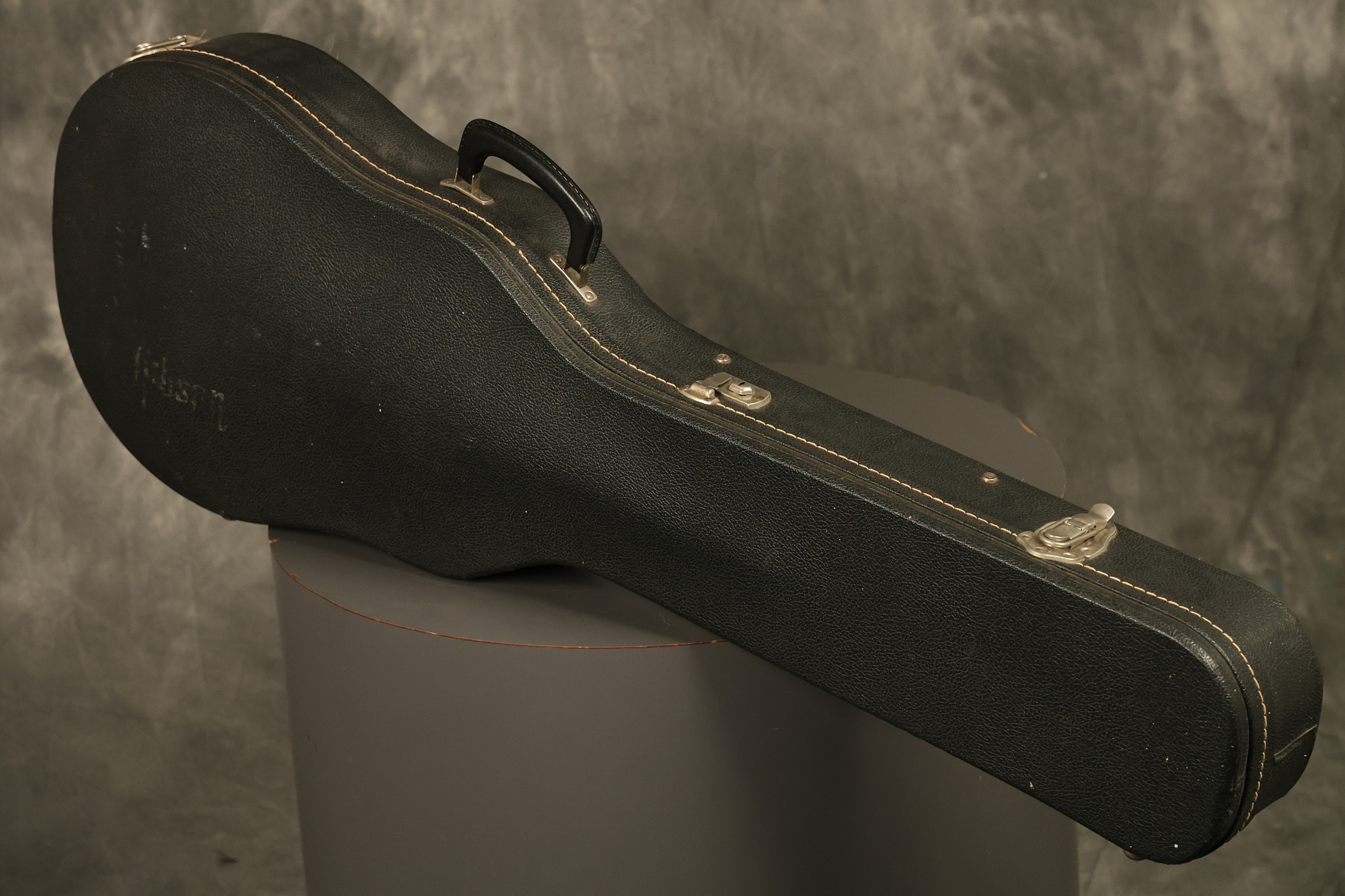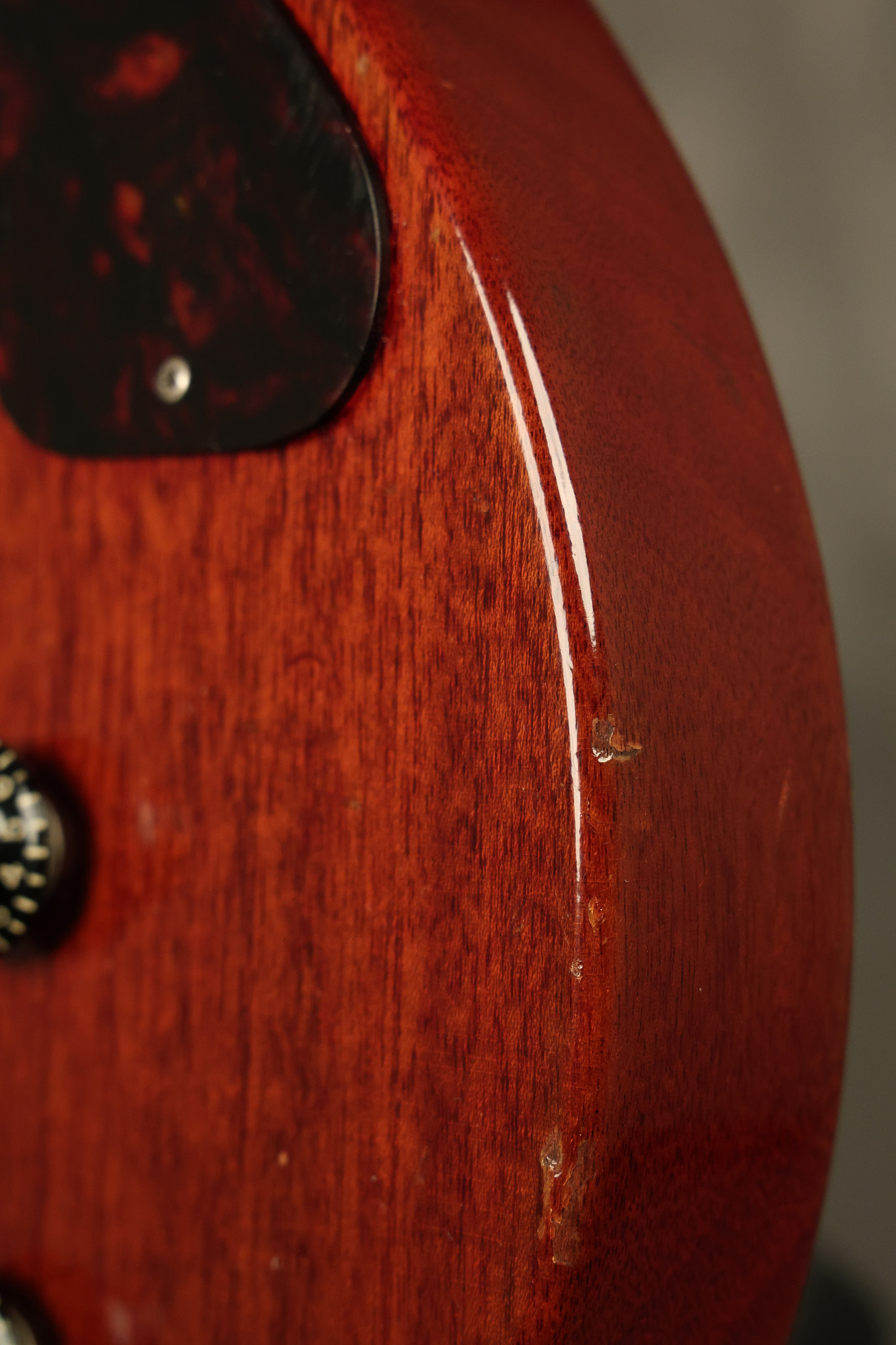 1959 Gibson double-cut Les Paul Junior in its original Cherry finish. It has a great playing neck with great frets. It's all original and includes a later Gibson hardshell case. There are some extra screw holes on the top of the body where something was secured at one time. There are nicks + dings, a small chip out of the top corner of the headstock, a small chip out of the top edge of the pickup cavity, minor finish checking and other cosmetic wear. The guitar itself remains structurally sound. All electronics work and sound great.