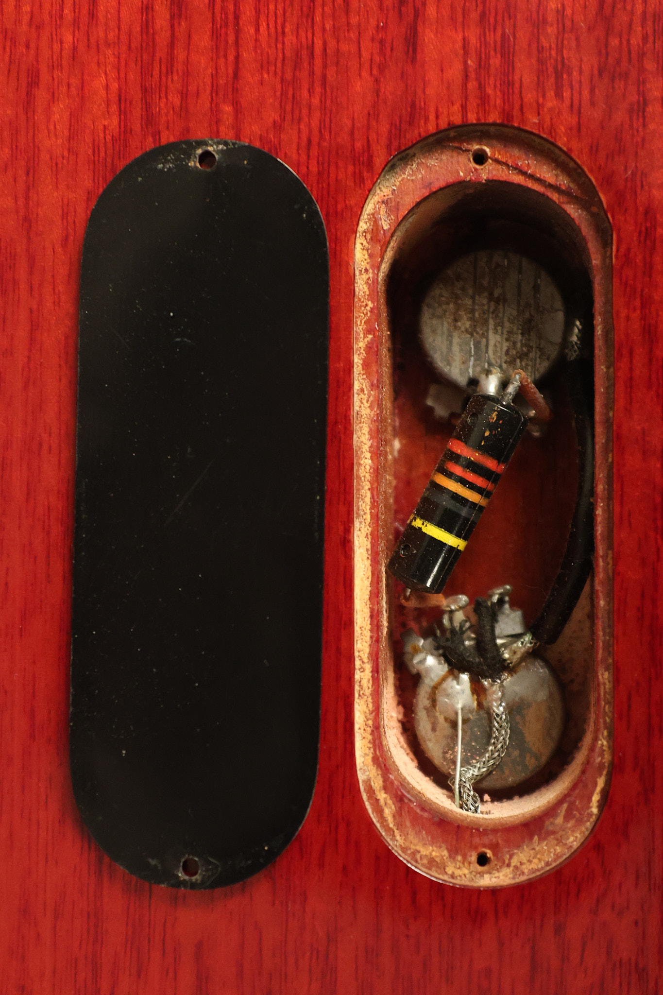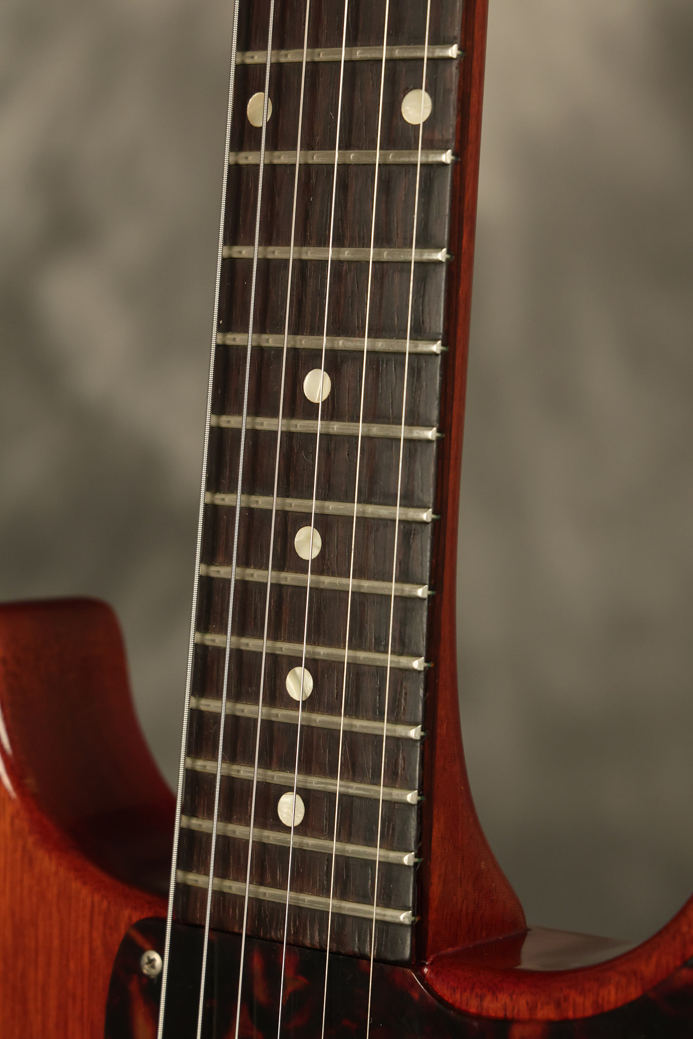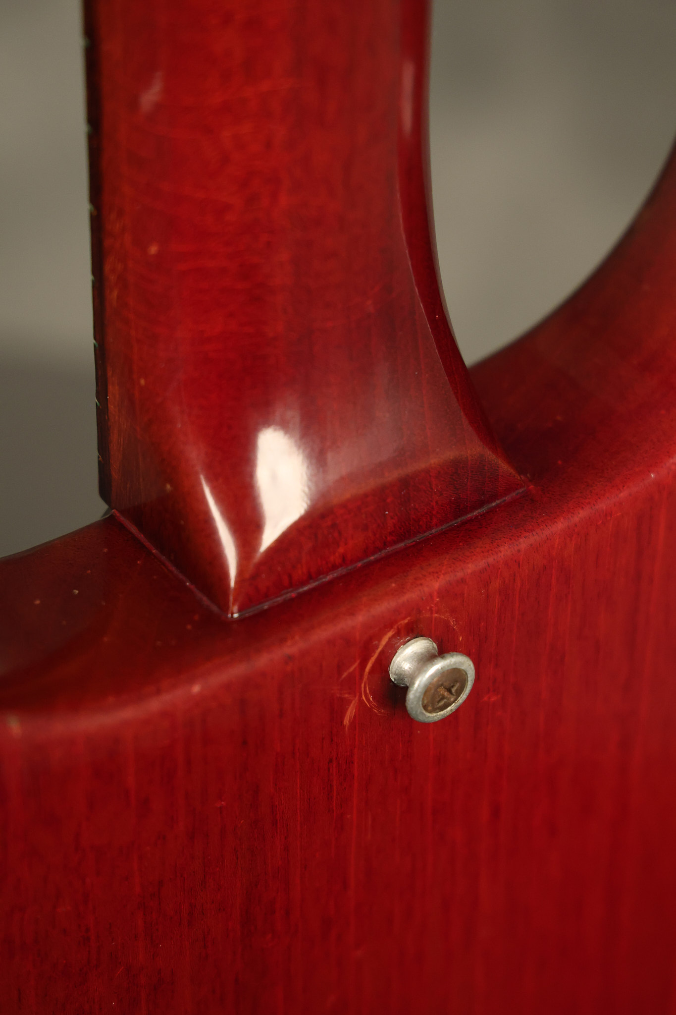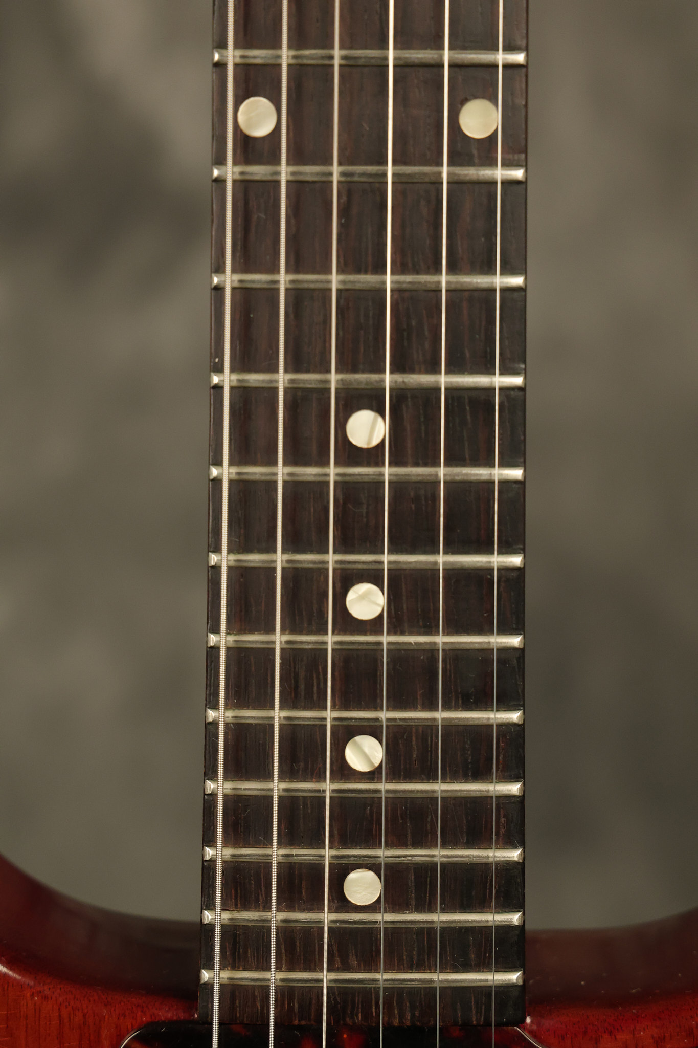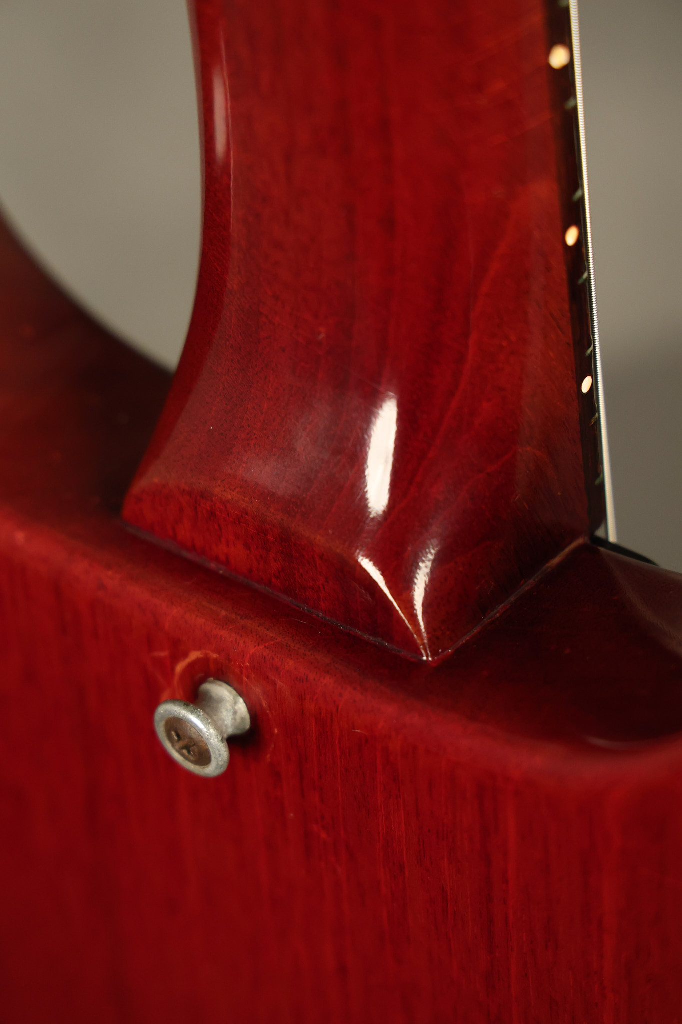 1959 Gibson double-cut Les Paul Junior in its original Cherry finish. It has a great playing neck with great frets. It's all original and includes a later Gibson hardshell case. There are some extra screw holes on the top of the body where something was secured at one time. There are nicks + dings, a small chip out of the top corner of the headstock, a small chip out of the top edge of the pickup cavity, minor finish checking and other cosmetic wear. The guitar itself remains structurally sound. All electronics work and sound great.