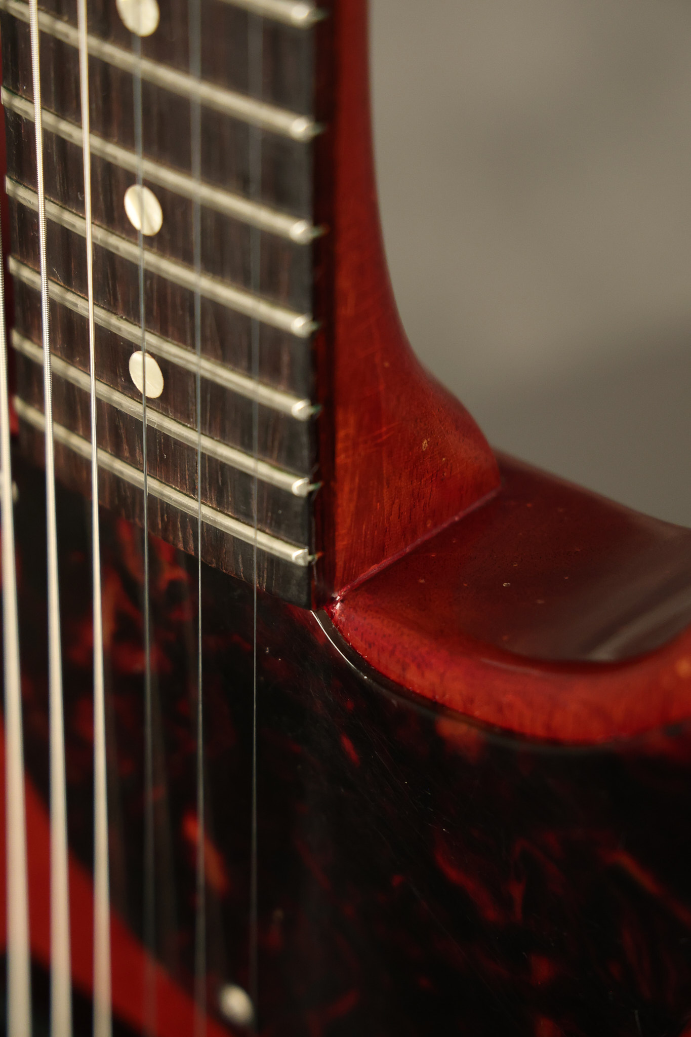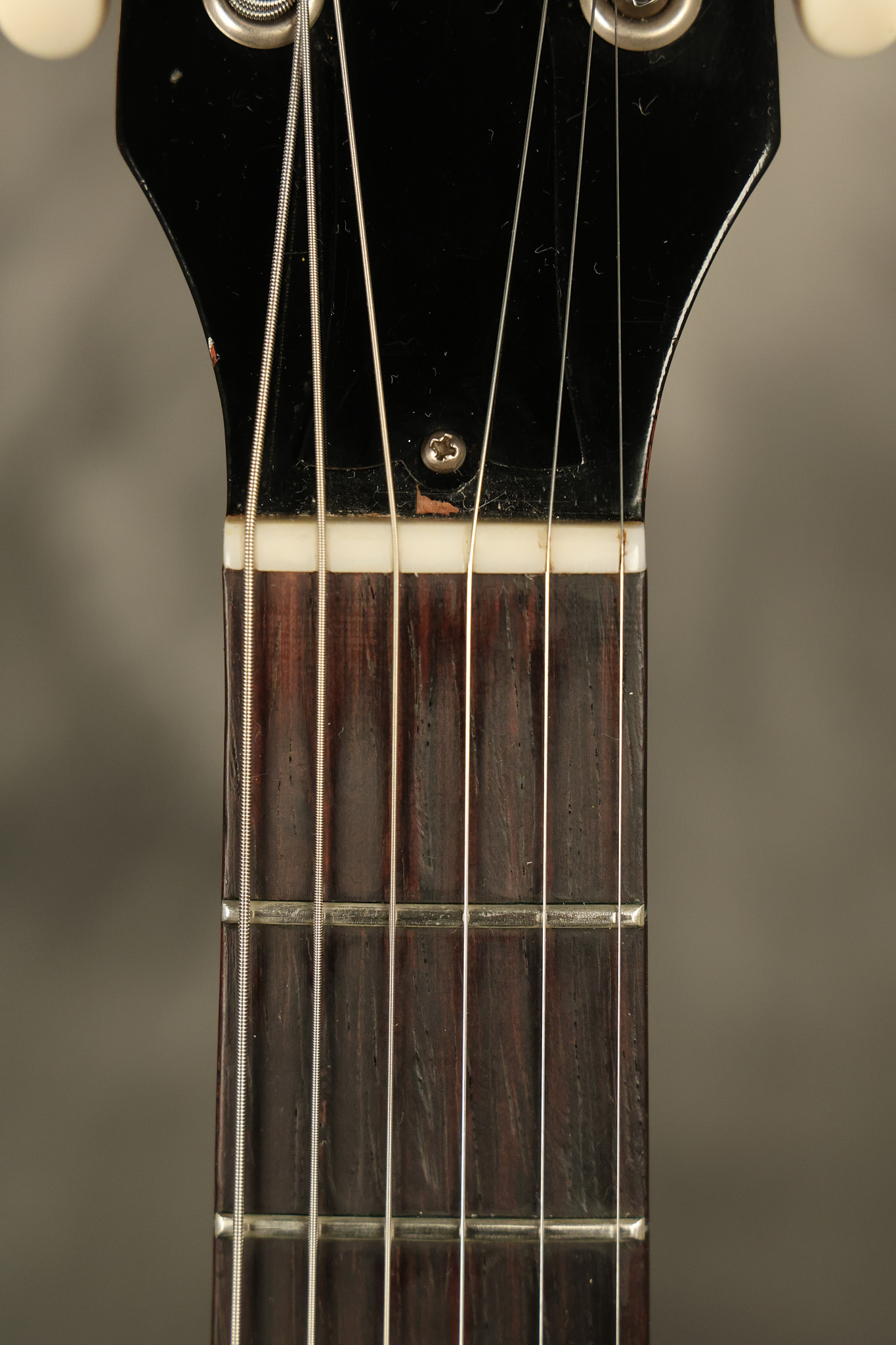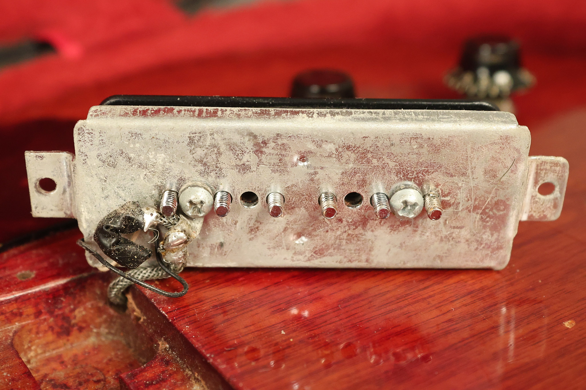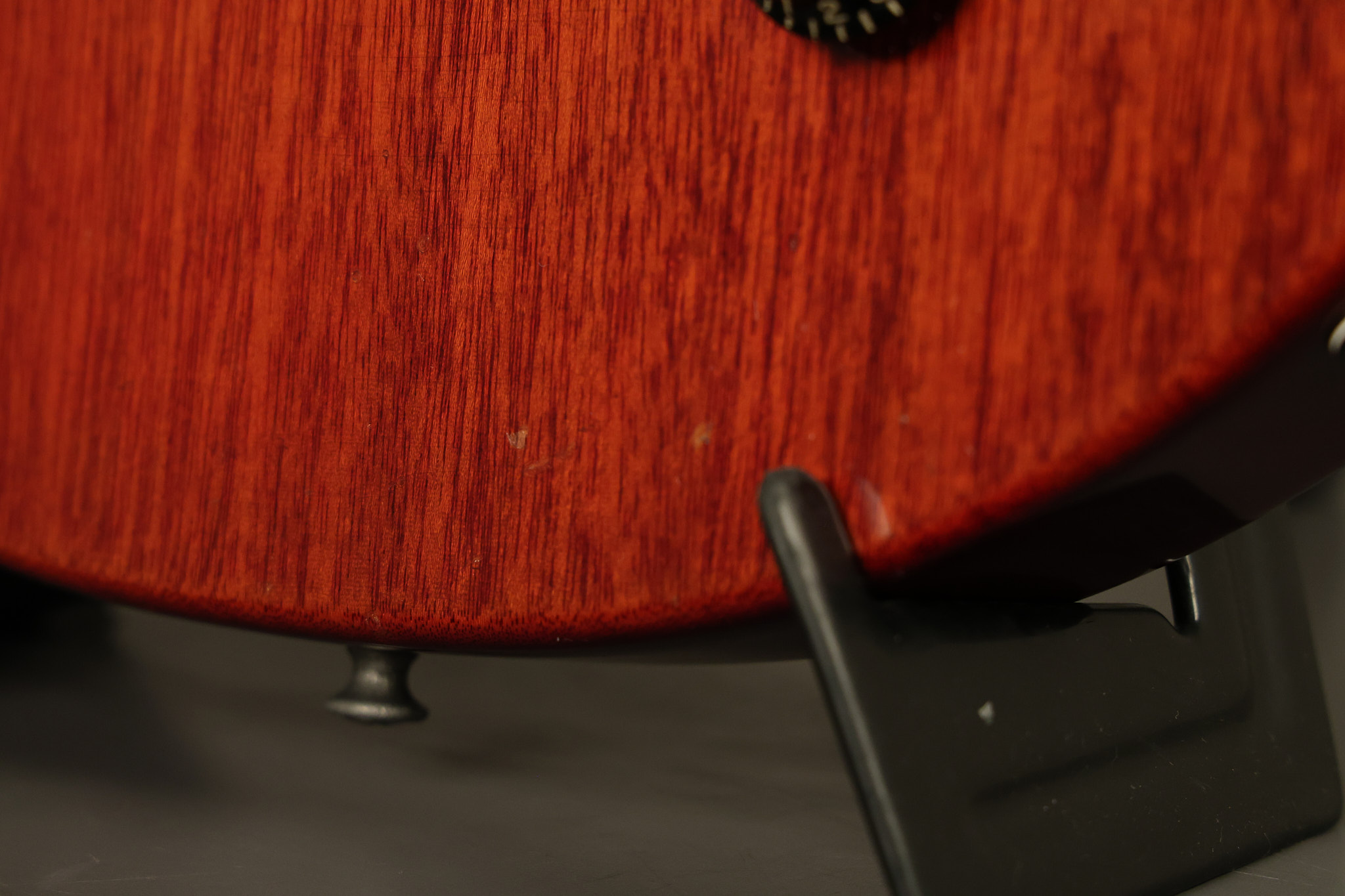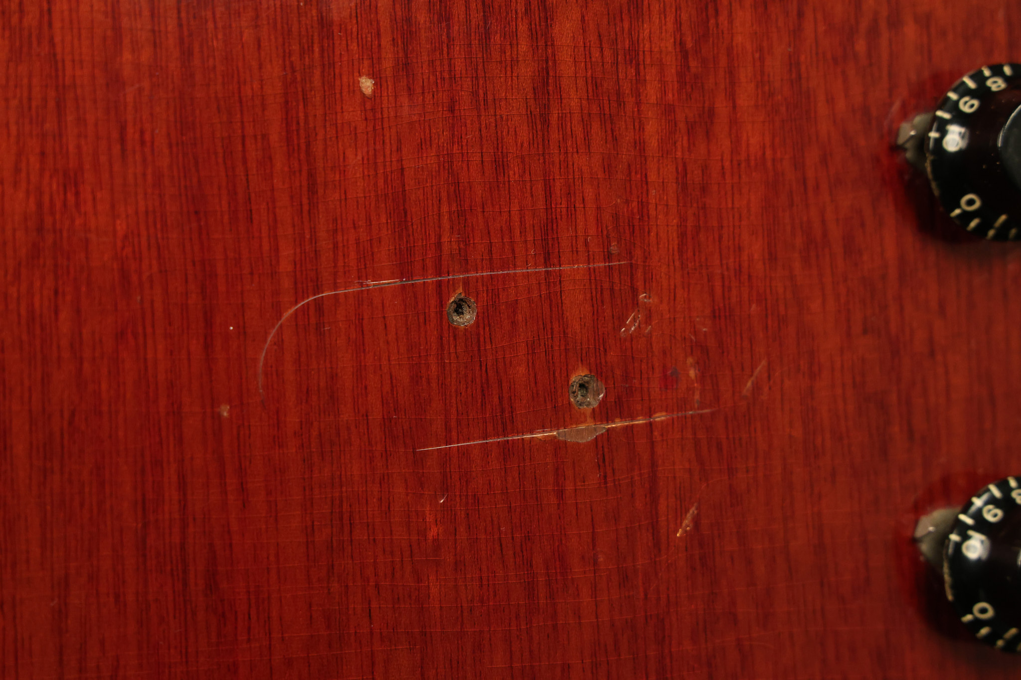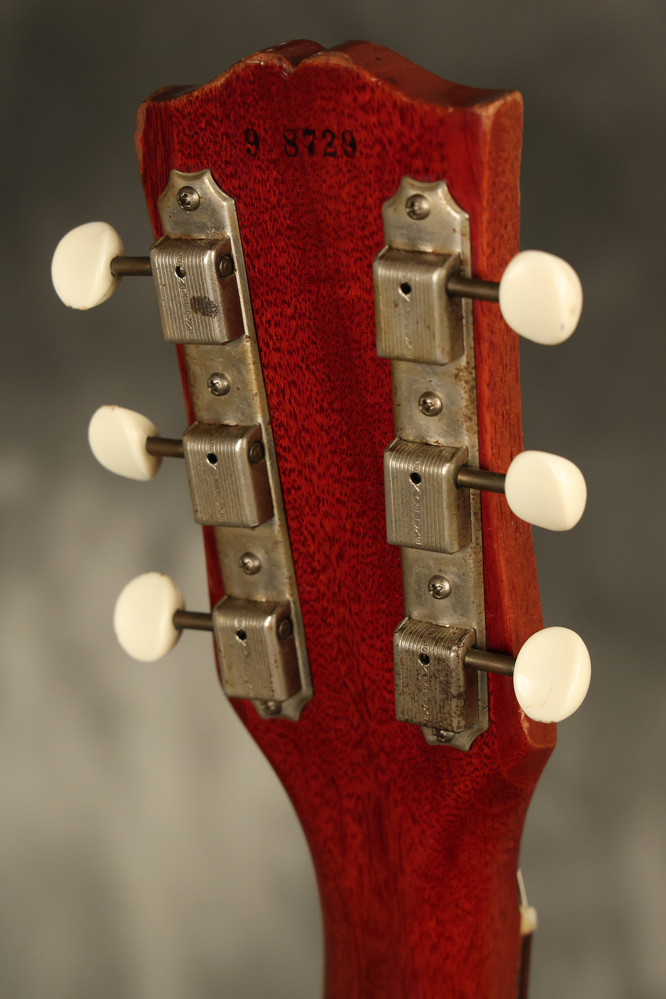 1959 Gibson double-cut Les Paul Junior in its original Cherry finish. It has a great playing neck with great frets. It's all original and includes a later Gibson hardshell case. There are some extra screw holes on the top of the body where something was secured at one time. There are nicks + dings, a small chip out of the top corner of the headstock, a small chip out of the top edge of the pickup cavity, minor finish checking and other cosmetic wear. The guitar itself remains structurally sound. All electronics work and sound great.