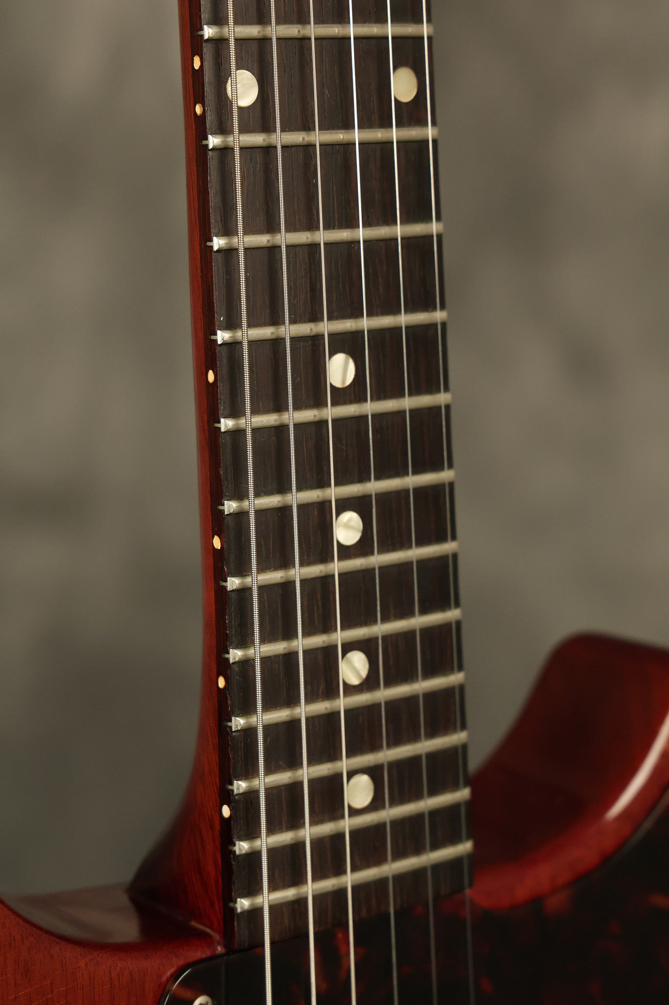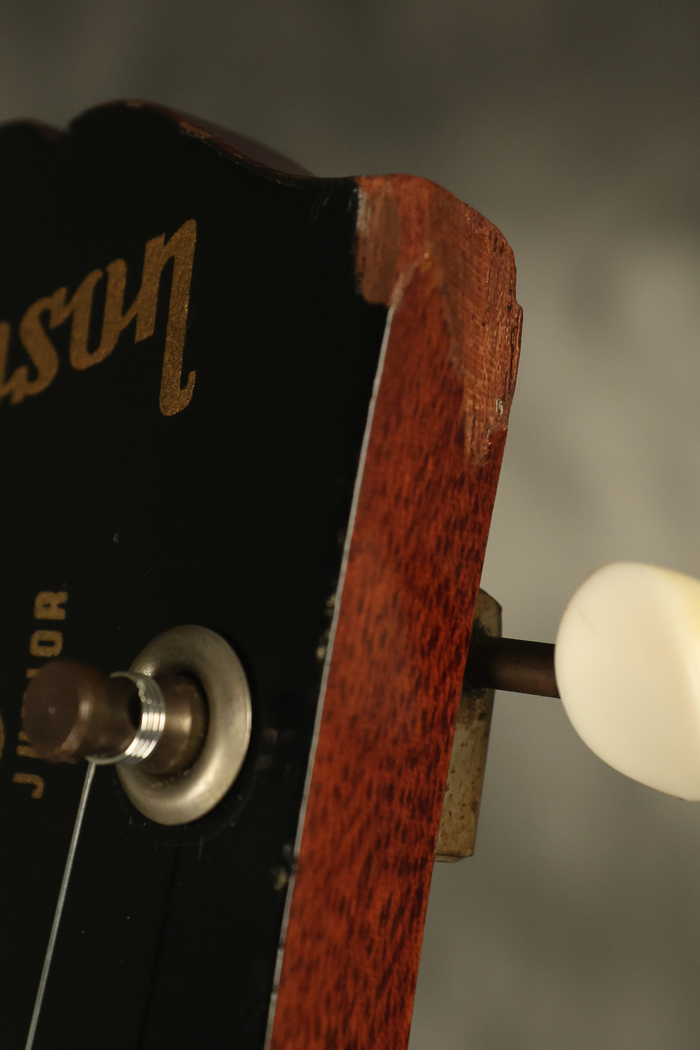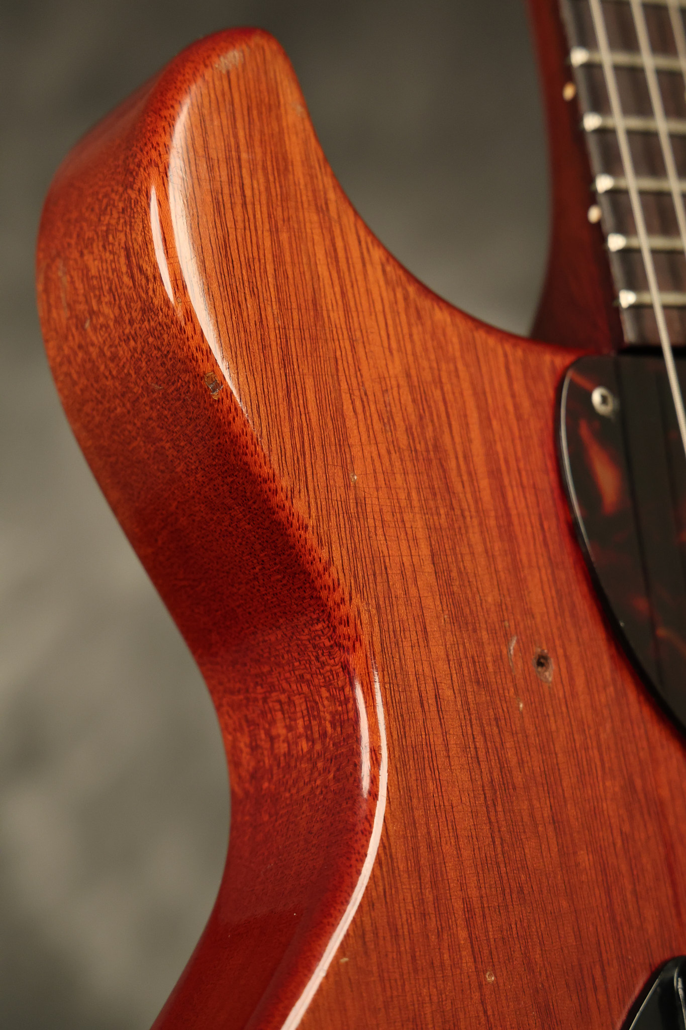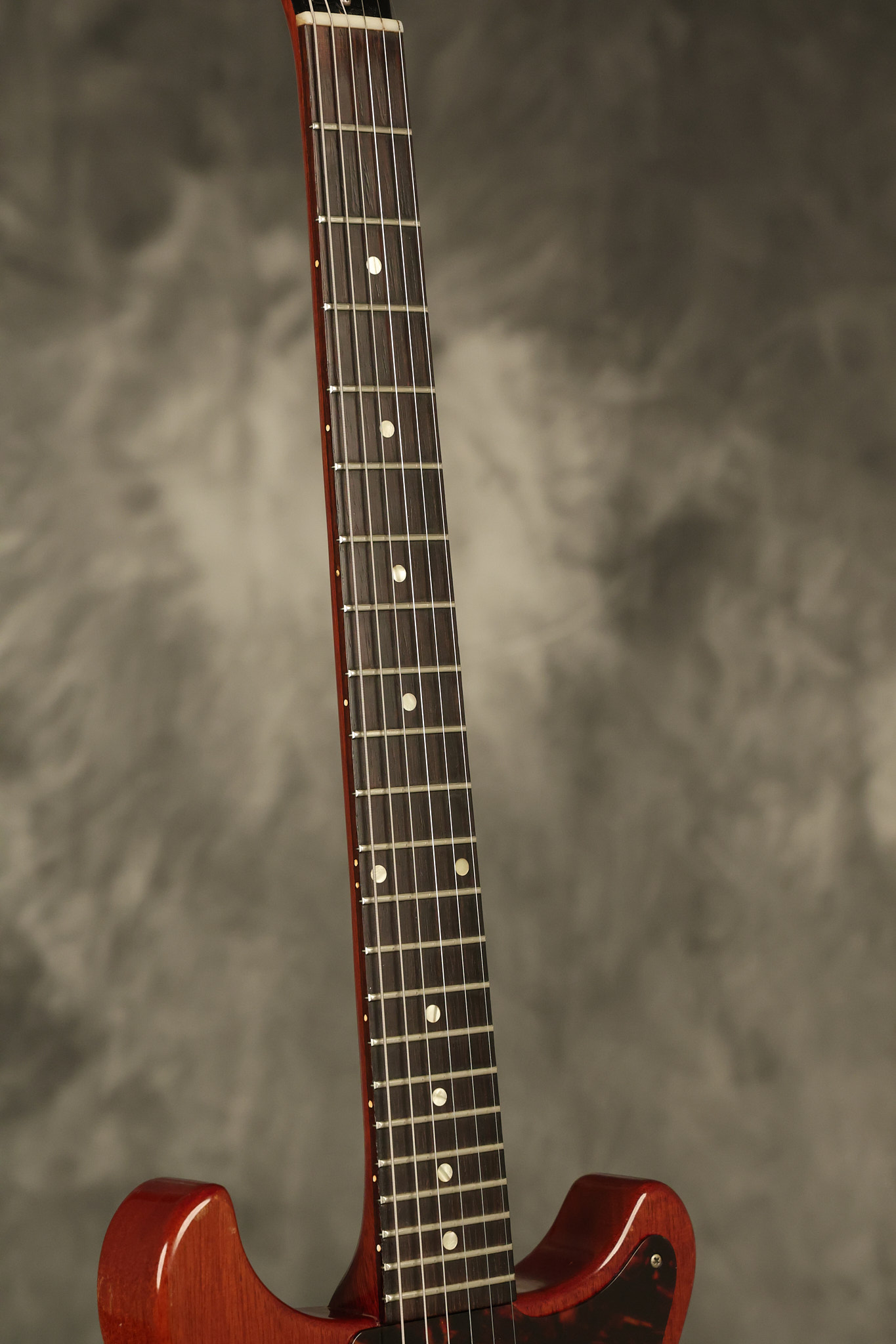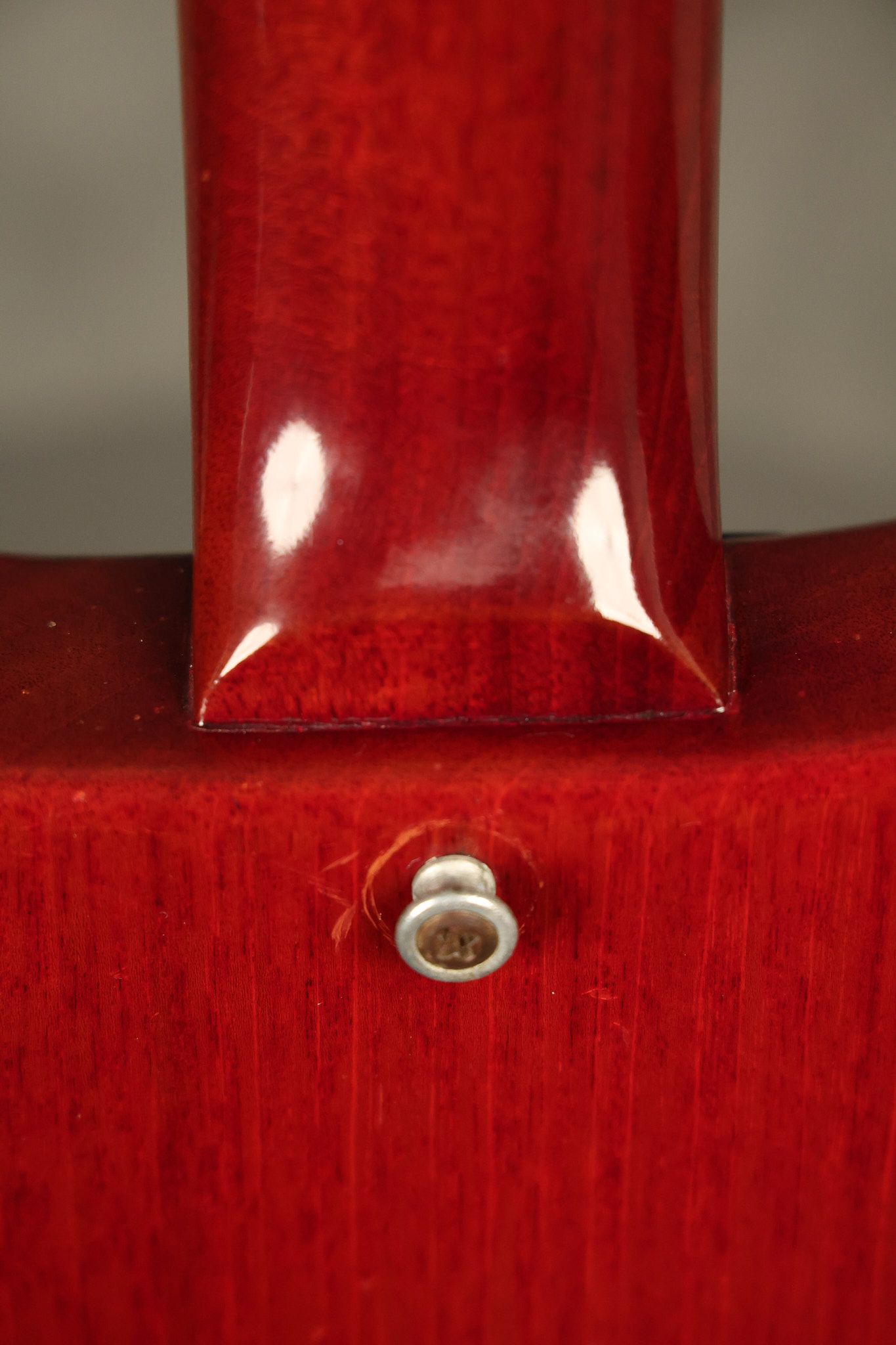 1959 Gibson double-cut Les Paul Junior in its original Cherry finish. It has a great playing neck with great frets. It's all original and includes a later Gibson hardshell case. There are some extra screw holes on the top of the body where something was secured at one time. There are nicks + dings, a small chip out of the top corner of the headstock, a small chip out of the top edge of the pickup cavity, minor finish checking and other cosmetic wear. The guitar itself remains structurally sound. All electronics work and sound great.