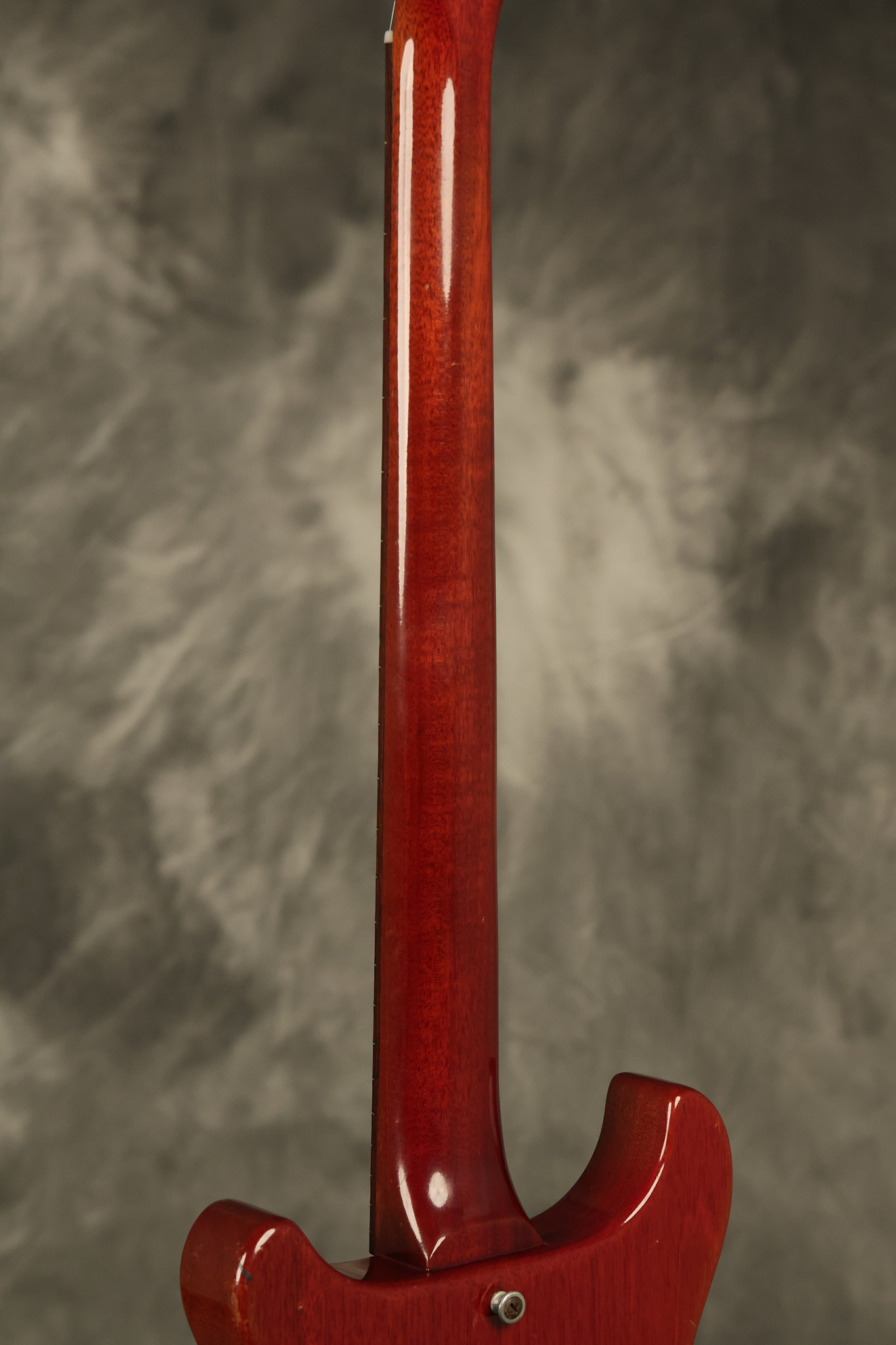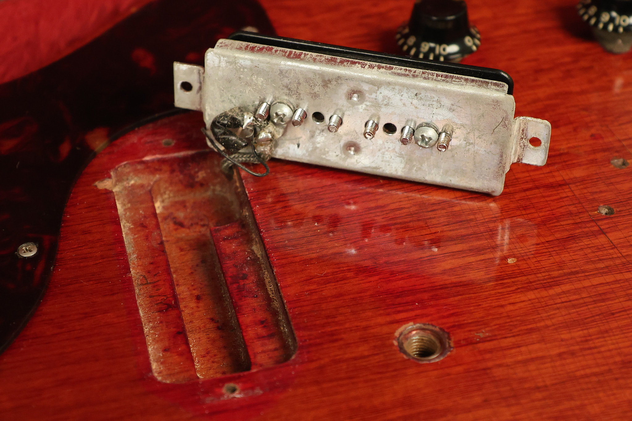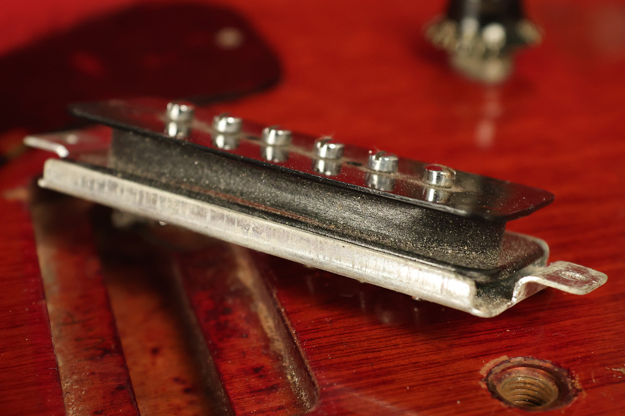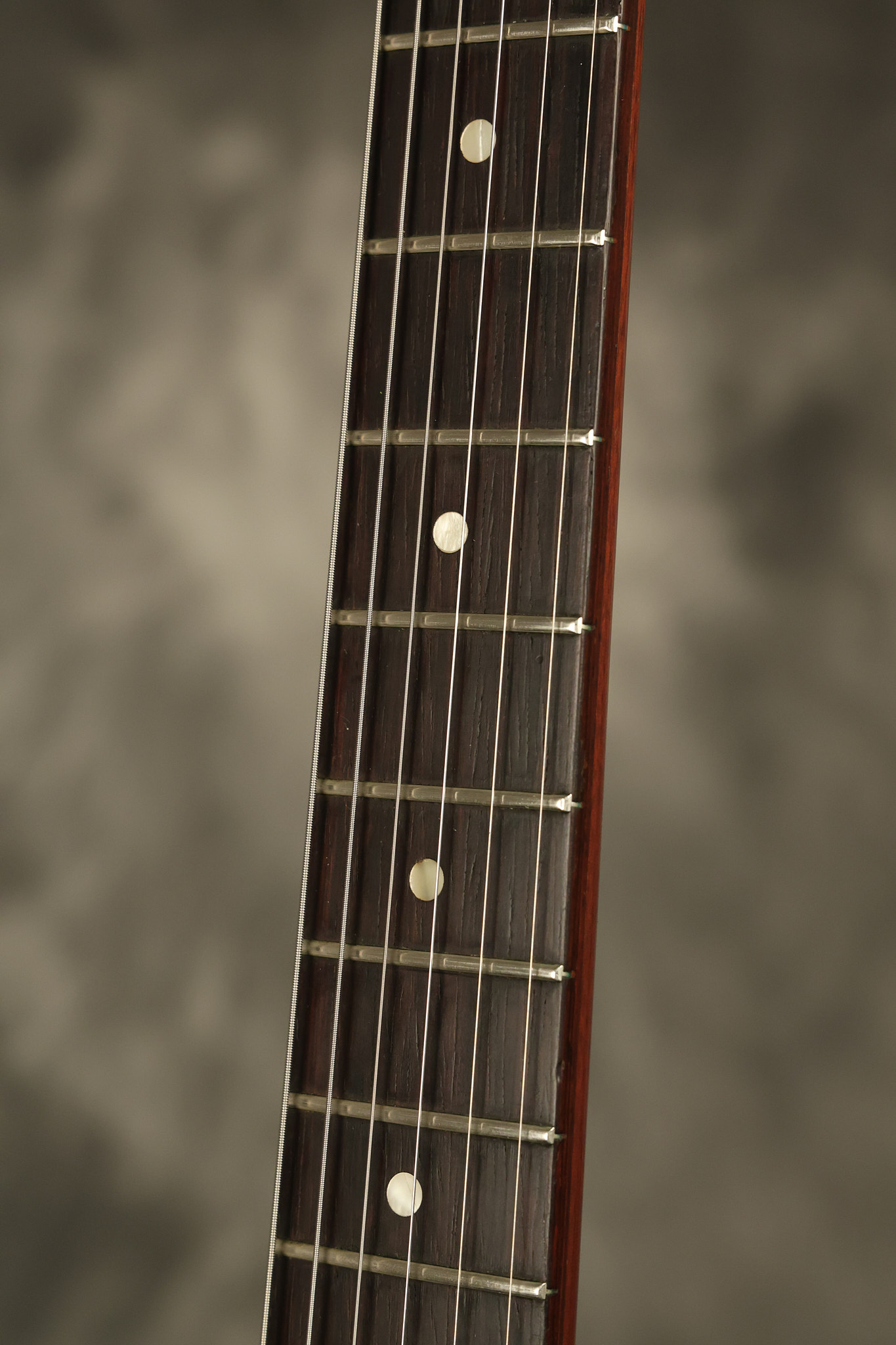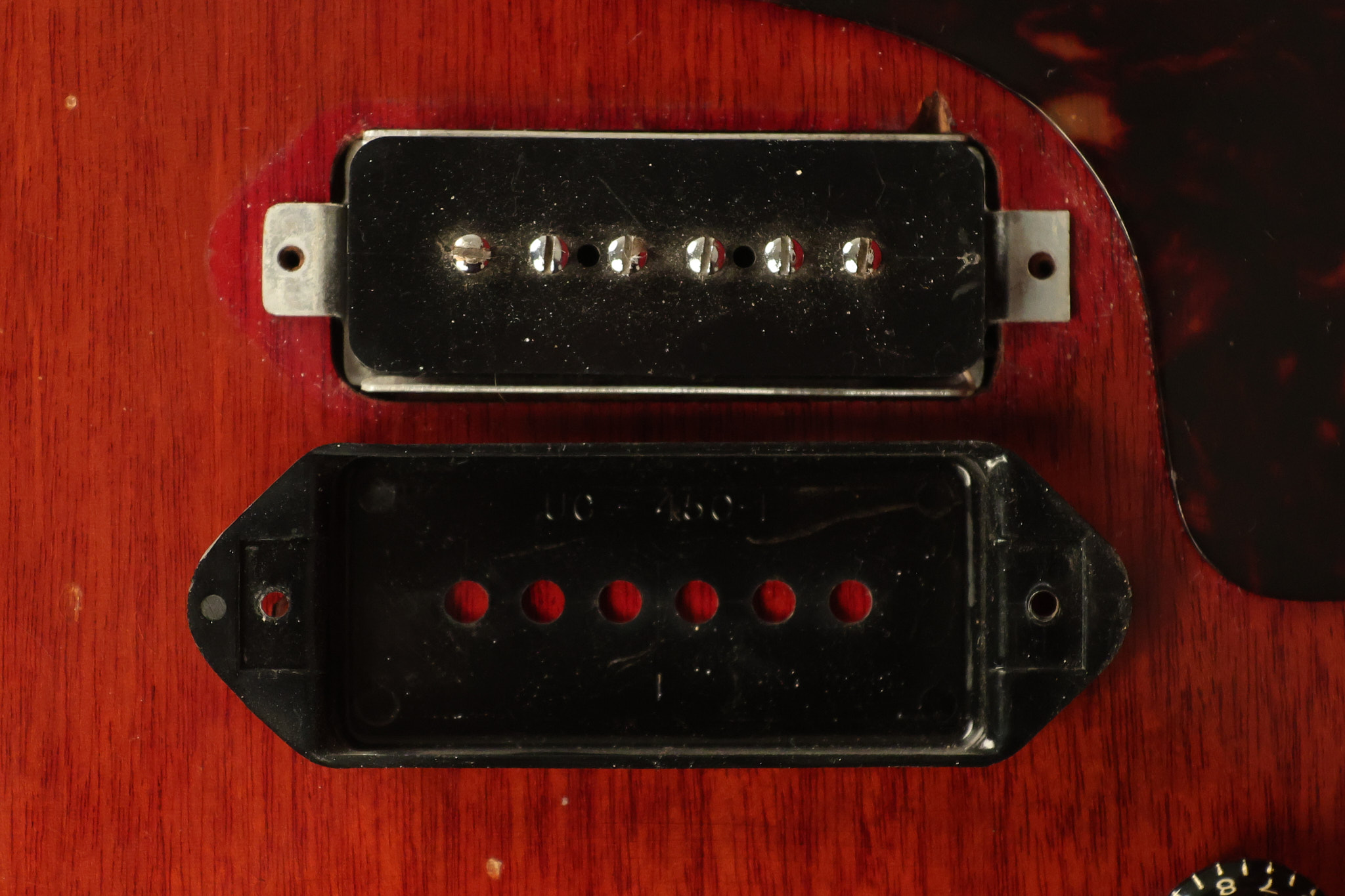 1959 Gibson double-cut Les Paul Junior in its original Cherry finish. It has a great playing neck with great frets. It's all original and includes a later Gibson hardshell case. There are some extra screw holes on the top of the body where something was secured at one time. There are nicks + dings, a small chip out of the top corner of the headstock, a small chip out of the top edge of the pickup cavity, minor finish checking and other cosmetic wear. The guitar itself remains structurally sound. All electronics work and sound great.