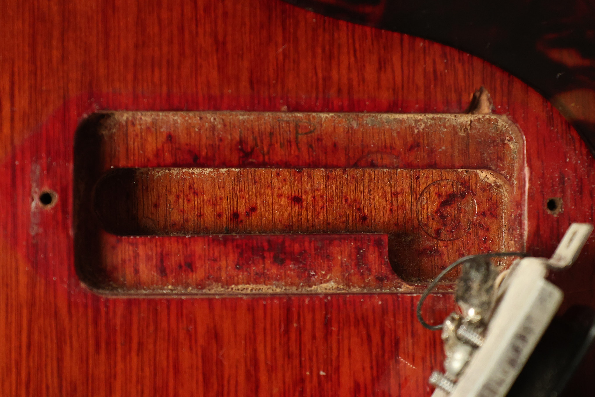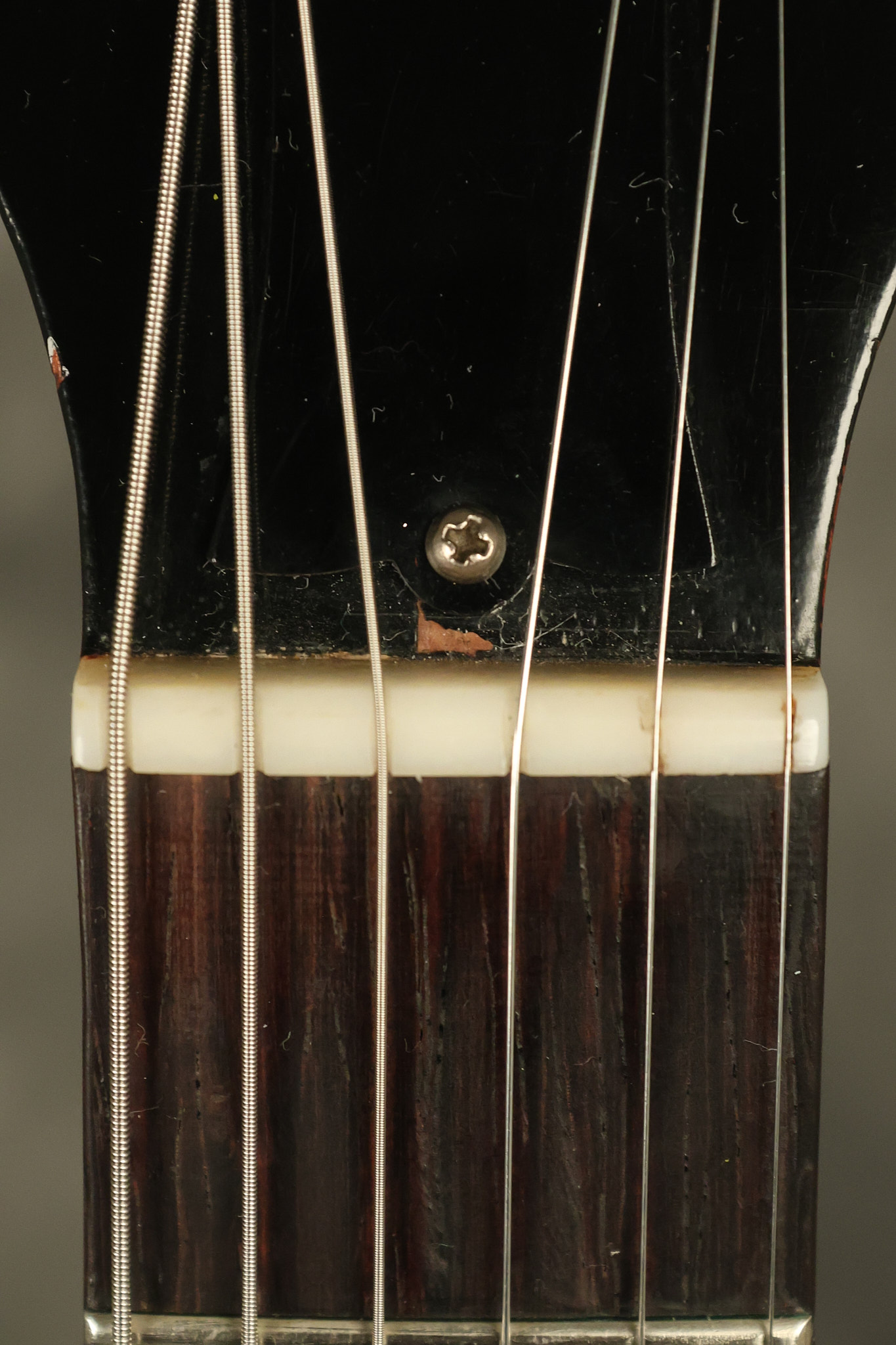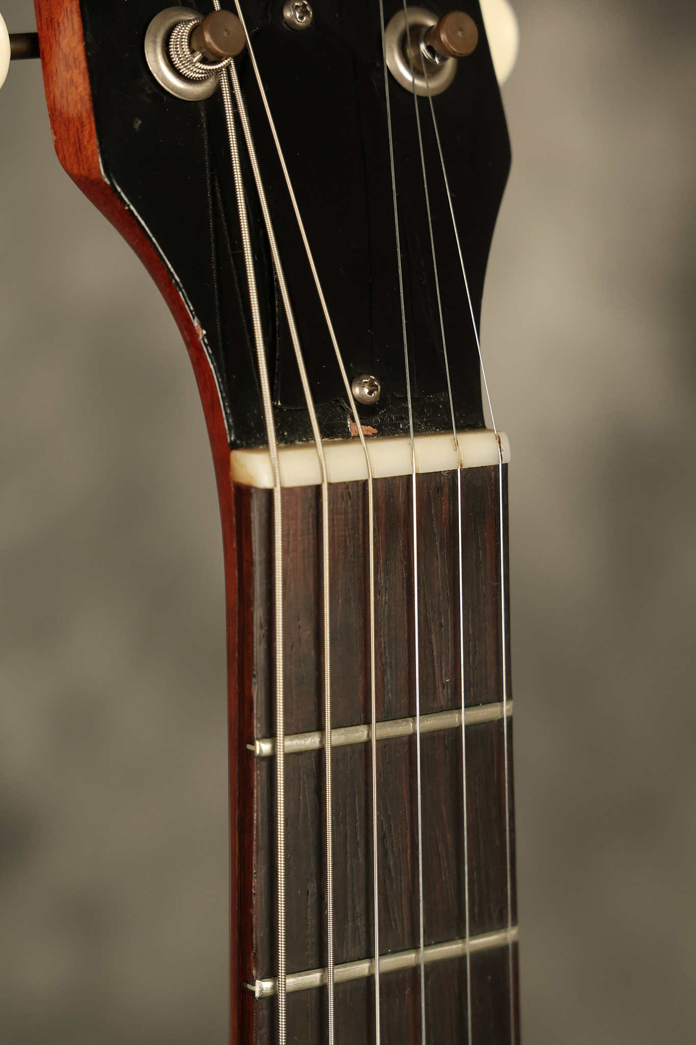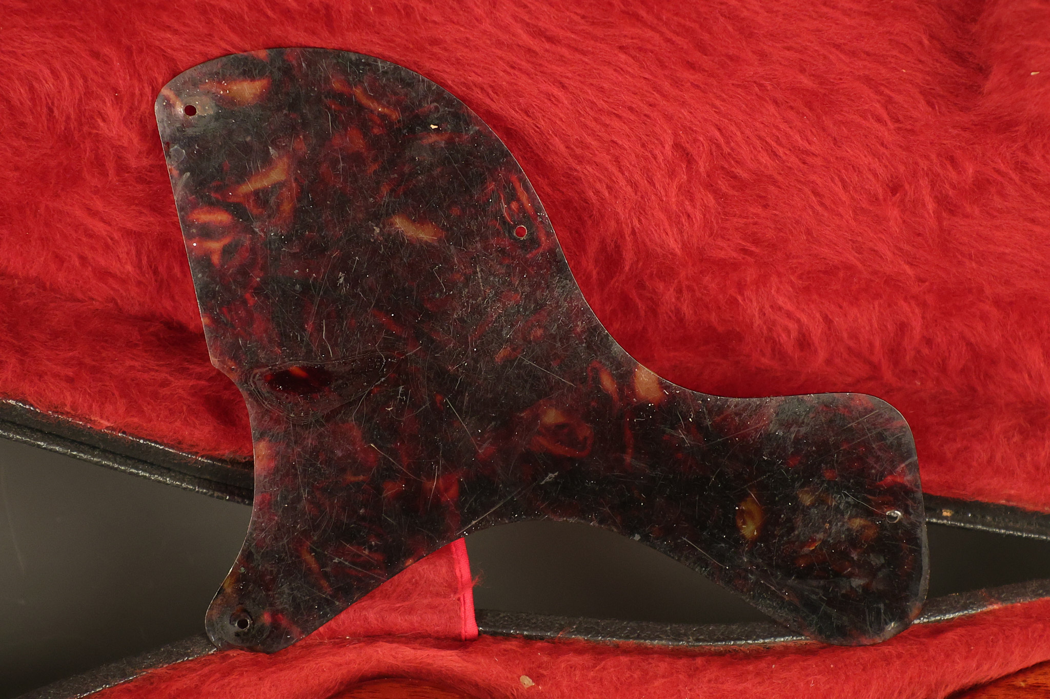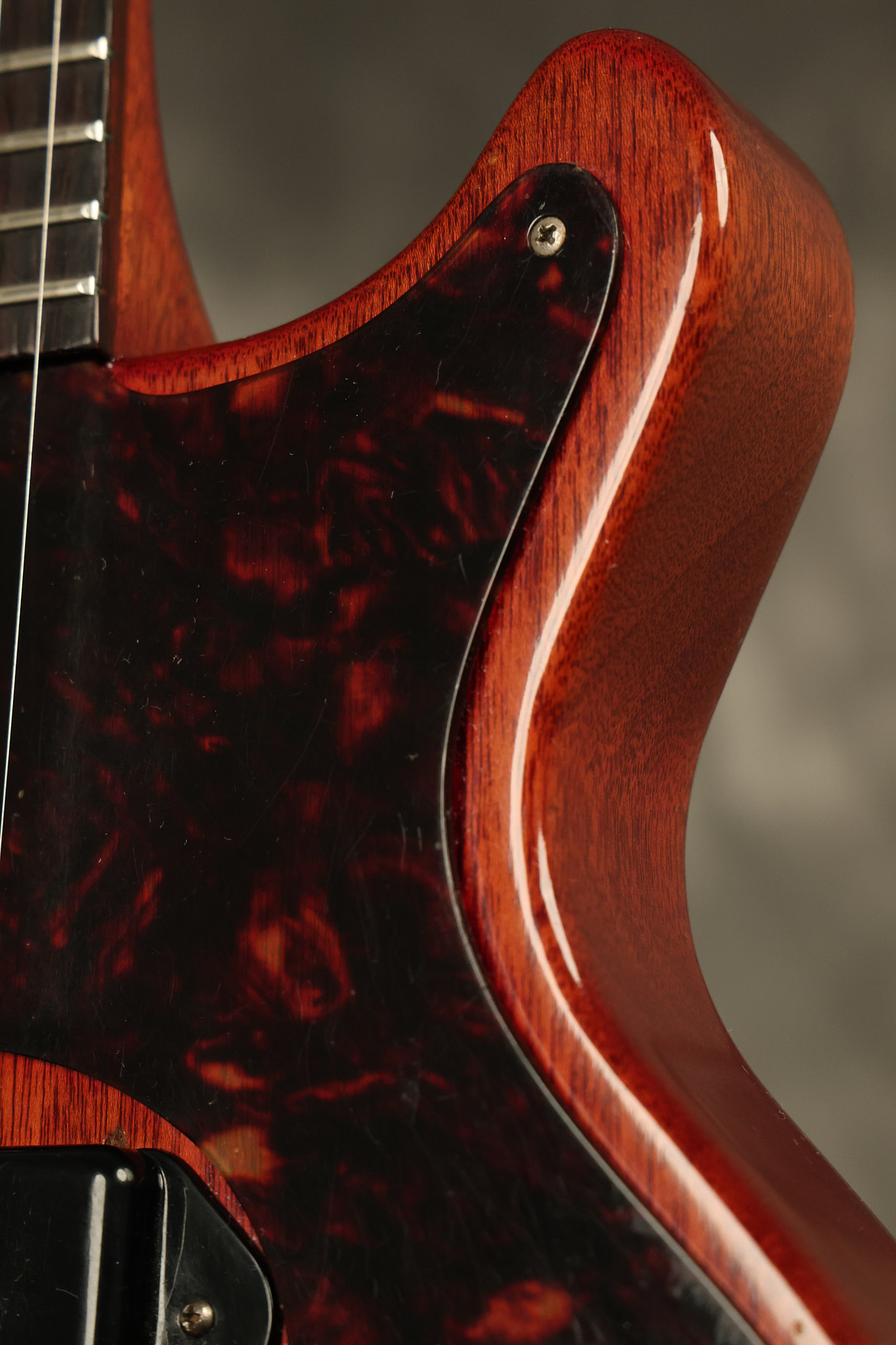 1959 Gibson double-cut Les Paul Junior in its original Cherry finish. It has a great playing neck with great frets. It's all original and includes a later Gibson hardshell case. There are some extra screw holes on the top of the body where something was secured at one time. There are nicks + dings, a small chip out of the top corner of the headstock, a small chip out of the top edge of the pickup cavity, minor finish checking and other cosmetic wear. The guitar itself remains structurally sound. All electronics work and sound great.