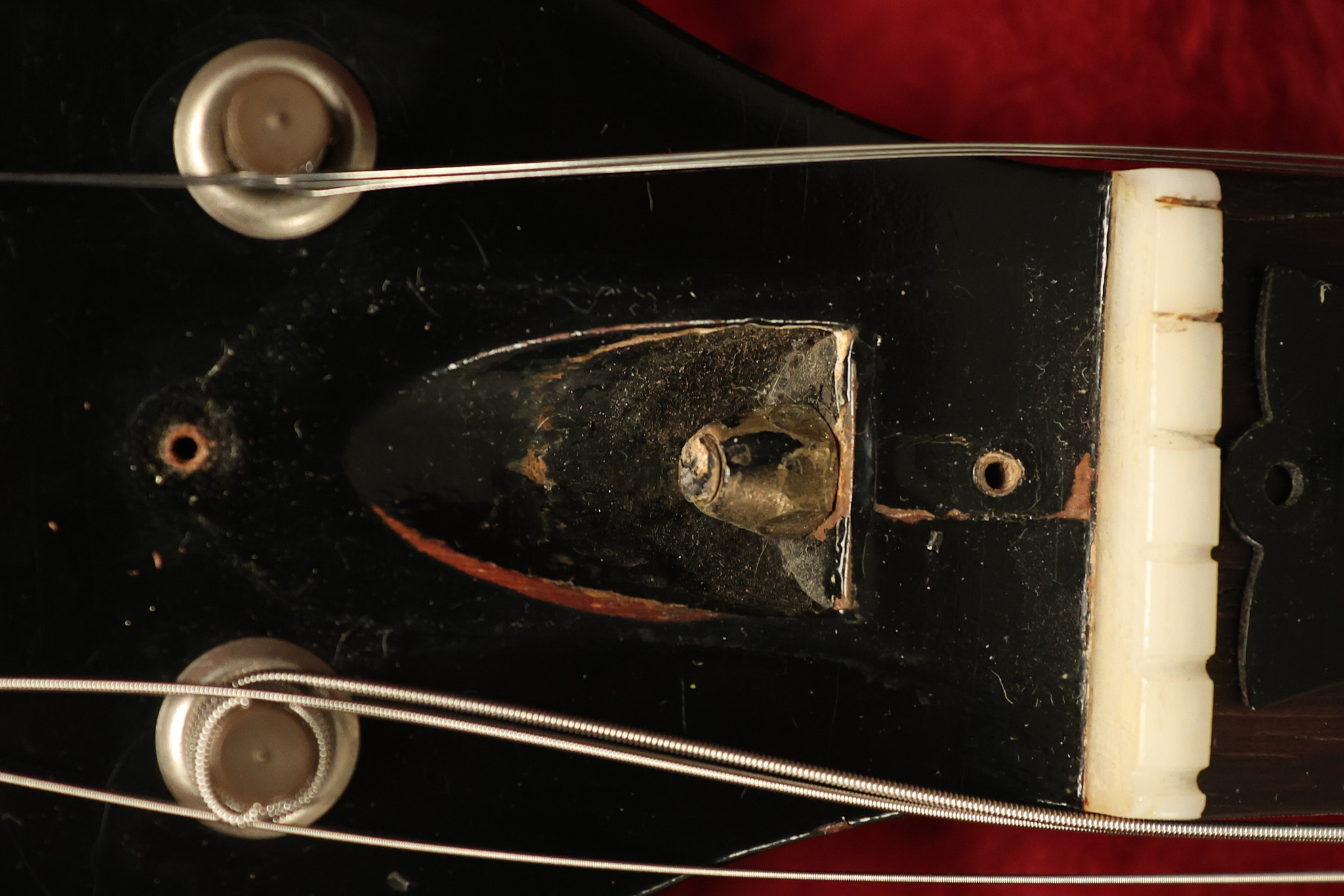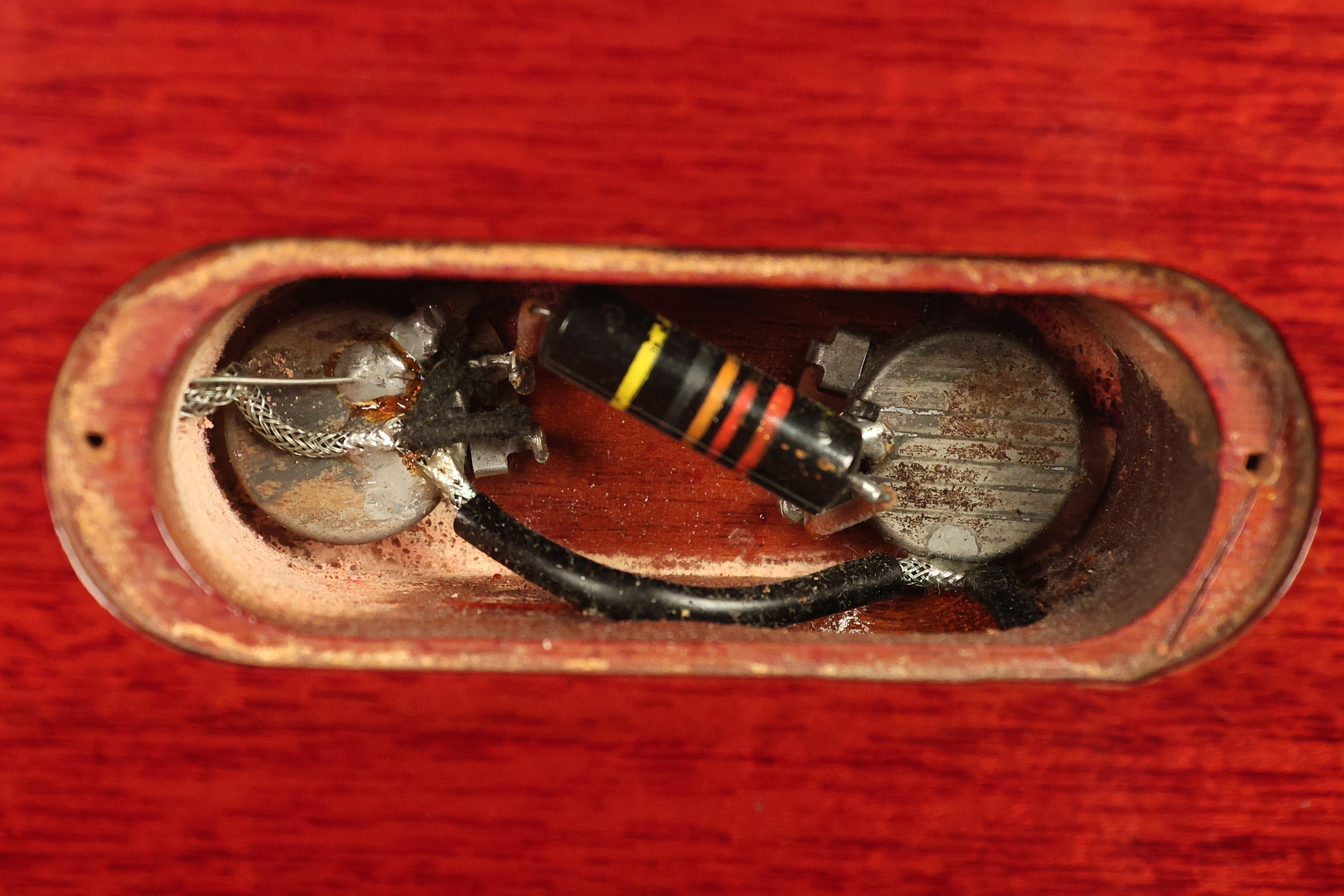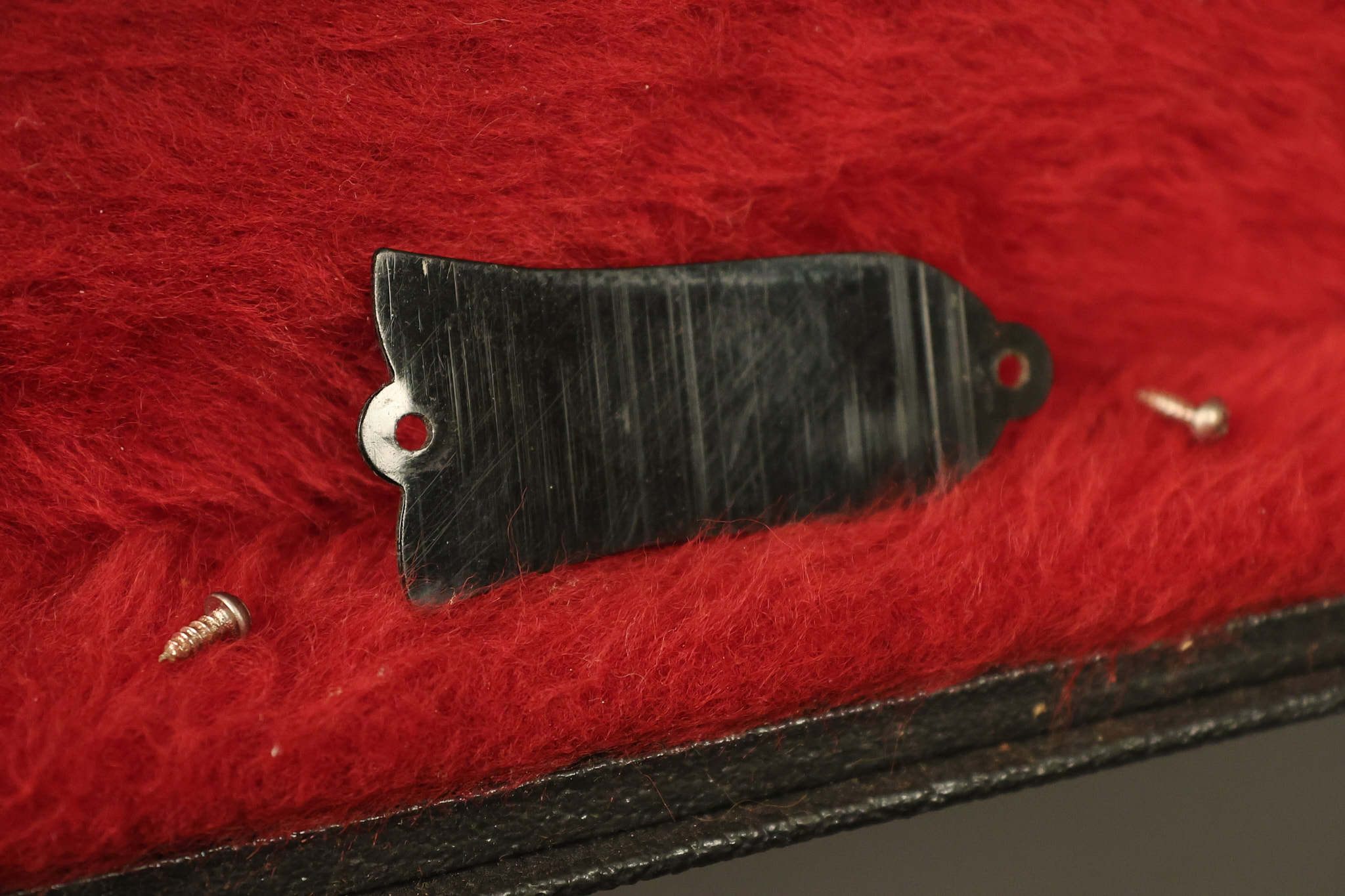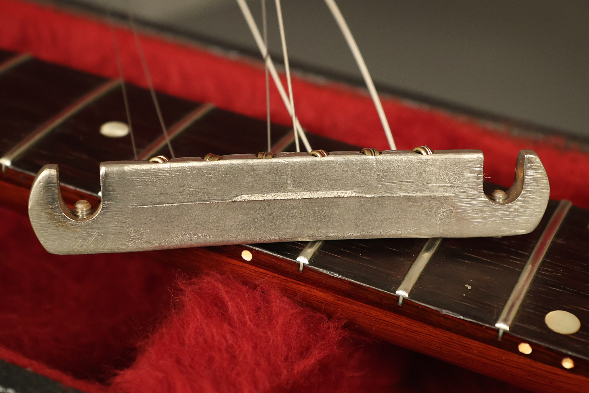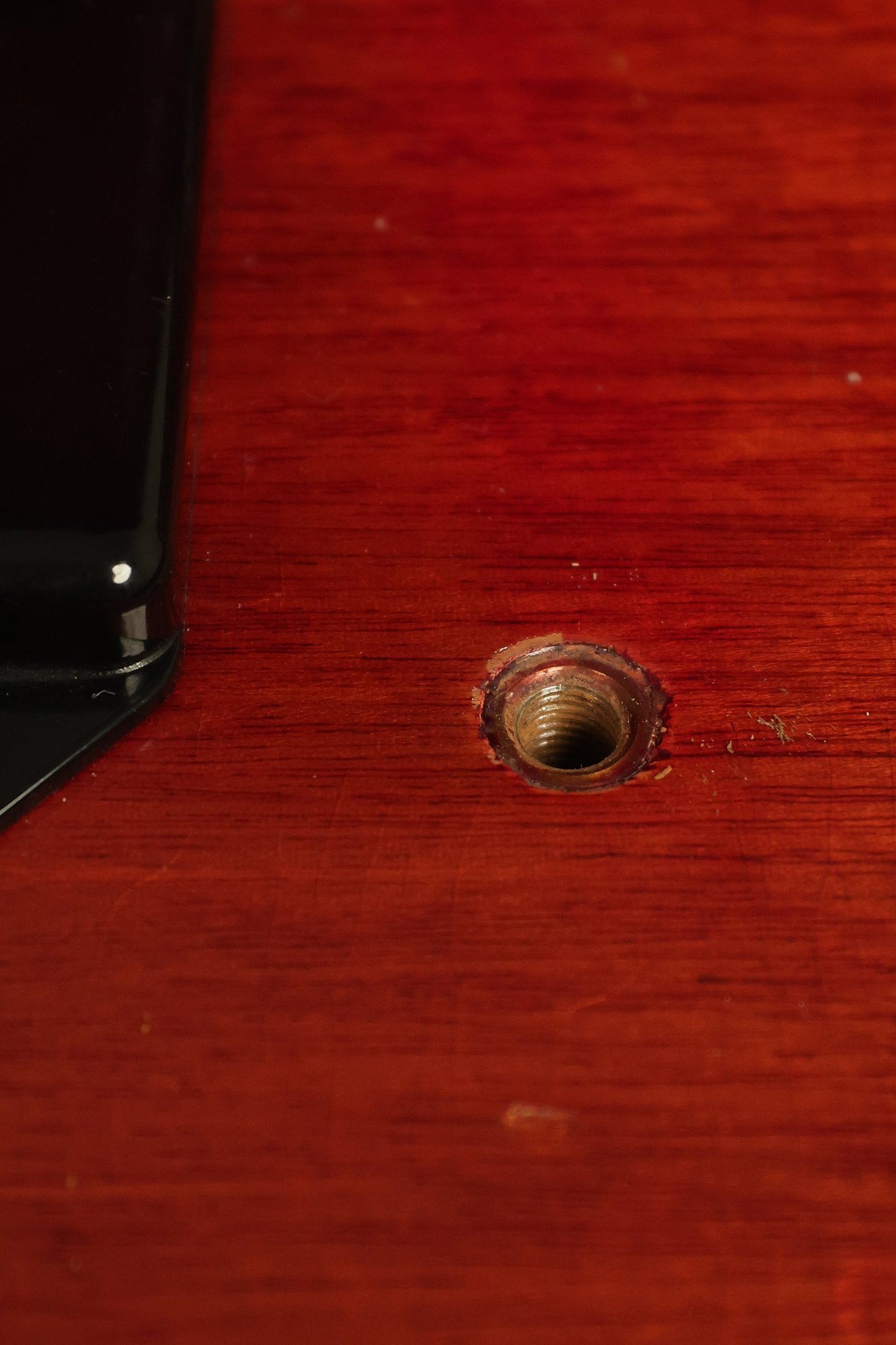 1959 Gibson double-cut Les Paul Junior in its original Cherry finish. It has a great playing neck with great frets. It's all original and includes a later Gibson hardshell case. There are some extra screw holes on the top of the body where something was secured at one time. There are nicks + dings, a small chip out of the top corner of the headstock, a small chip out of the top edge of the pickup cavity, minor finish checking and other cosmetic wear. The guitar itself remains structurally sound. All electronics work and sound great.