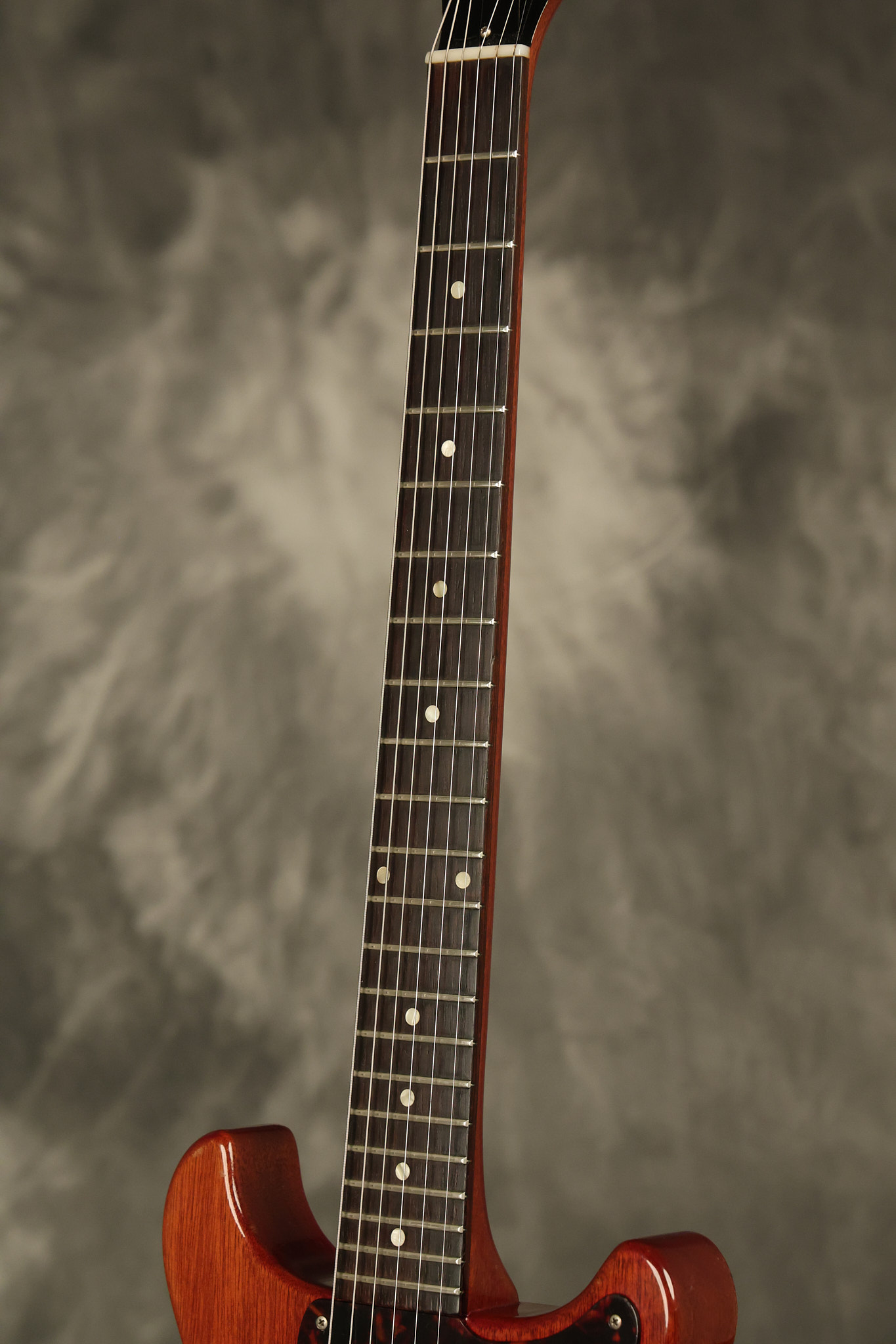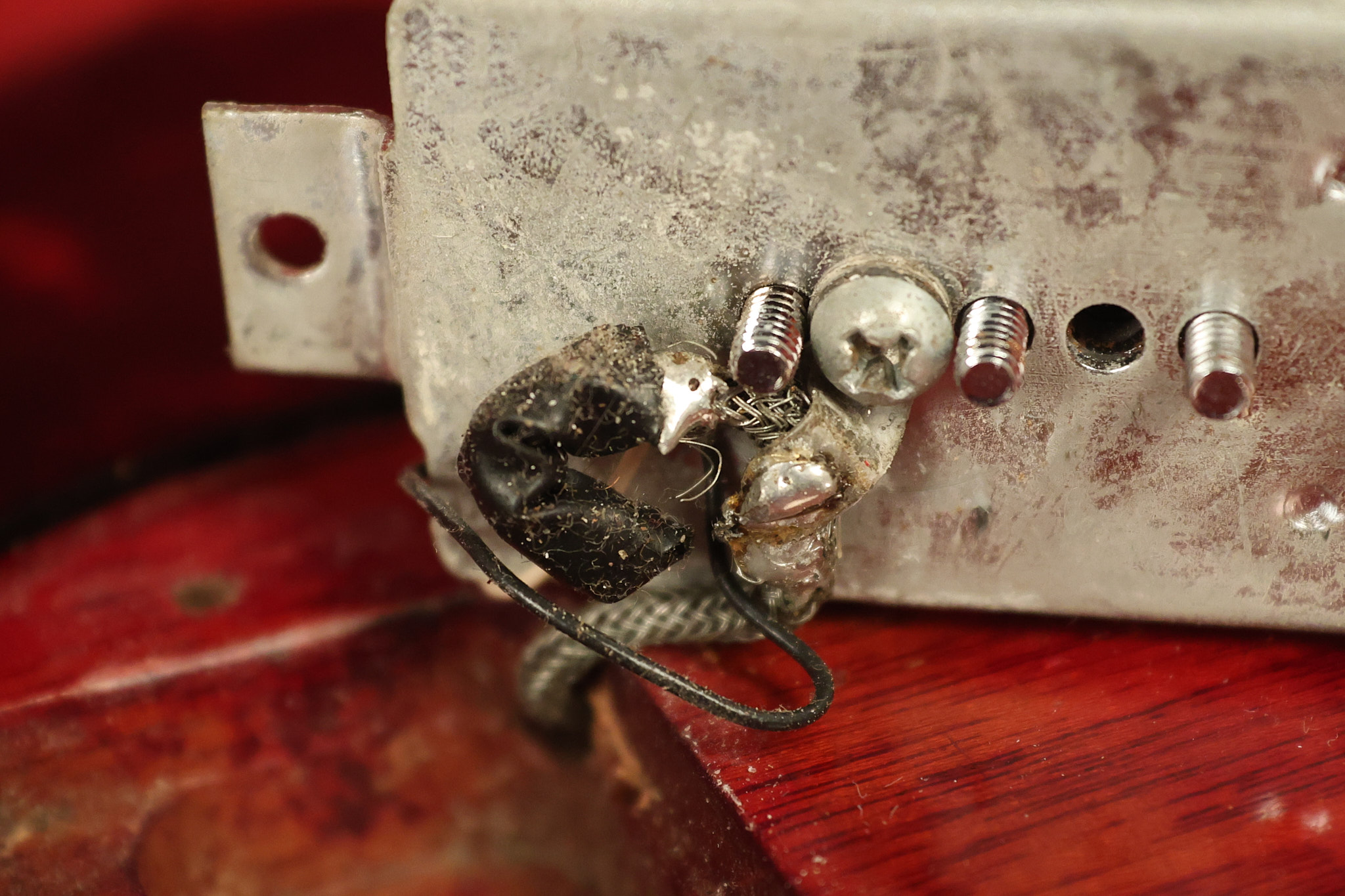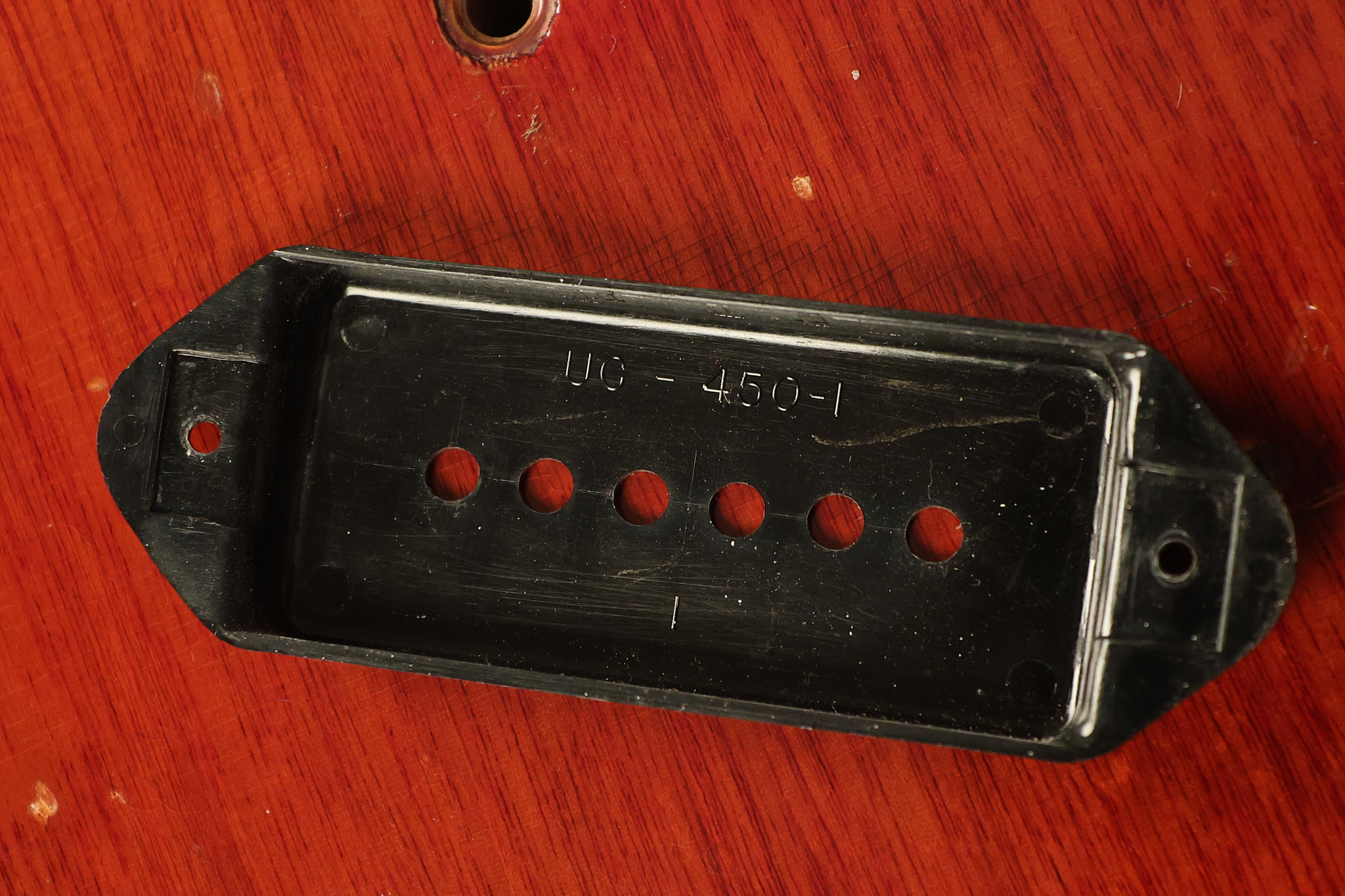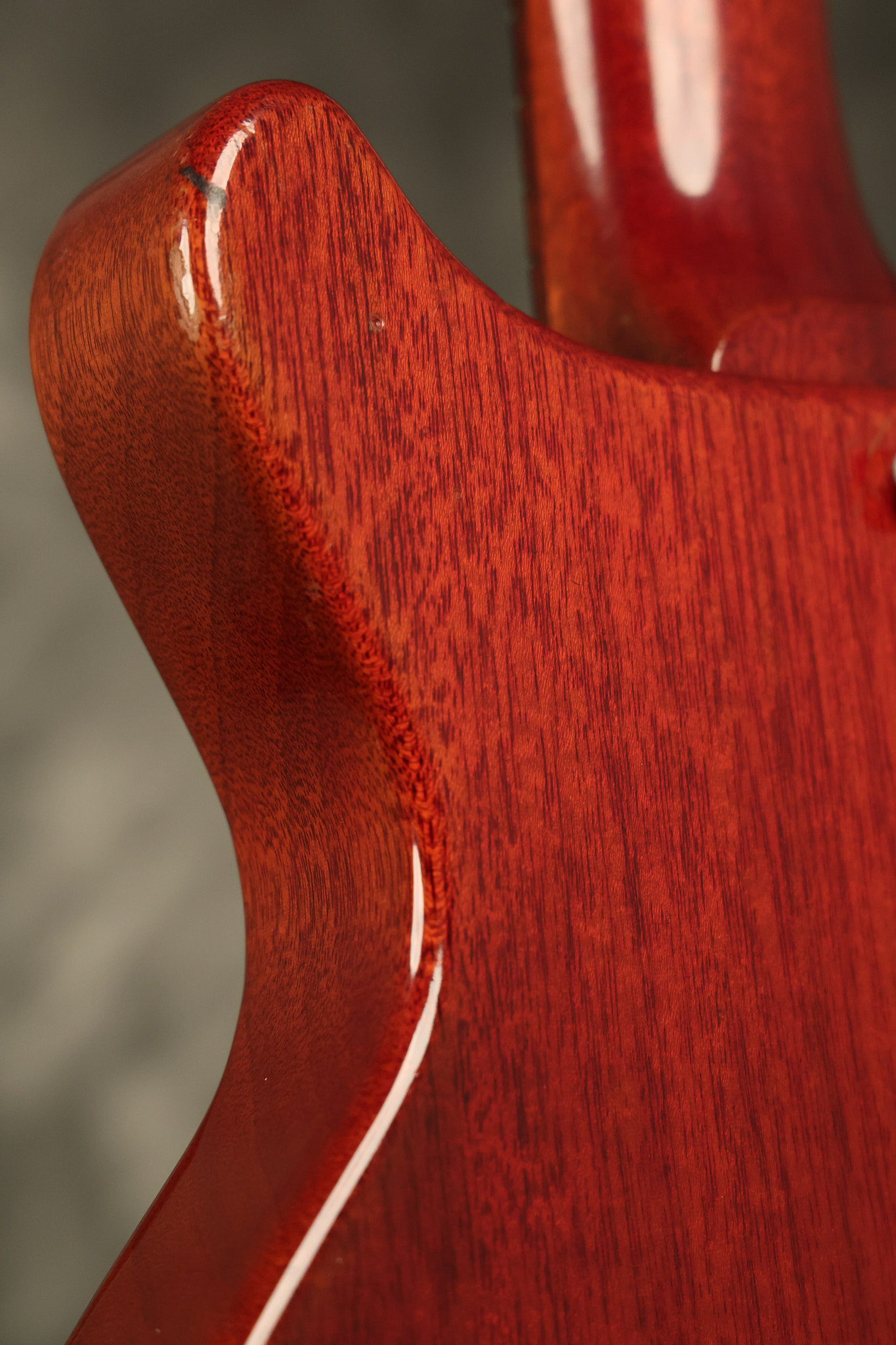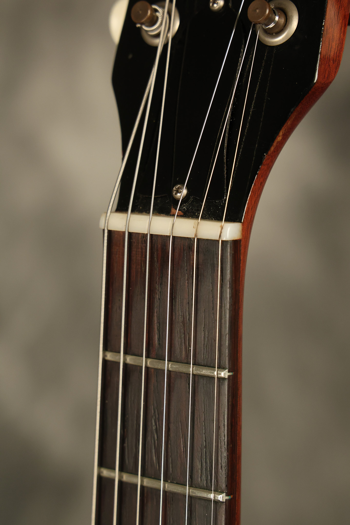 1959 Gibson double-cut Les Paul Junior in its original Cherry finish. It has a great playing neck with great frets. It's all original and includes a later Gibson hardshell case. There are some extra screw holes on the top of the body where something was secured at one time. There are nicks + dings, a small chip out of the top corner of the headstock, a small chip out of the top edge of the pickup cavity, minor finish checking and other cosmetic wear. The guitar itself remains structurally sound. All electronics work and sound great.
