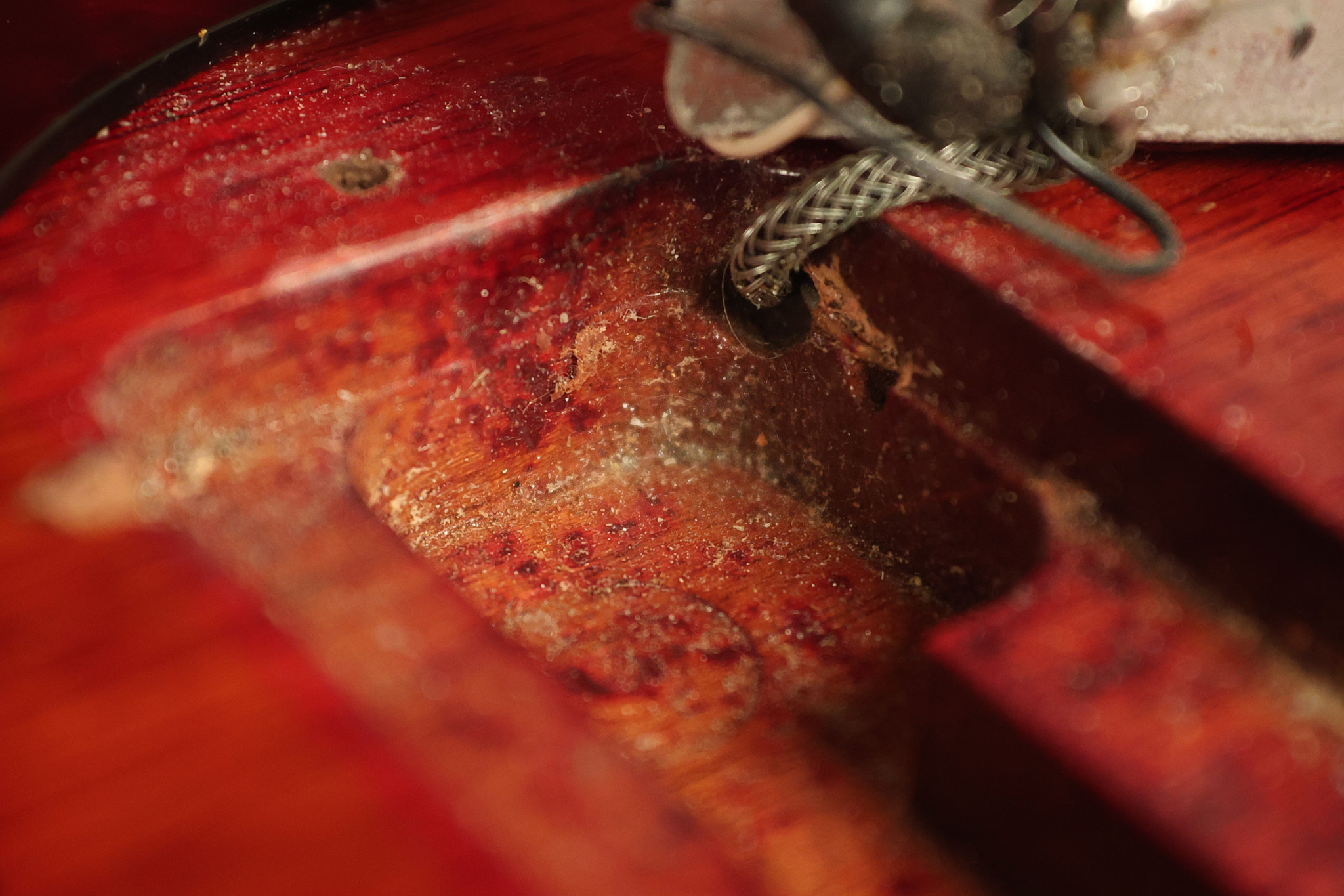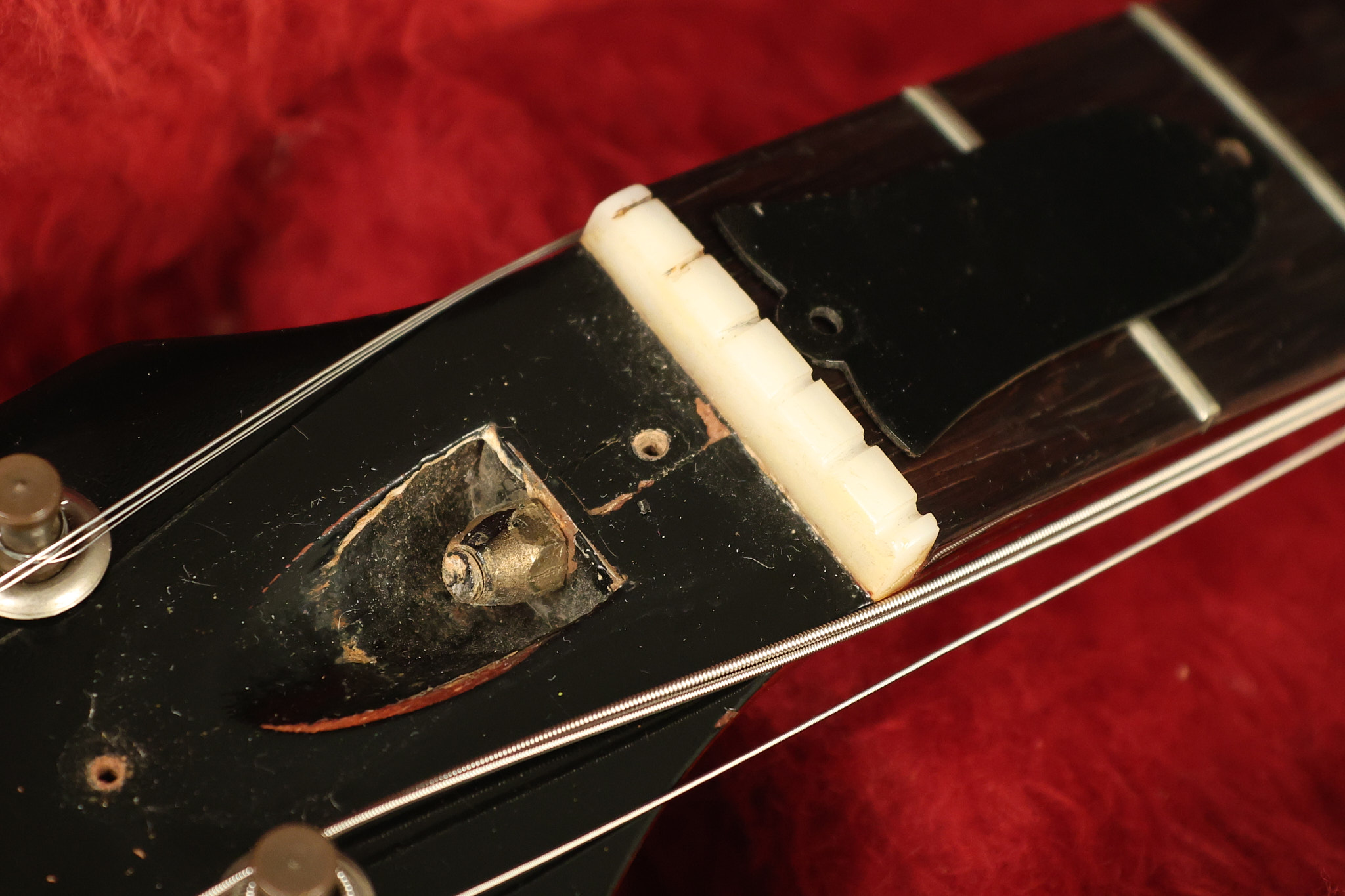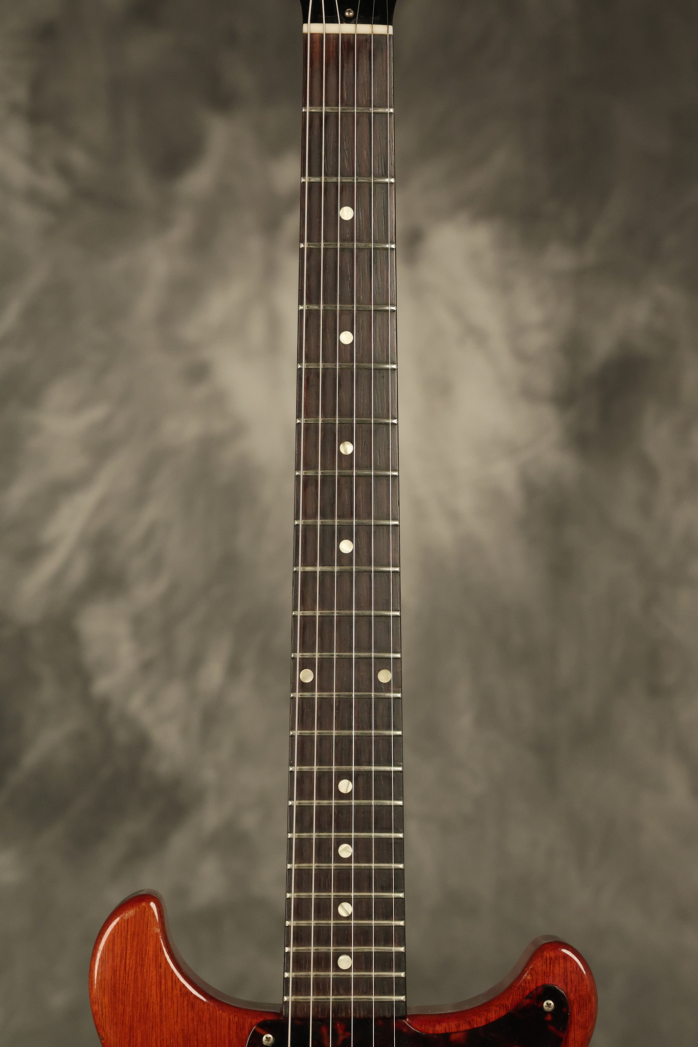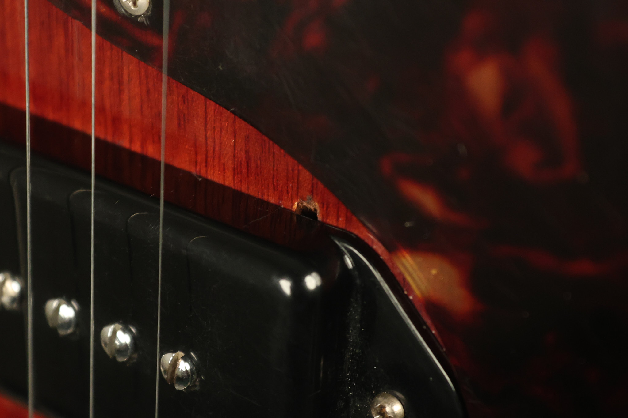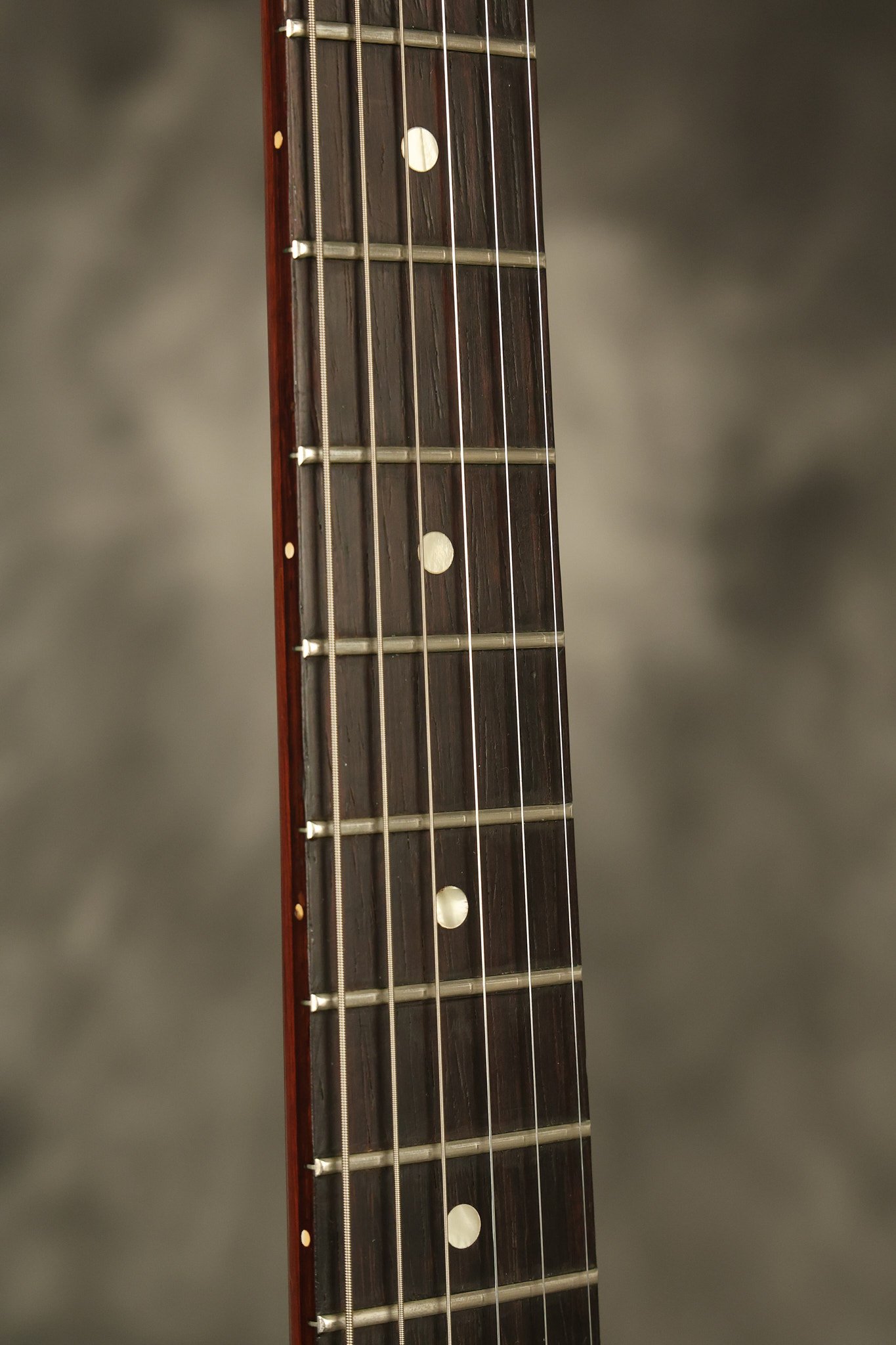 1959 Gibson double-cut Les Paul Junior in its original Cherry finish. It has a great playing neck with great frets. It's all original and includes a later Gibson hardshell case. There are some extra screw holes on the top of the body where something was secured at one time. There are nicks + dings, a small chip out of the top corner of the headstock, a small chip out of the top edge of the pickup cavity, minor finish checking and other cosmetic wear. The guitar itself remains structurally sound. All electronics work and sound great.
