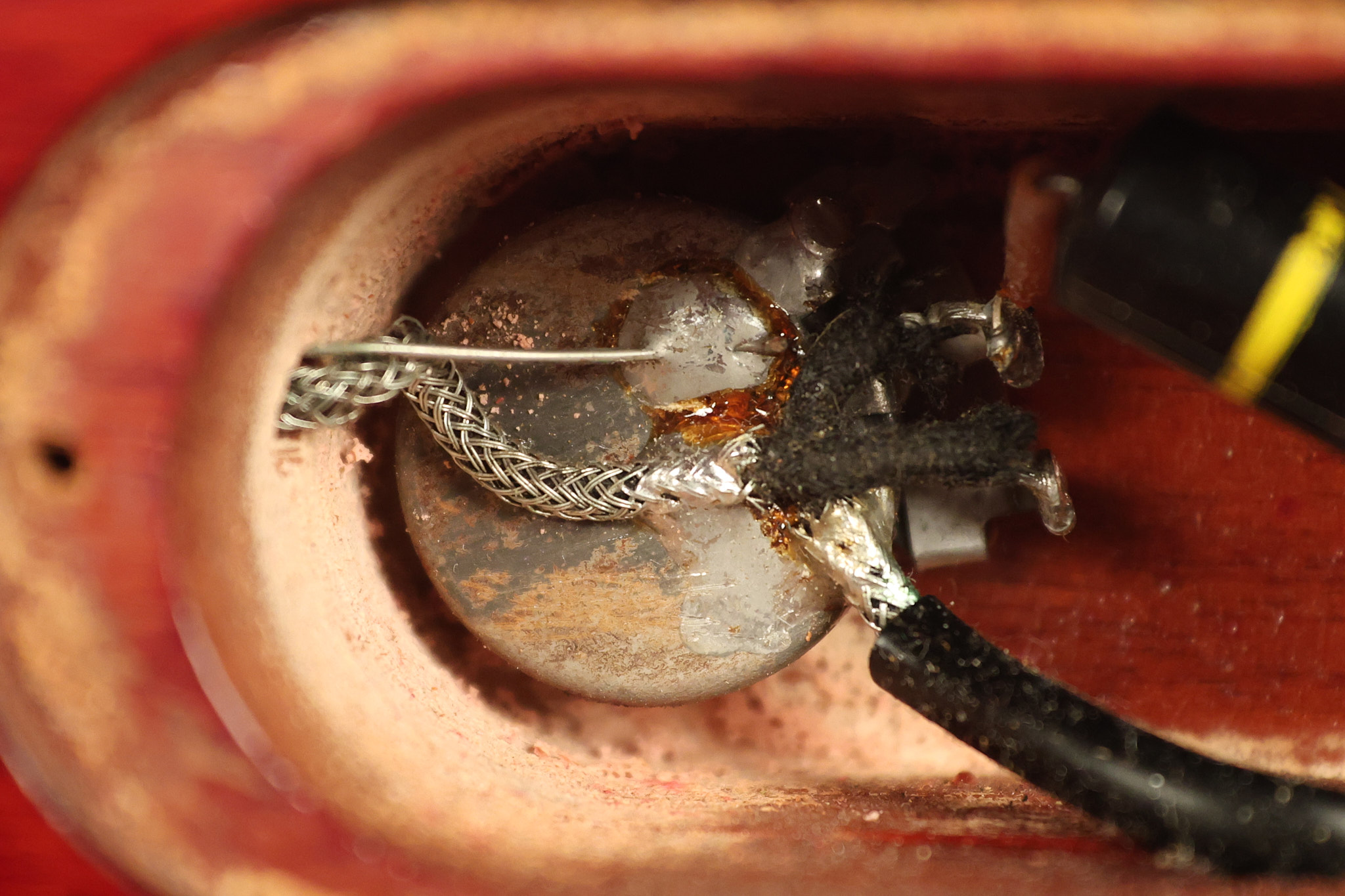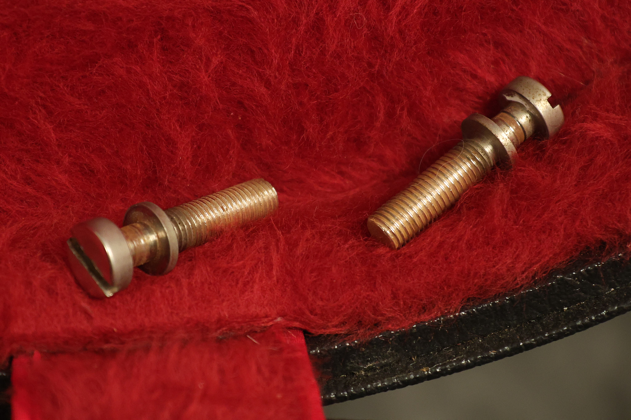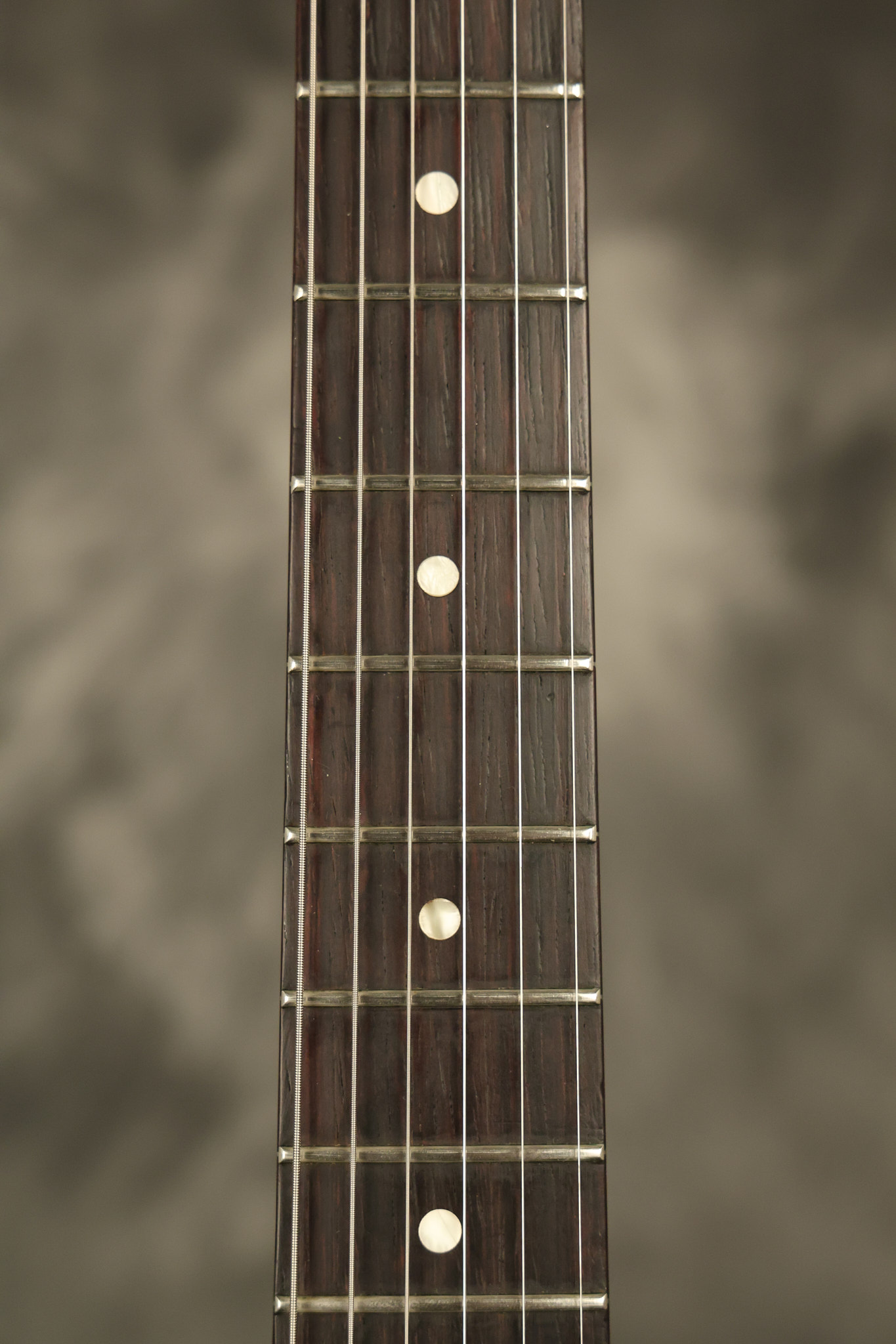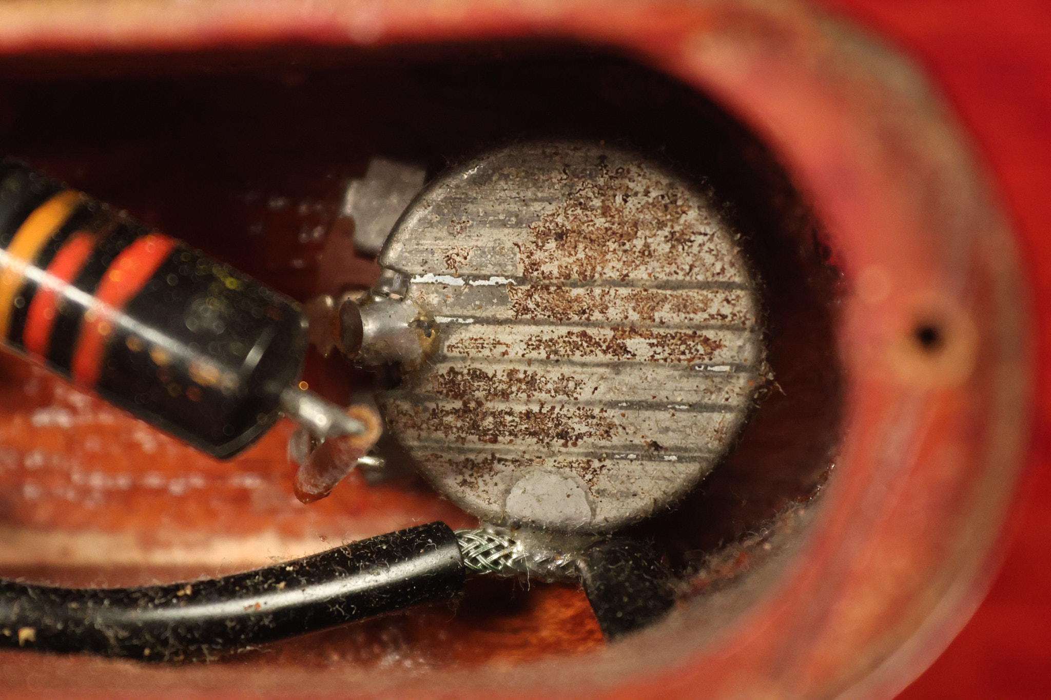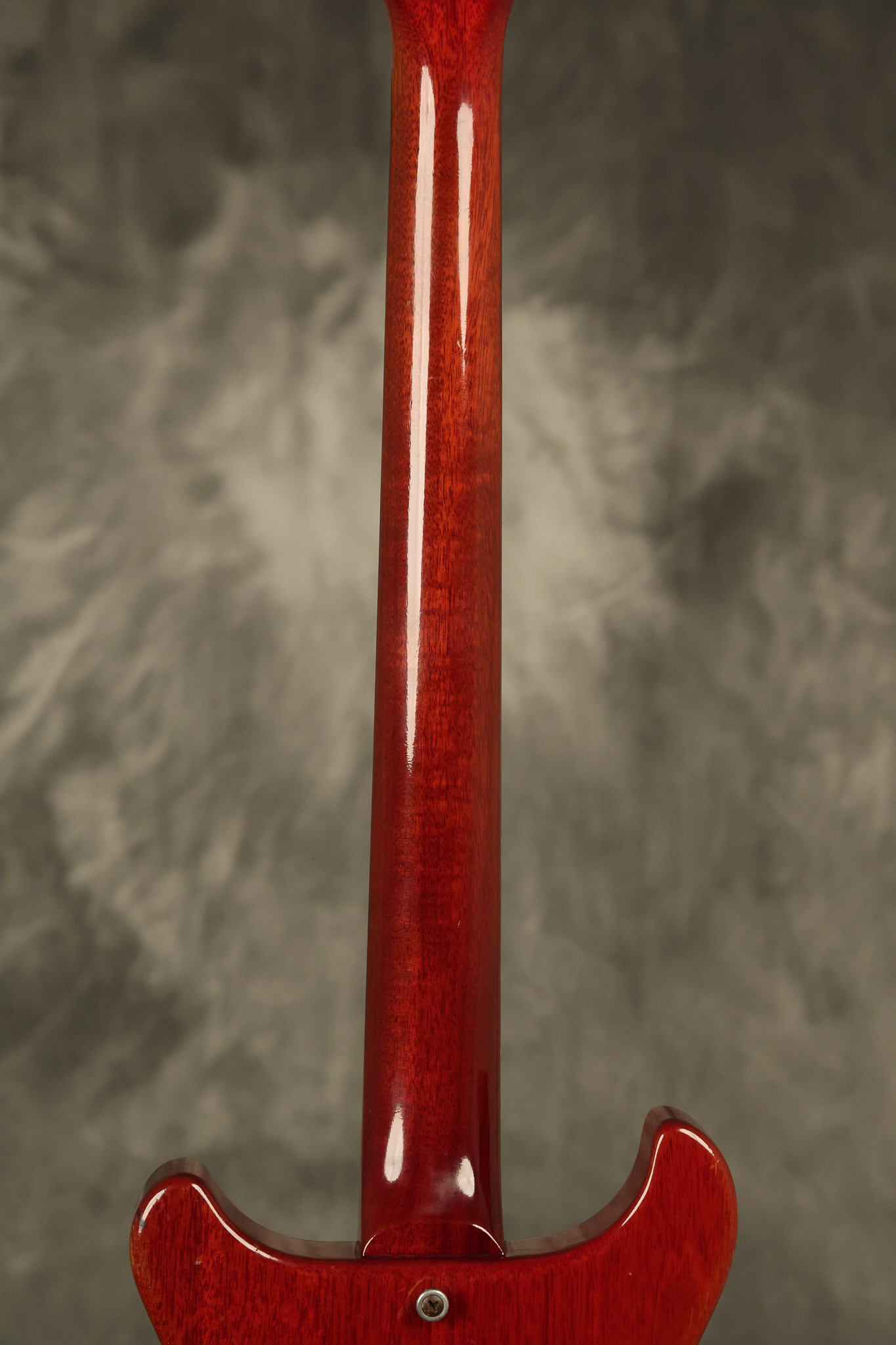 1959 Gibson double-cut Les Paul Junior in its original Cherry finish. It has a great playing neck with great frets. It's all original and includes a later Gibson hardshell case. There are some extra screw holes on the top of the body where something was secured at one time. There are nicks + dings, a small chip out of the top corner of the headstock, a small chip out of the top edge of the pickup cavity, minor finish checking and other cosmetic wear. The guitar itself remains structurally sound. All electronics work and sound great.