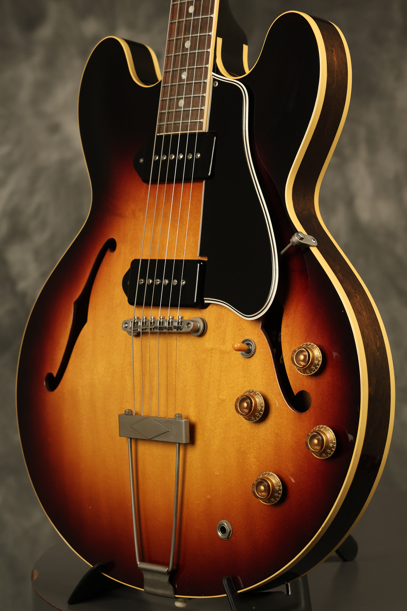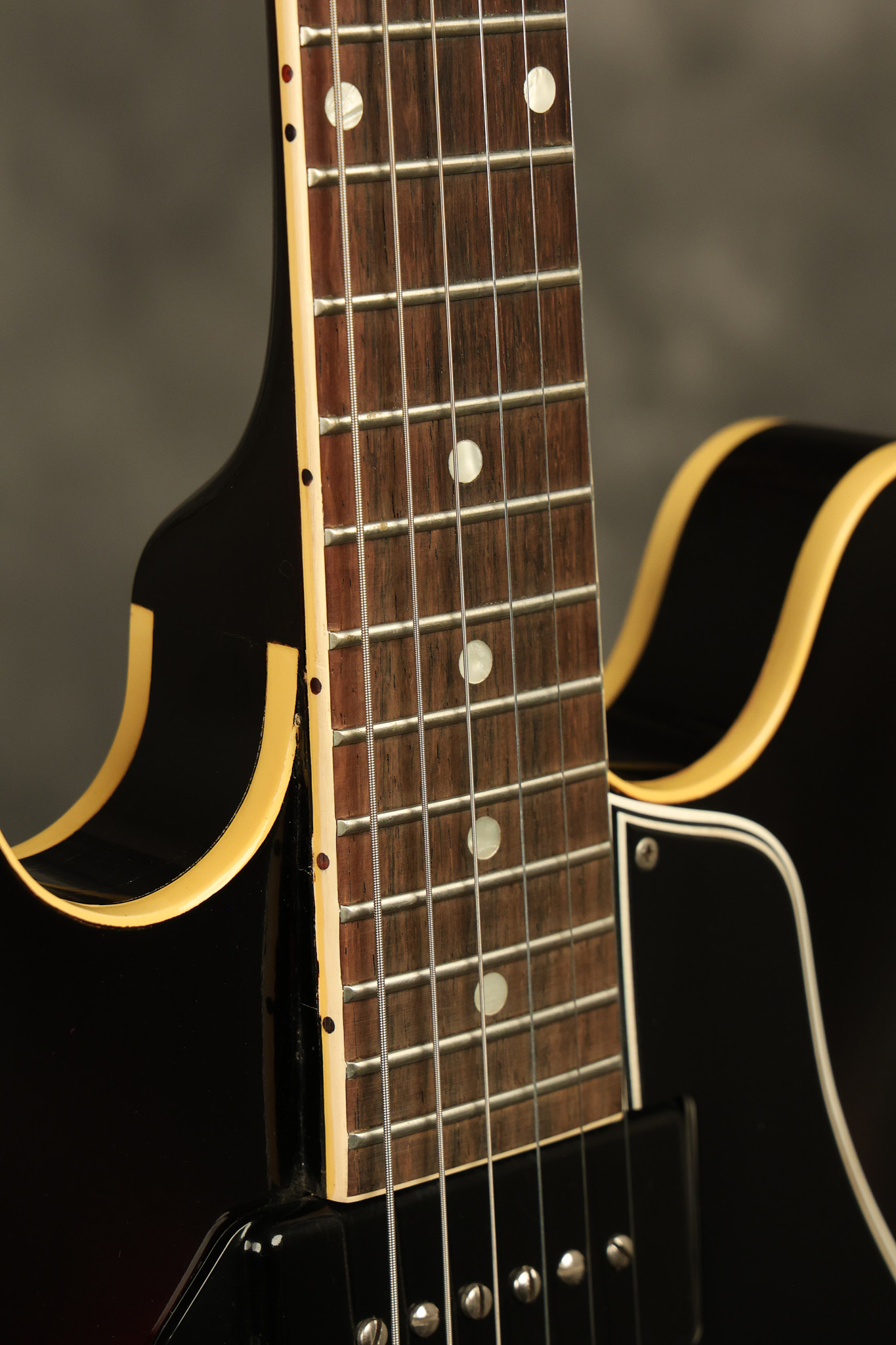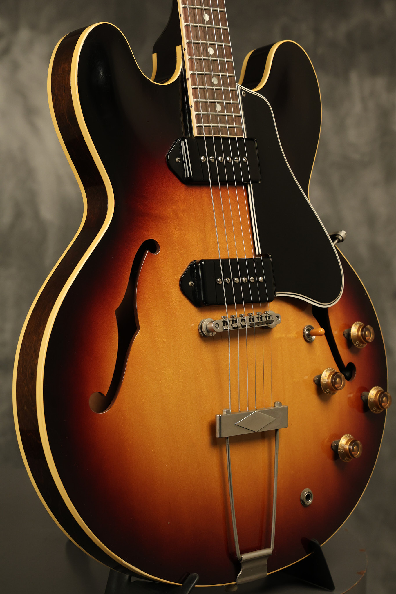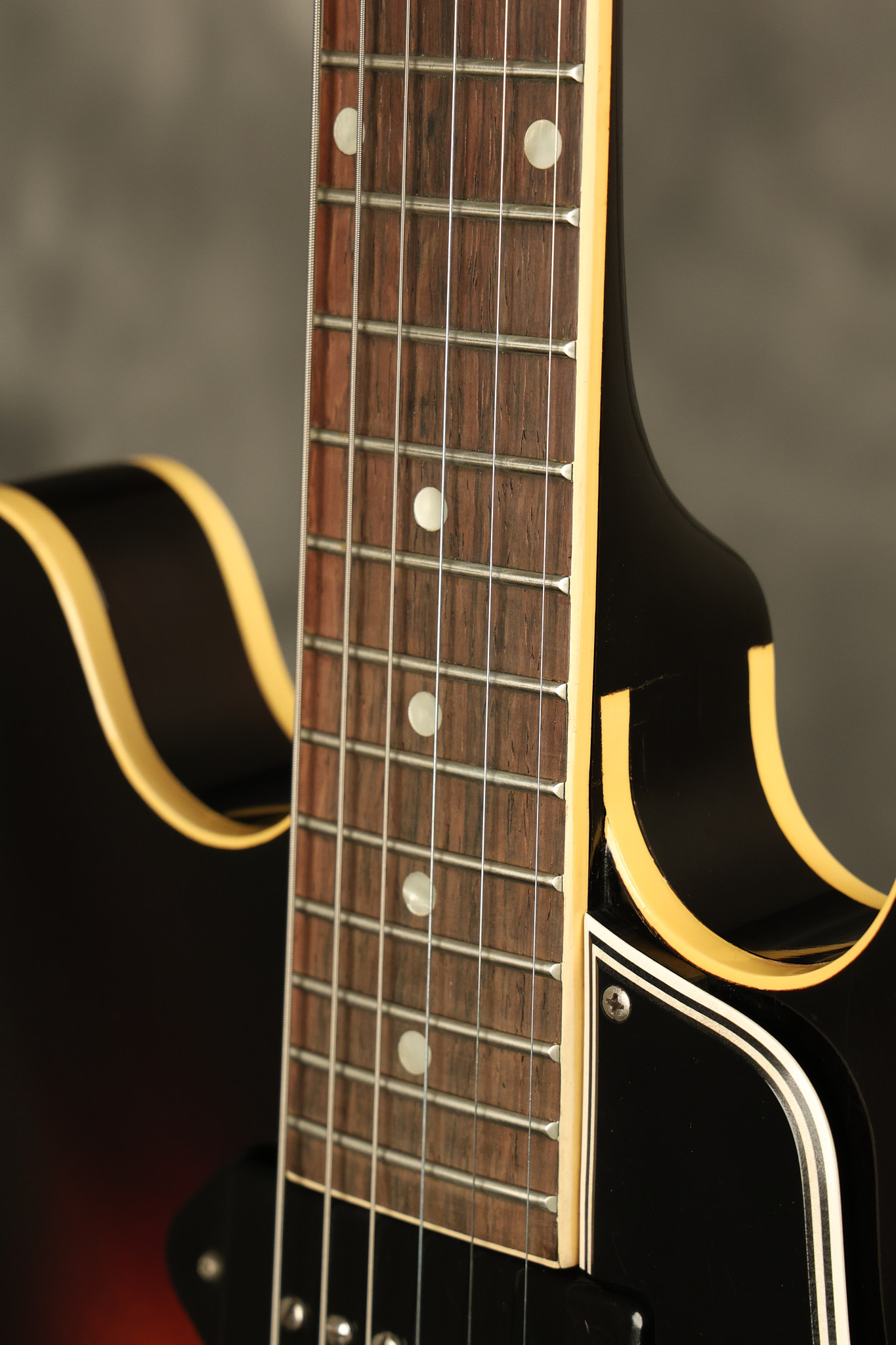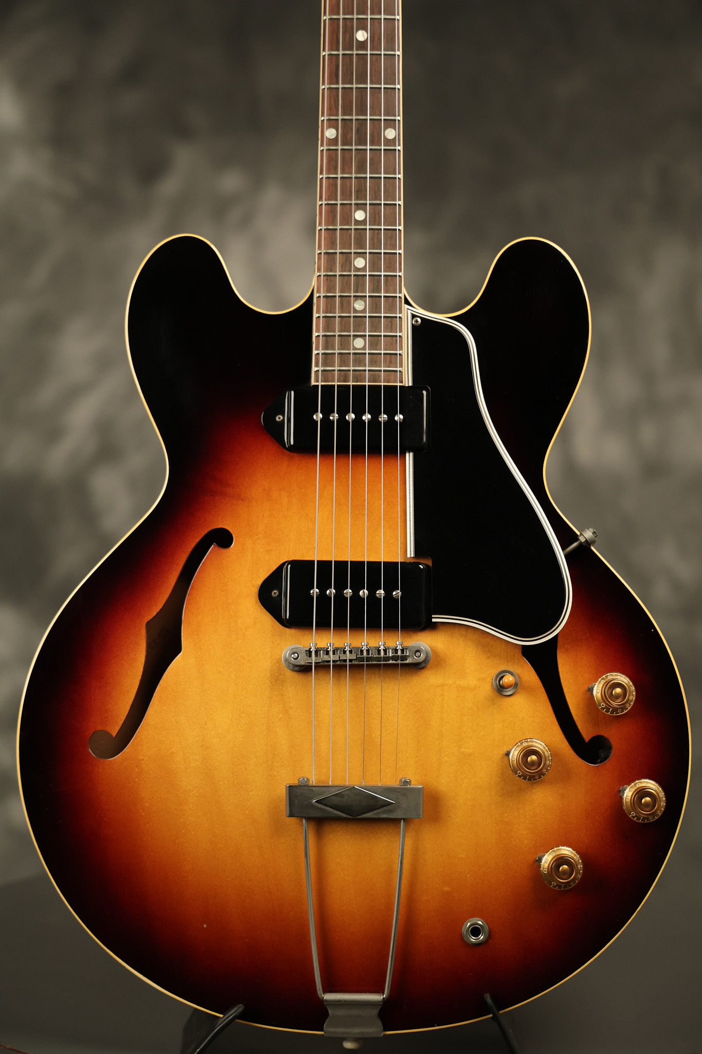 1960 Gibson ES-330 in its original Sunburst finish. It has a great playing neck with great frets. It's all original and 100% complete along with its original brown hardshell case. There was another tailpiece installed at one point in time which has left 2 extra screw holes that are concealed by the original tailpiece. There has never been an upper strap button installed. It's in EXCELLENT condition with only very minor nicks + dings, extremely light finish checking and other minor cosmetic wear. A very small detail, but worth noting is that the pickguard bracket screw hole was originally drilled just a hair too far from the edge of the body as the bracket is not perfectly flush against the side of the body. The pickguard is still just as secure and the guitar itself remains structurally sound with no cracks, breaks or repairs. All electronics work and sound great.