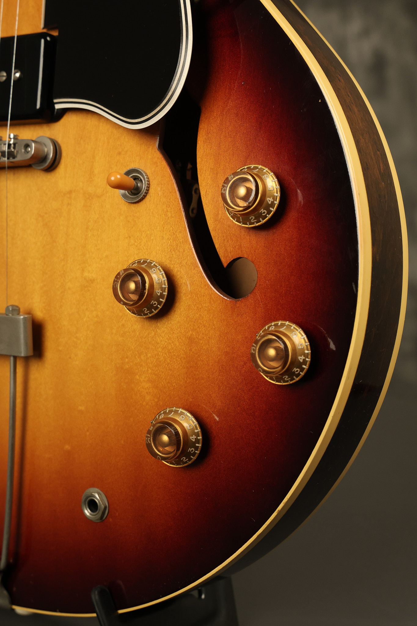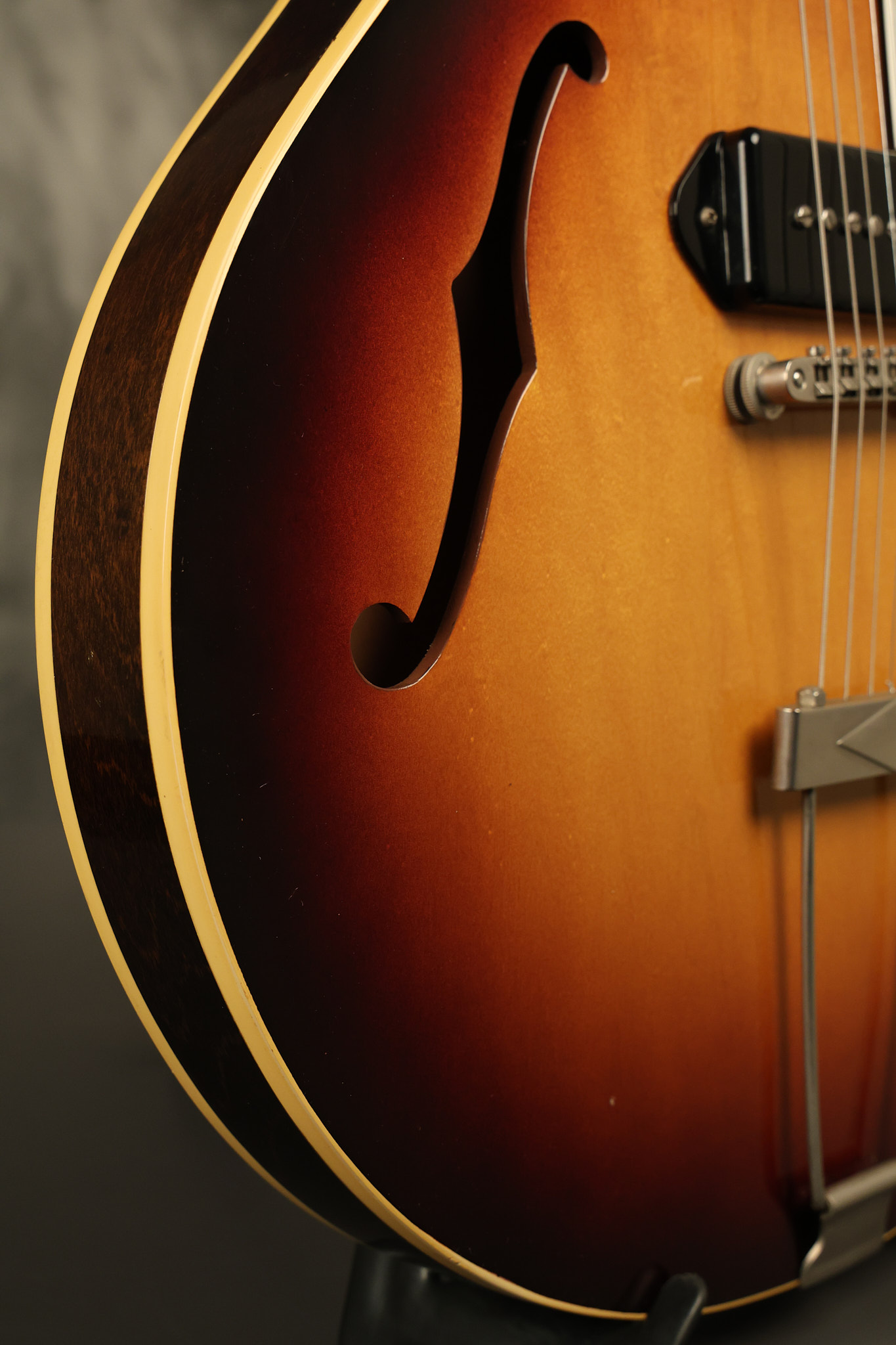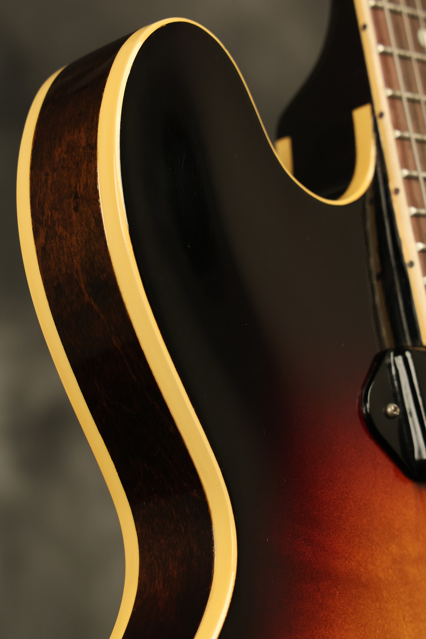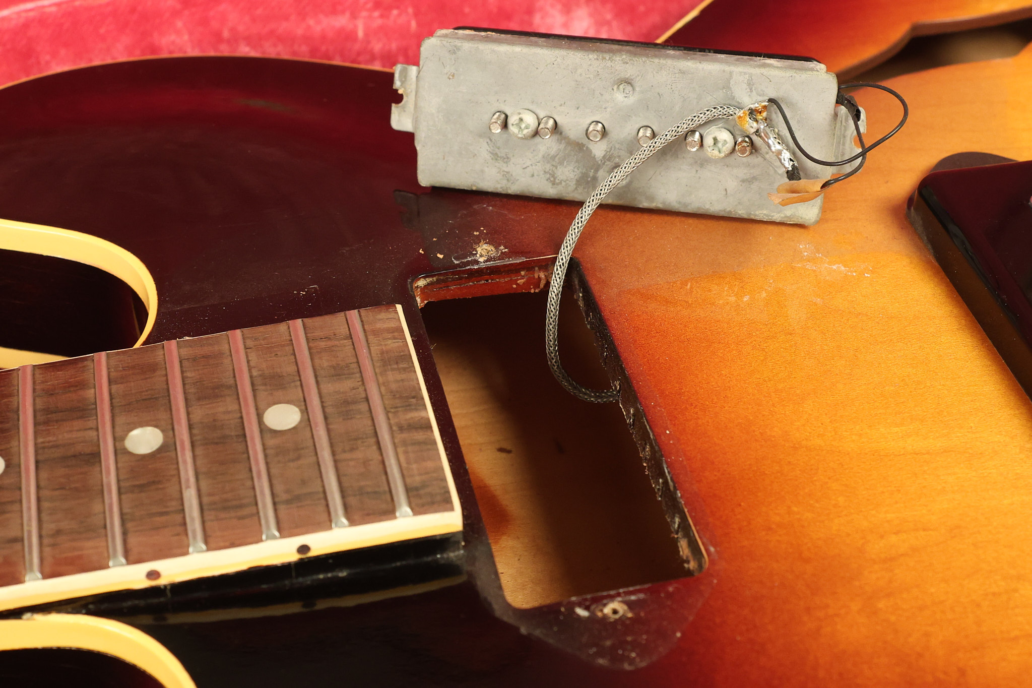 1960 Gibson ES-330 in its original Sunburst finish. It has a great playing neck with great frets. It's all original and 100% complete along with its original brown hardshell case. There was another tailpiece installed at one point in time which has left 2 extra screw holes that are concealed by the original tailpiece. There has never been an upper strap button installed. It's in EXCELLENT condition with only very minor nicks + dings, extremely light finish checking and other minor cosmetic wear. A very small detail, but worth noting is that the pickguard bracket screw hole was originally drilled just a hair too far from the edge of the body as the bracket is not perfectly flush against the side of the body. The pickguard is still just as secure and the guitar itself remains structurally sound with no cracks, breaks or repairs. All electronics work and sound great.