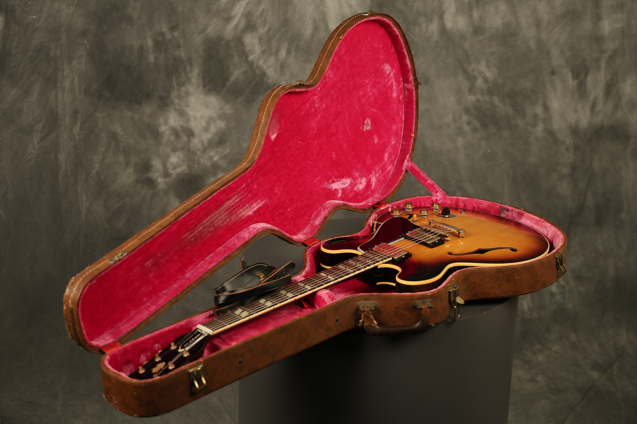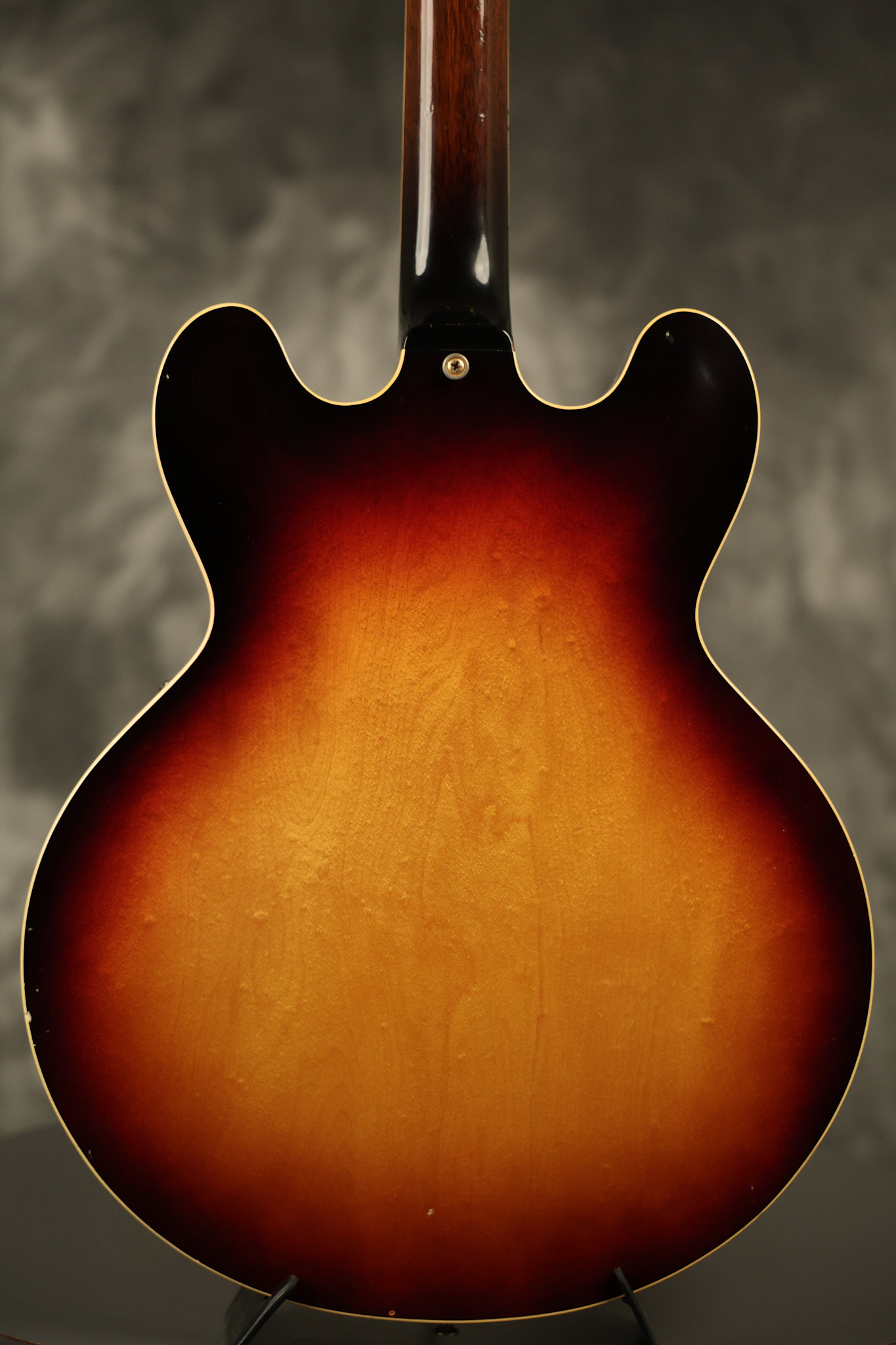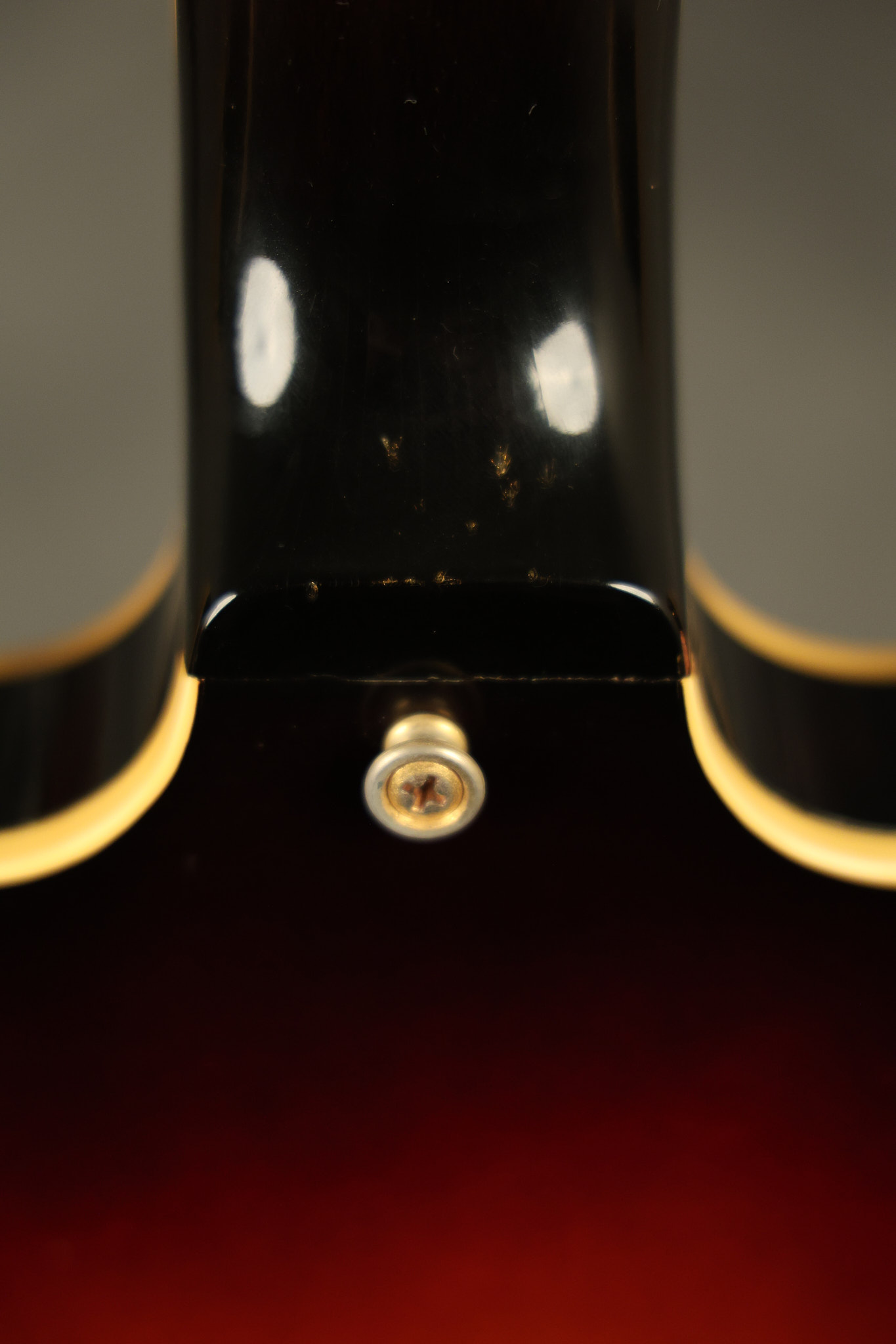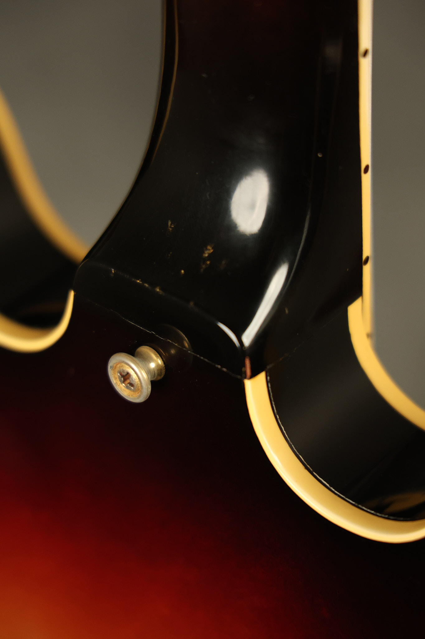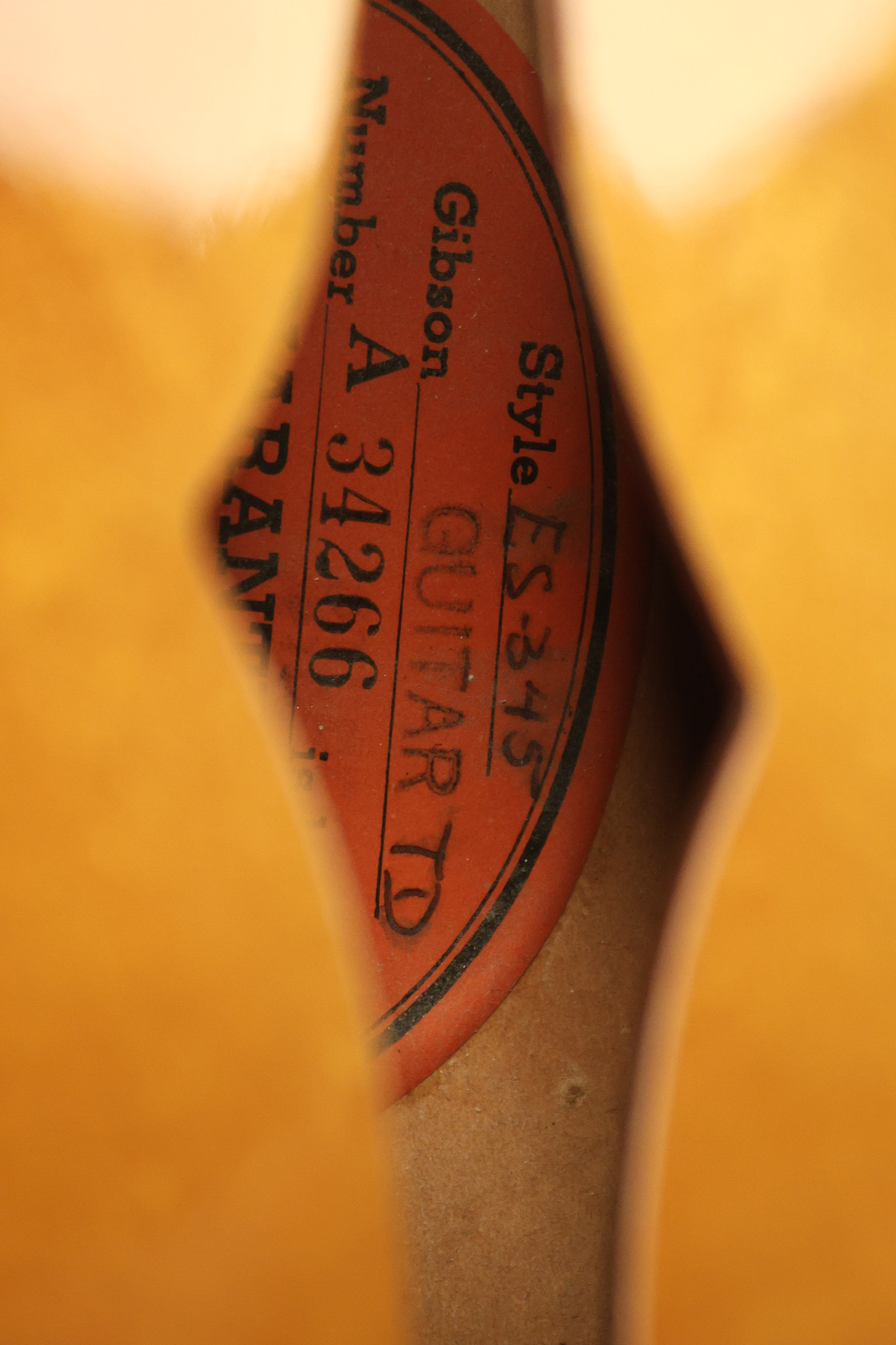 1960 Gibson ES-345 in its original Sunburst finish which has really maintained its brilliance. It has a great playing neck with good frets. It's all original except for 4 replaced tuning buttons, and 100% complete along with its original hardshell case. There are 4 small screw holes on the bottom edge where a Bigsby had been installed at one time. This 345 looks great with some nicks + dings and other cosmetic wear. The guitar itself remains structurally sound with no cracks, breaks or repairs. All electronics work and sound great with its original set of "Zebra" (black/white) PAF pickups. The cover have been removed at one point in time before being soldered back in place.