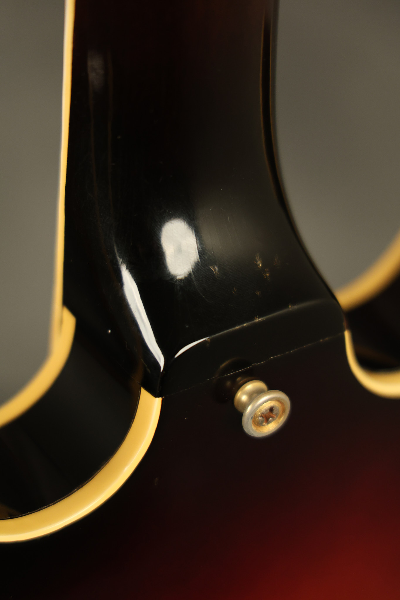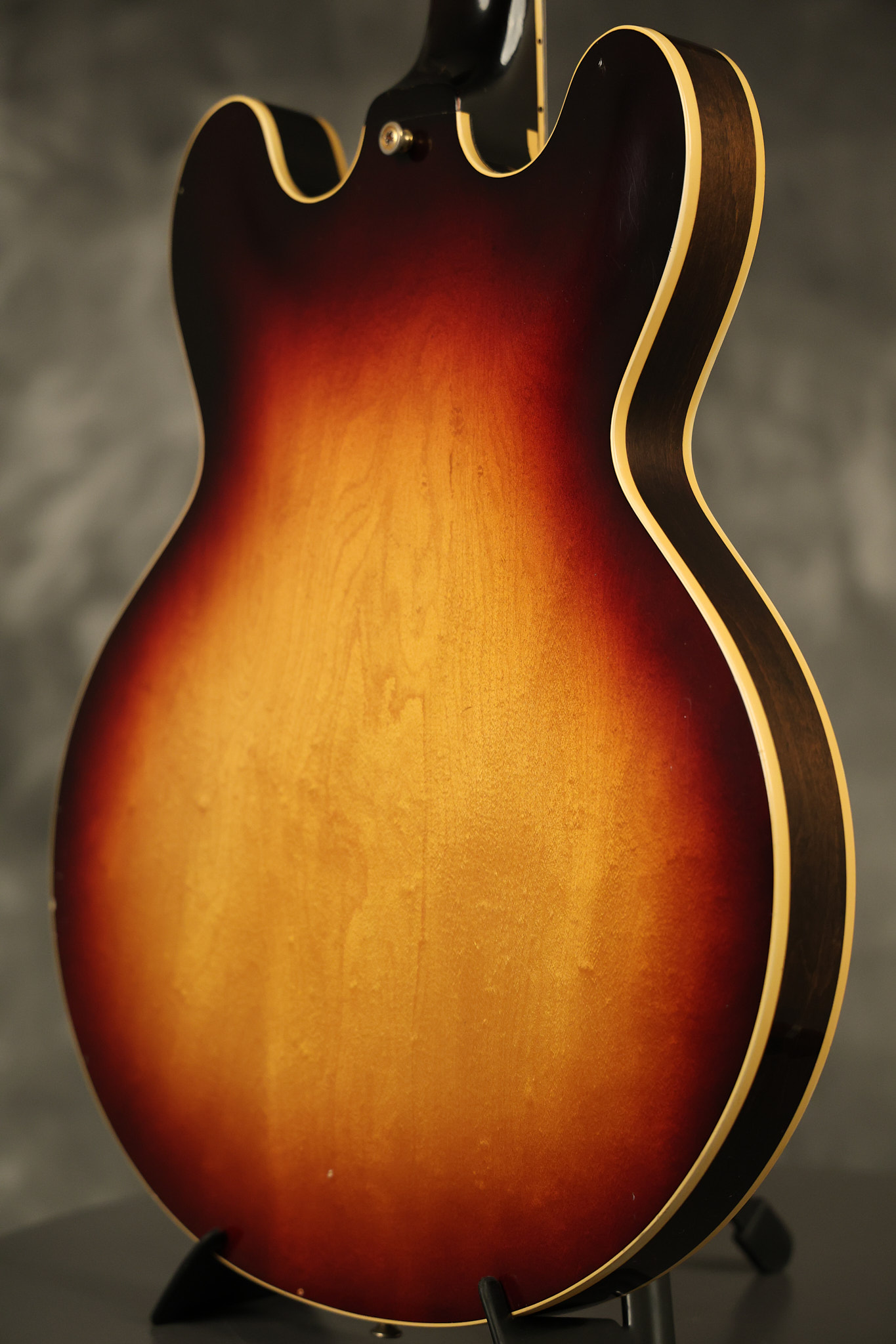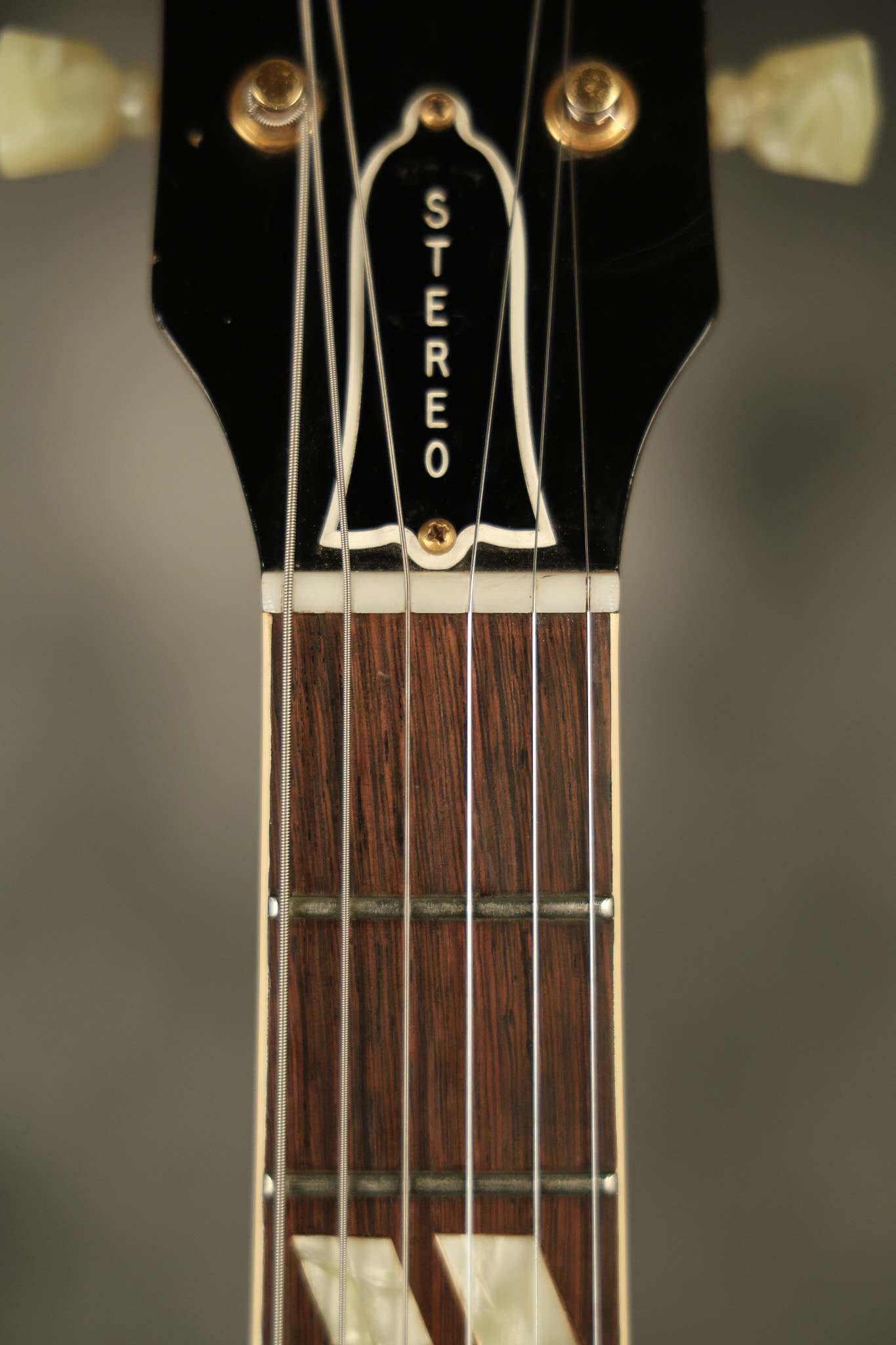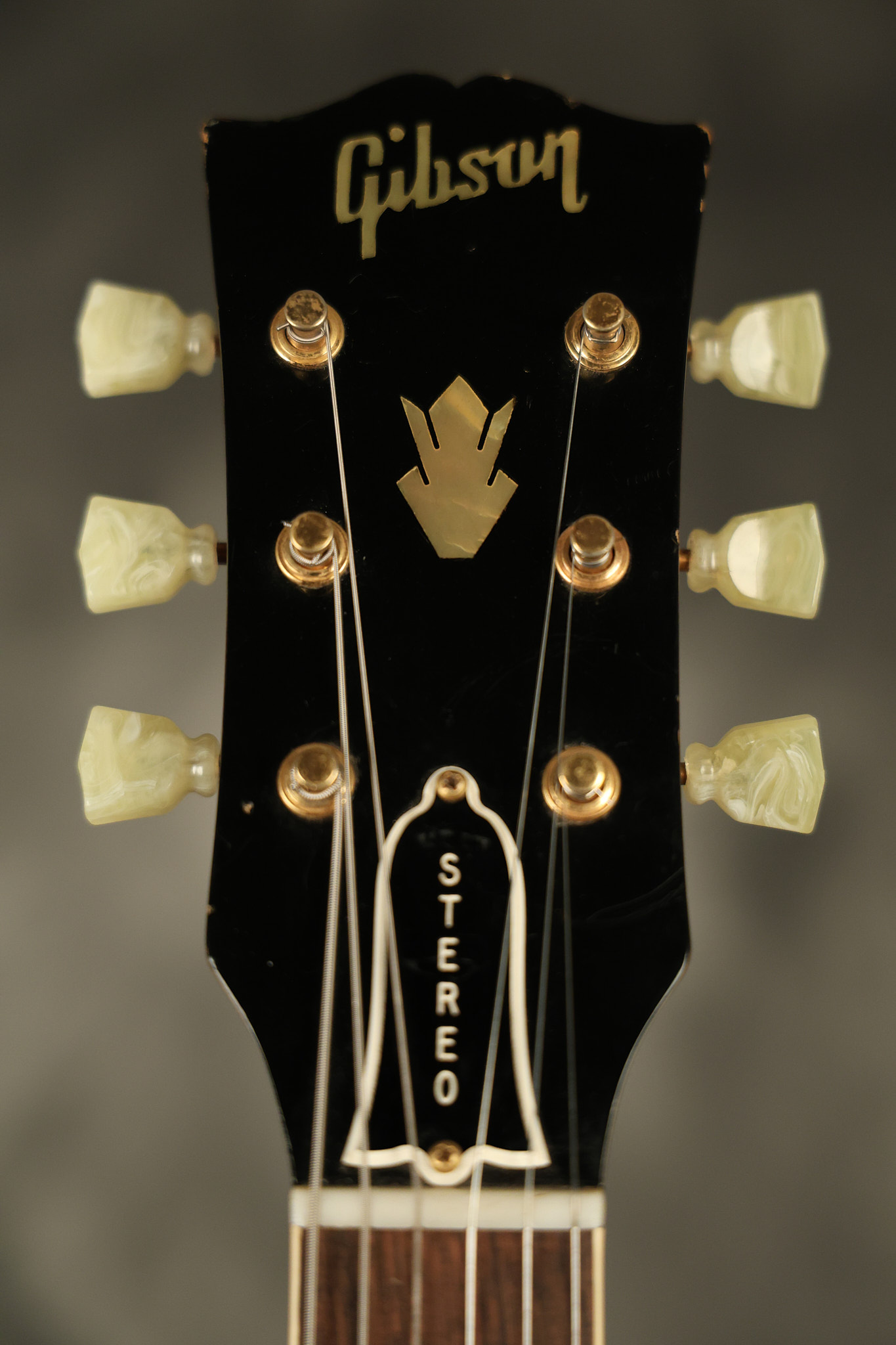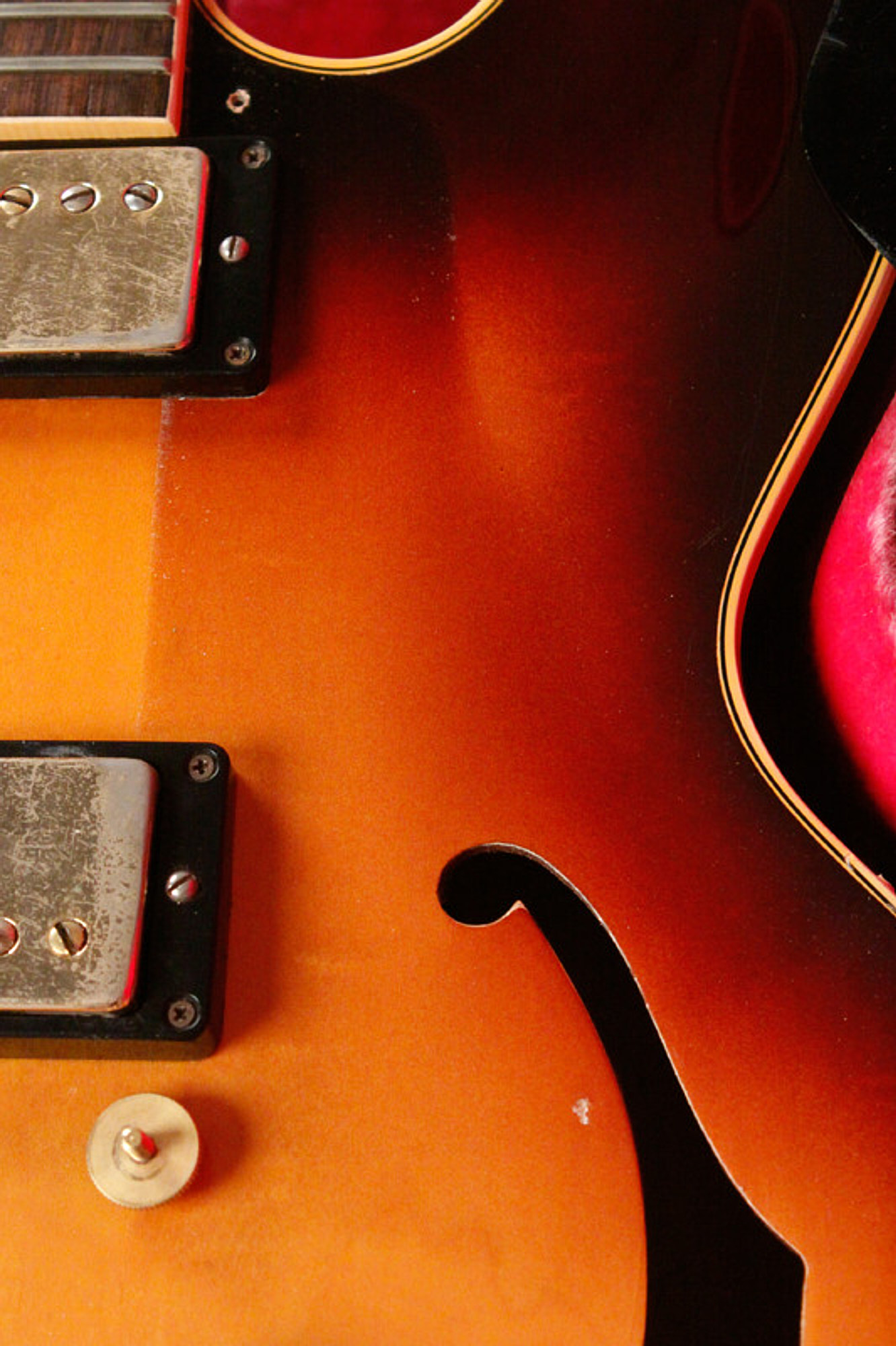 1960 Gibson ES-345 in its original Sunburst finish which has really maintained its brilliance. It has a great playing neck with good frets. It's all original except for 4 replaced tuning buttons, and 100% complete along with its original hardshell case. There are 4 small screw holes on the bottom edge where a Bigsby had been installed at one time. This 345 looks great with some nicks + dings and other cosmetic wear. The guitar itself remains structurally sound with no cracks, breaks or repairs. All electronics work and sound great with its original set of "Zebra" (black/white) PAF pickups. The cover have been removed at one point in time before being soldered back in place.
