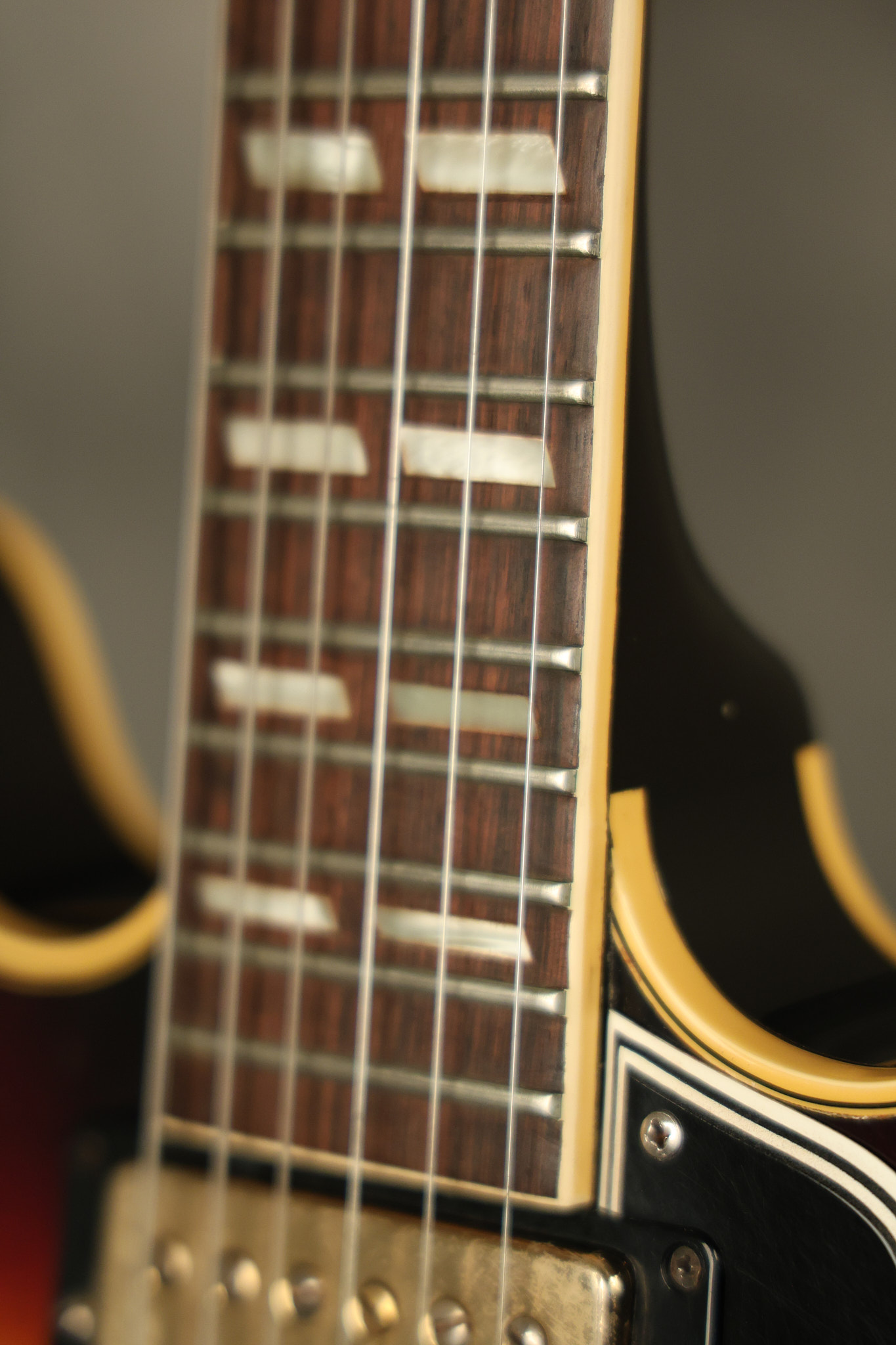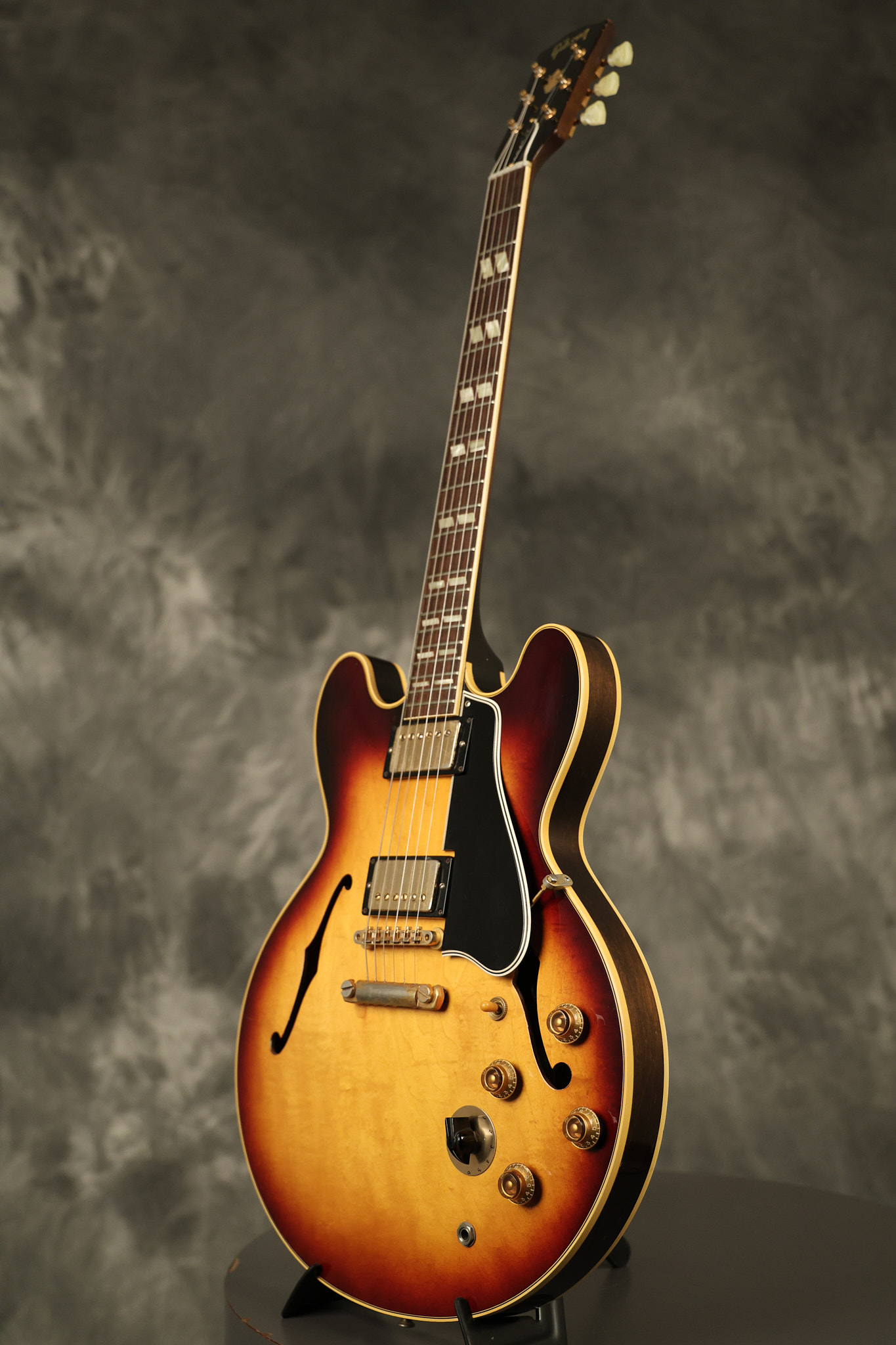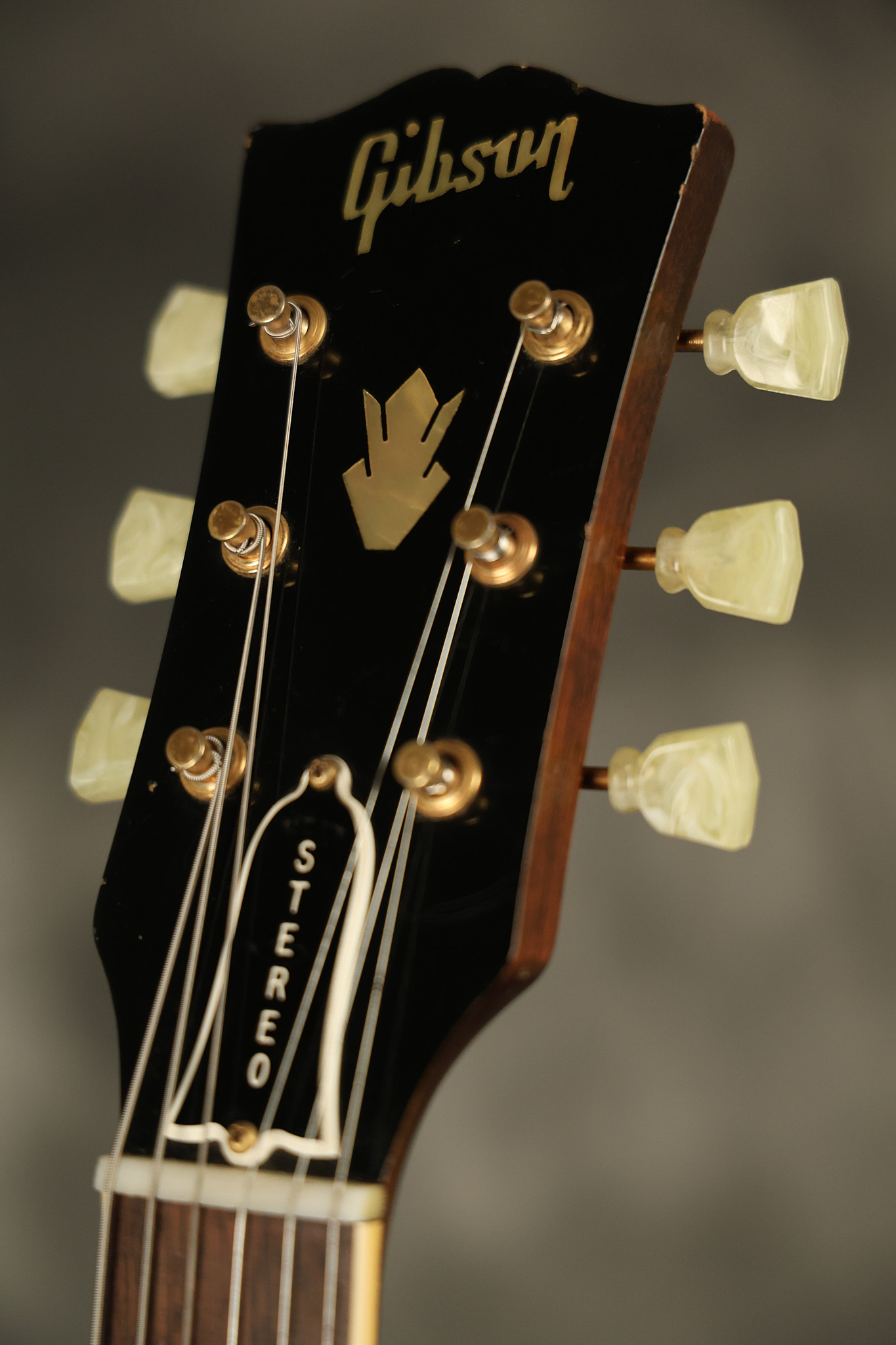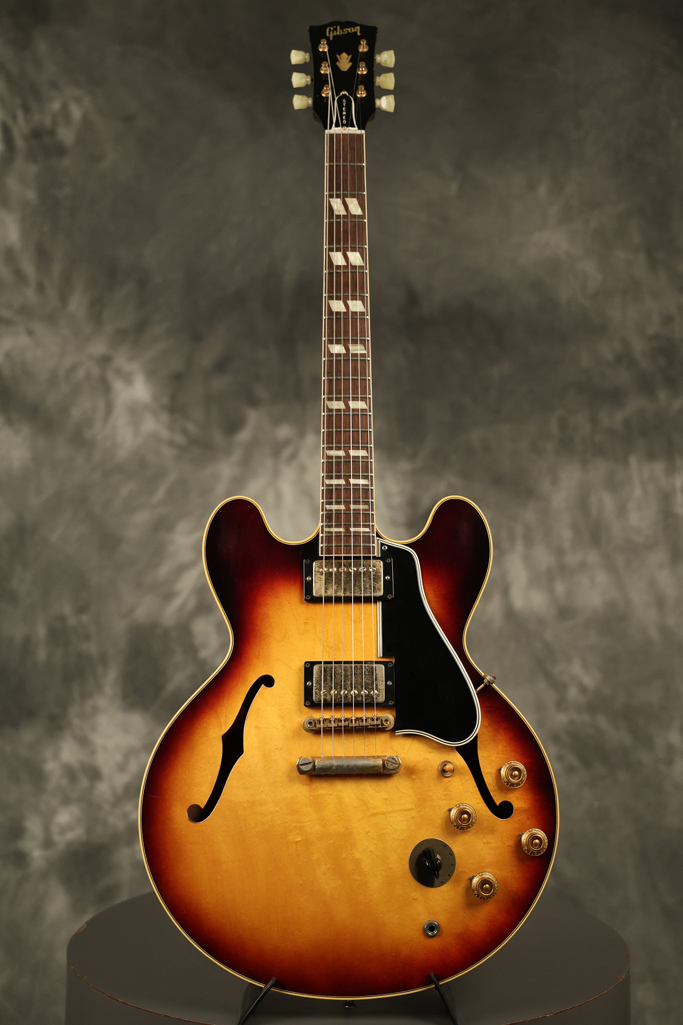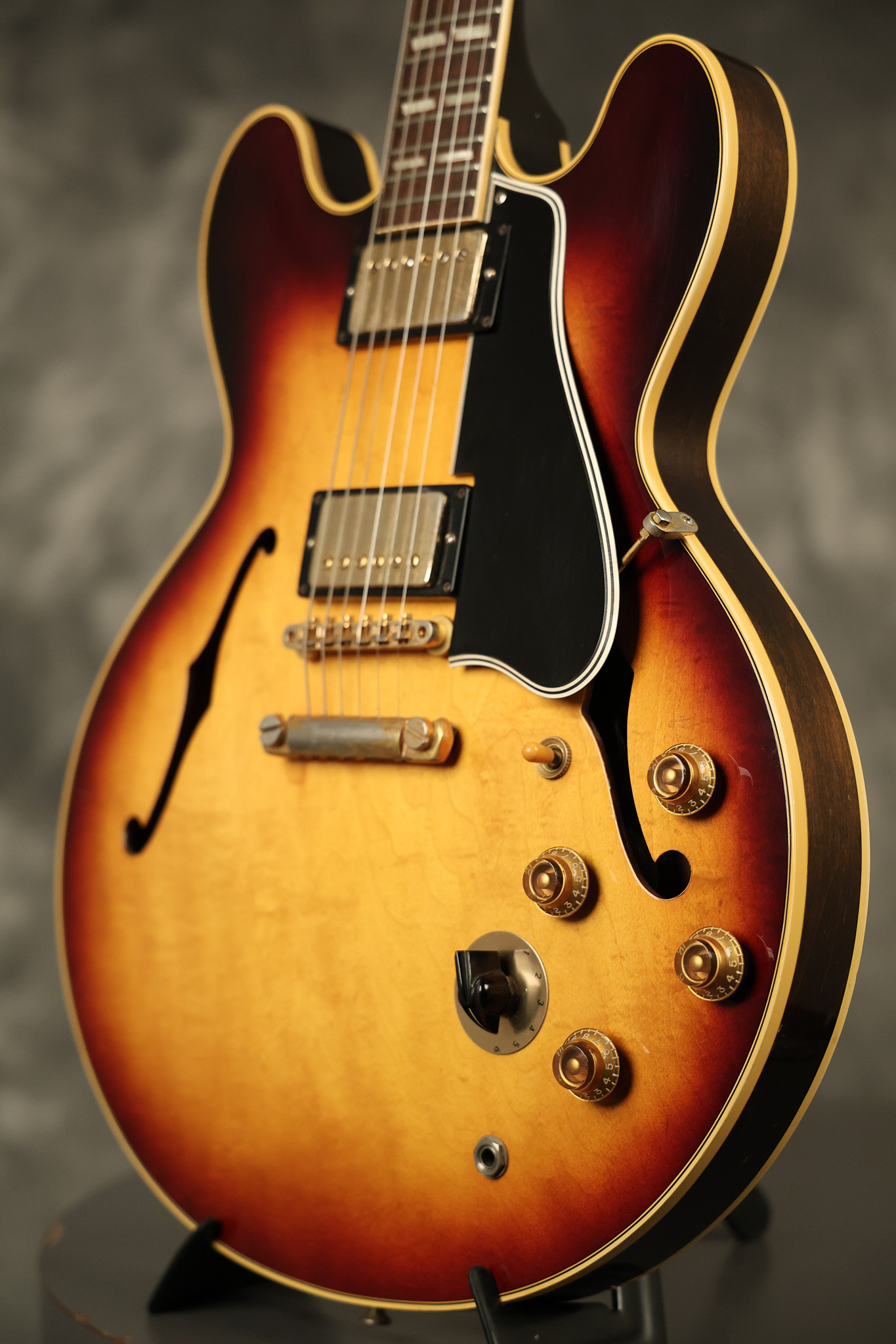 1960 Gibson ES-345 in its original Sunburst finish which has really maintained its brilliance. It has a great playing neck with good frets. It's all original except for 4 replaced tuning buttons, and 100% complete along with its original hardshell case. There are 4 small screw holes on the bottom edge where a Bigsby had been installed at one time. This 345 looks great with some nicks + dings and other cosmetic wear. The guitar itself remains structurally sound with no cracks, breaks or repairs. All electronics work and sound great with its original set of "Zebra" (black/white) PAF pickups. The cover have been removed at one point in time before being soldered back in place.