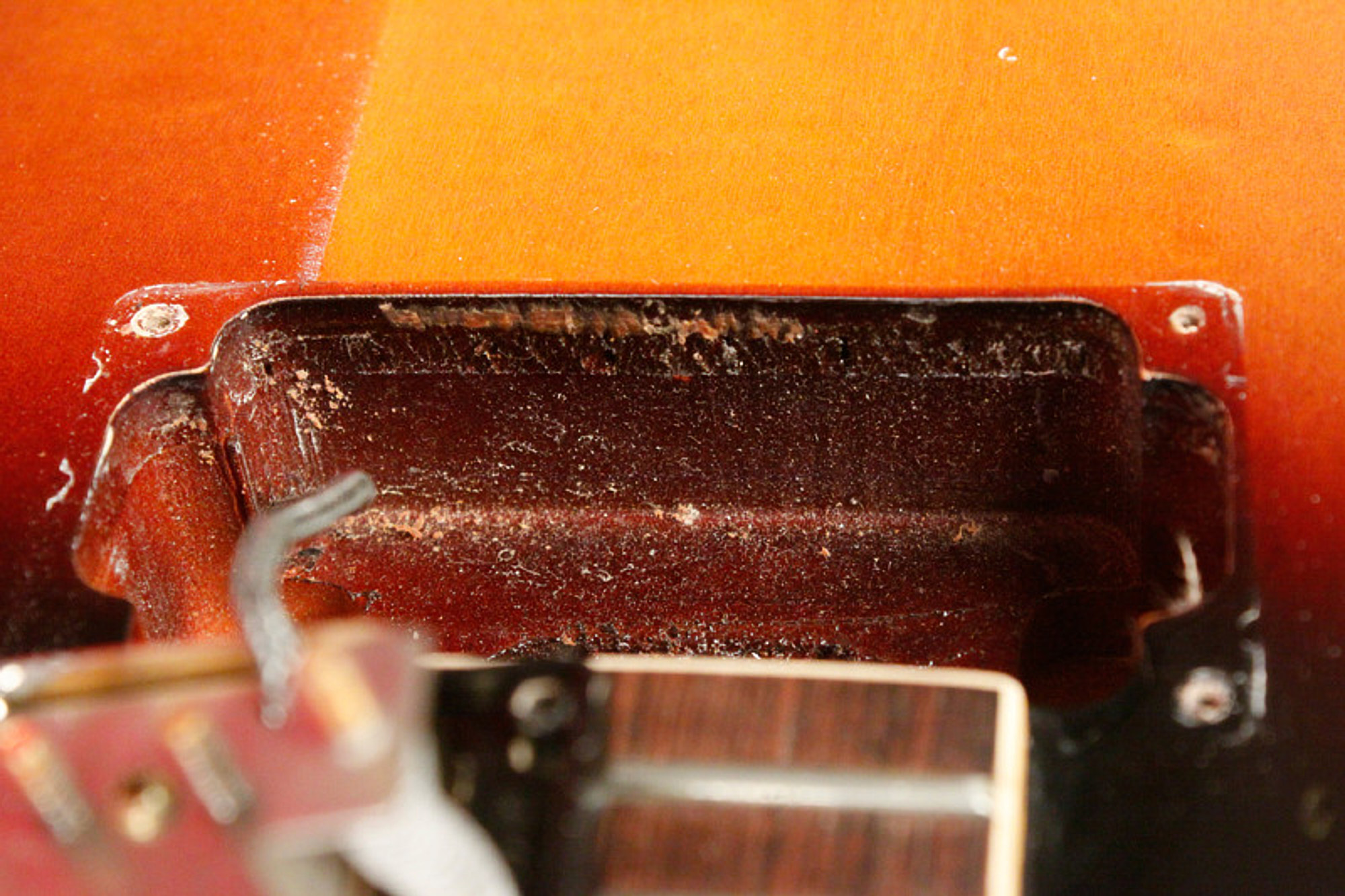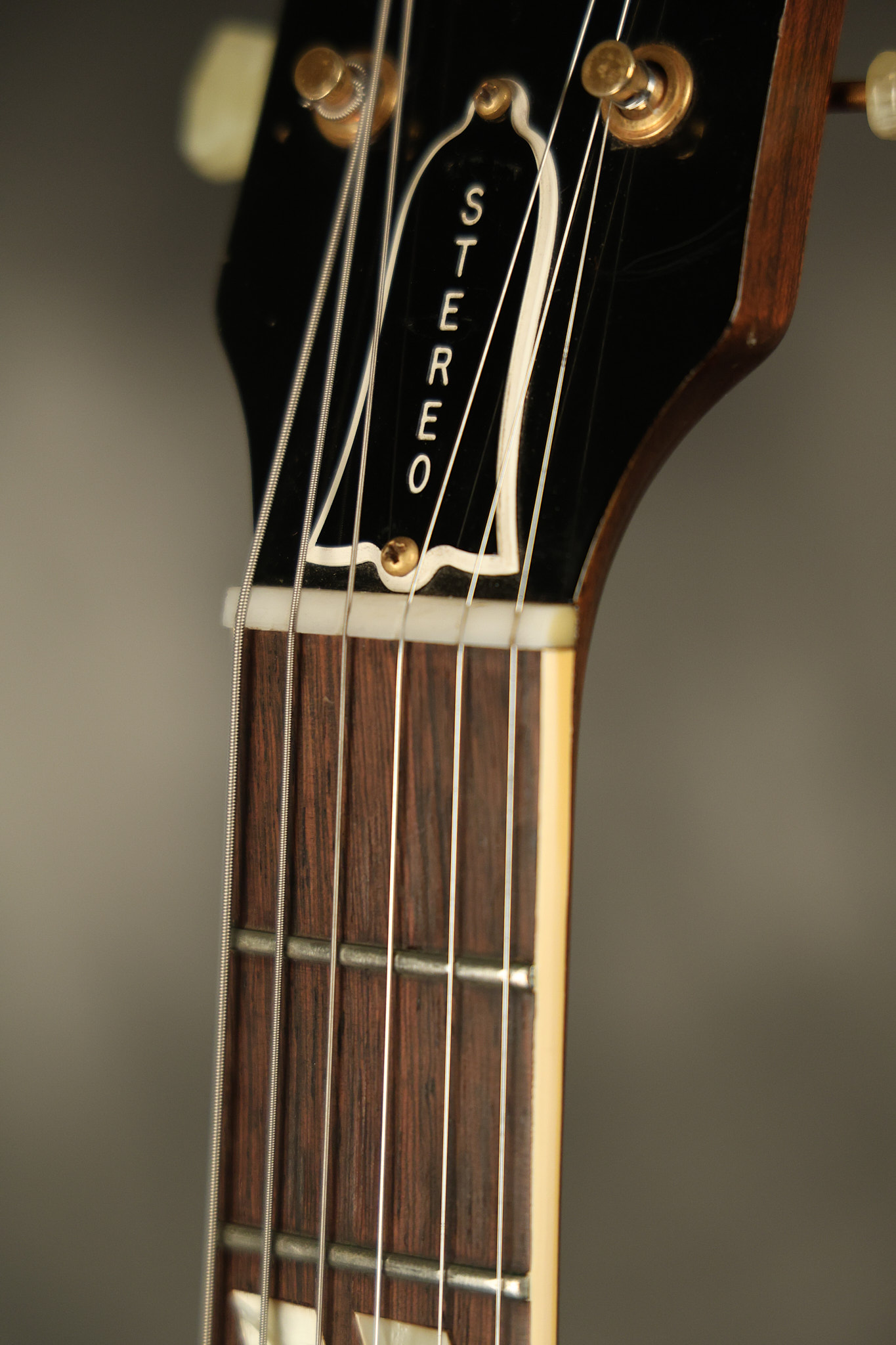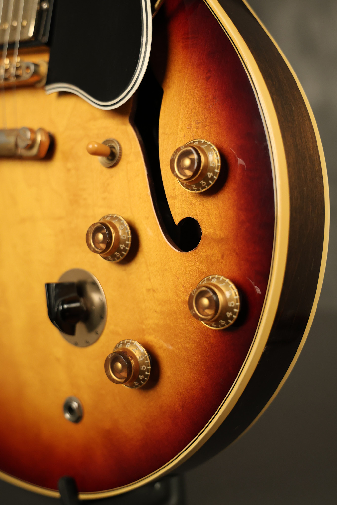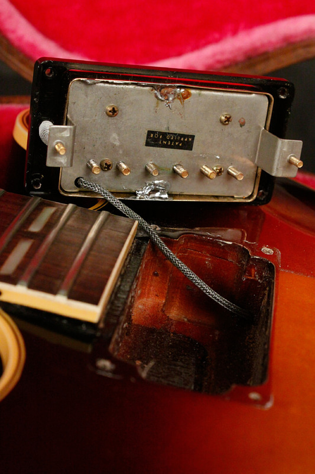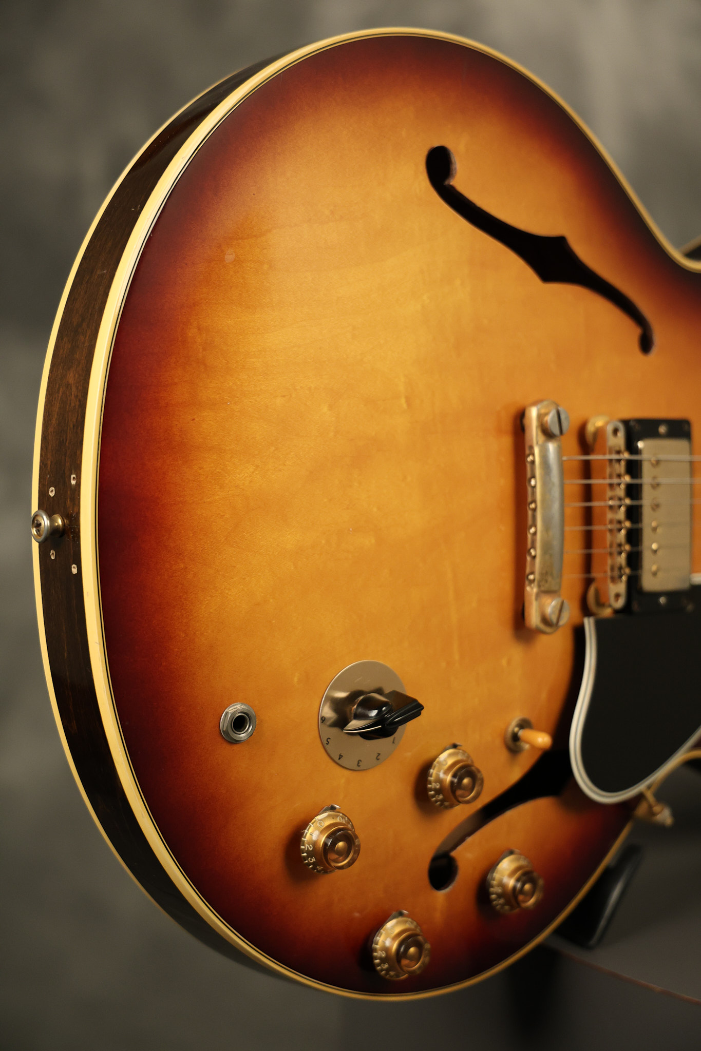 1960 Gibson ES-345 in its original Sunburst finish which has really maintained its brilliance. It has a great playing neck with good frets. It's all original except for 4 replaced tuning buttons, and 100% complete along with its original hardshell case. There are 4 small screw holes on the bottom edge where a Bigsby had been installed at one time. This 345 looks great with some nicks + dings and other cosmetic wear. The guitar itself remains structurally sound with no cracks, breaks or repairs. All electronics work and sound great with its original set of "Zebra" (black/white) PAF pickups. The cover have been removed at one point in time before being soldered back in place.