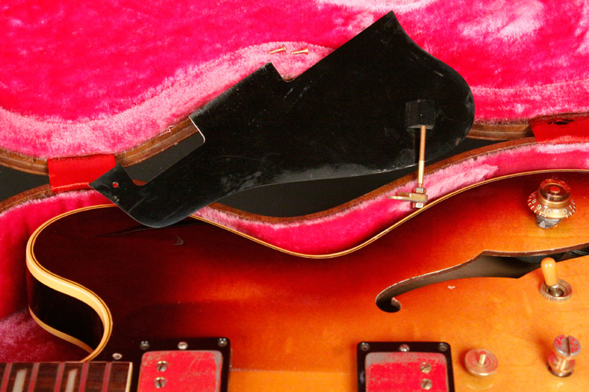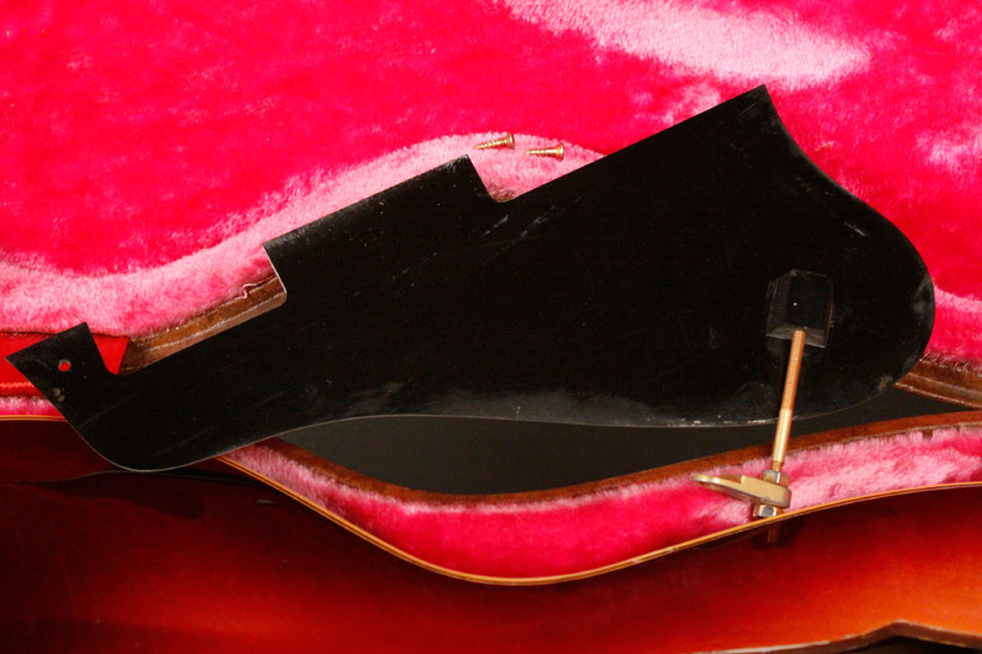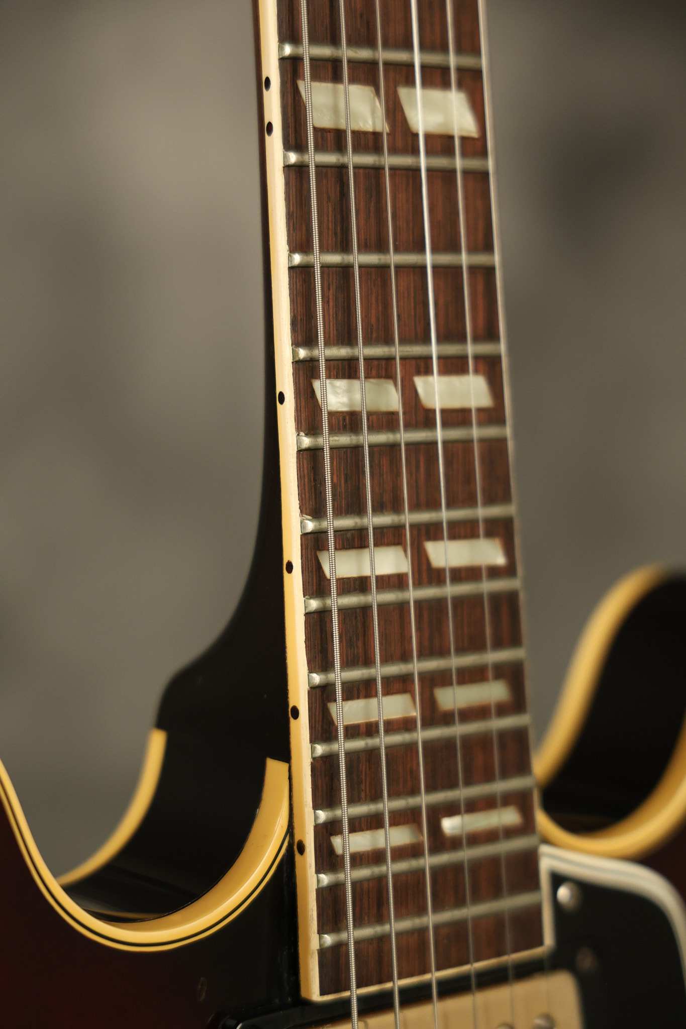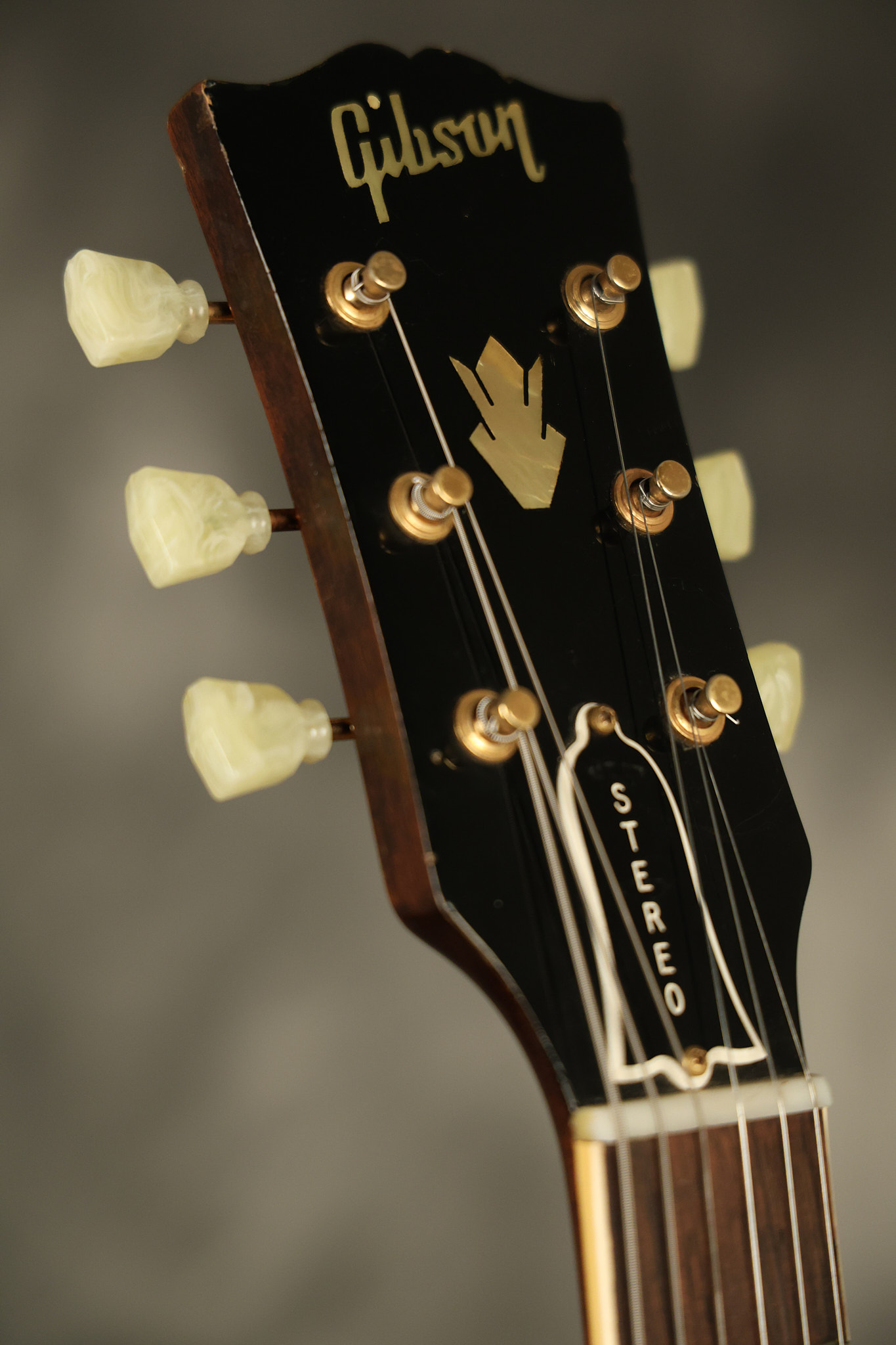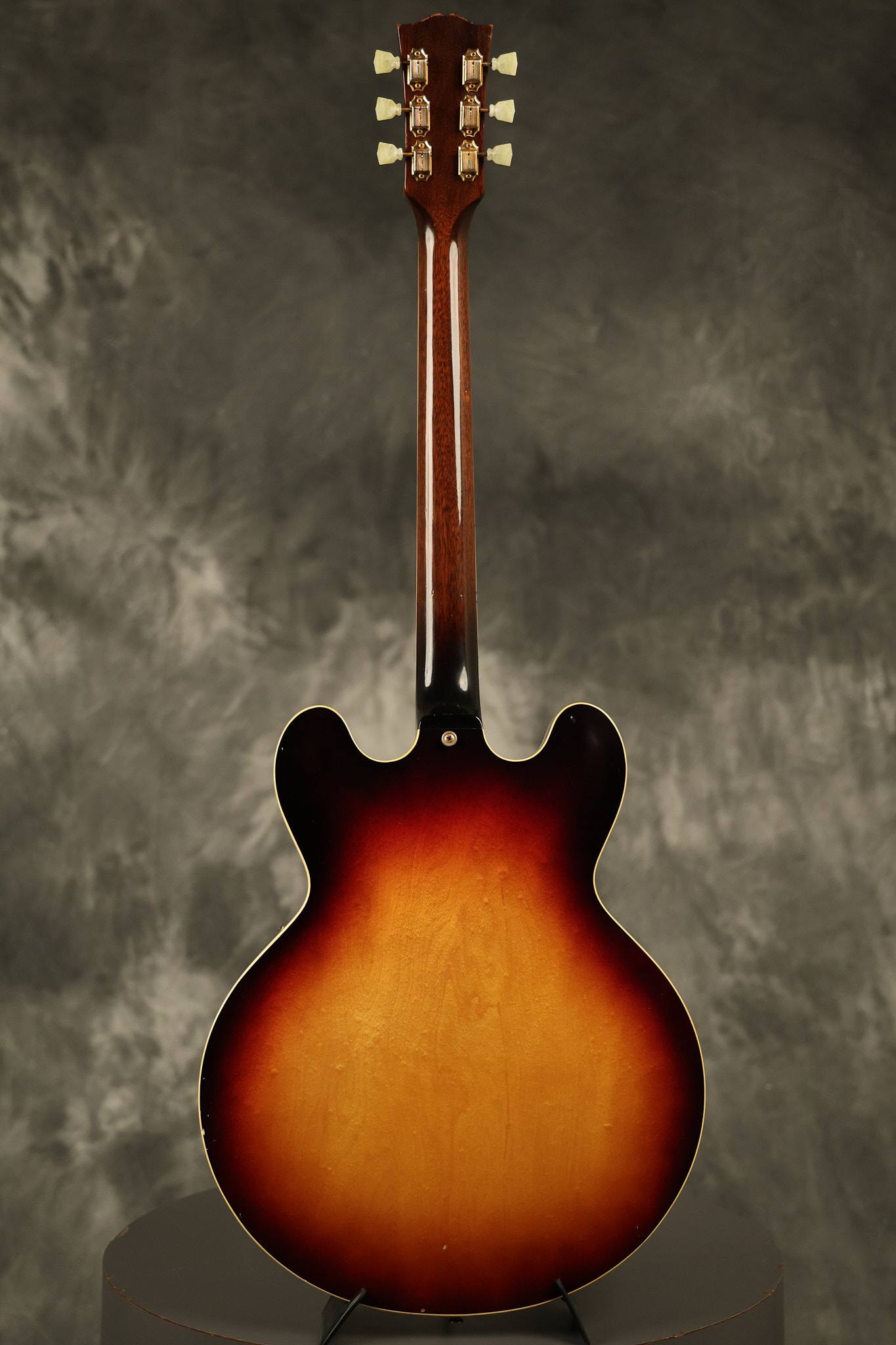 1960 Gibson ES-345 in its original Sunburst finish which has really maintained its brilliance. It has a great playing neck with good frets. It's all original except for 4 replaced tuning buttons, and 100% complete along with its original hardshell case. There are 4 small screw holes on the bottom edge where a Bigsby had been installed at one time. This 345 looks great with some nicks + dings and other cosmetic wear. The guitar itself remains structurally sound with no cracks, breaks or repairs. All electronics work and sound great with its original set of "Zebra" (black/white) PAF pickups. The cover have been removed at one point in time before being soldered back in place.