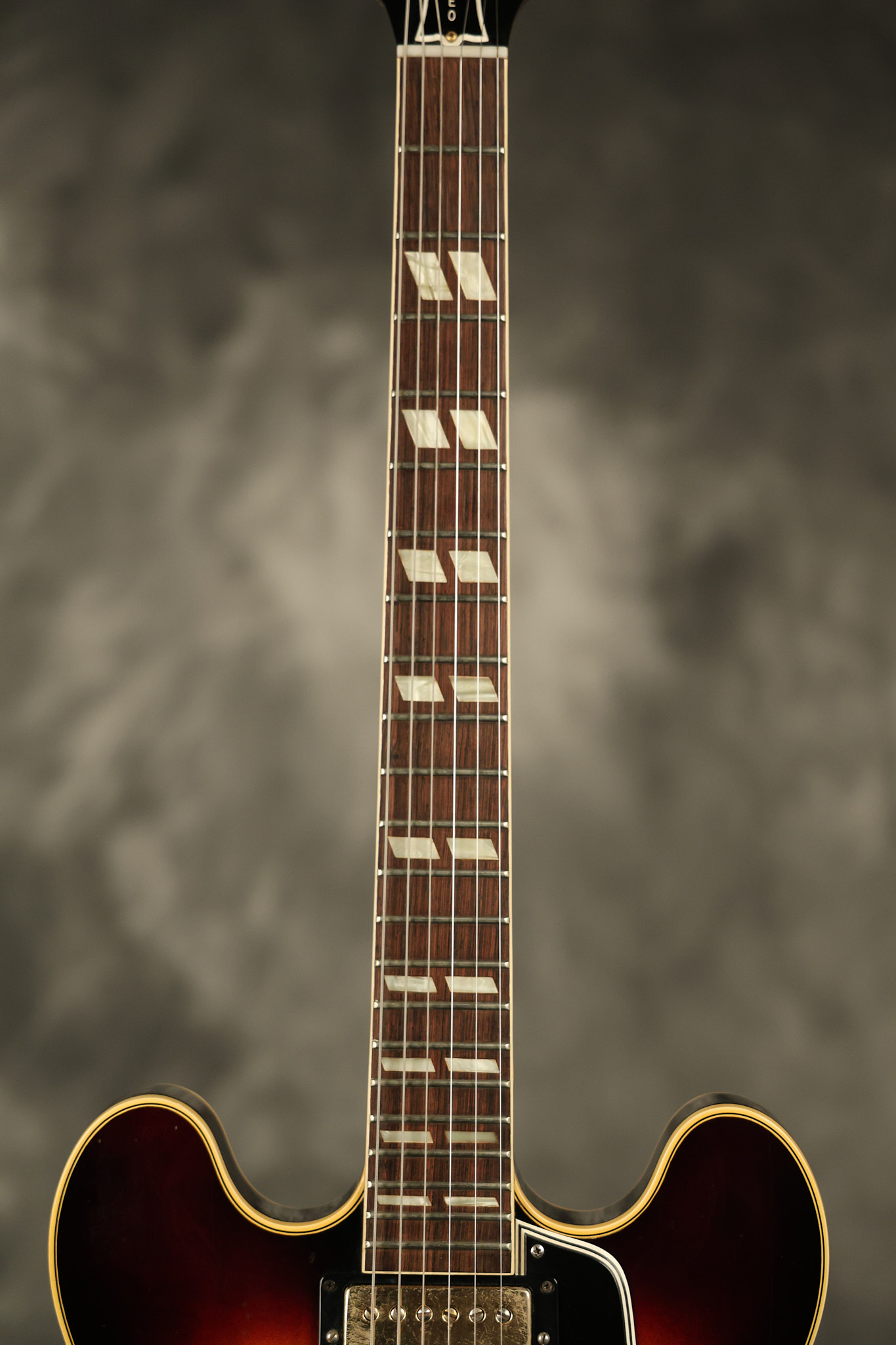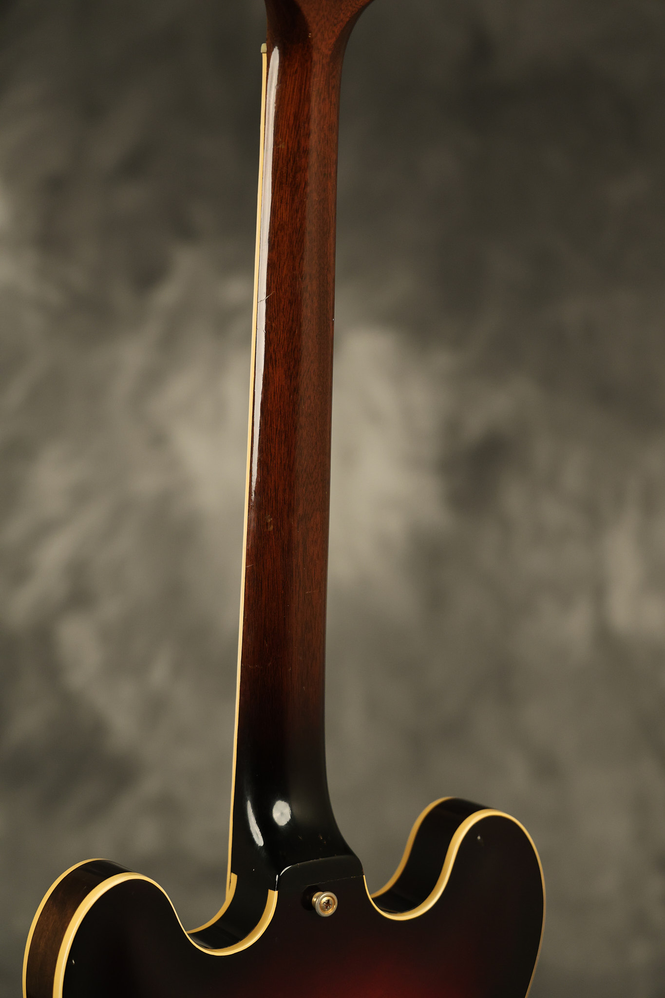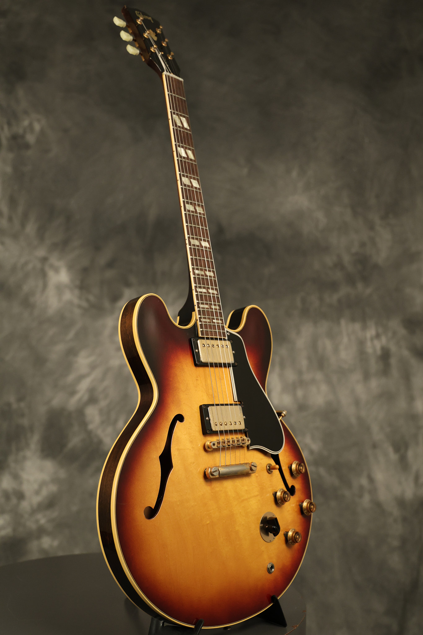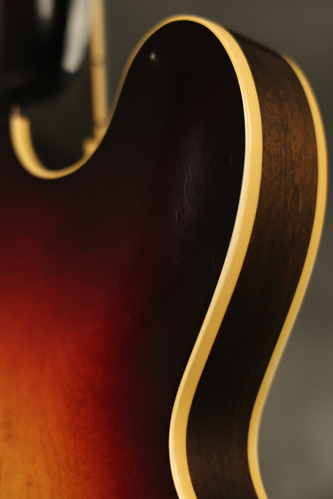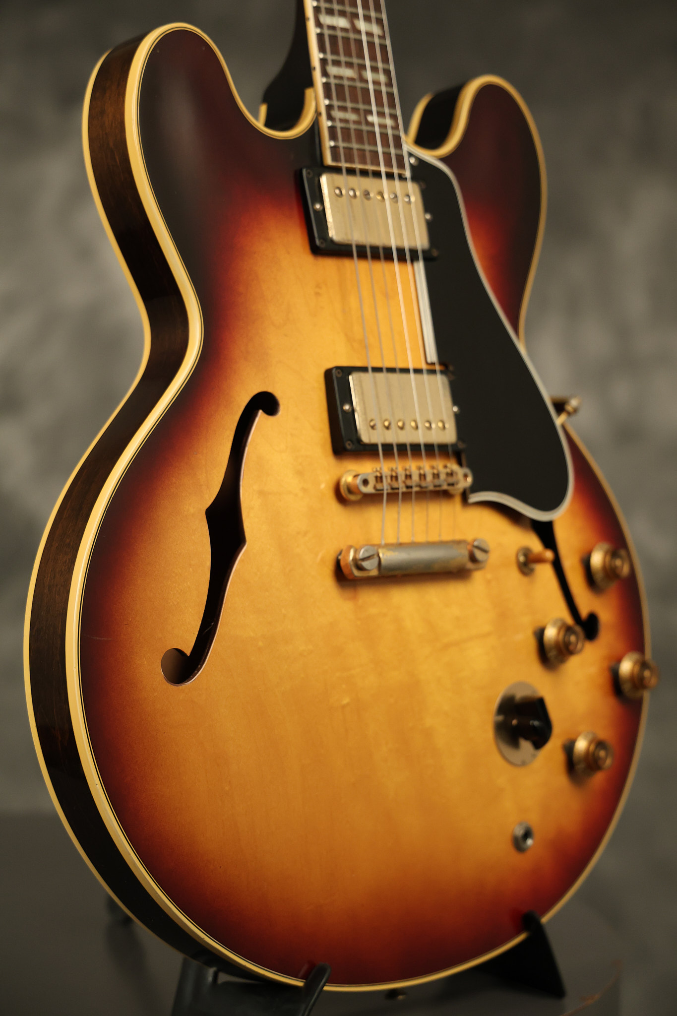 1960 Gibson ES-345 in its original Sunburst finish which has really maintained its brilliance. It has a great playing neck with good frets. It's all original except for 4 replaced tuning buttons, and 100% complete along with its original hardshell case. There are 4 small screw holes on the bottom edge where a Bigsby had been installed at one time. This 345 looks great with some nicks + dings and other cosmetic wear. The guitar itself remains structurally sound with no cracks, breaks or repairs. All electronics work and sound great with its original set of "Zebra" (black/white) PAF pickups. The cover have been removed at one point in time before being soldered back in place.