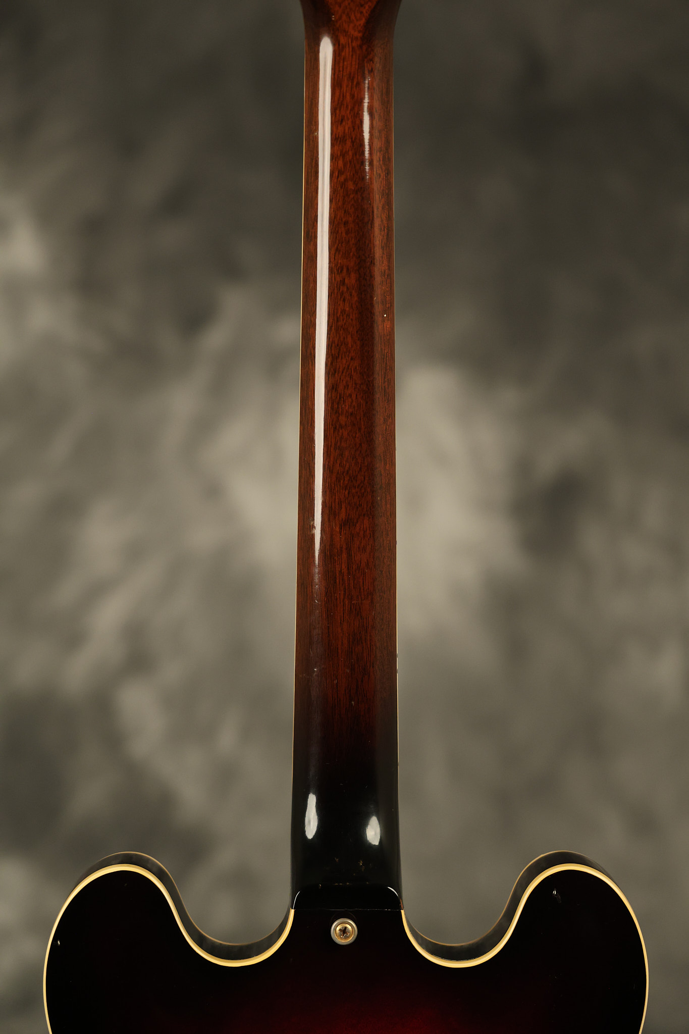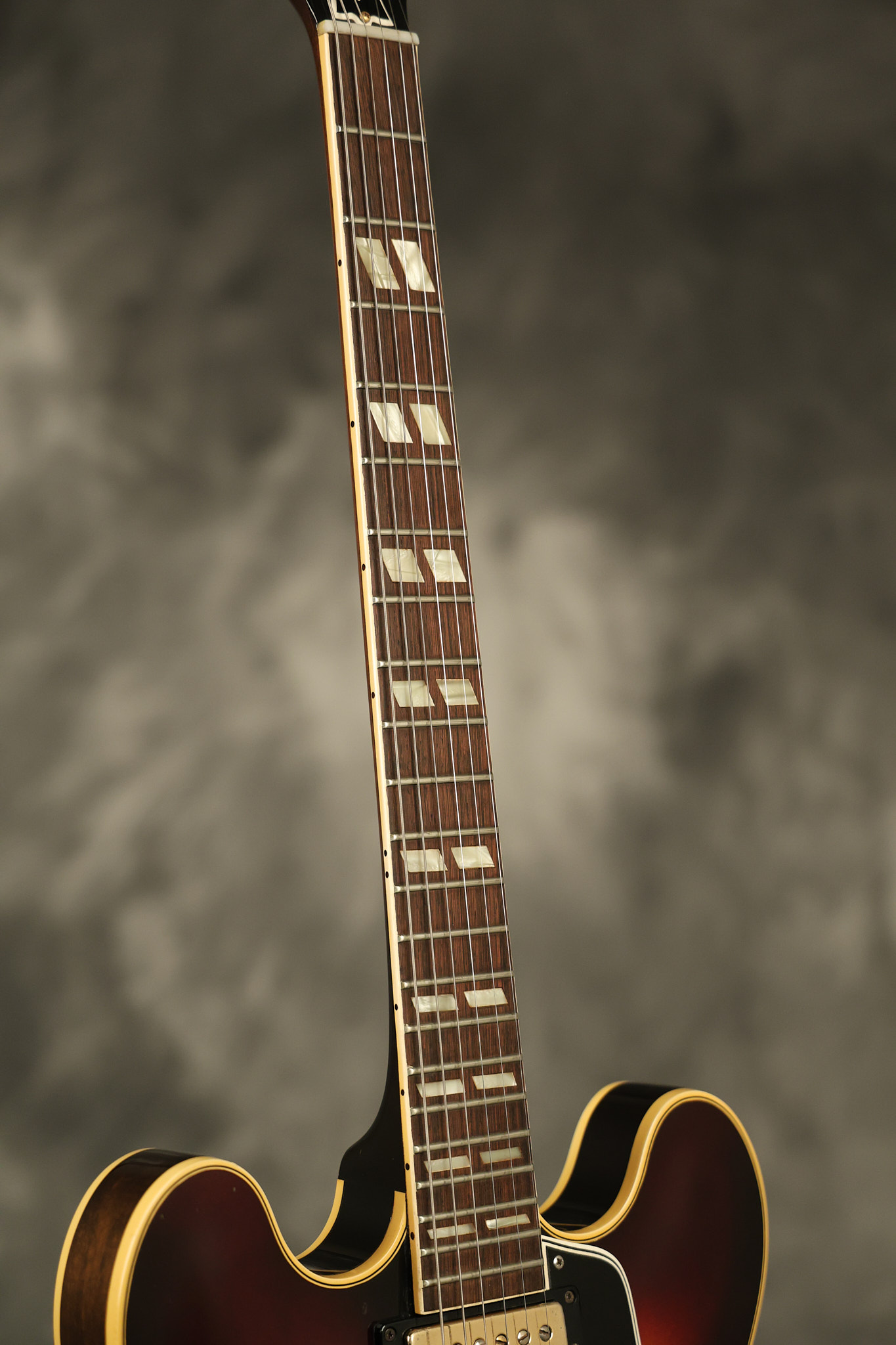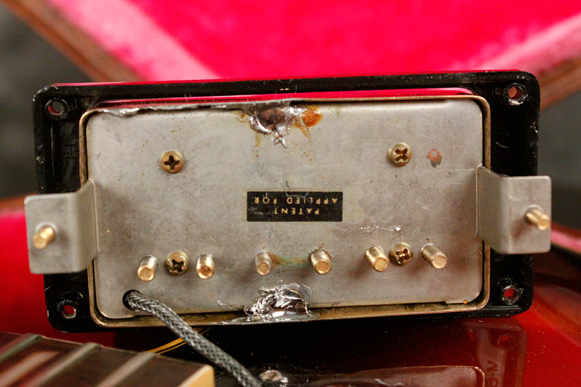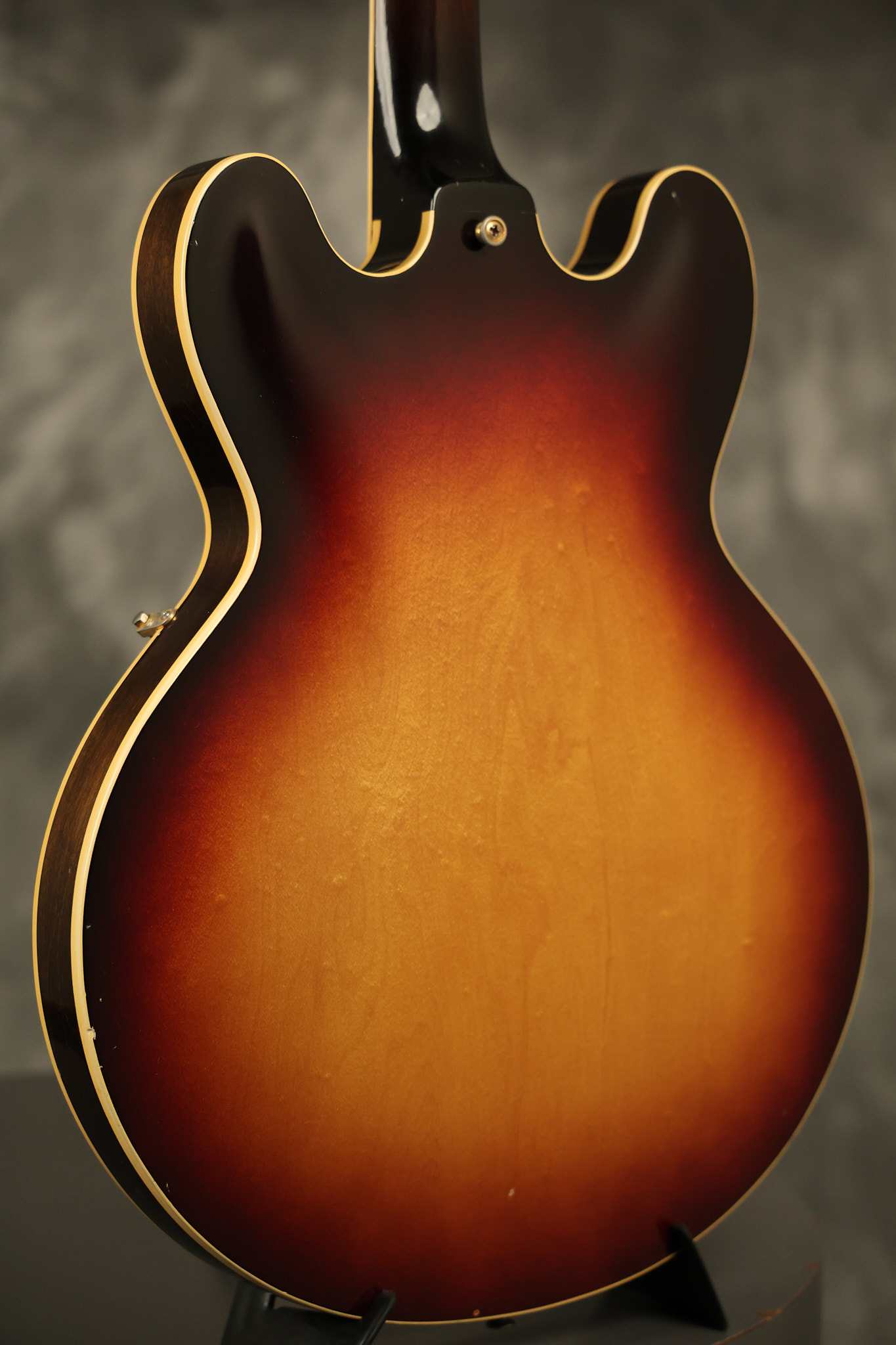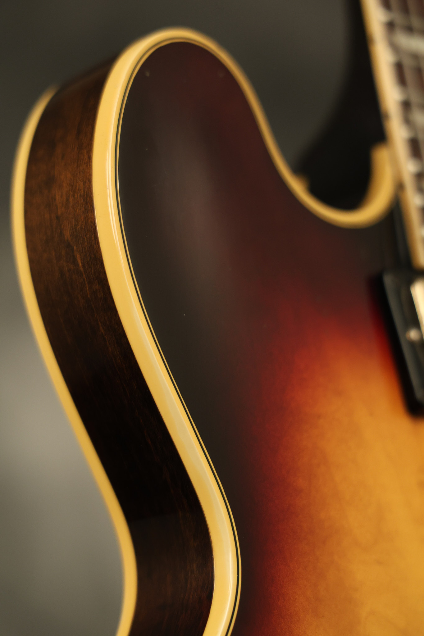 1960 Gibson ES-345 in its original Sunburst finish which has really maintained its brilliance. It has a great playing neck with good frets. It's all original except for 4 replaced tuning buttons, and 100% complete along with its original hardshell case. There are 4 small screw holes on the bottom edge where a Bigsby had been installed at one time. This 345 looks great with some nicks + dings and other cosmetic wear. The guitar itself remains structurally sound with no cracks, breaks or repairs. All electronics work and sound great with its original set of "Zebra" (black/white) PAF pickups. The cover have been removed at one point in time before being soldered back in place.