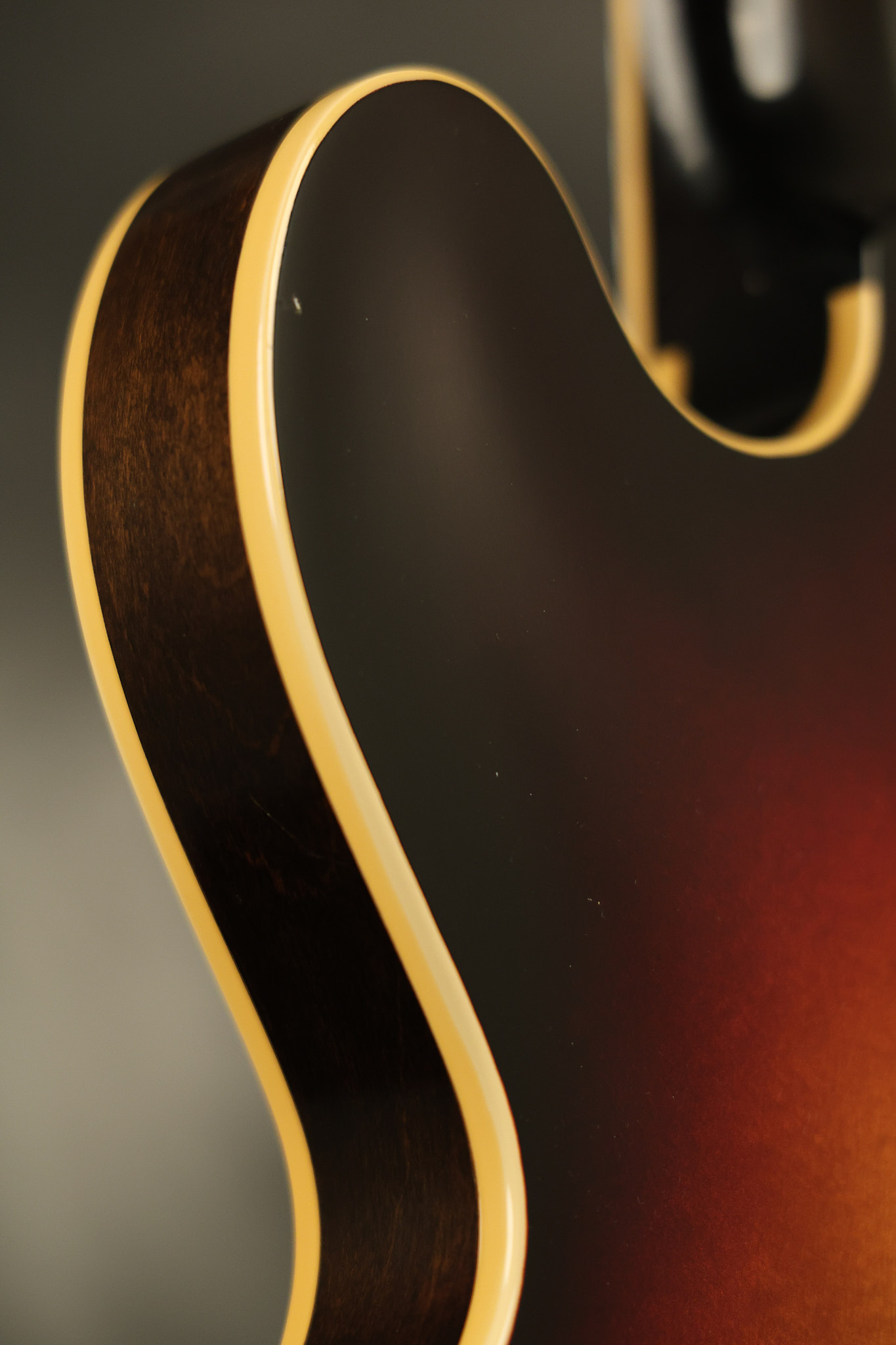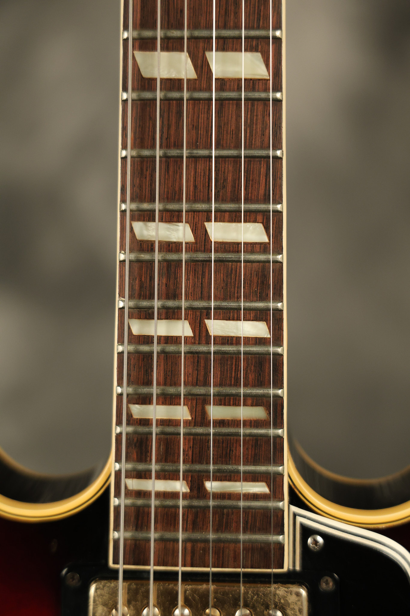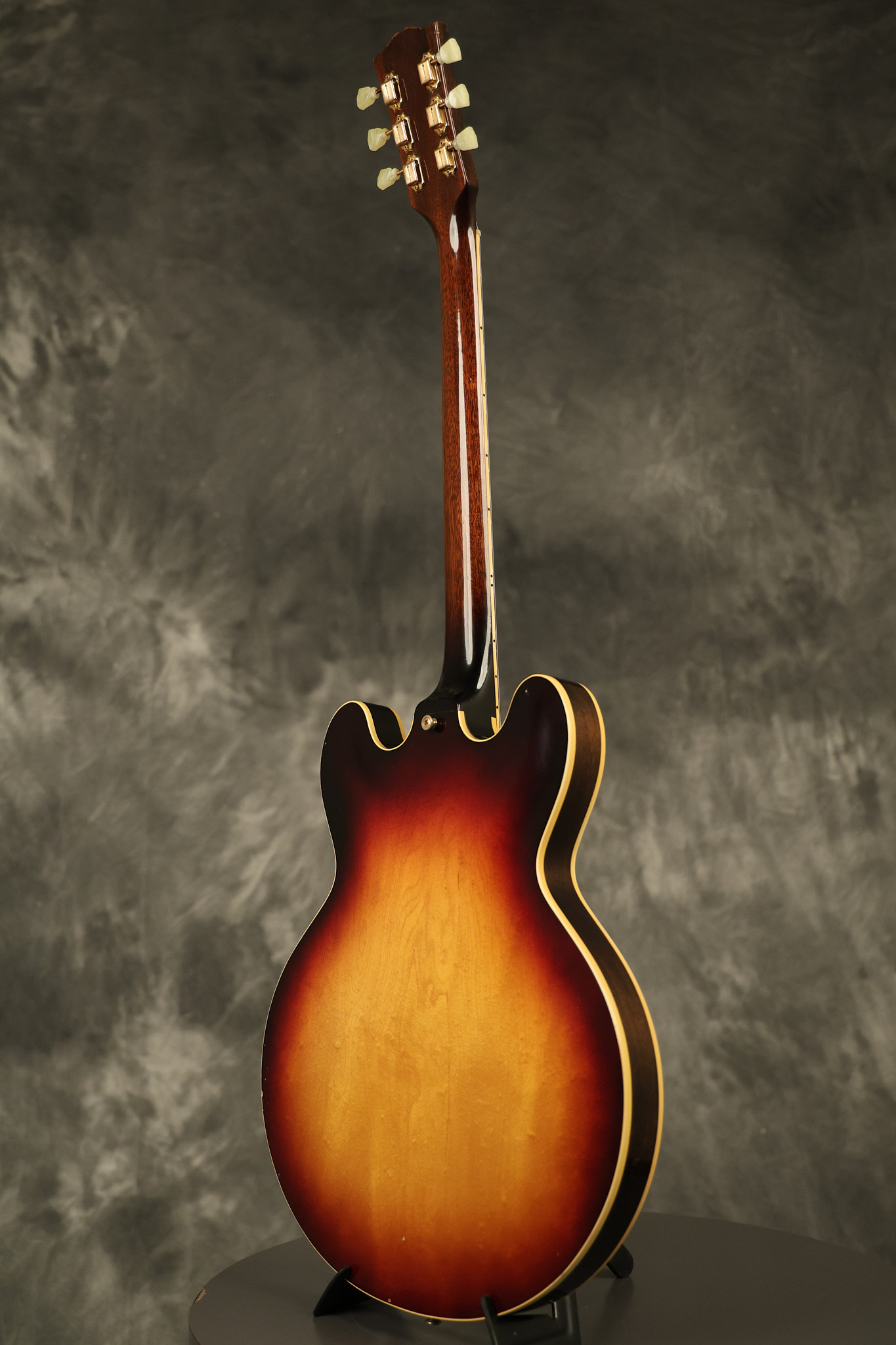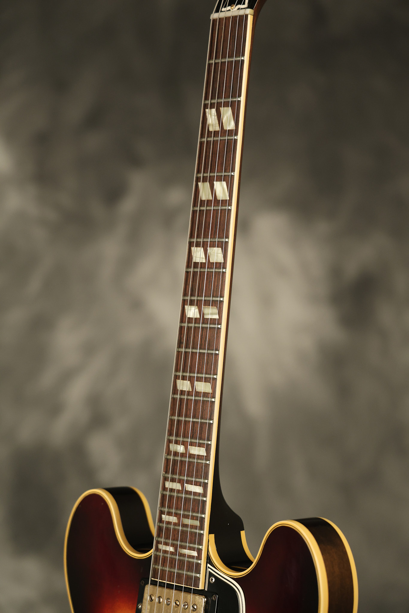 1960 Gibson ES-345 in its original Sunburst finish which has really maintained its brilliance. It has a great playing neck with good frets. It's all original except for 4 replaced tuning buttons, and 100% complete along with its original hardshell case. There are 4 small screw holes on the bottom edge where a Bigsby had been installed at one time. This 345 looks great with some nicks + dings and other cosmetic wear. The guitar itself remains structurally sound with no cracks, breaks or repairs. All electronics work and sound great with its original set of "Zebra" (black/white) PAF pickups. The cover have been removed at one point in time before being soldered back in place.
