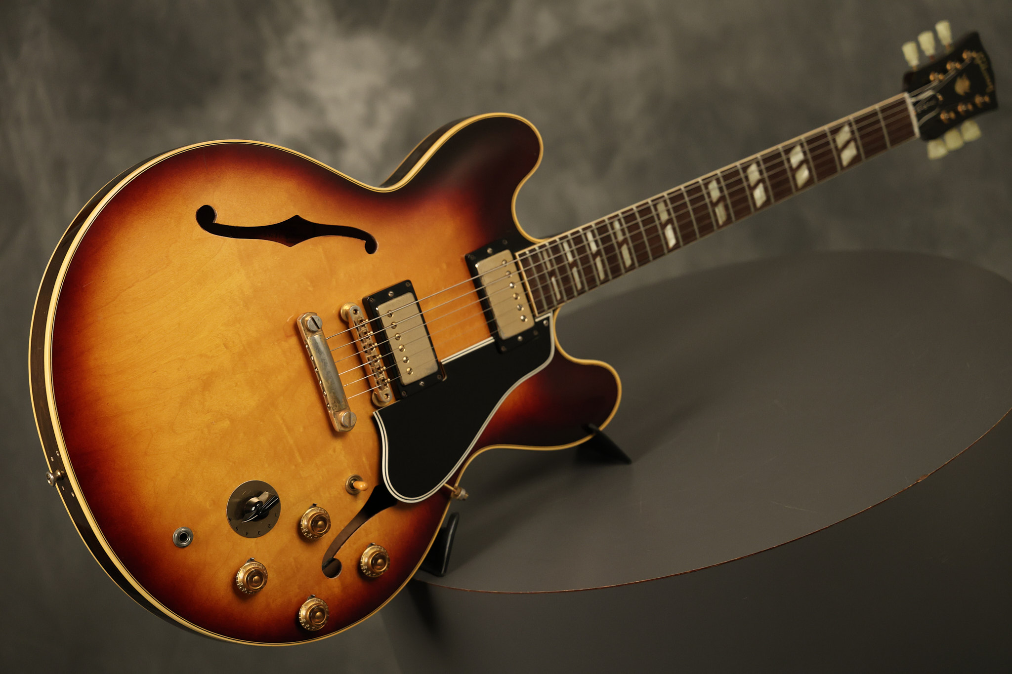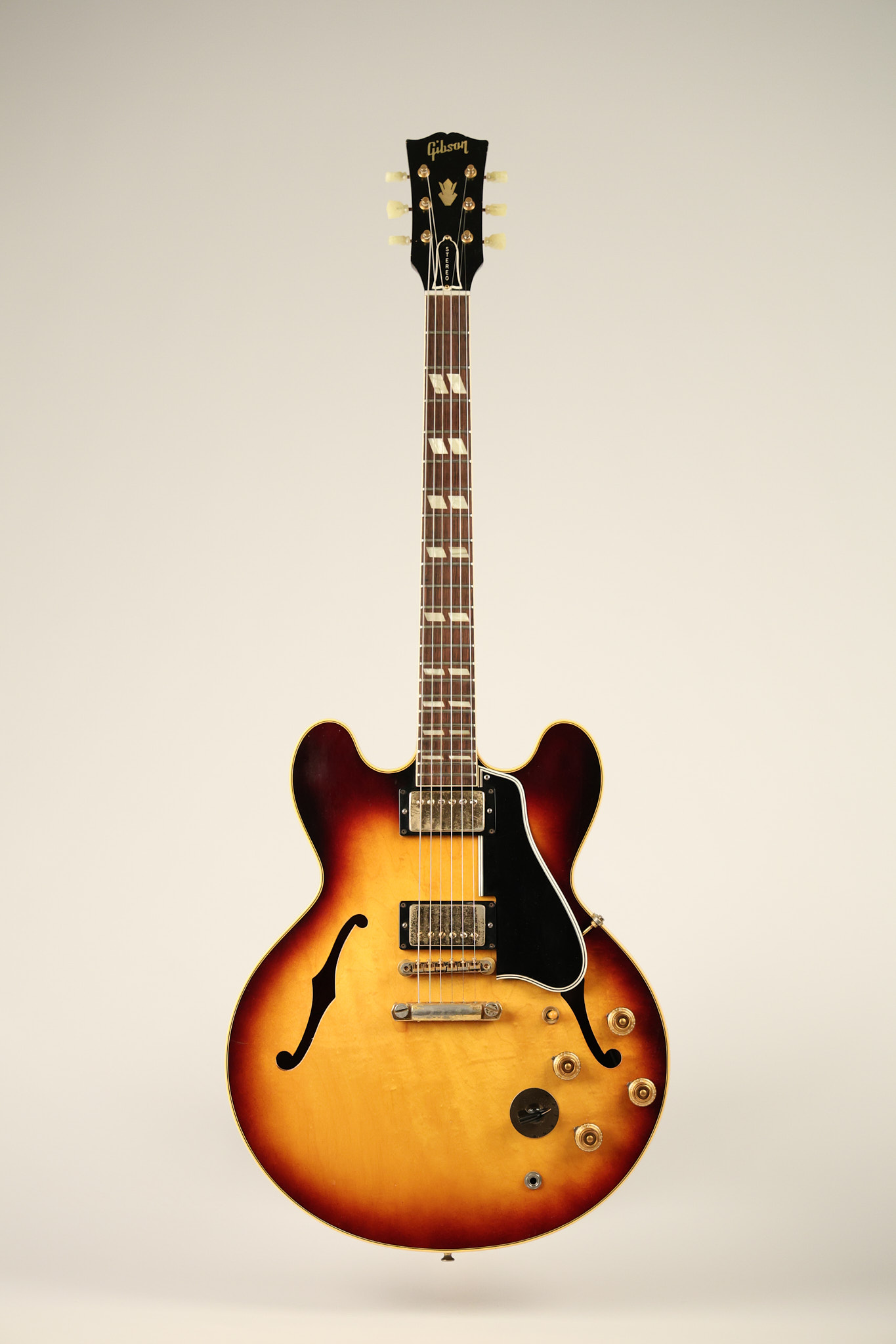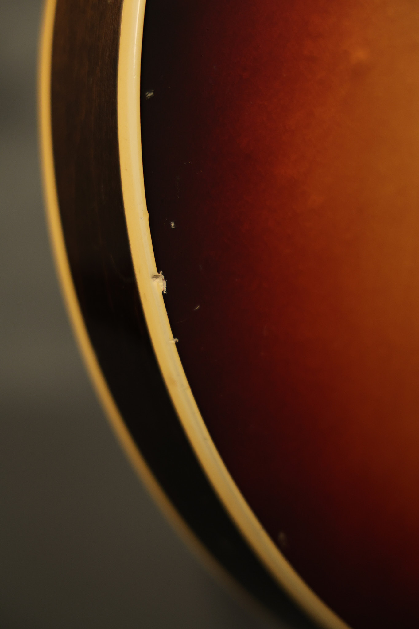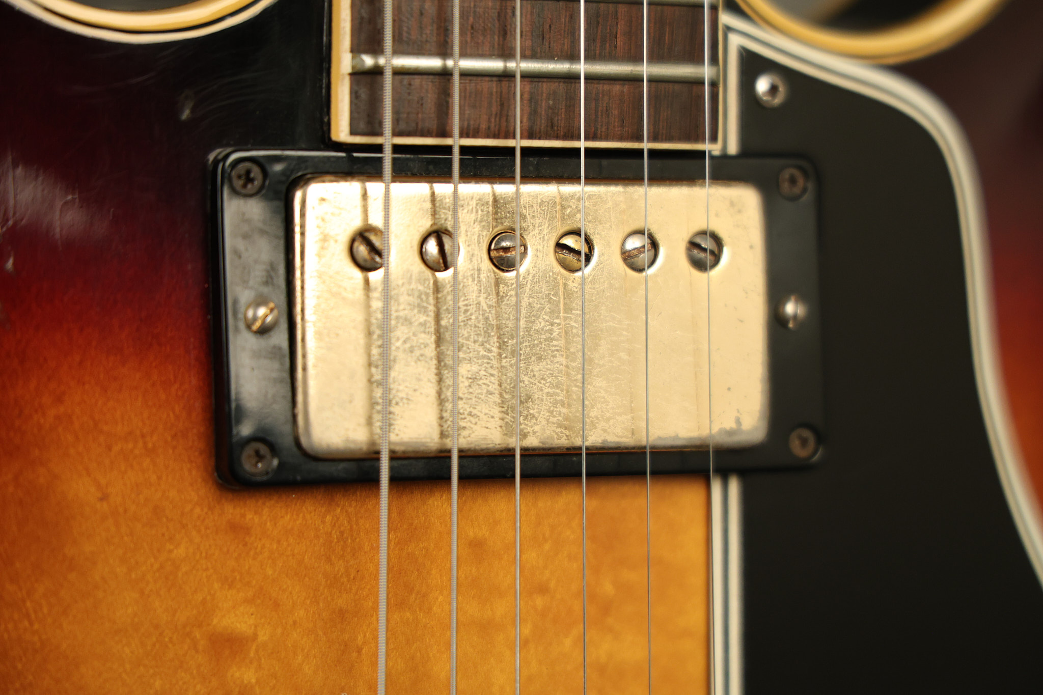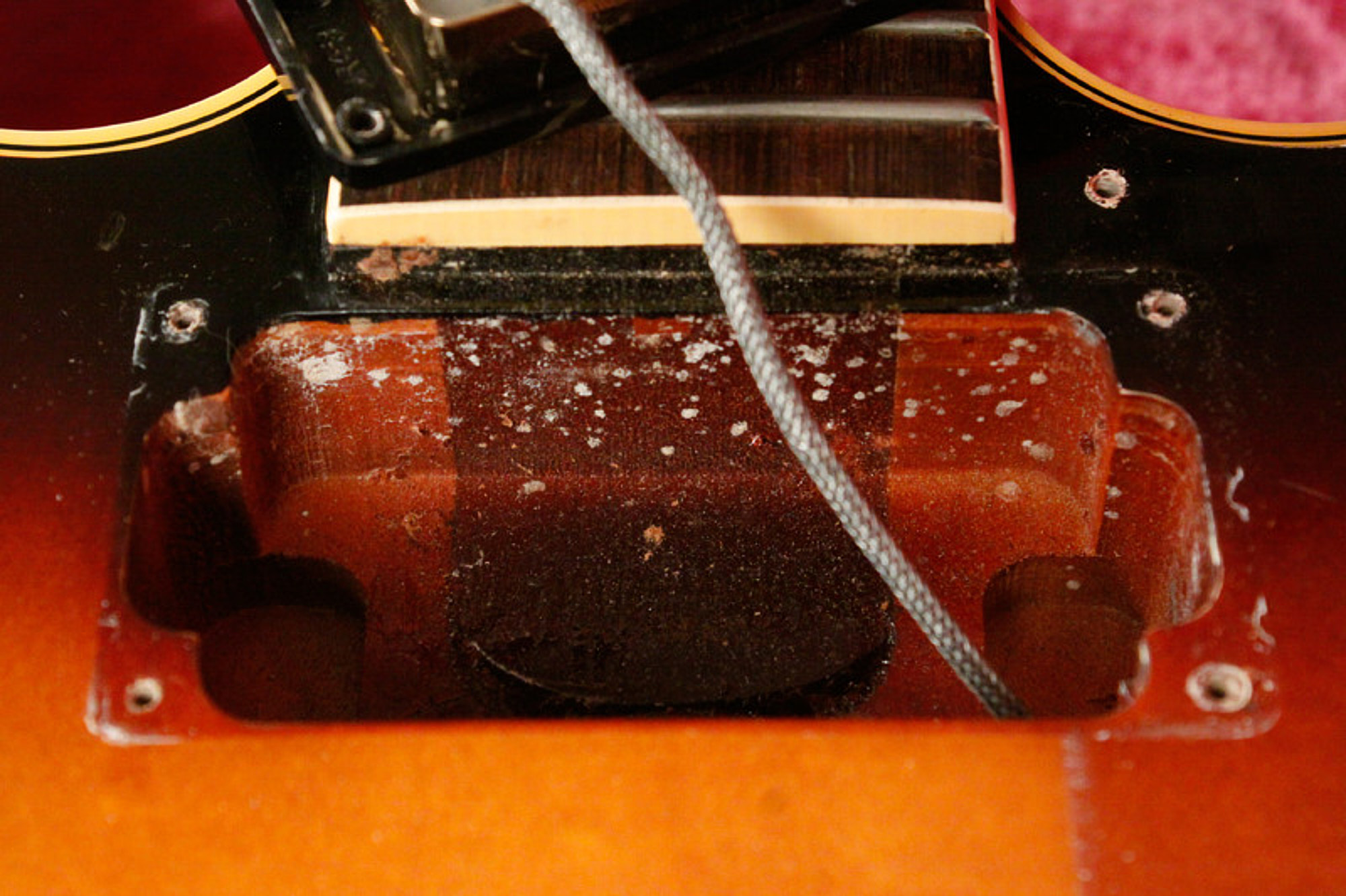 1960 Gibson ES-345 in its original Sunburst finish which has really maintained its brilliance. It has a great playing neck with good frets. It's all original except for 4 replaced tuning buttons, and 100% complete along with its original hardshell case. There are 4 small screw holes on the bottom edge where a Bigsby had been installed at one time. This 345 looks great with some nicks + dings and other cosmetic wear. The guitar itself remains structurally sound with no cracks, breaks or repairs. All electronics work and sound great with its original set of "Zebra" (black/white) PAF pickups. The cover have been removed at one point in time before being soldered back in place.