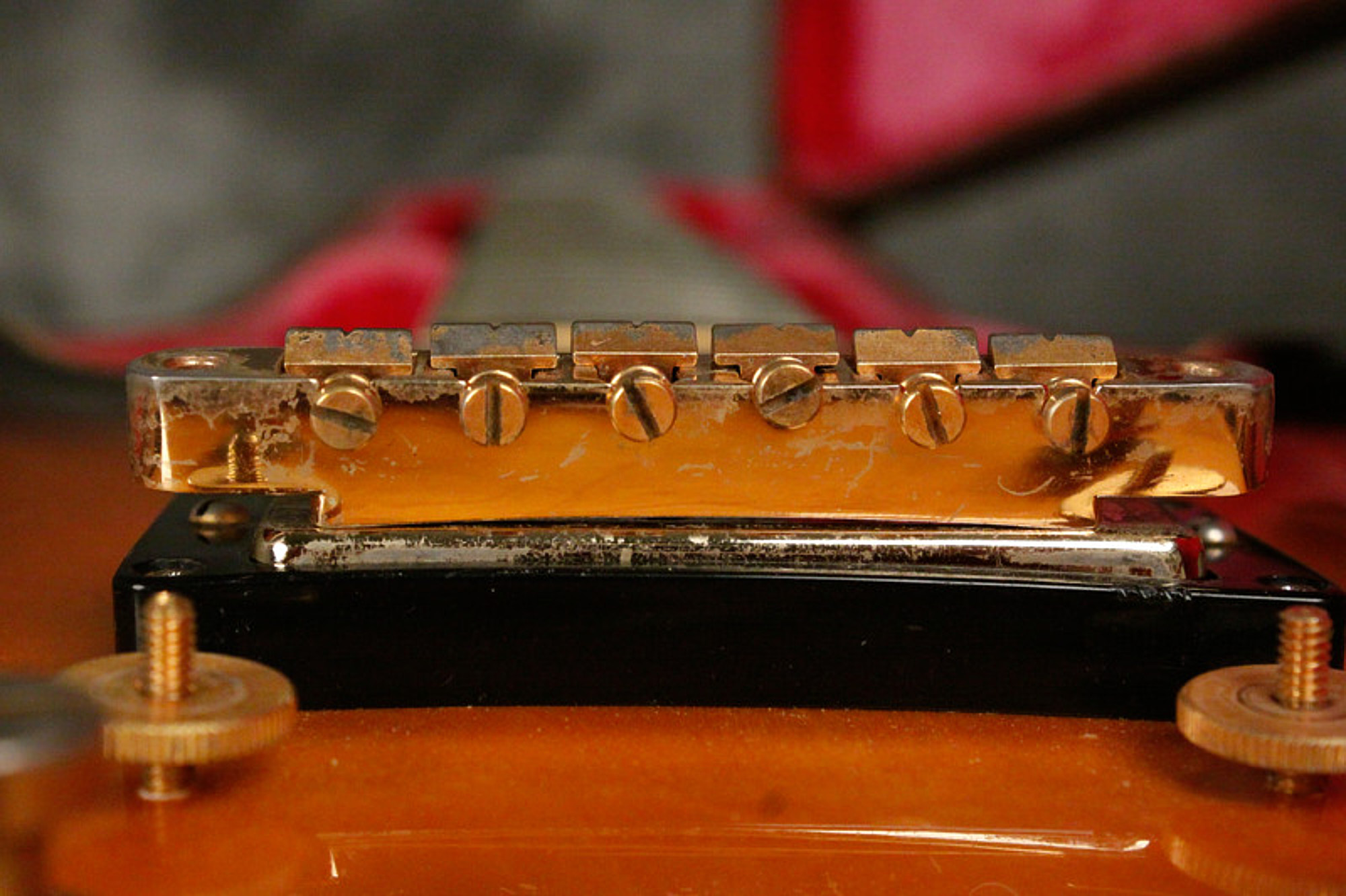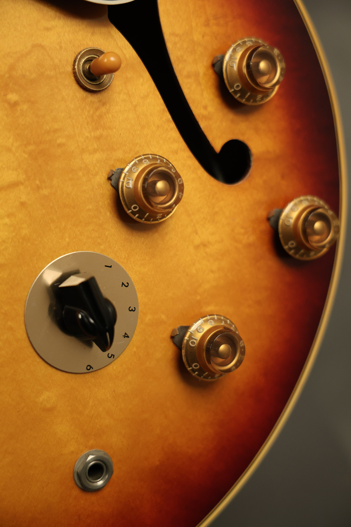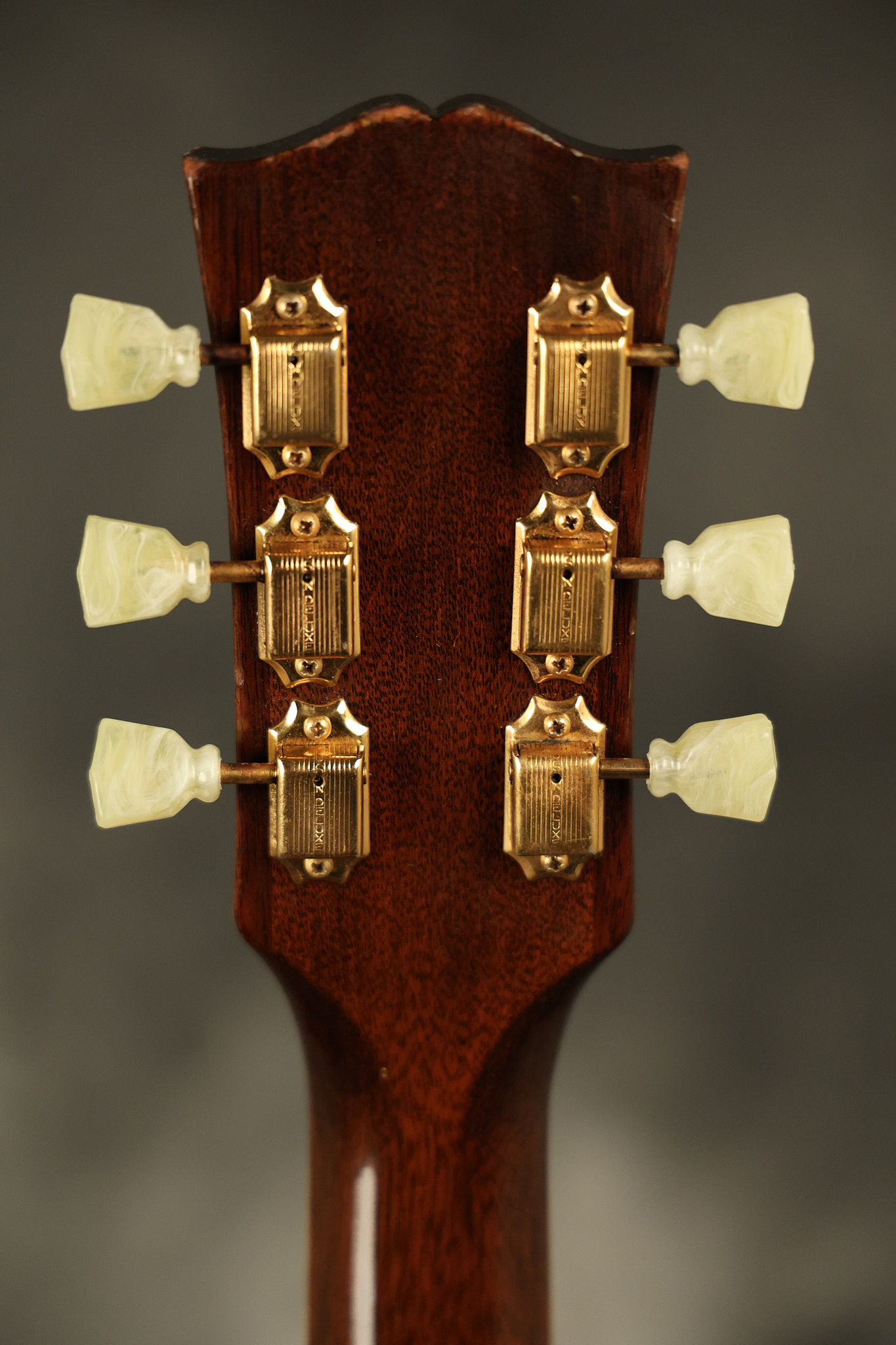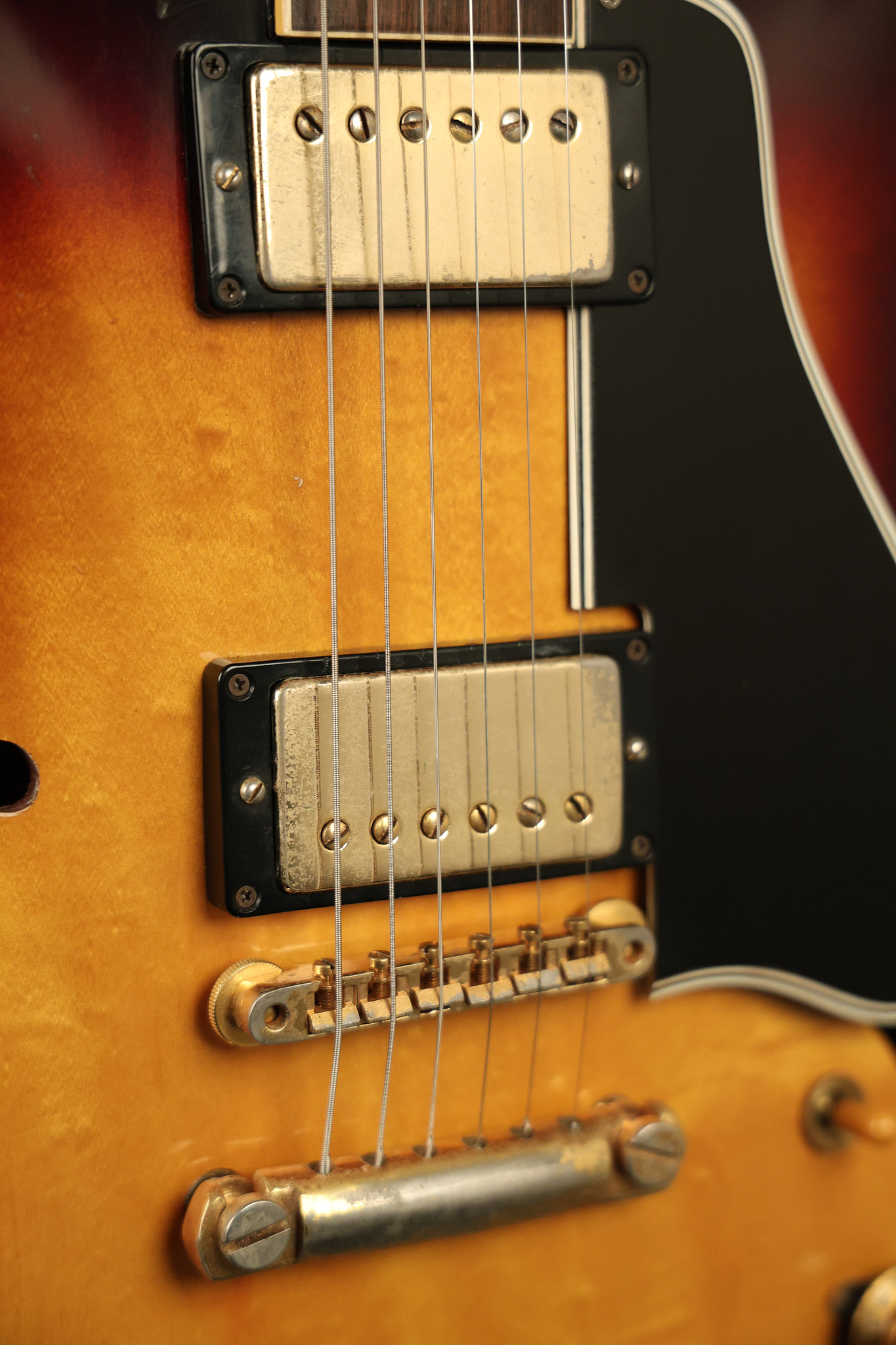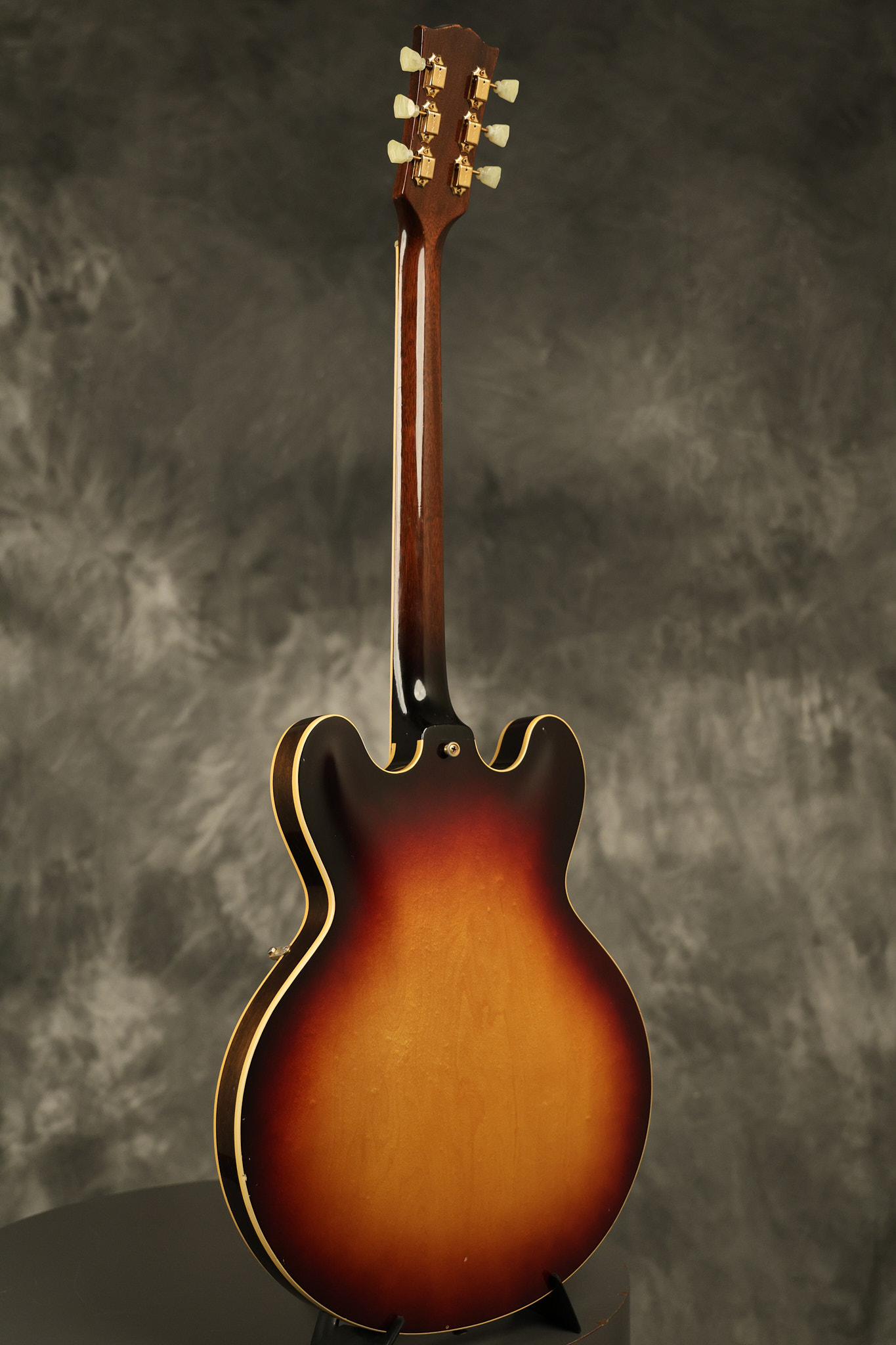 1960 Gibson ES-345 in its original Sunburst finish which has really maintained its brilliance. It has a great playing neck with good frets. It's all original except for 4 replaced tuning buttons, and 100% complete along with its original hardshell case. There are 4 small screw holes on the bottom edge where a Bigsby had been installed at one time. This 345 looks great with some nicks + dings and other cosmetic wear. The guitar itself remains structurally sound with no cracks, breaks or repairs. All electronics work and sound great with its original set of "Zebra" (black/white) PAF pickups. The cover have been removed at one point in time before being soldered back in place.