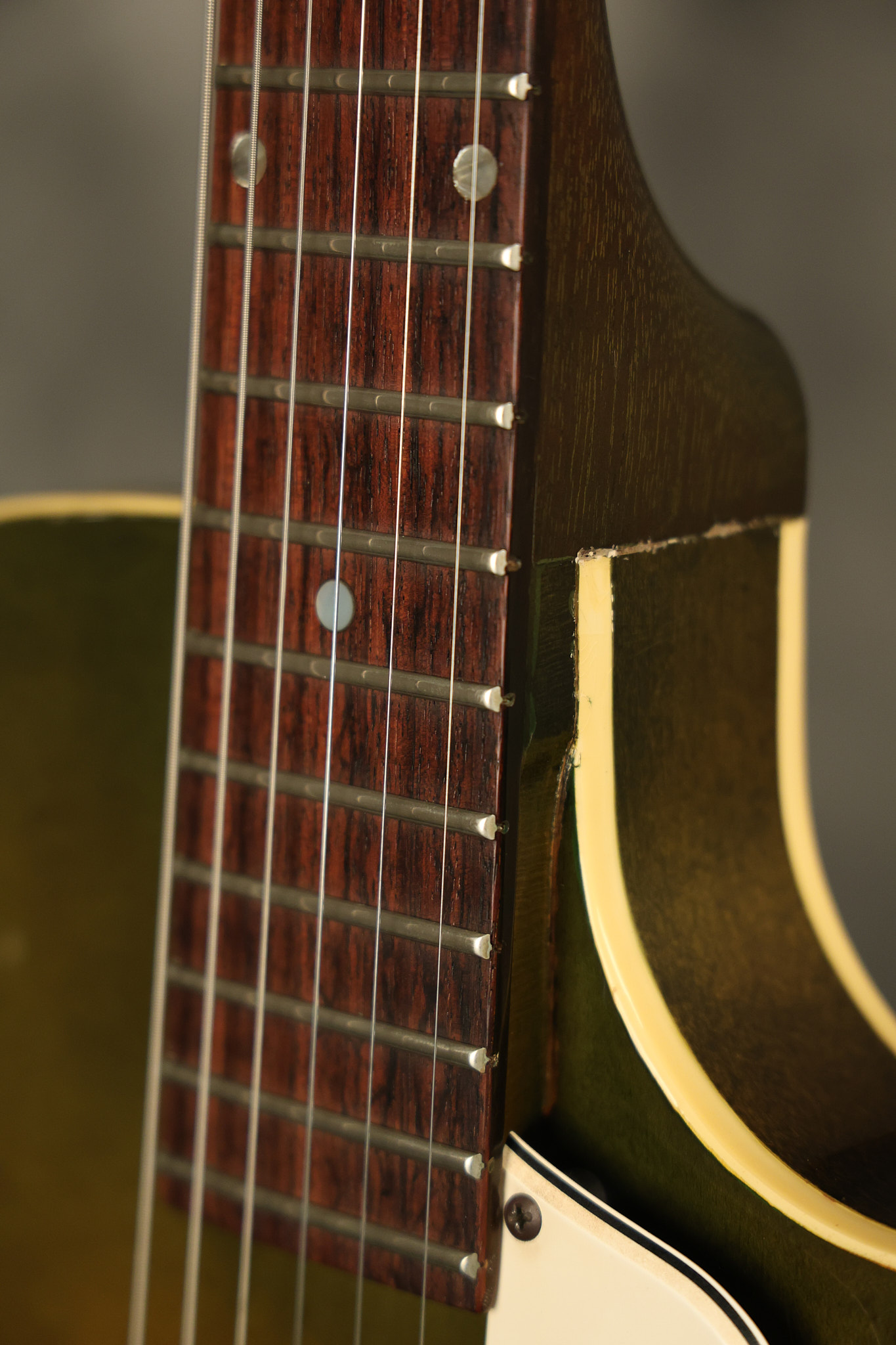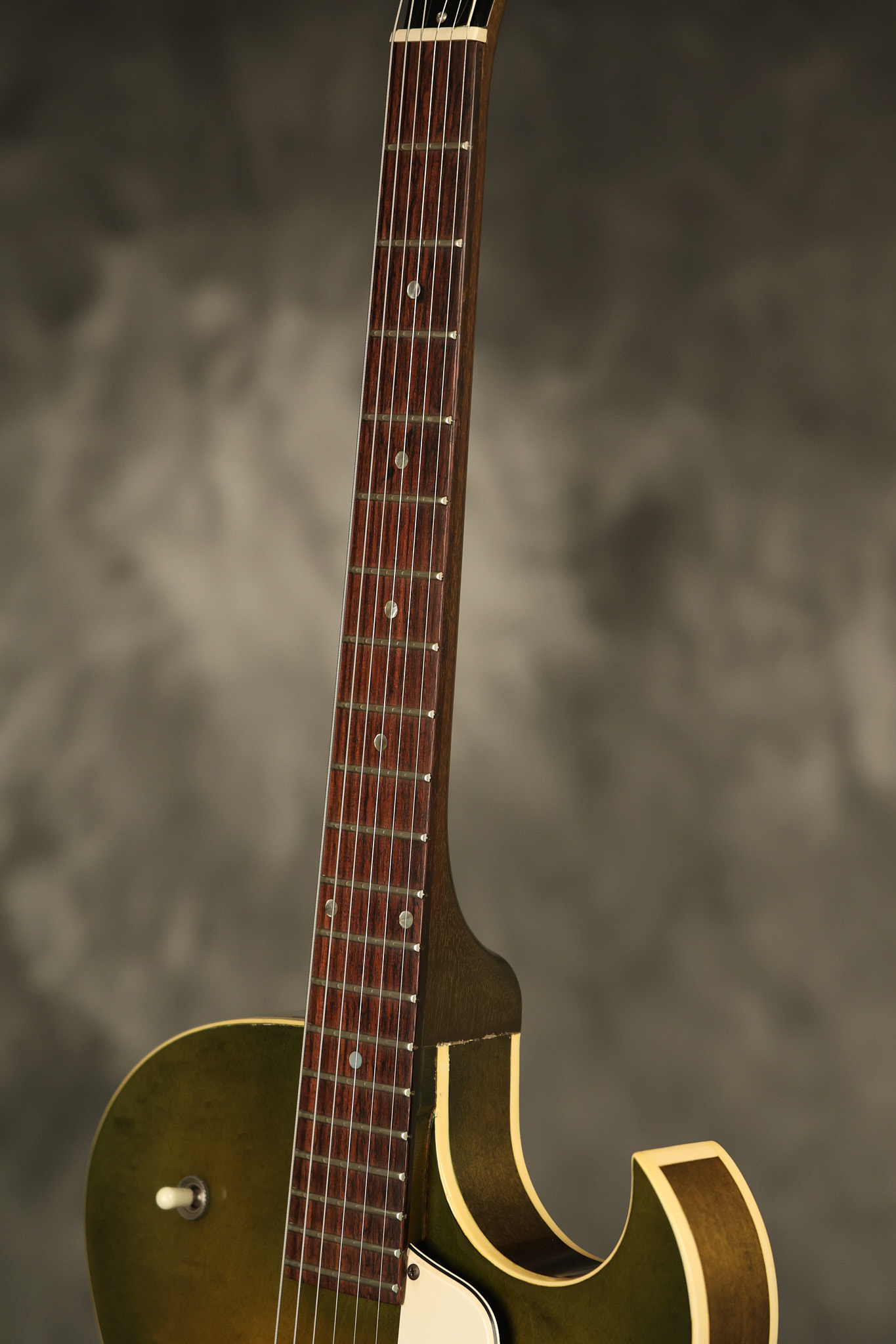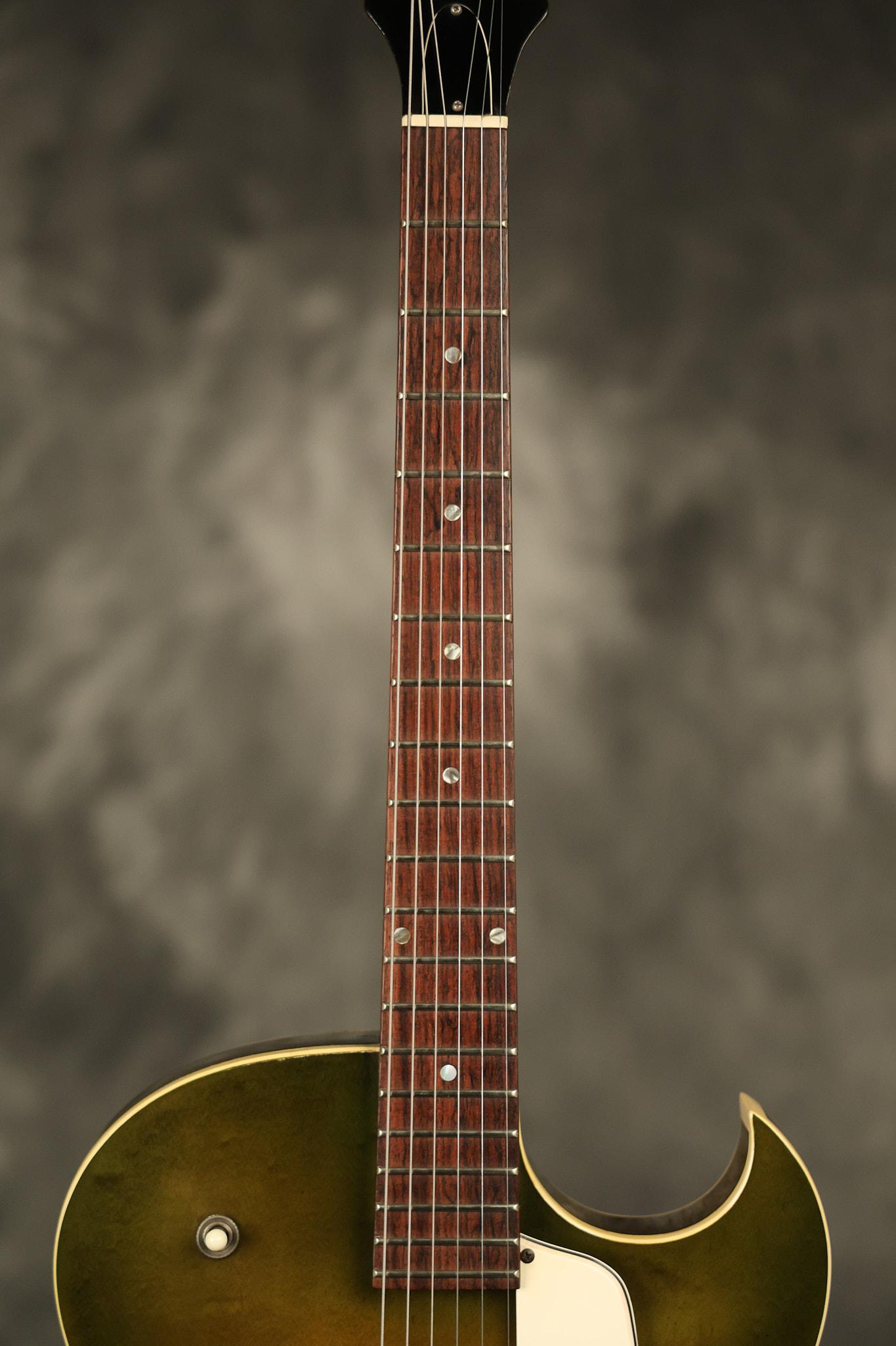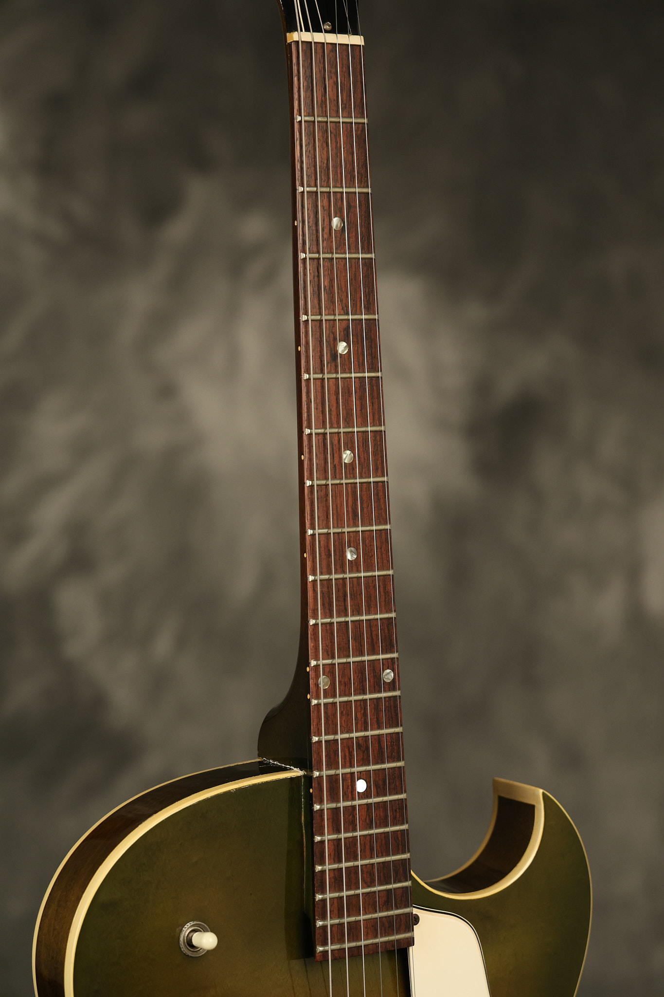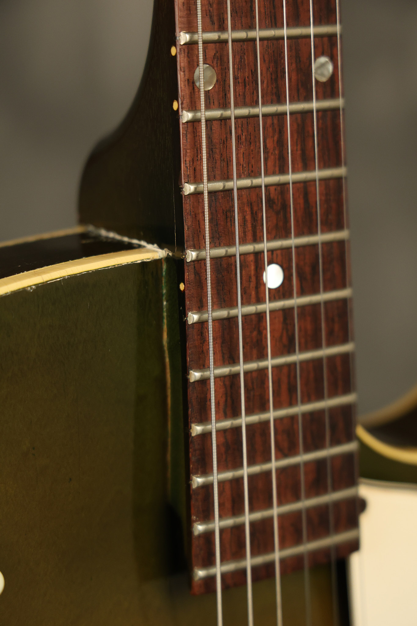 1961 Epiphone Sorrento E452TD in its original Royal Olive finish. It has a great playing neck with great frets. It's all original with the exception of the bridge and the adjustment wheels. It is a later Gibson Patent # bridge that has been slightly filed down on the bottom. The pictured hardshell case is included. The neck has been professionally reset. It looks great with some nicks + dings and other cosmetic wear. There are two one inch hairline cracks running out from the jack, but it remains a cosmetic issue only as the guitar itself remains structurally sound. All electronics work and sound great with its original set of mini-humbuckers (one PAF and one Patent # sticker).