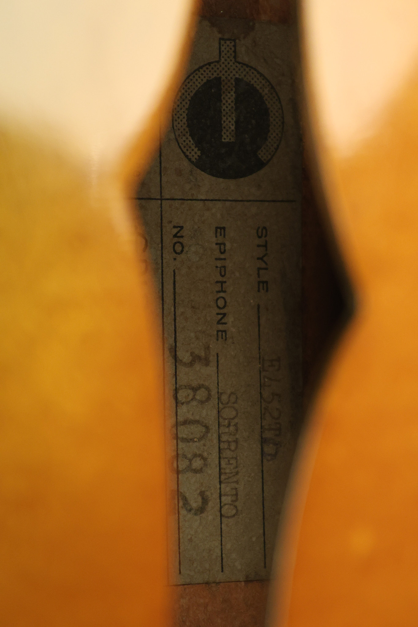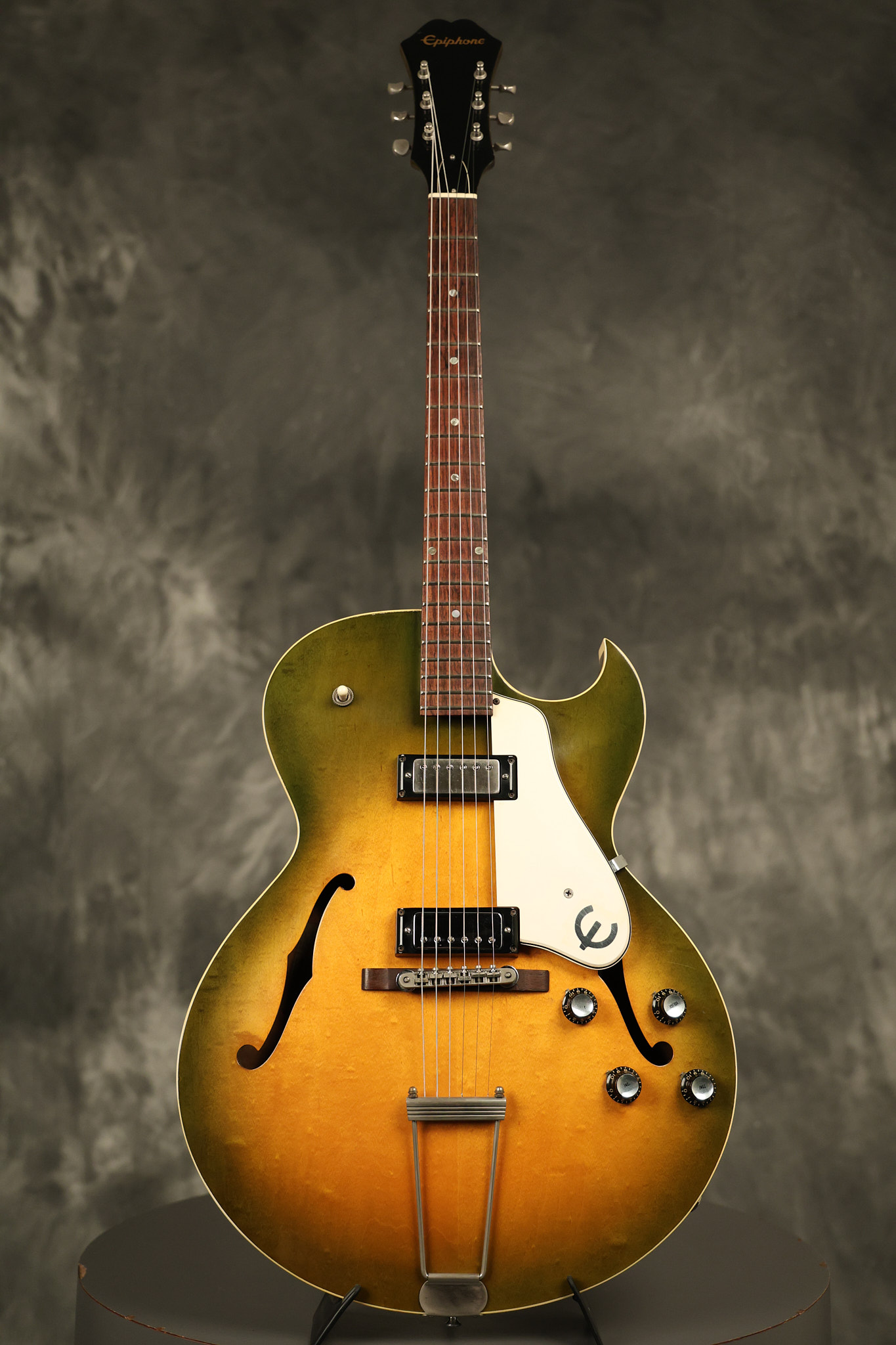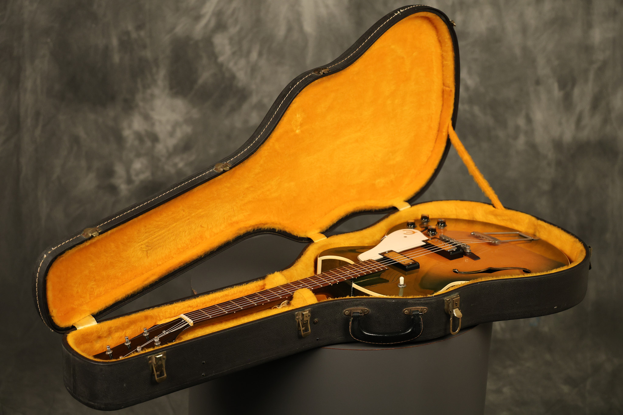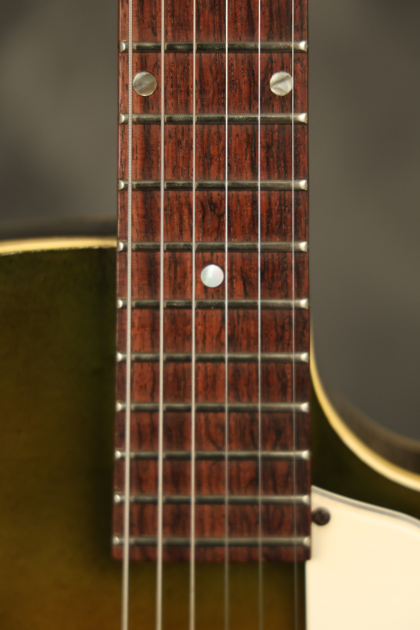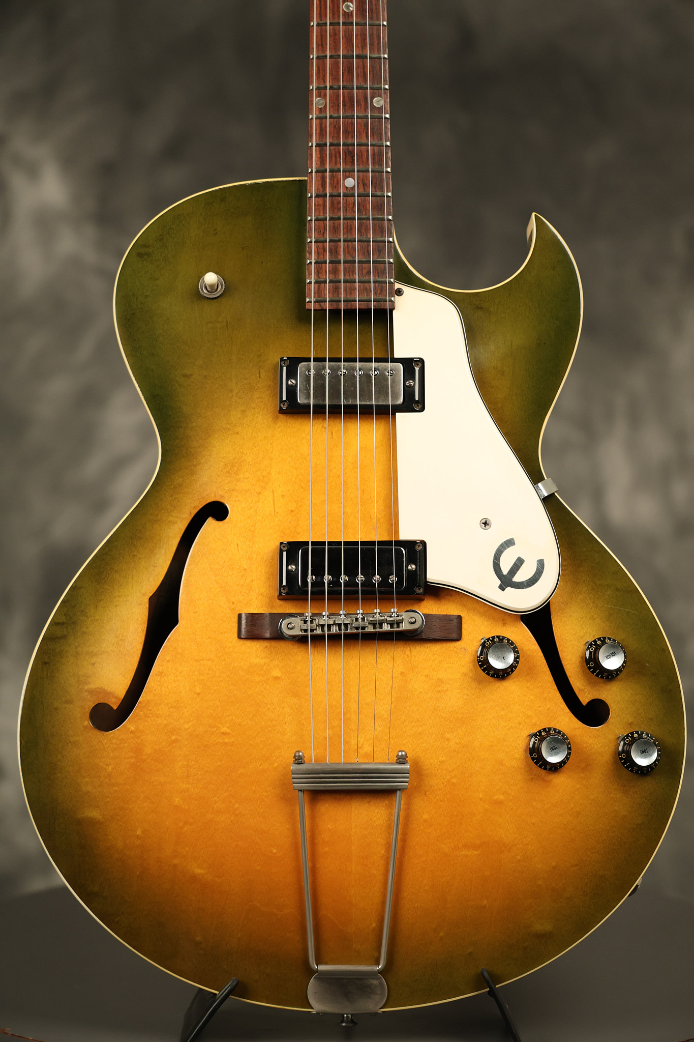 1961 Epiphone Sorrento E452TD in its original Royal Olive finish. It has a great playing neck with great frets. It's all original with the exception of the bridge and the adjustment wheels. It is a later Gibson Patent # bridge that has been slightly filed down on the bottom. The pictured hardshell case is included. The neck has been professionally reset. It looks great with some nicks + dings and other cosmetic wear. There are two one inch hairline cracks running out from the jack, but it remains a cosmetic issue only as the guitar itself remains structurally sound. All electronics work and sound great with its original set of mini-humbuckers (one PAF and one Patent # sticker).