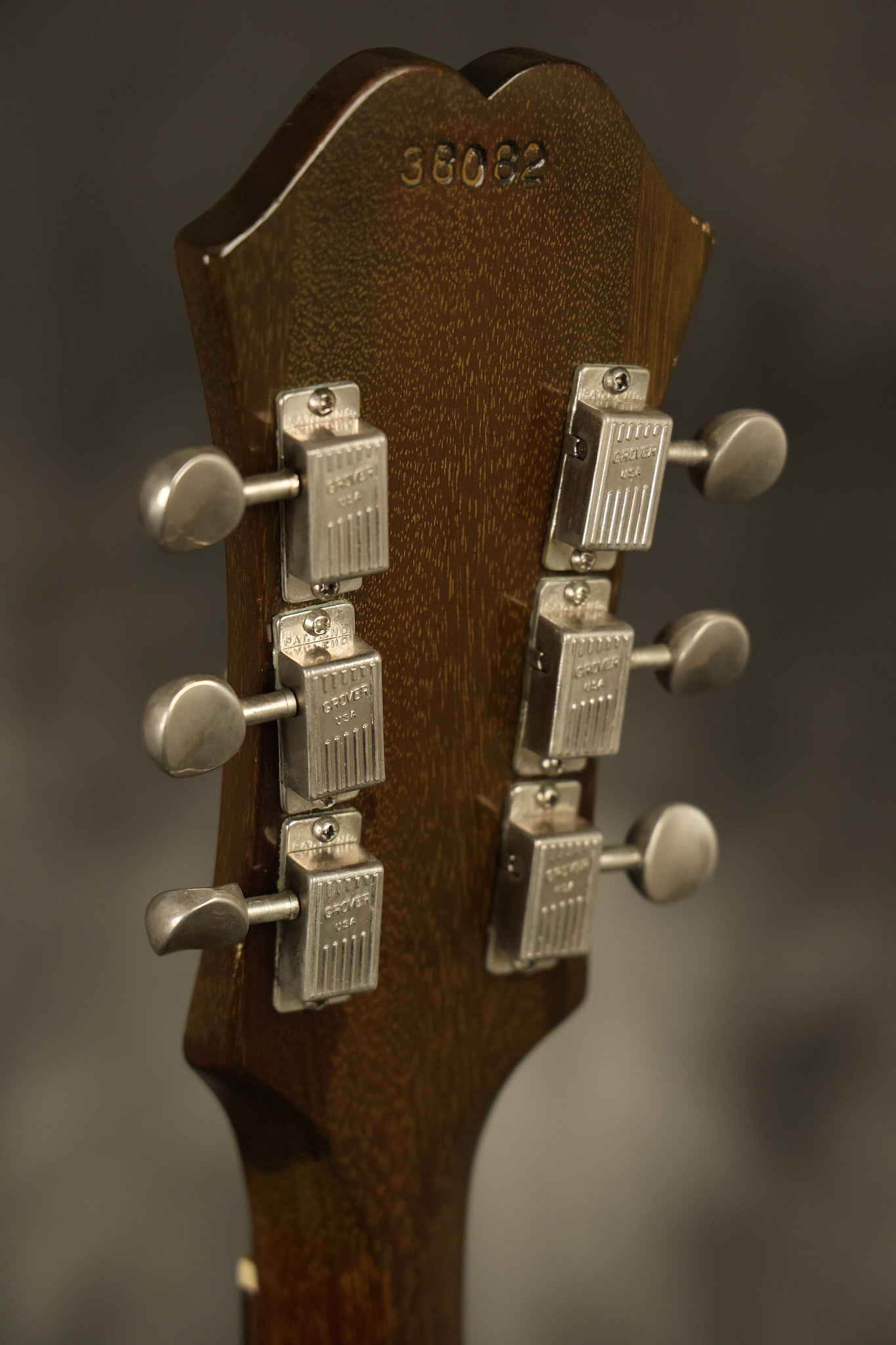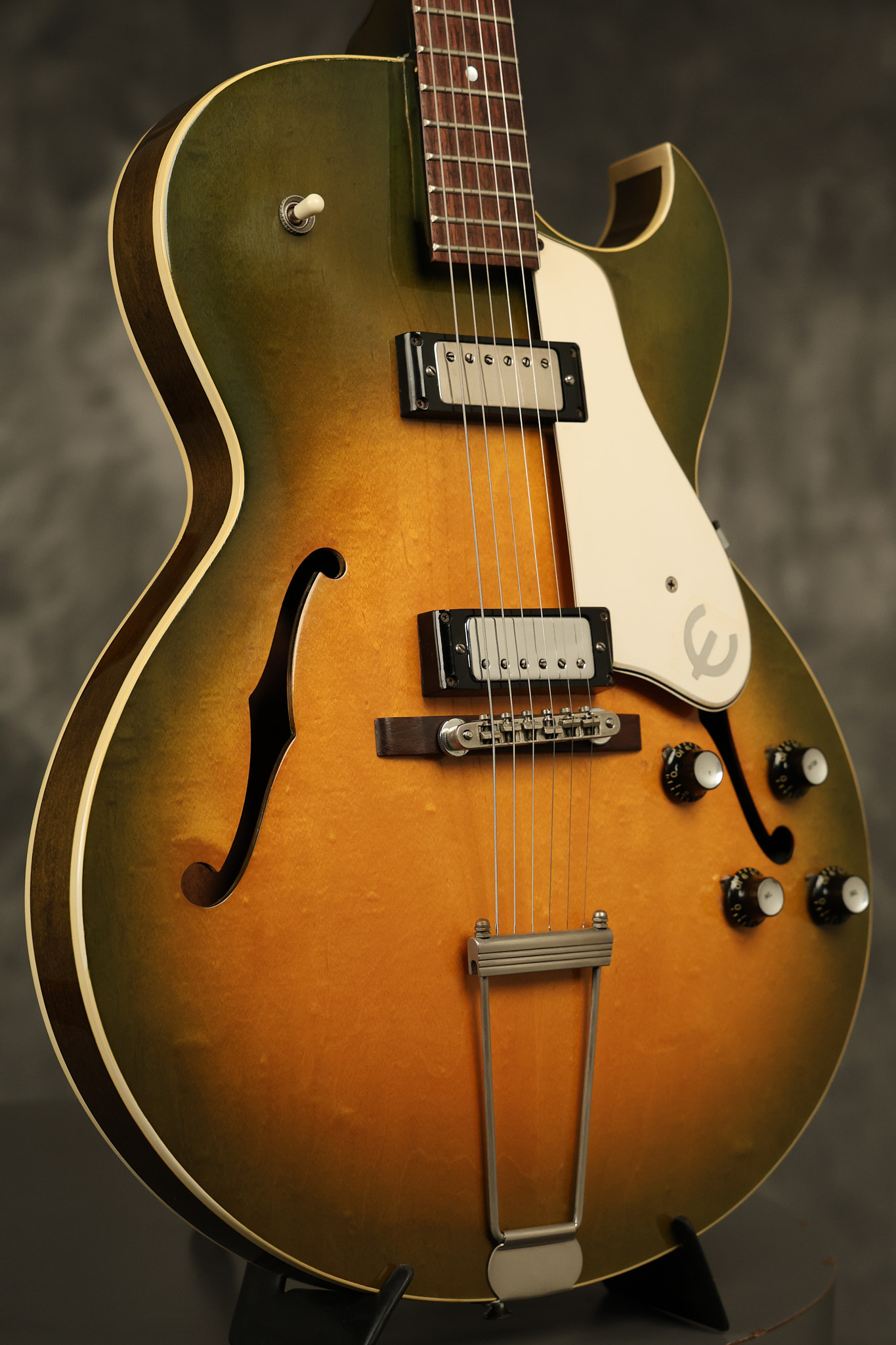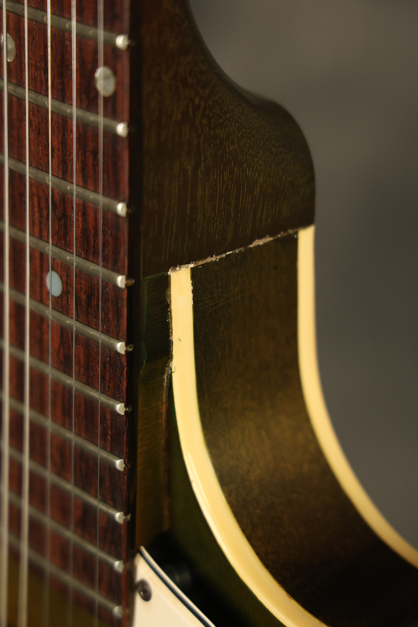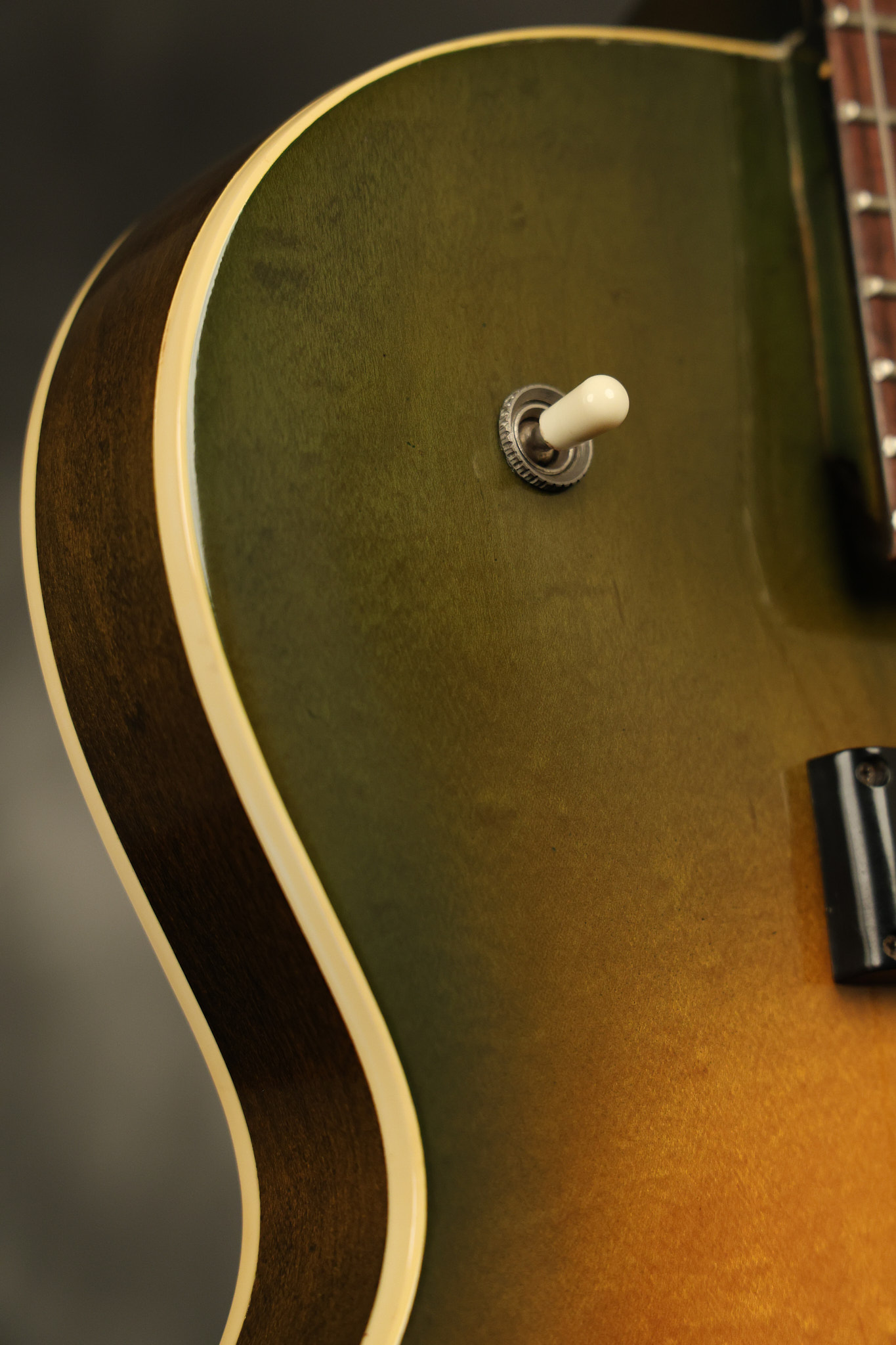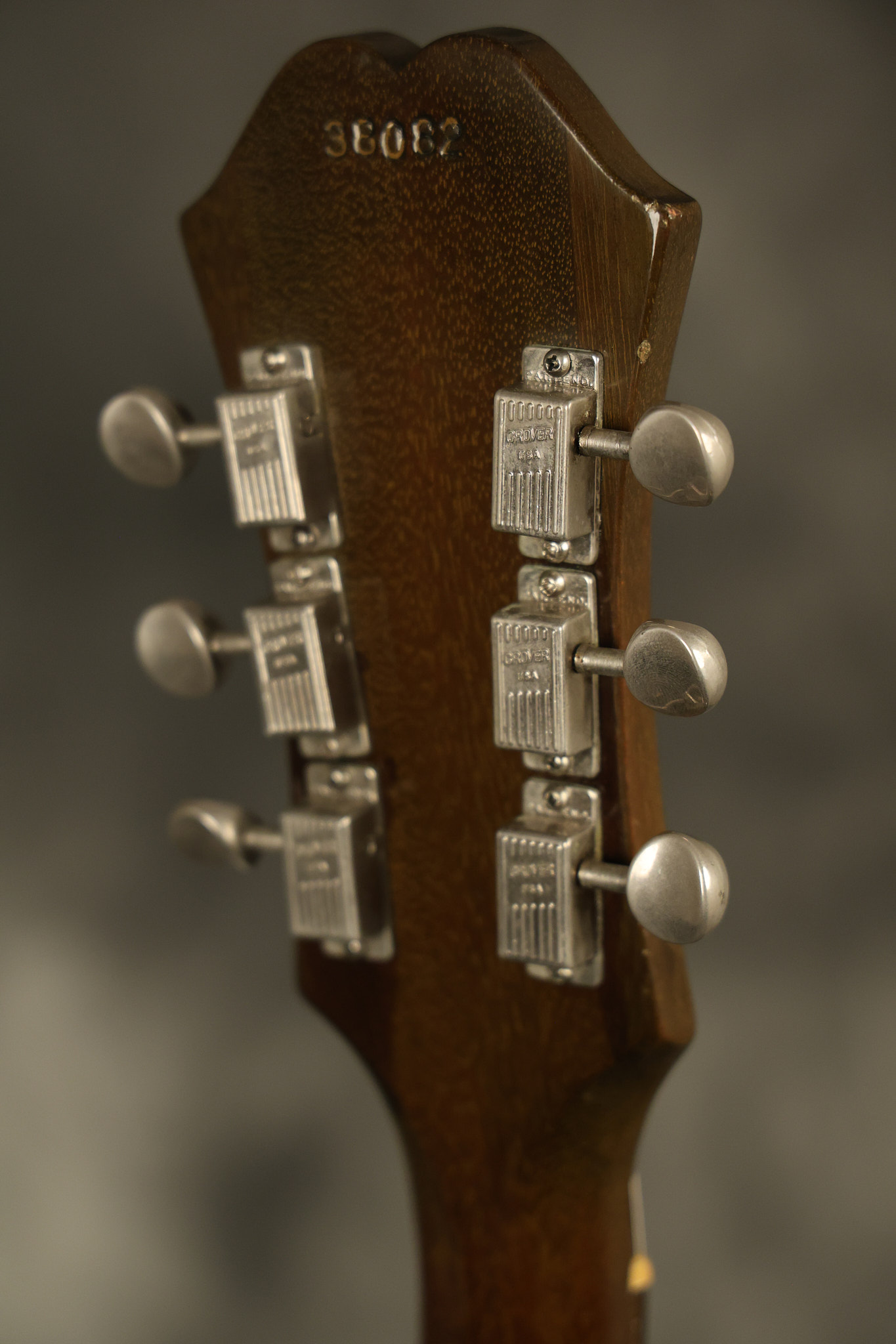 1961 Epiphone Sorrento E452TD in its original Royal Olive finish. It has a great playing neck with great frets. It's all original with the exception of the bridge and the adjustment wheels. It is a later Gibson Patent # bridge that has been slightly filed down on the bottom. The pictured hardshell case is included. The neck has been professionally reset. It looks great with some nicks + dings and other cosmetic wear. There are two one inch hairline cracks running out from the jack, but it remains a cosmetic issue only as the guitar itself remains structurally sound. All electronics work and sound great with its original set of mini-humbuckers (one PAF and one Patent # sticker).