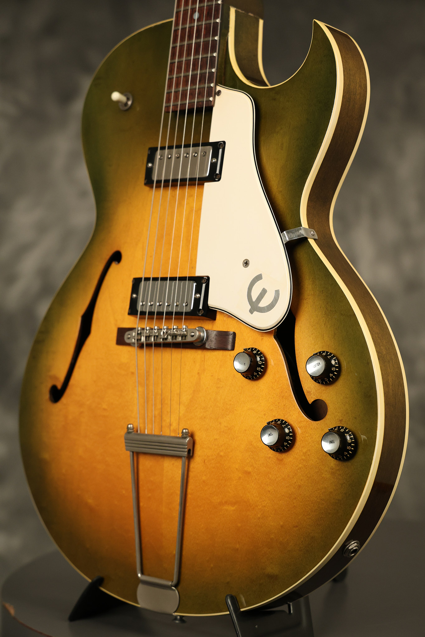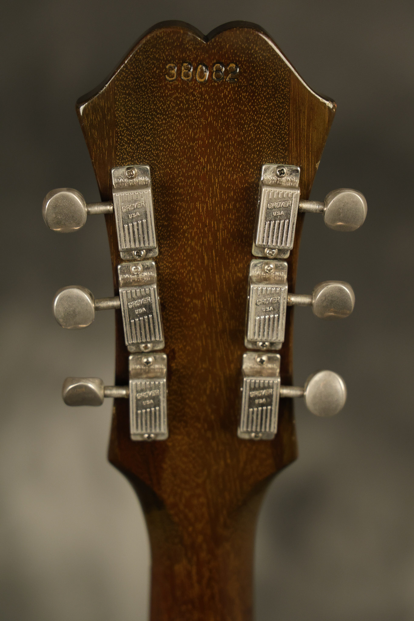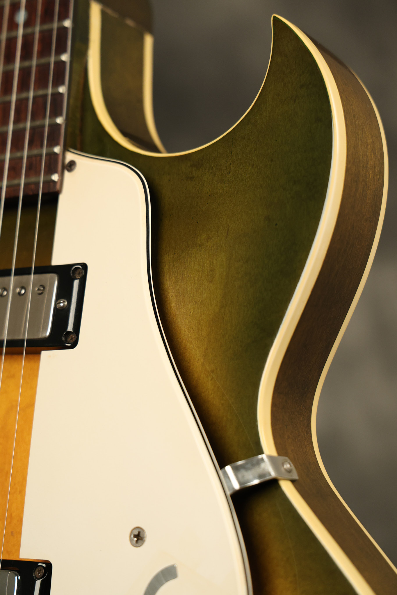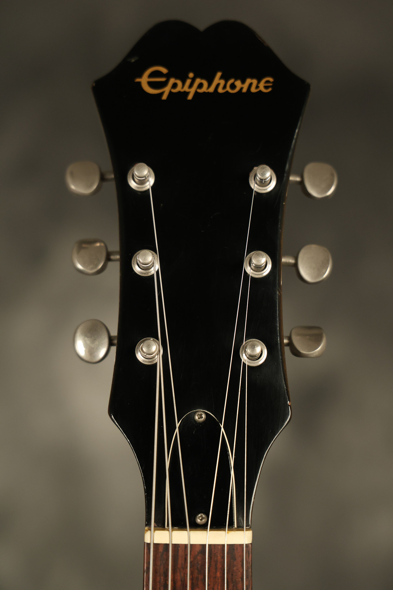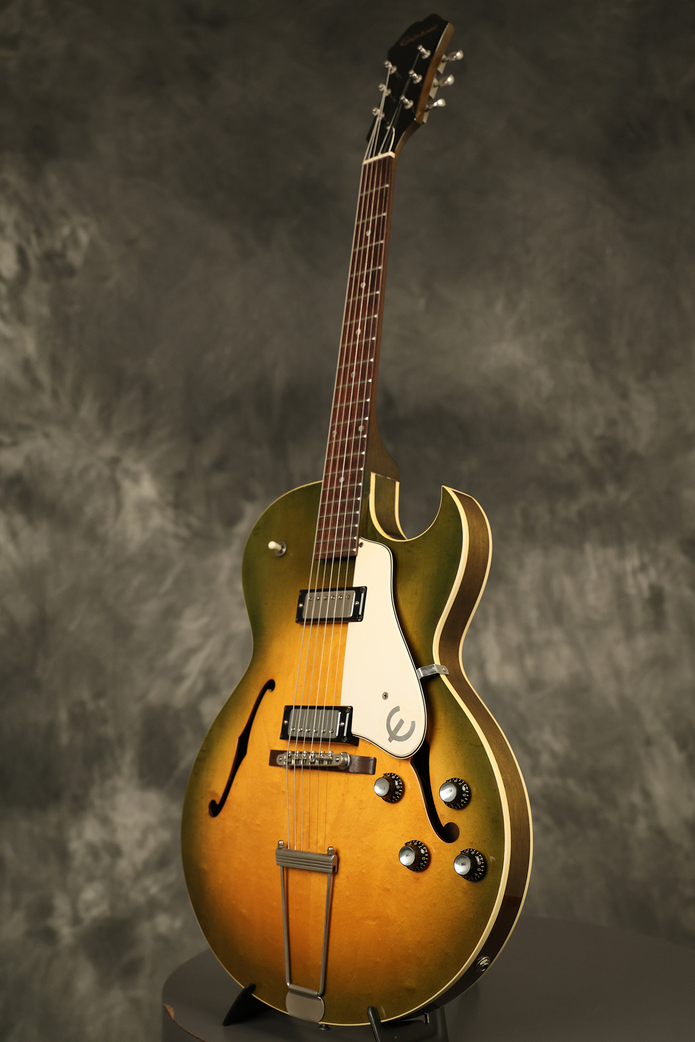 1961 Epiphone Sorrento E452TD in its original Royal Olive finish. It has a great playing neck with great frets. It's all original with the exception of the bridge and the adjustment wheels. It is a later Gibson Patent # bridge that has been slightly filed down on the bottom. The pictured hardshell case is included. The neck has been professionally reset. It looks great with some nicks + dings and other cosmetic wear. There are two one inch hairline cracks running out from the jack, but it remains a cosmetic issue only as the guitar itself remains structurally sound. All electronics work and sound great with its original set of mini-humbuckers (one PAF and one Patent # sticker).