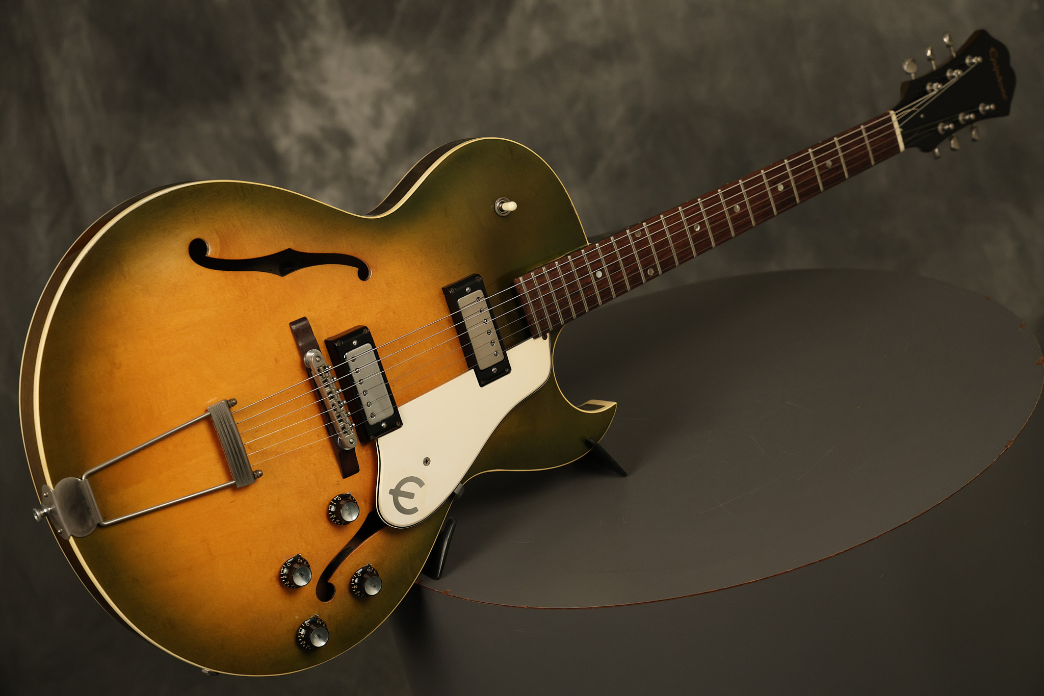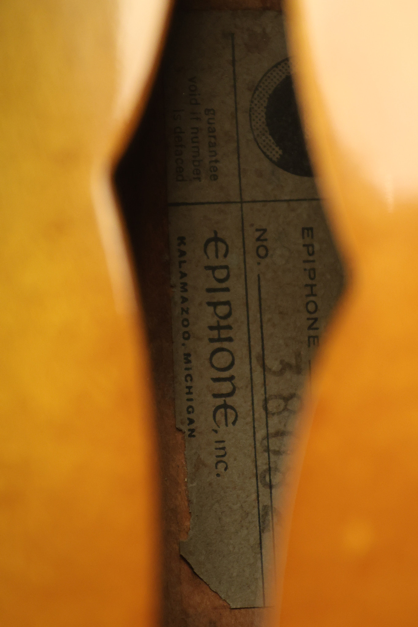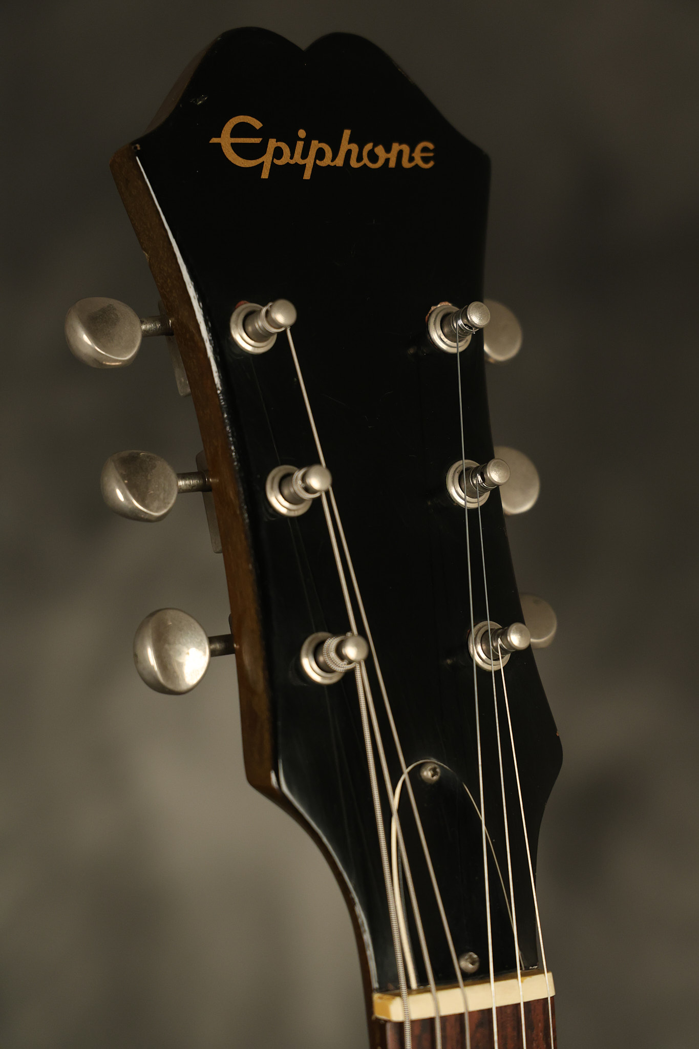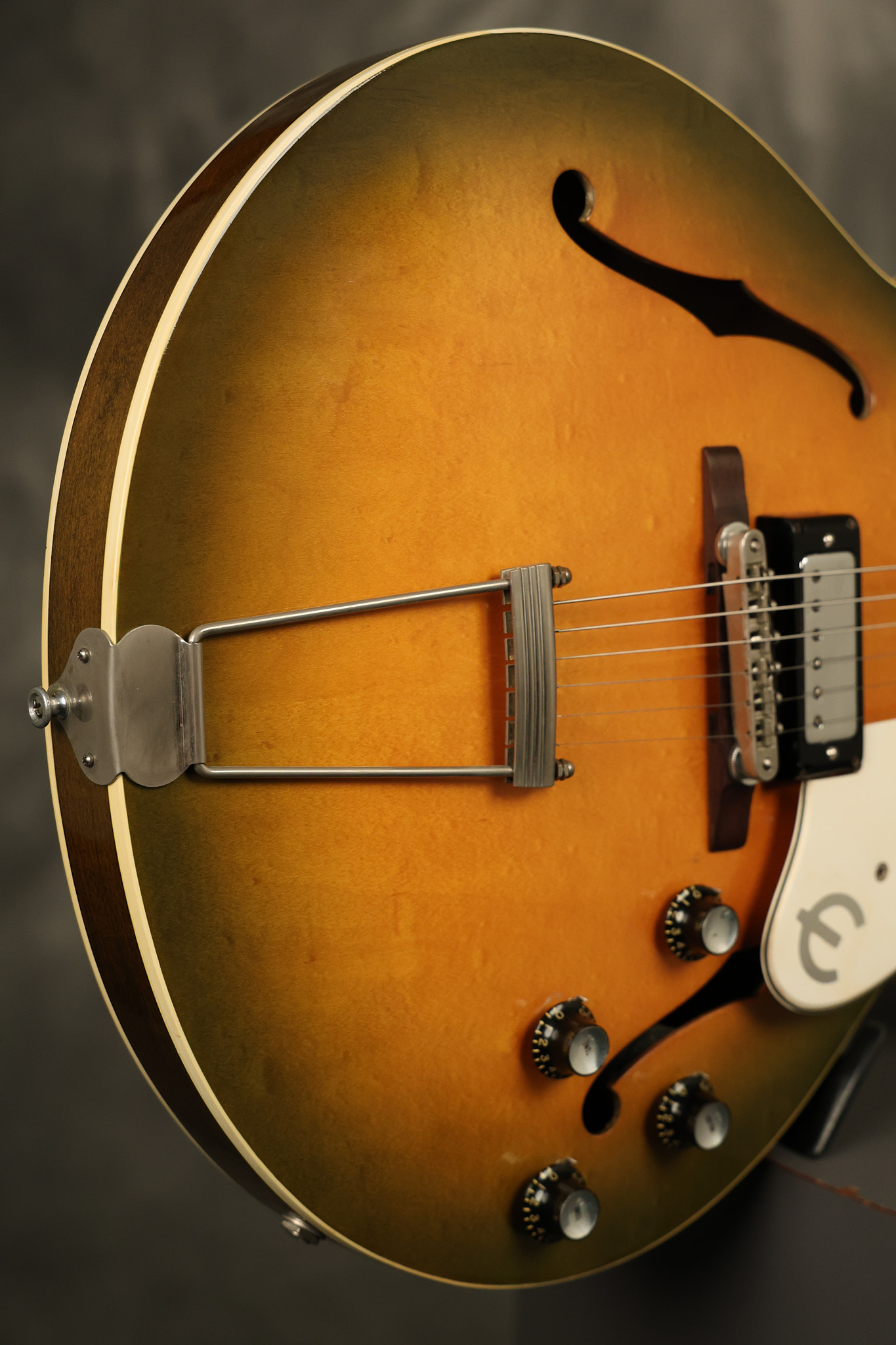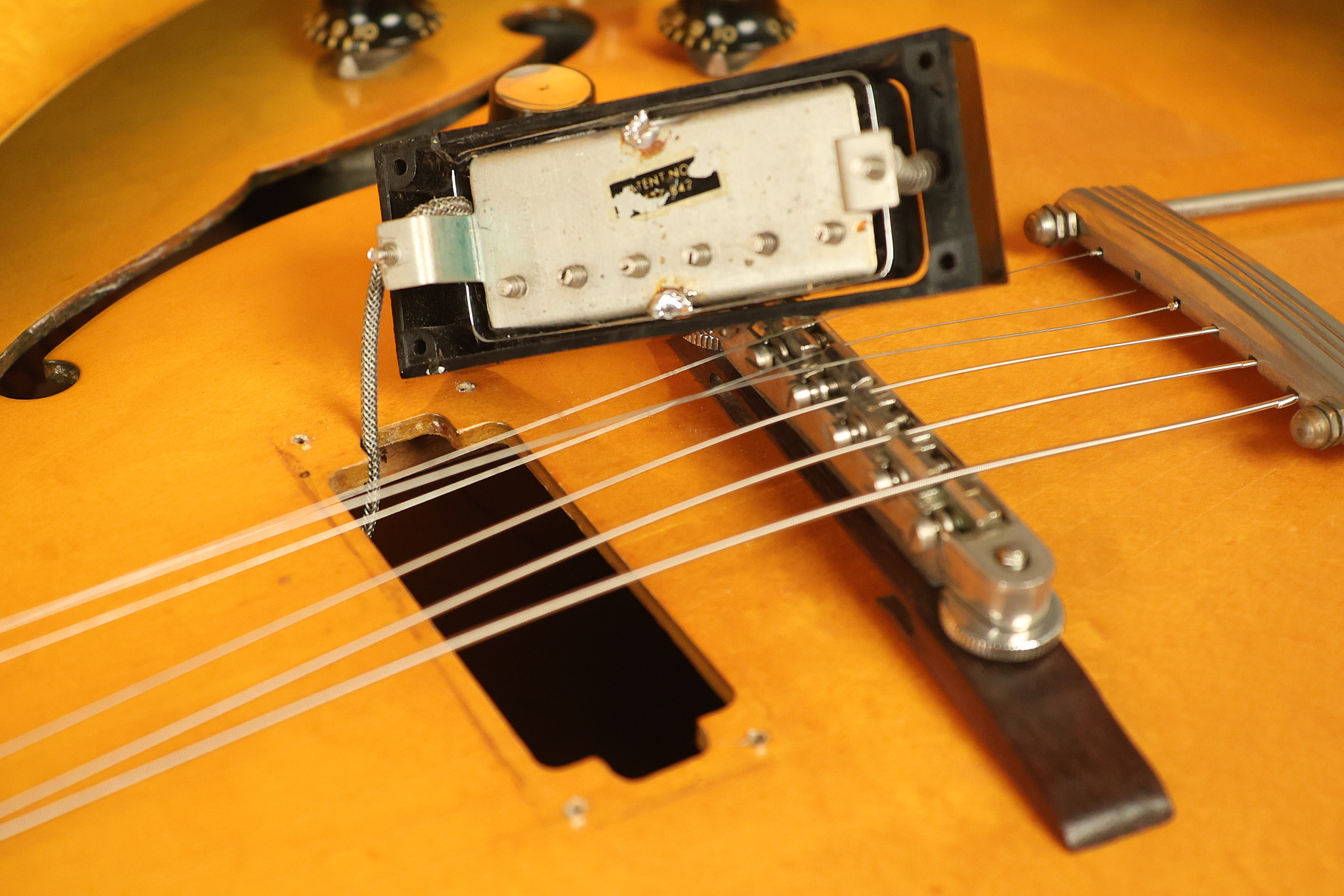1961 Epiphone Sorrento E452TD in its original Royal Olive finish. It has a great playing neck with great frets. It's all original with the exception of the bridge and the adjustment wheels. It is a later Gibson Patent # bridge that has been slightly filed down on the bottom. The pictured hardshell case is included. The neck has been professionally reset. It looks great with some nicks + dings and other cosmetic wear. There are two one inch hairline cracks running out from the jack, but it remains a cosmetic issue only as the guitar itself remains structurally sound. All electronics work and sound great with its original set of mini-humbuckers (one PAF and one Patent # sticker).