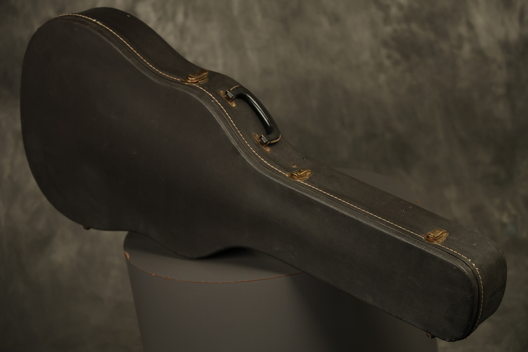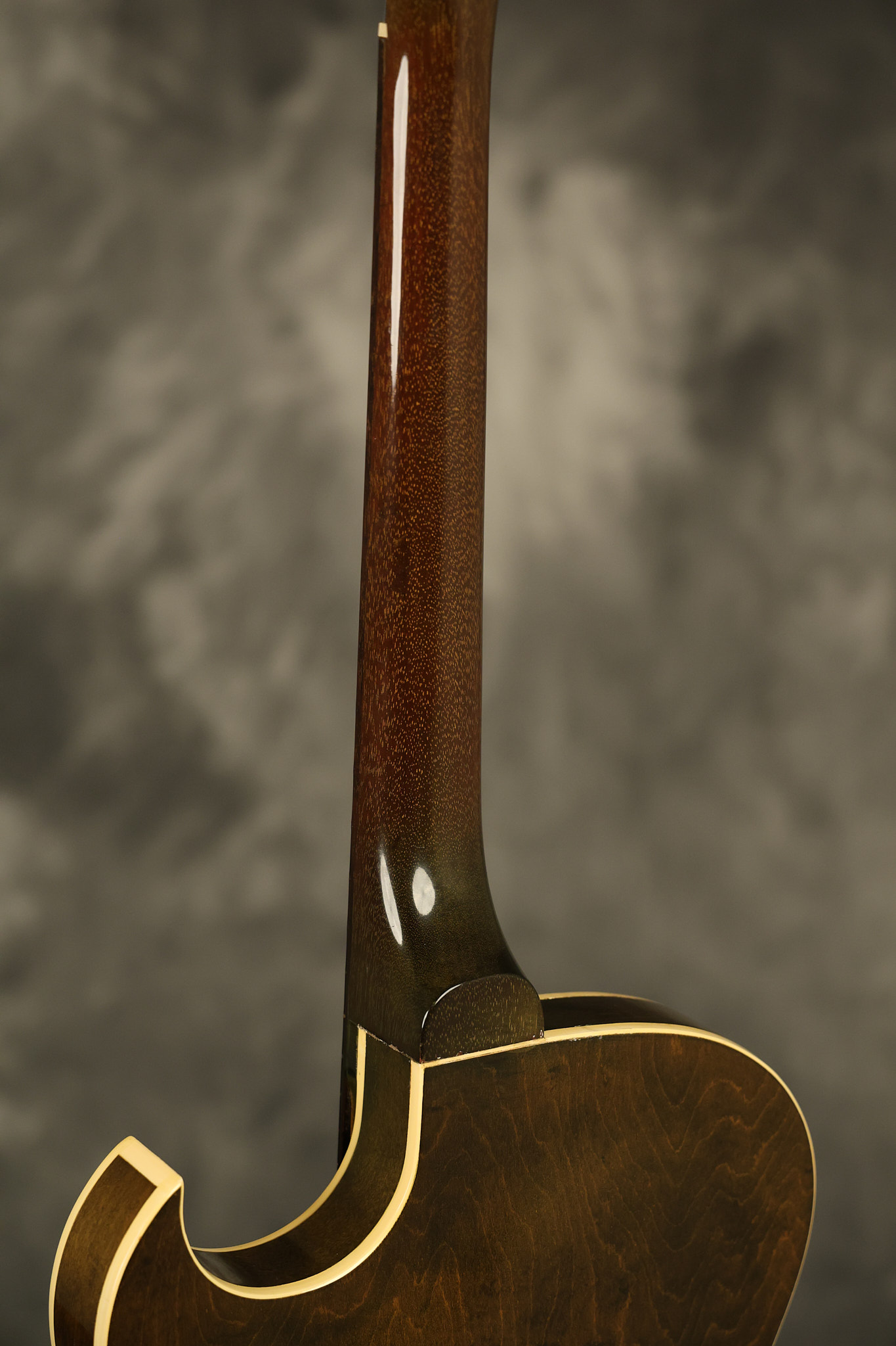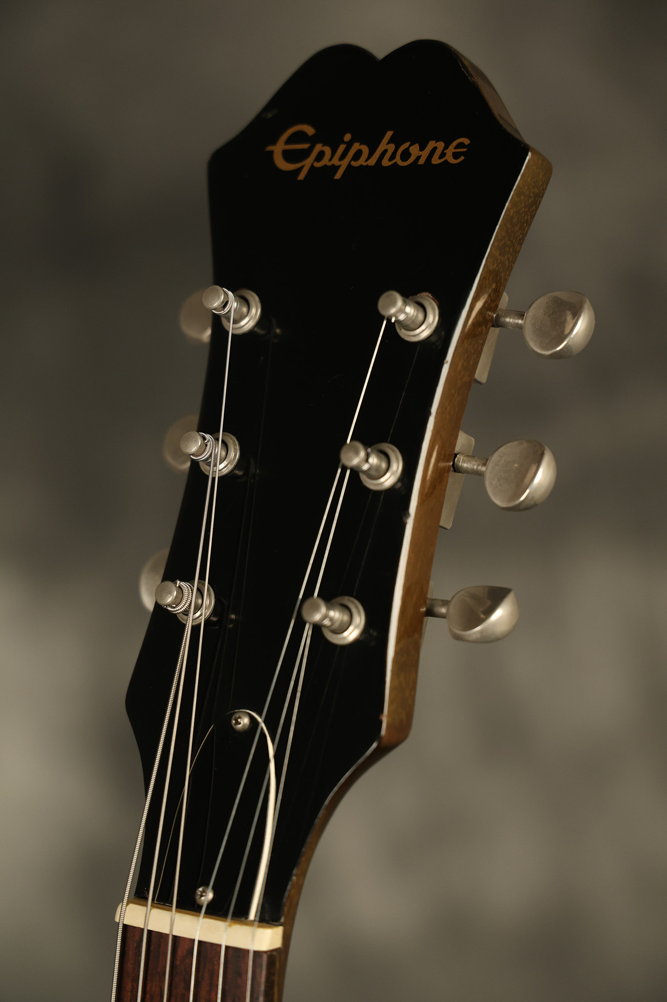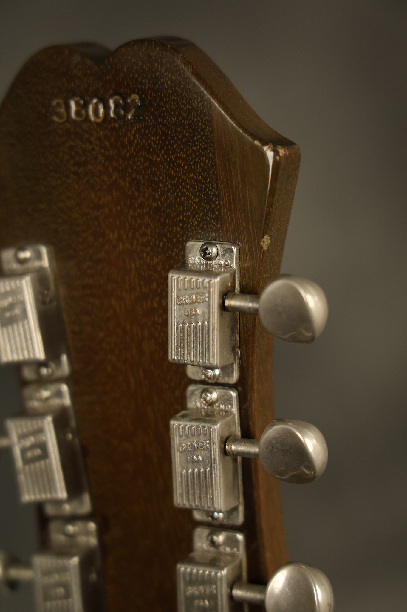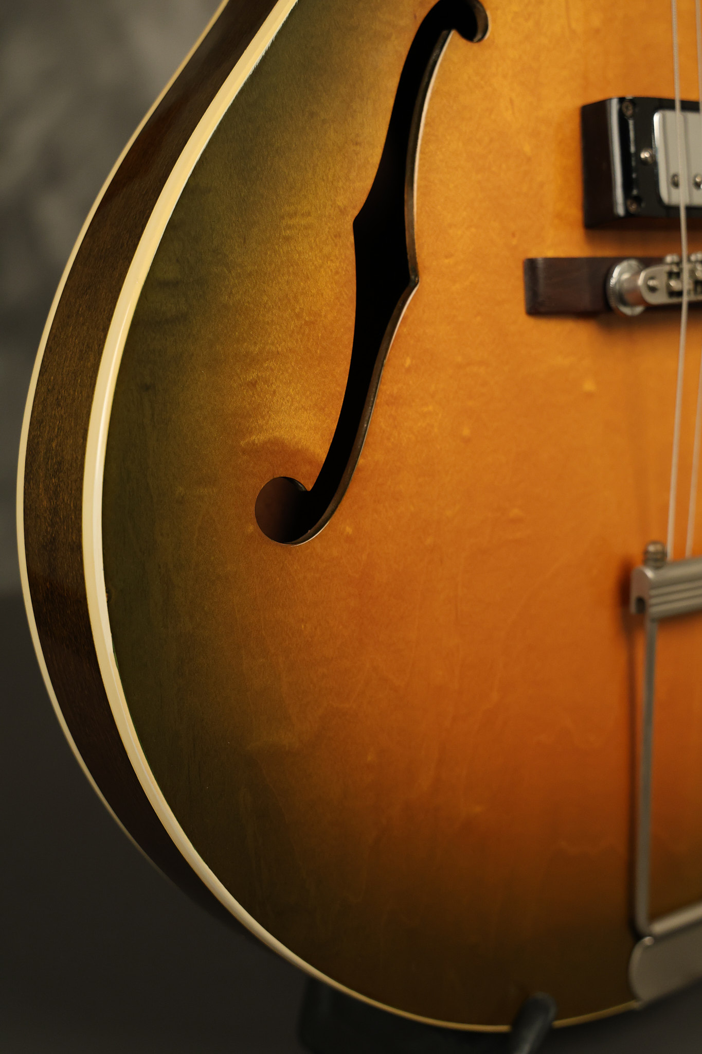 1961 Epiphone Sorrento E452TD in its original Royal Olive finish. It has a great playing neck with great frets. It's all original with the exception of the bridge and the adjustment wheels. It is a later Gibson Patent # bridge that has been slightly filed down on the bottom. The pictured hardshell case is included. The neck has been professionally reset. It looks great with some nicks + dings and other cosmetic wear. There are two one inch hairline cracks running out from the jack, but it remains a cosmetic issue only as the guitar itself remains structurally sound. All electronics work and sound great with its original set of mini-humbuckers (one PAF and one Patent # sticker).