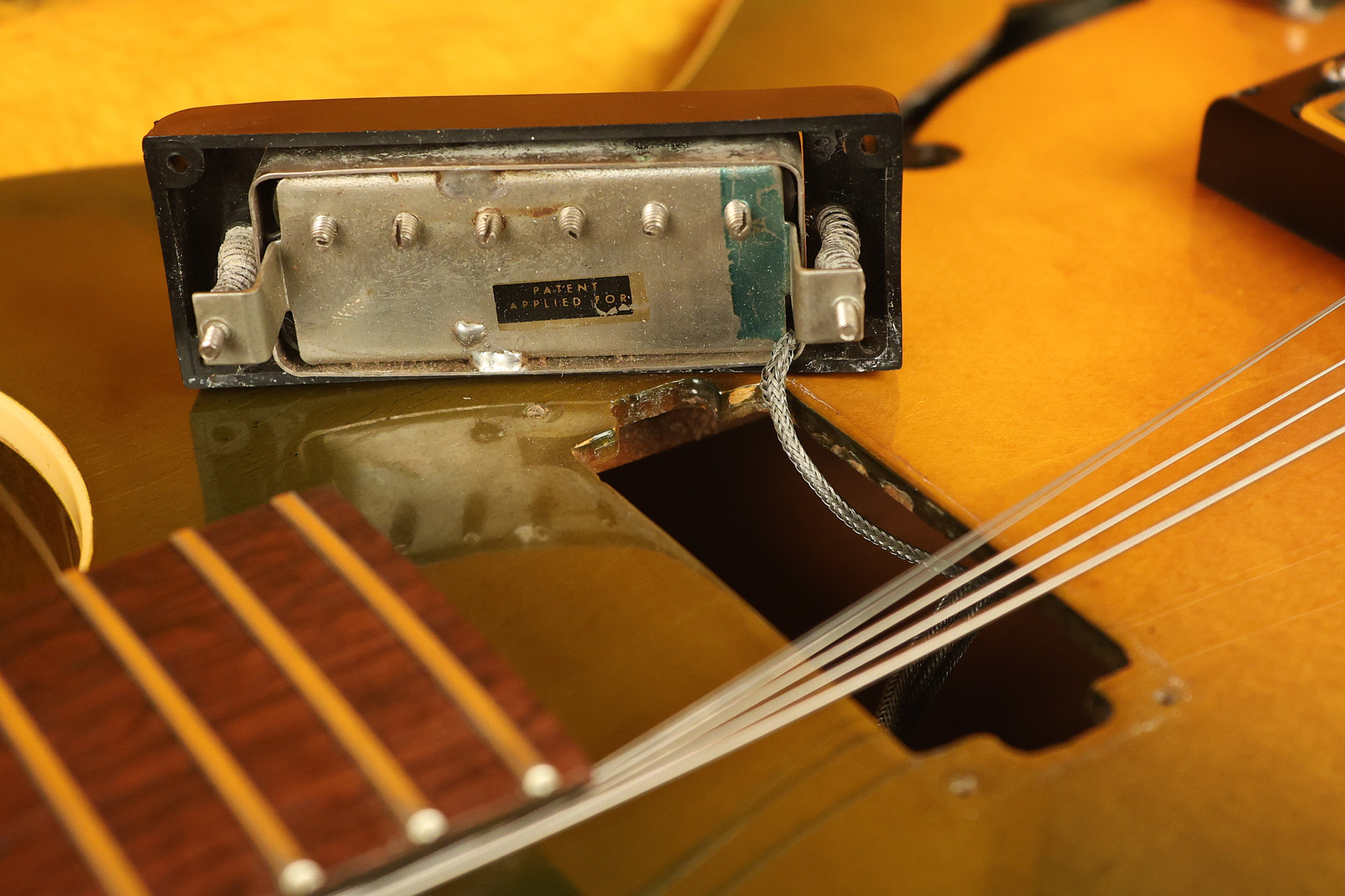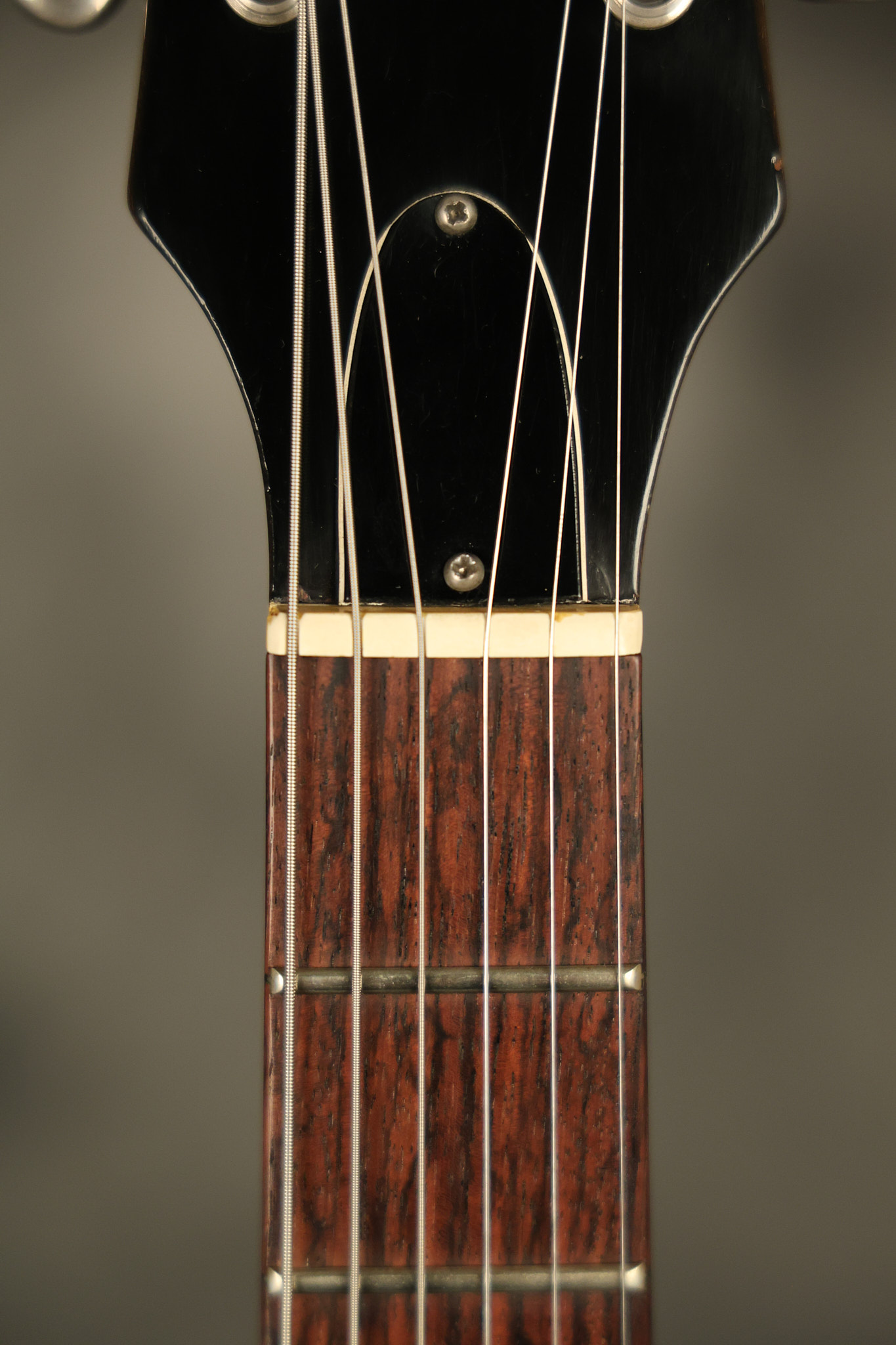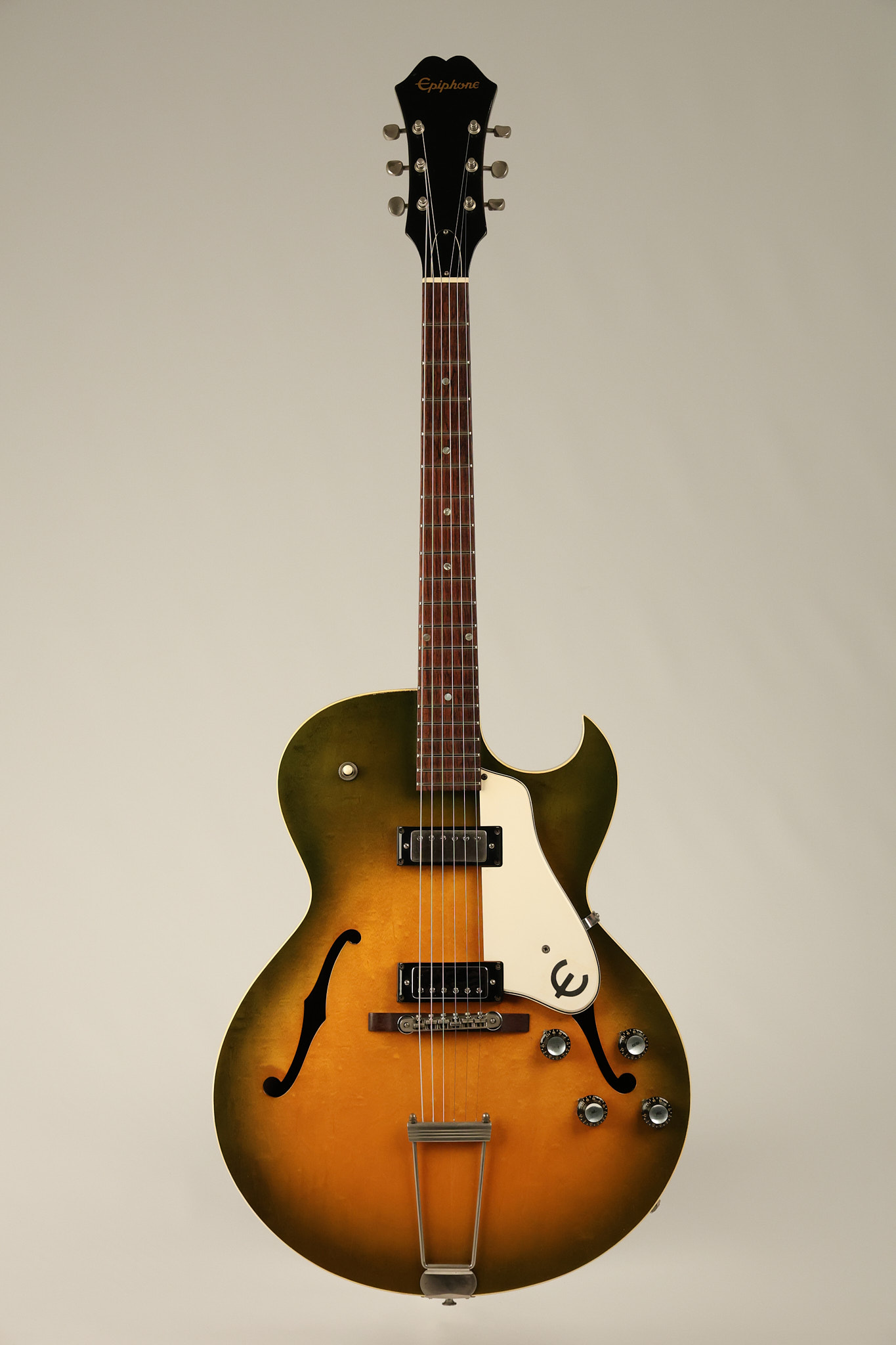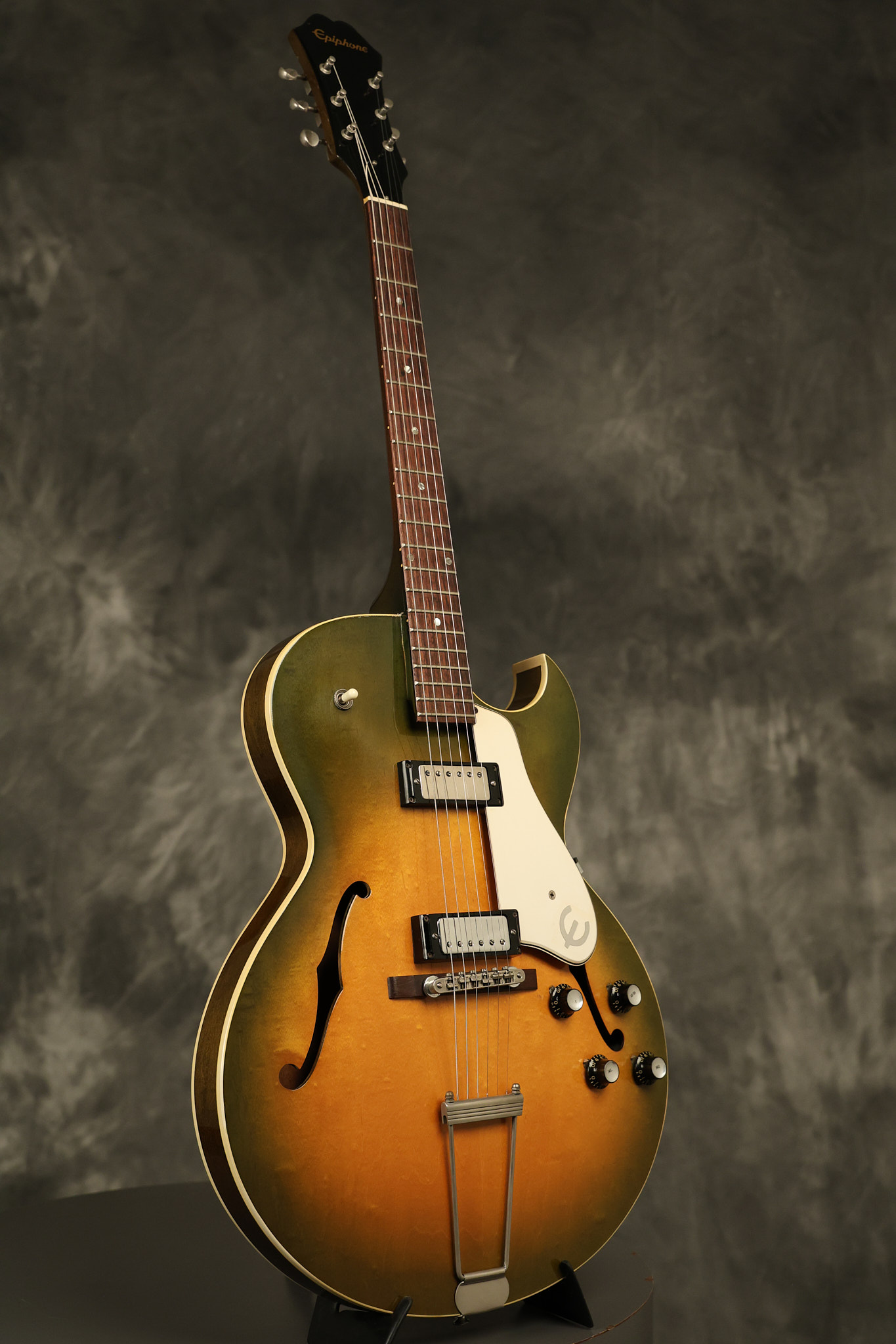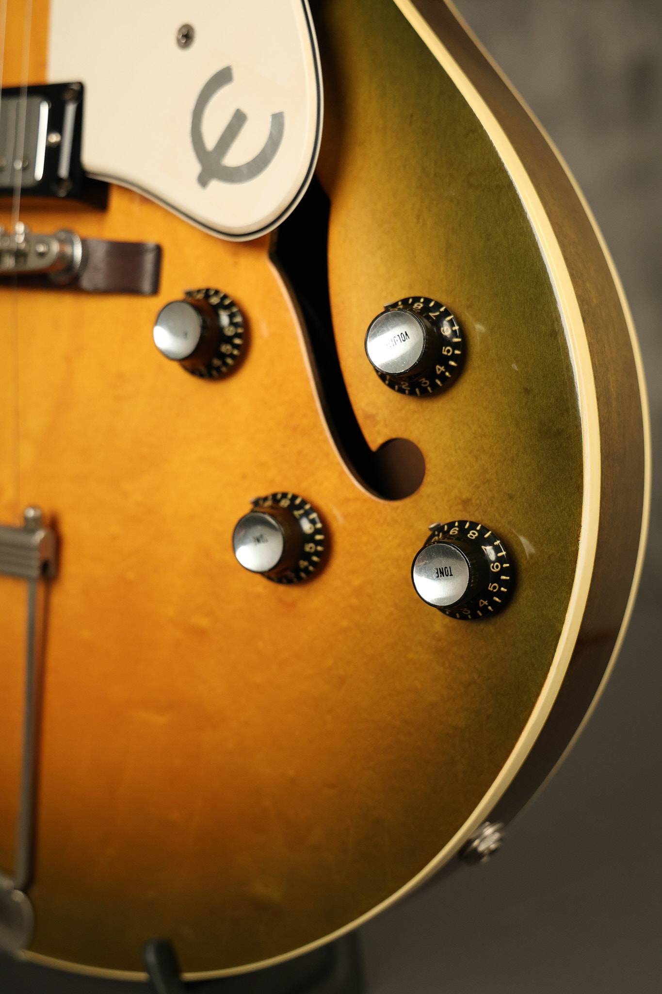 1961 Epiphone Sorrento E452TD in its original Royal Olive finish. It has a great playing neck with great frets. It's all original with the exception of the bridge and the adjustment wheels. It is a later Gibson Patent # bridge that has been slightly filed down on the bottom. The pictured hardshell case is included. The neck has been professionally reset. It looks great with some nicks + dings and other cosmetic wear. There are two one inch hairline cracks running out from the jack, but it remains a cosmetic issue only as the guitar itself remains structurally sound. All electronics work and sound great with its original set of mini-humbuckers (one PAF and one Patent # sticker).