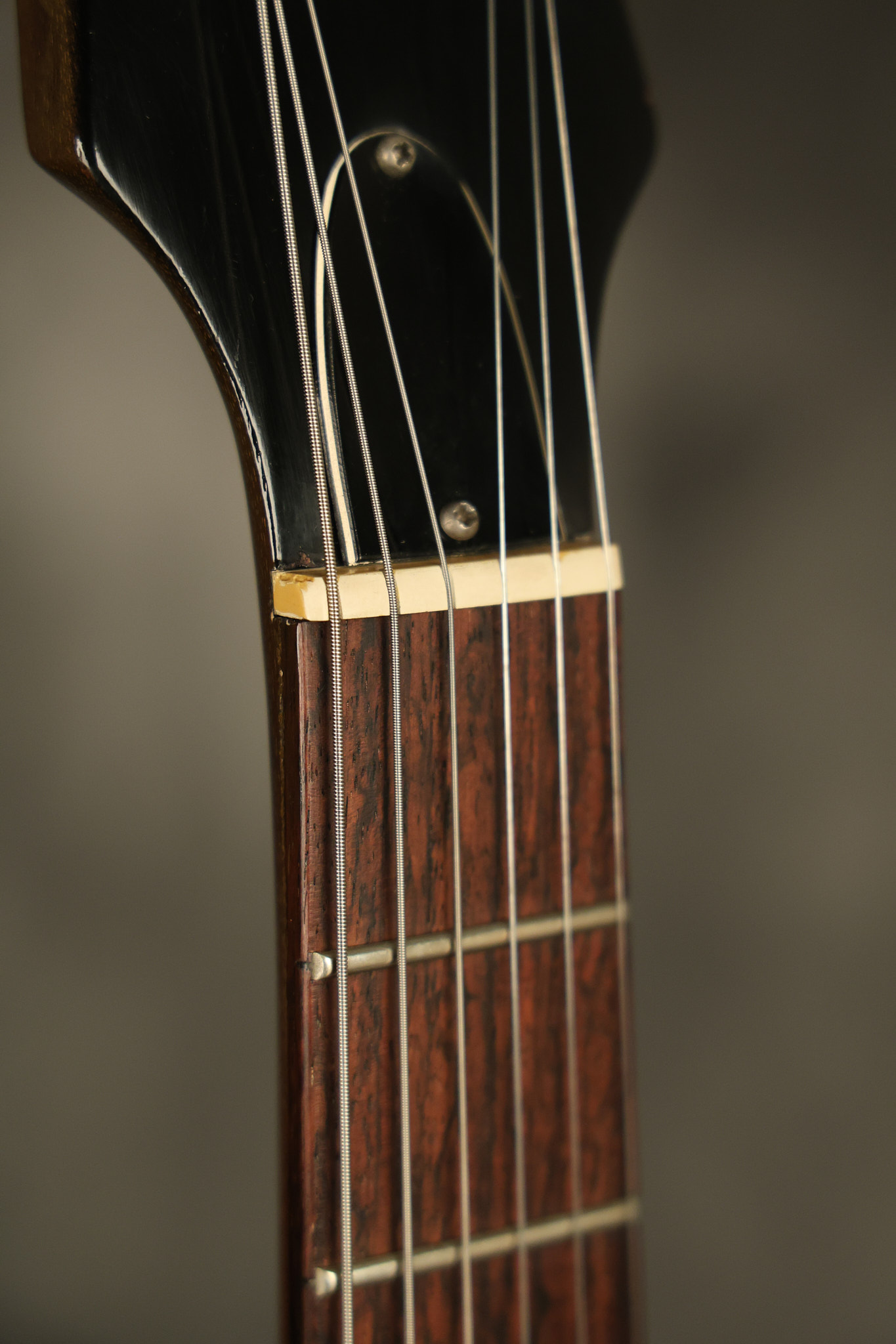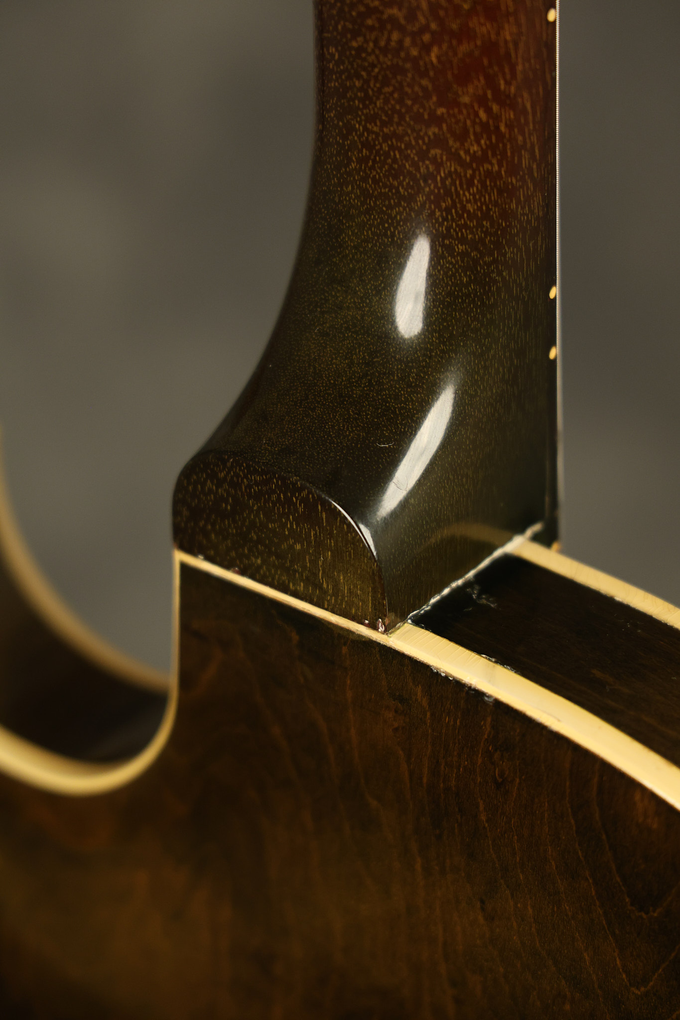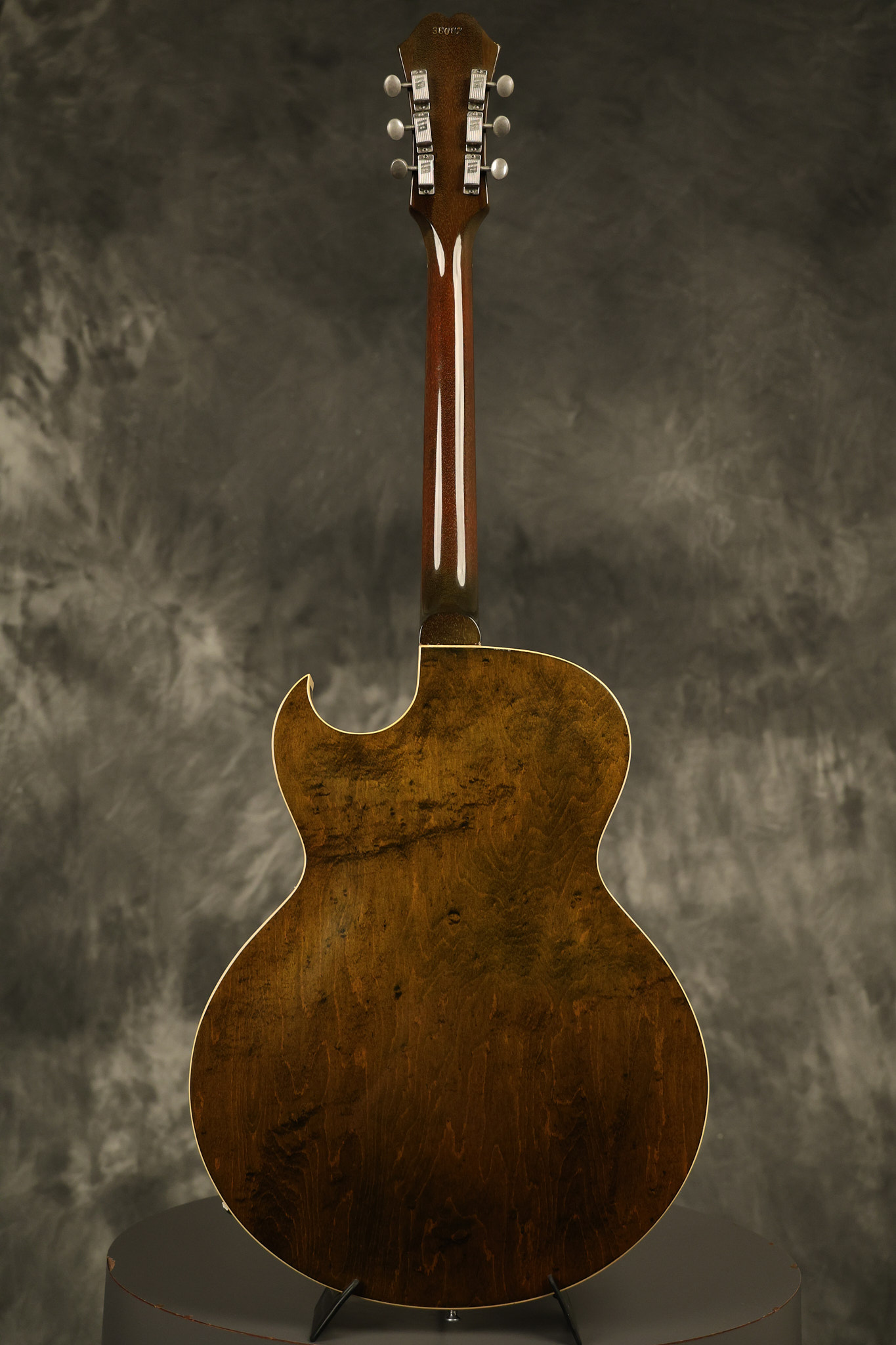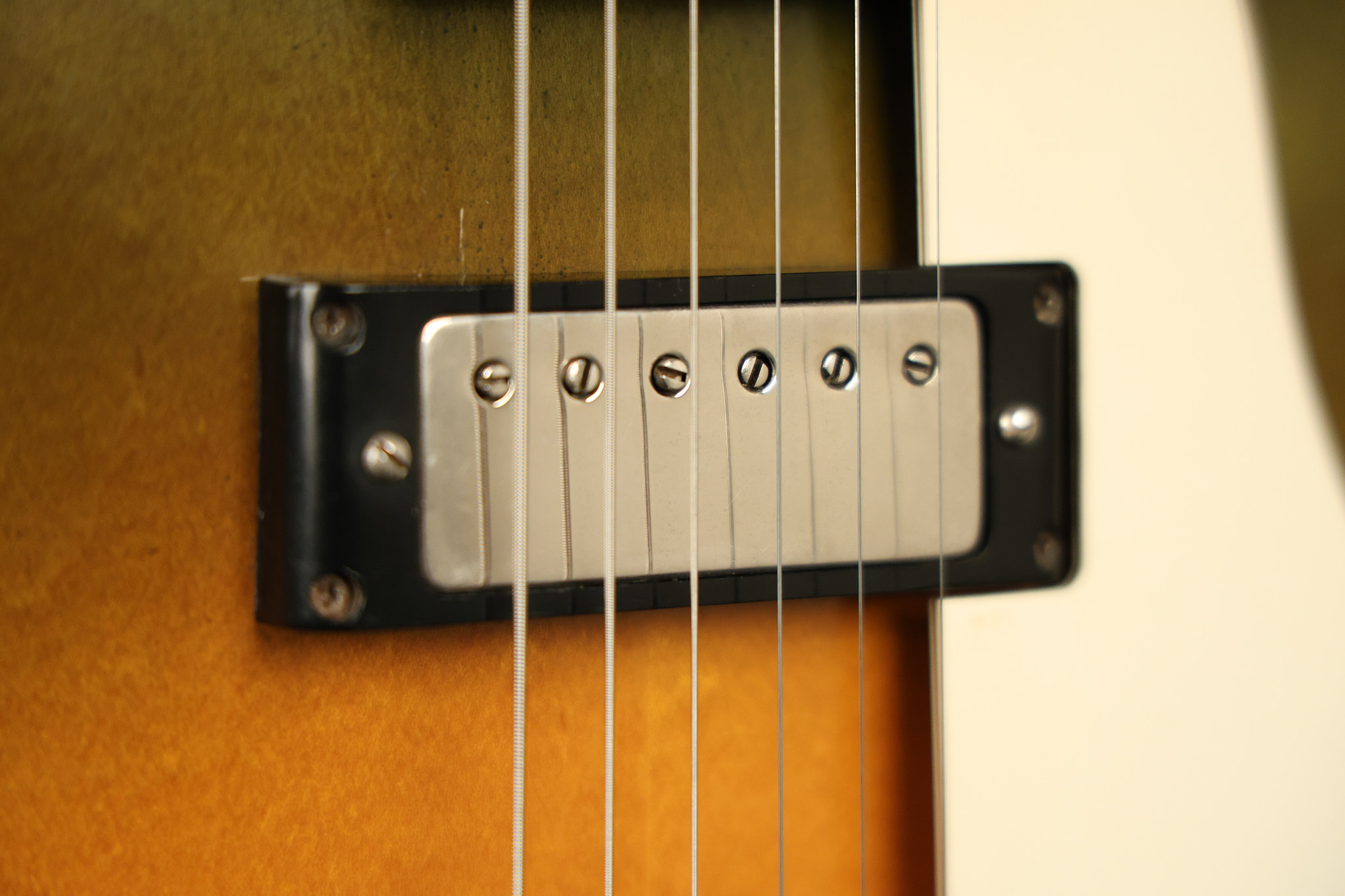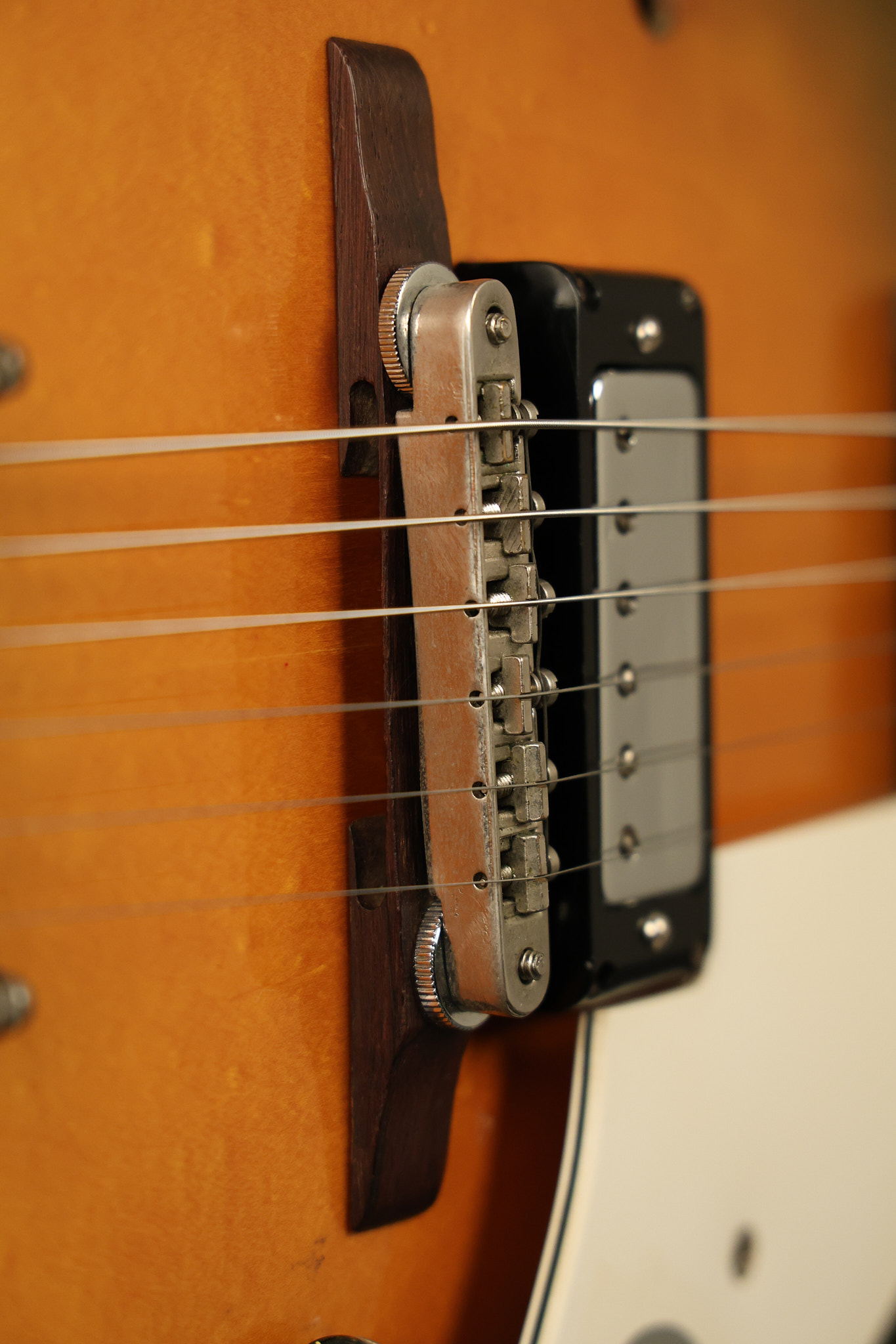1961 Epiphone Sorrento E452TD in its original Royal Olive finish. It has a great playing neck with great frets. It's all original with the exception of the bridge and the adjustment wheels. It is a later Gibson Patent # bridge that has been slightly filed down on the bottom. The pictured hardshell case is included. The neck has been professionally reset. It looks great with some nicks + dings and other cosmetic wear. There are two one inch hairline cracks running out from the jack, but it remains a cosmetic issue only as the guitar itself remains structurally sound. All electronics work and sound great with its original set of mini-humbuckers (one PAF and one Patent # sticker).