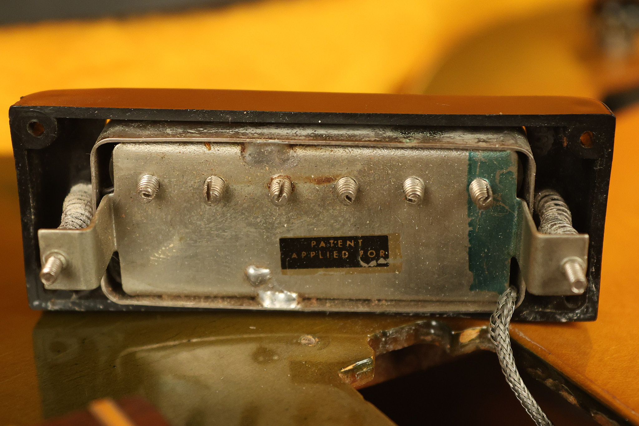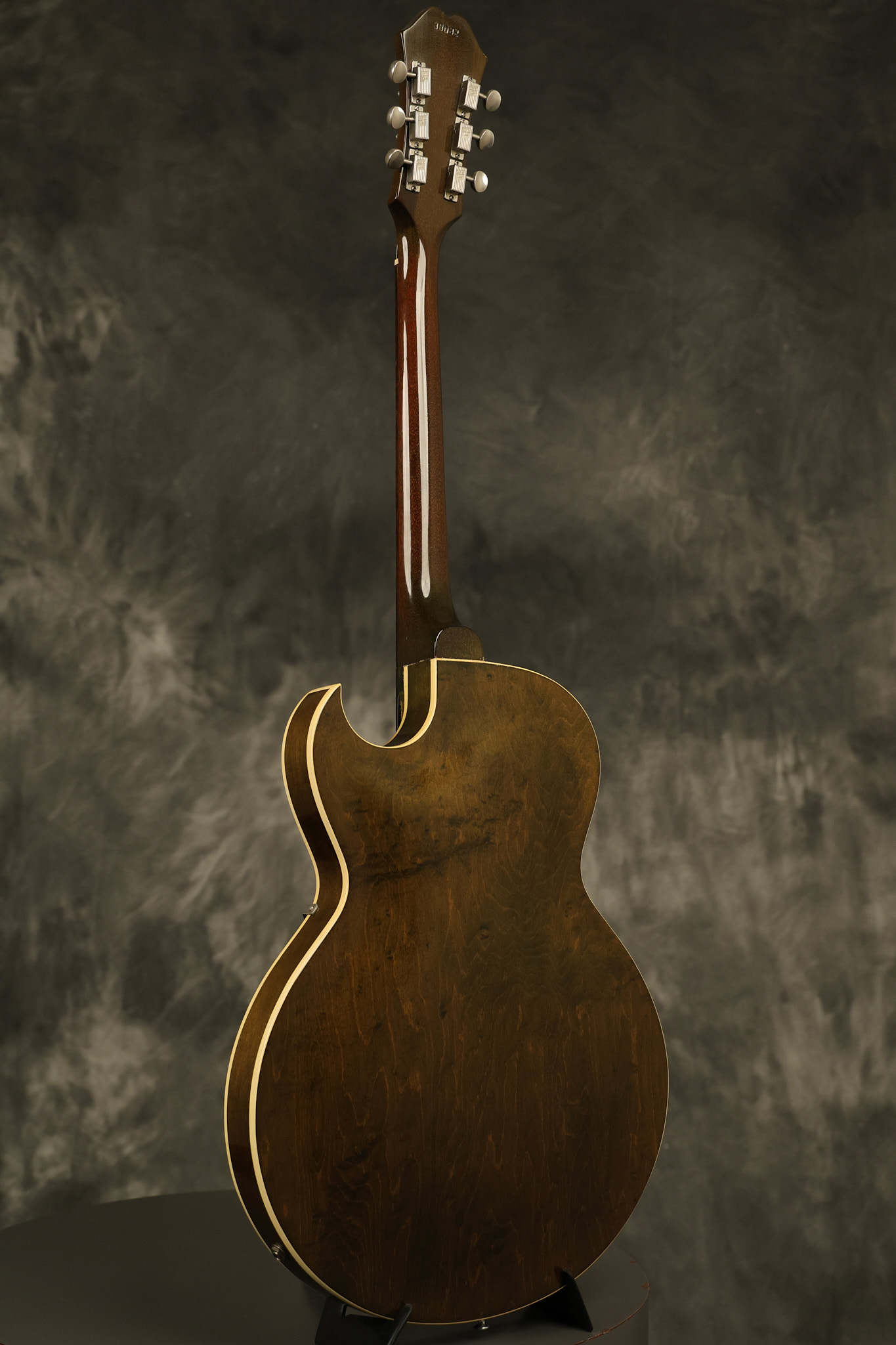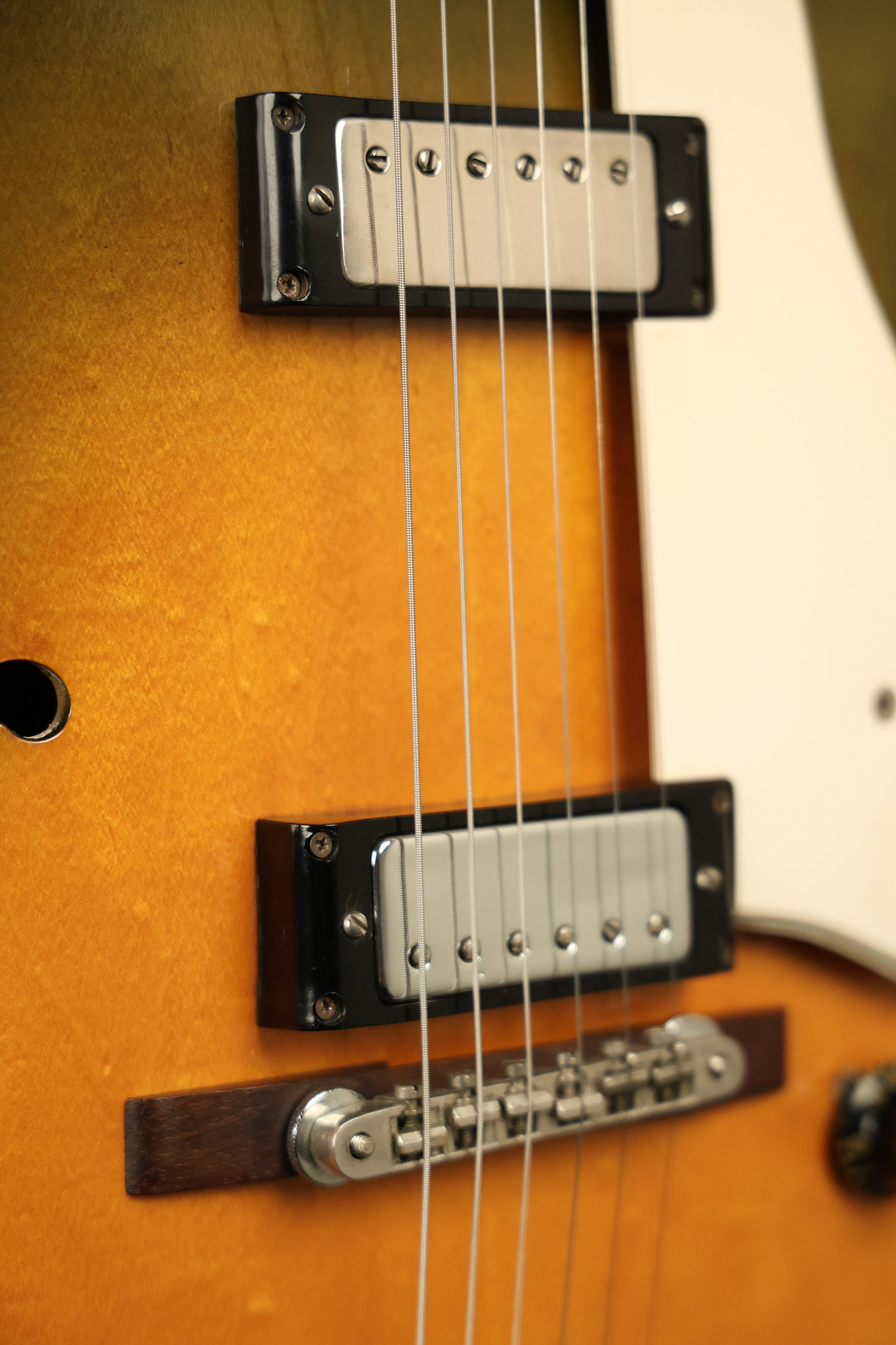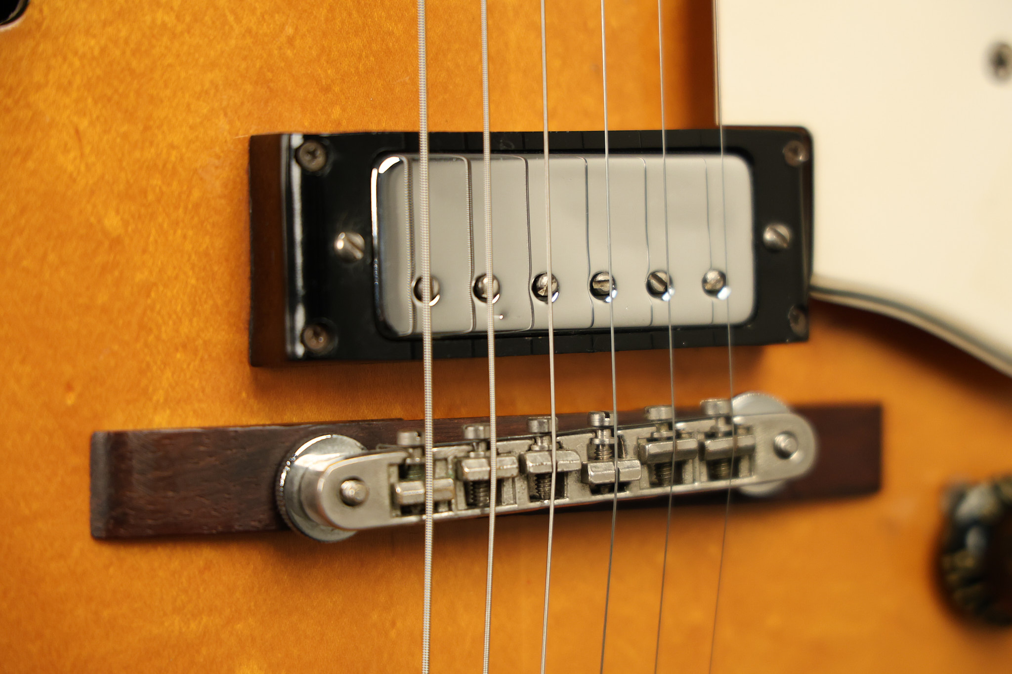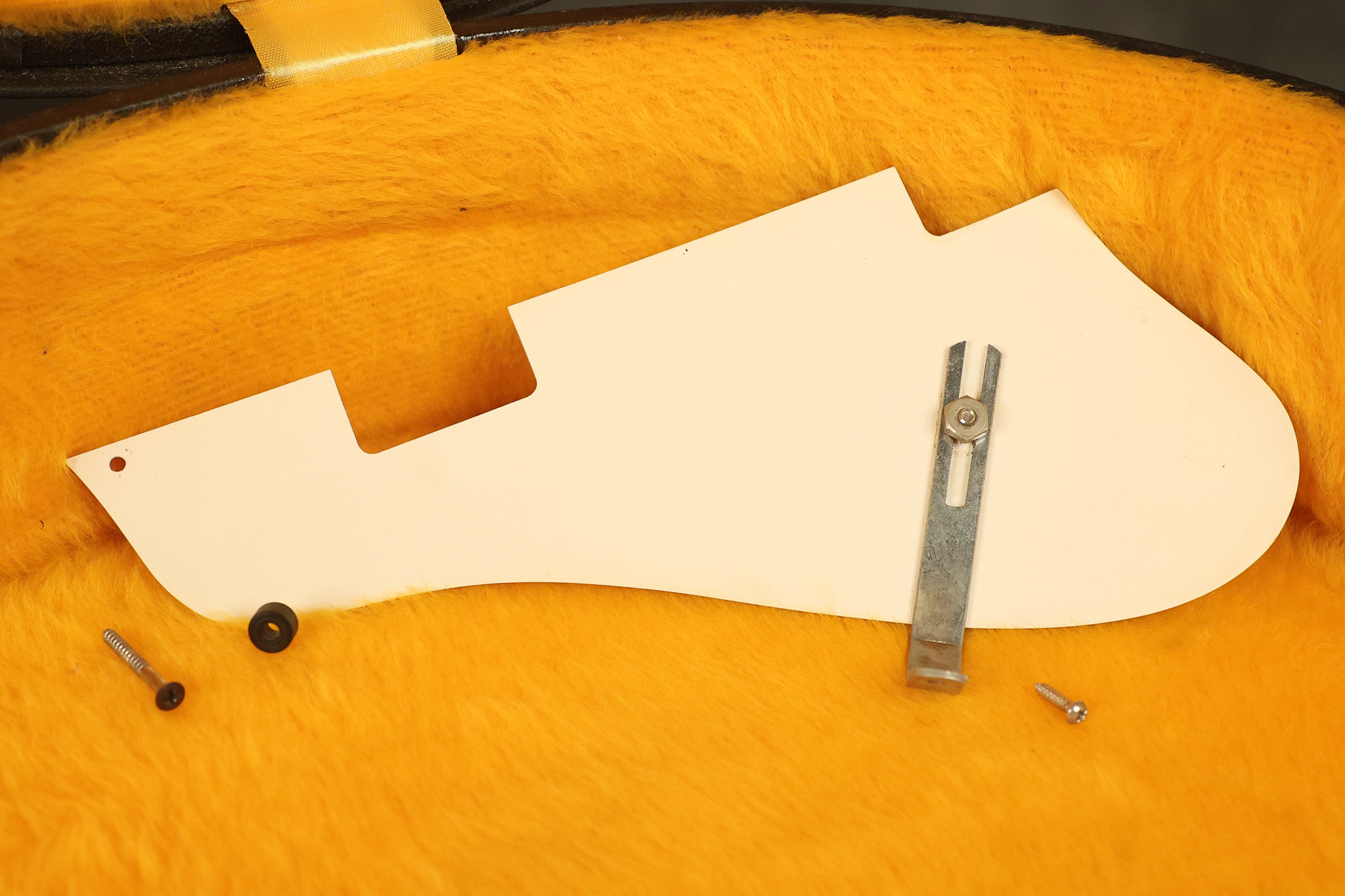 1961 Epiphone Sorrento E452TD in its original Royal Olive finish. It has a great playing neck with great frets. It's all original with the exception of the bridge and the adjustment wheels. It is a later Gibson Patent # bridge that has been slightly filed down on the bottom. The pictured hardshell case is included. The neck has been professionally reset. It looks great with some nicks + dings and other cosmetic wear. There are two one inch hairline cracks running out from the jack, but it remains a cosmetic issue only as the guitar itself remains structurally sound. All electronics work and sound great with its original set of mini-humbuckers (one PAF and one Patent # sticker).