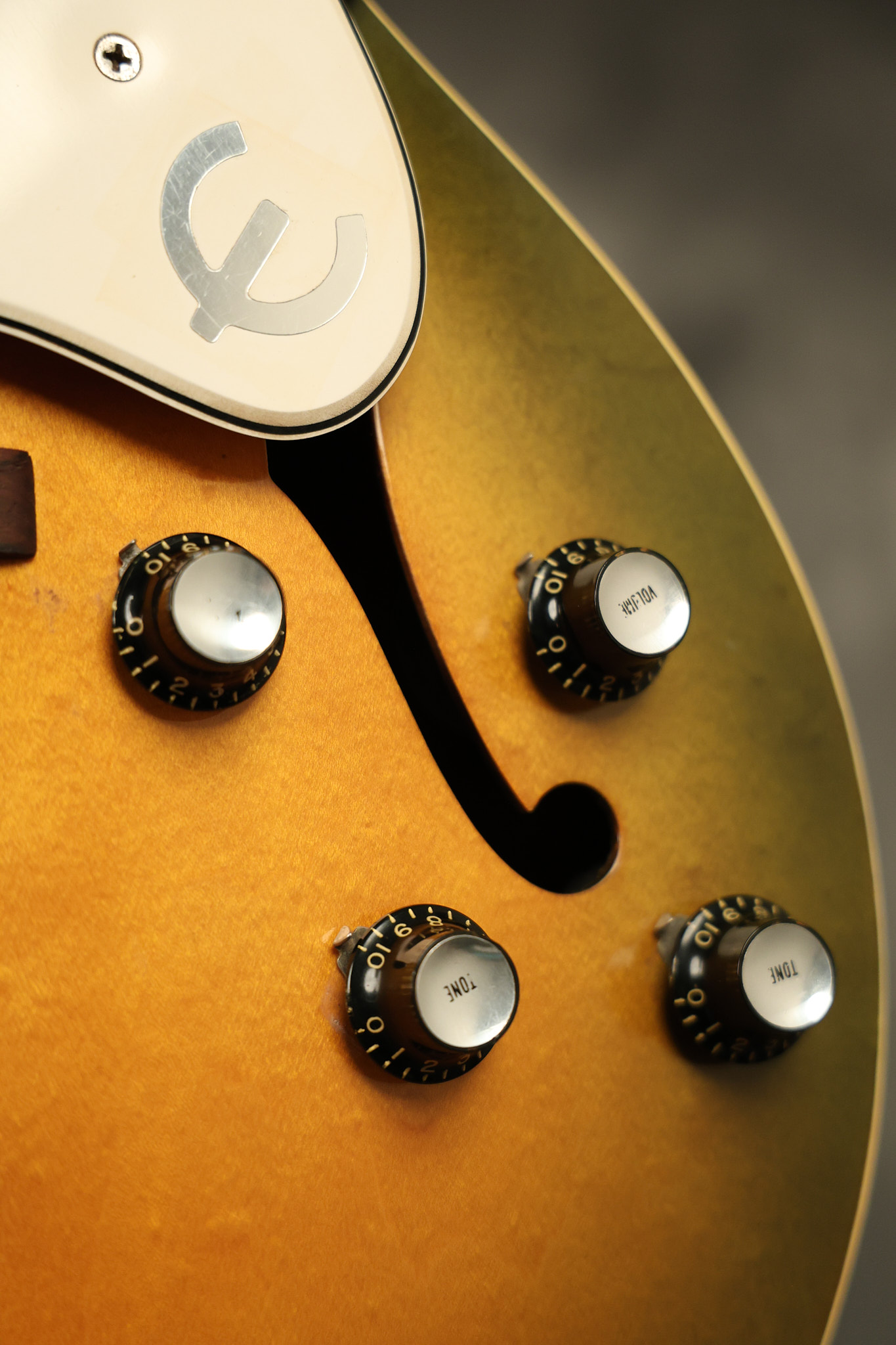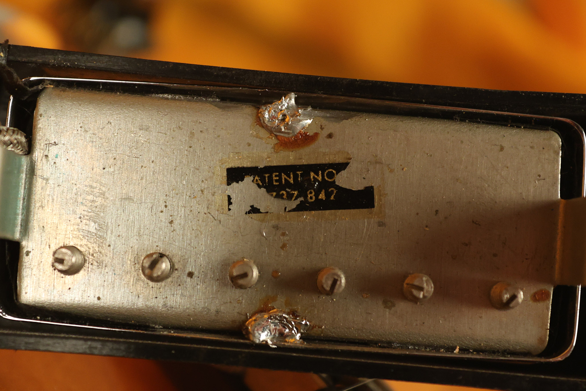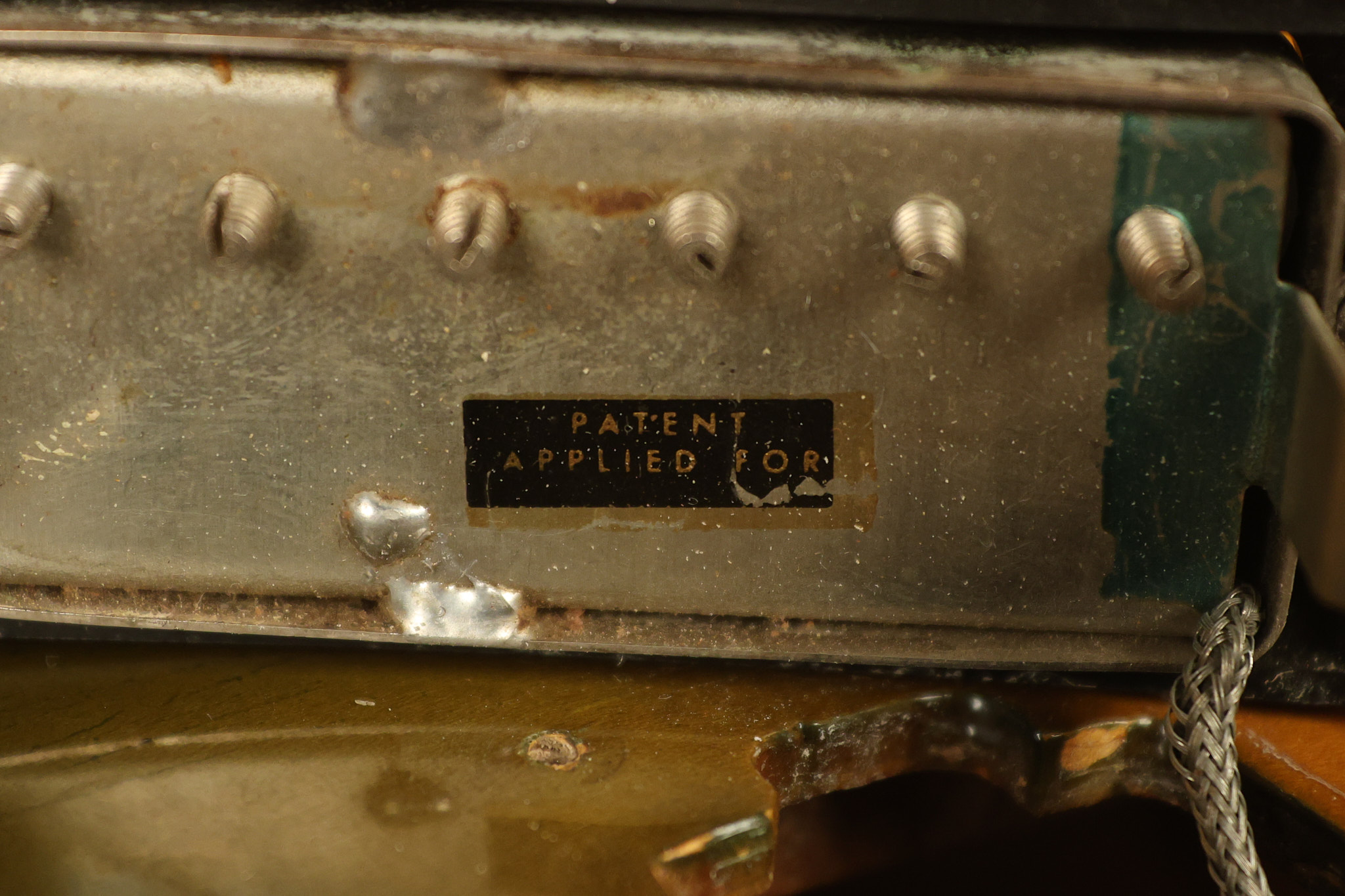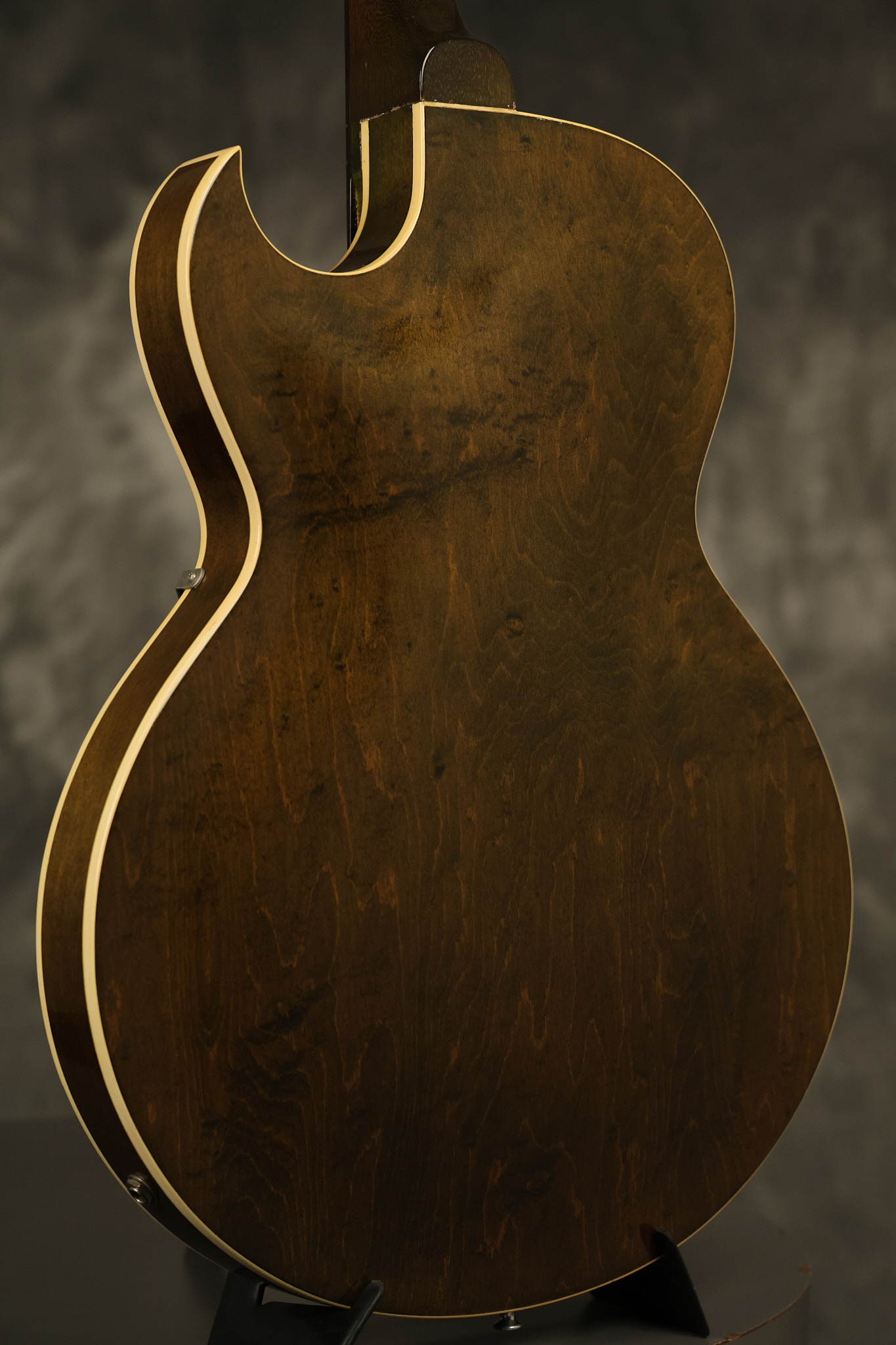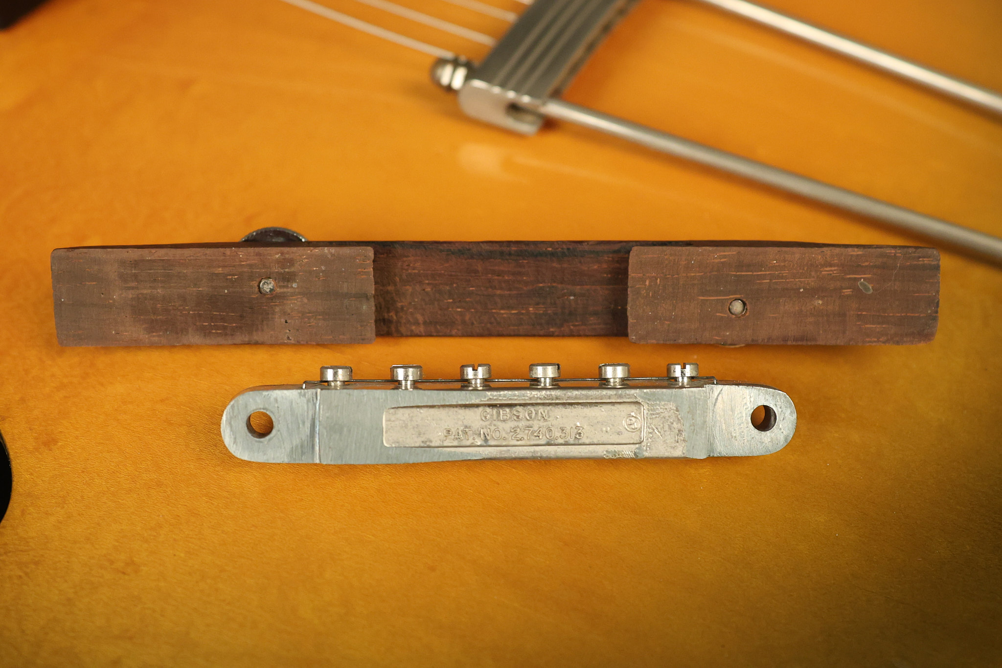 1961 Epiphone Sorrento E452TD in its original Royal Olive finish. It has a great playing neck with great frets. It's all original with the exception of the bridge and the adjustment wheels. It is a later Gibson Patent # bridge that has been slightly filed down on the bottom. The pictured hardshell case is included. The neck has been professionally reset. It looks great with some nicks + dings and other cosmetic wear. There are two one inch hairline cracks running out from the jack, but it remains a cosmetic issue only as the guitar itself remains structurally sound. All electronics work and sound great with its original set of mini-humbuckers (one PAF and one Patent # sticker).