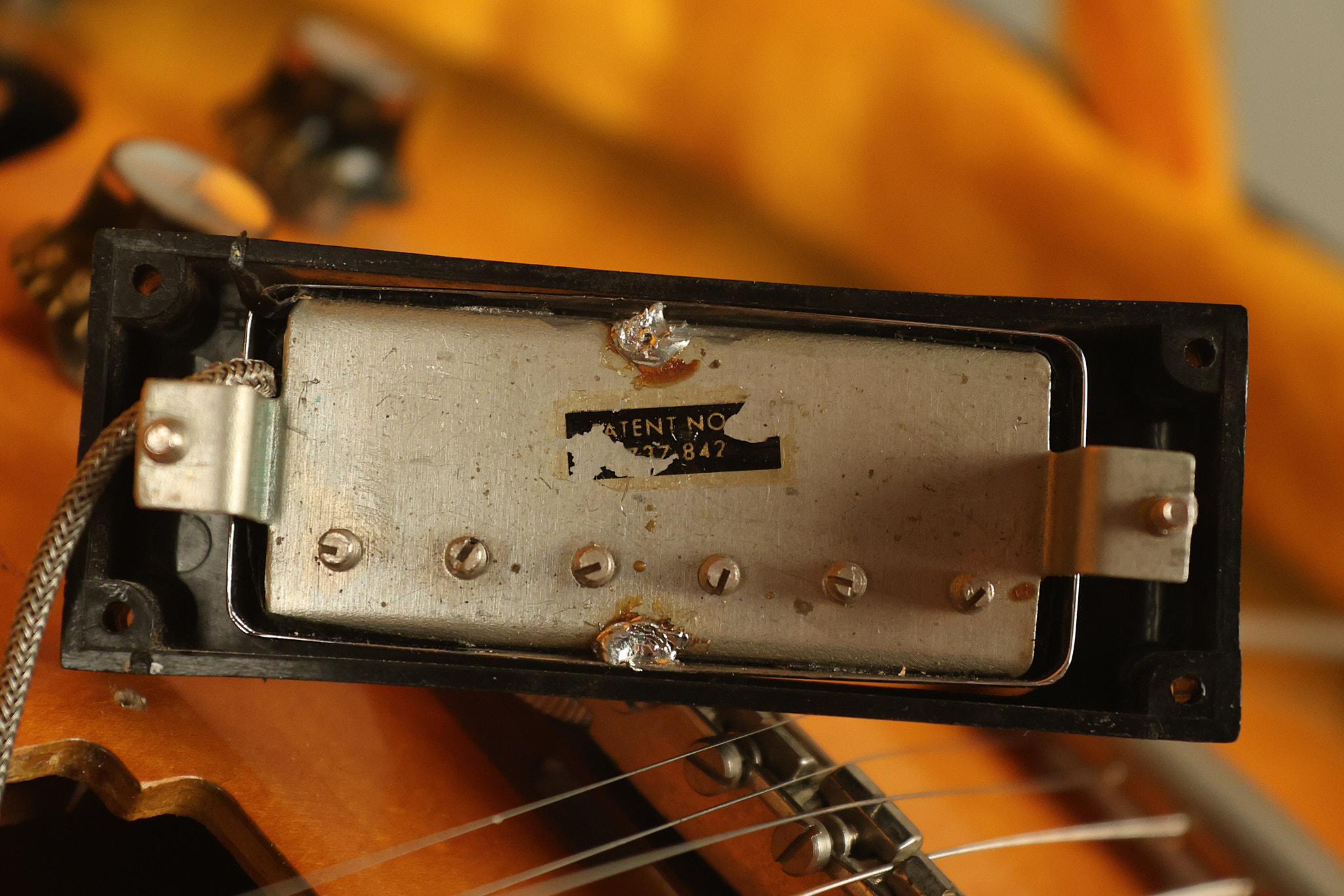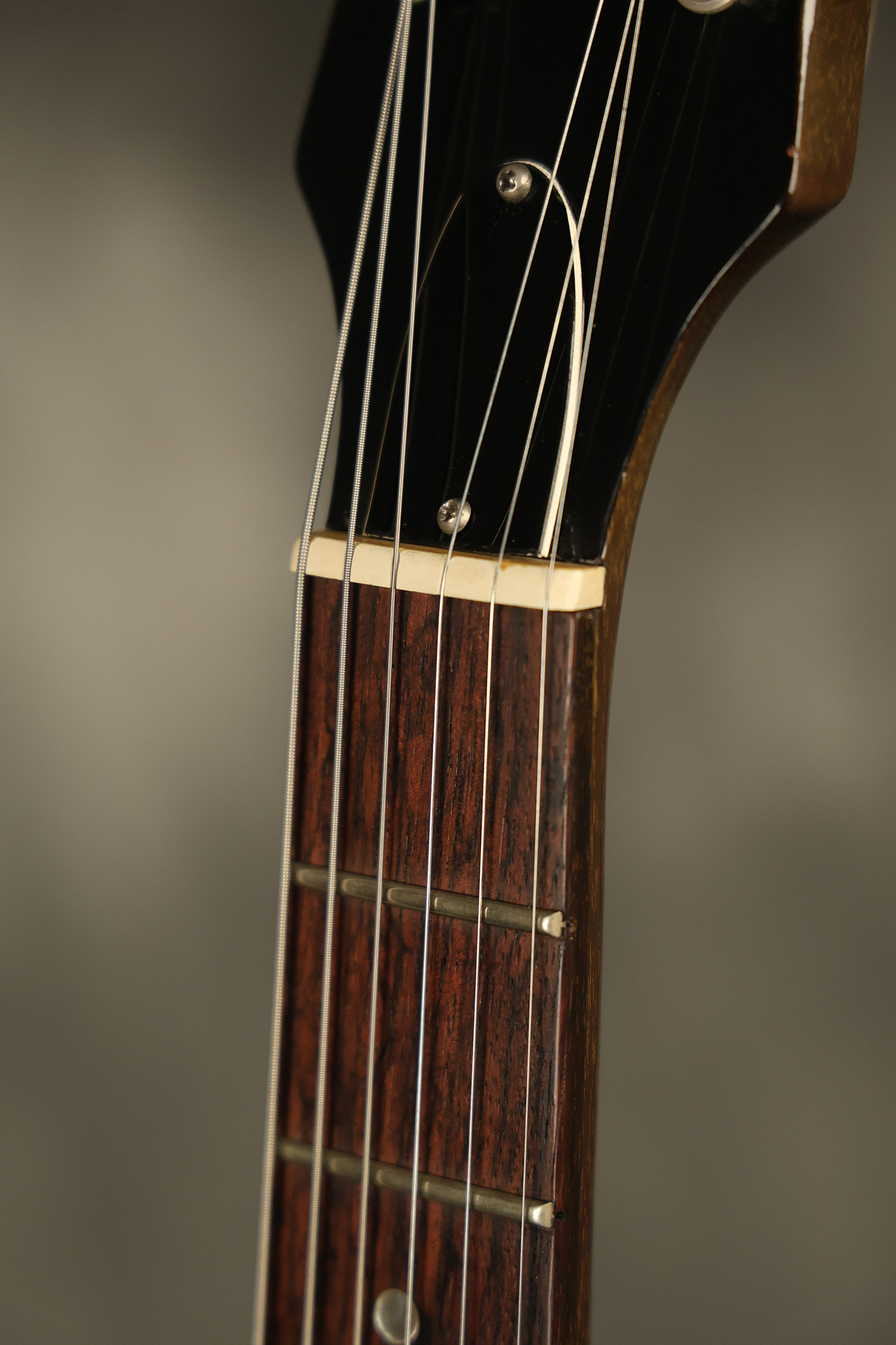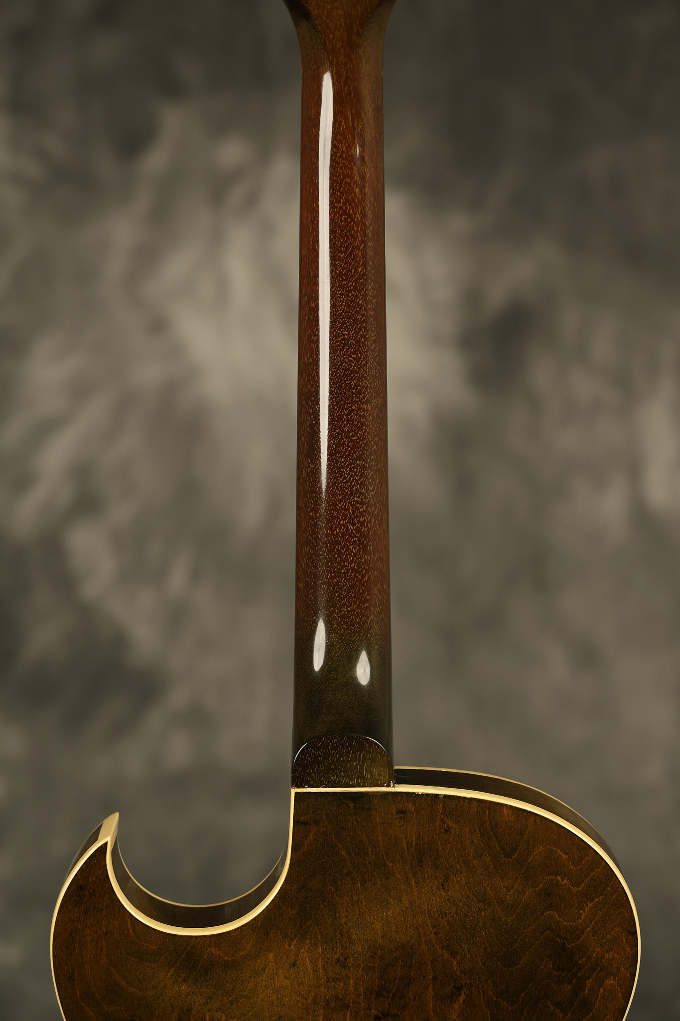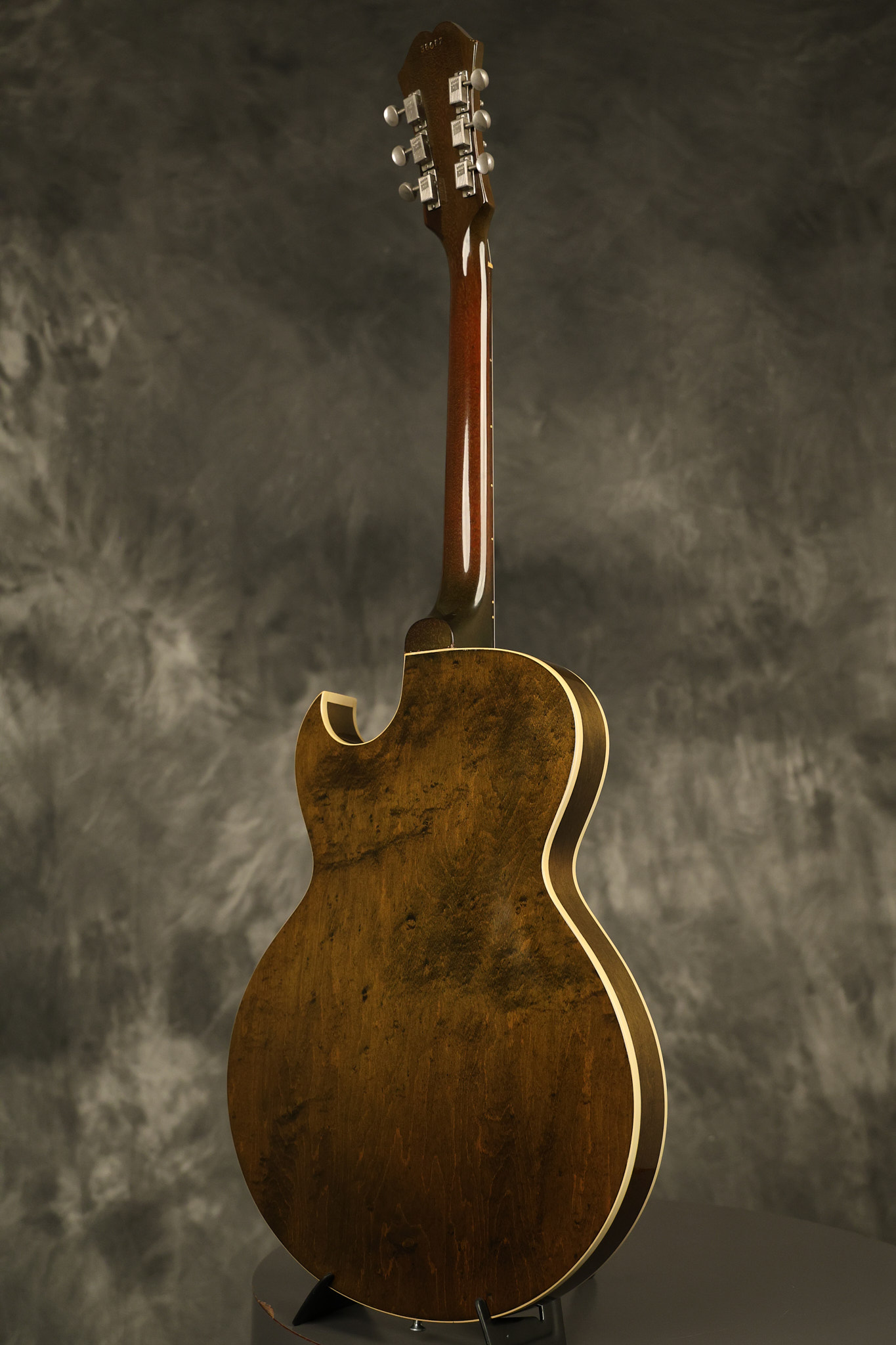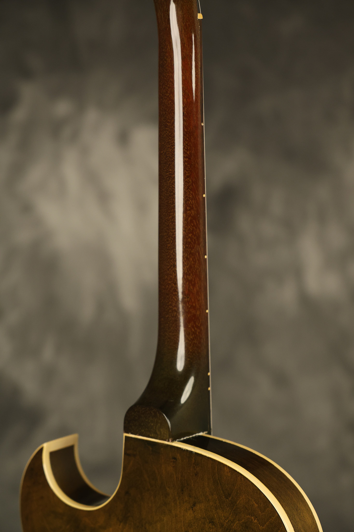 1961 Epiphone Sorrento E452TD in its original Royal Olive finish. It has a great playing neck with great frets. It's all original with the exception of the bridge and the adjustment wheels. It is a later Gibson Patent # bridge that has been slightly filed down on the bottom. The pictured hardshell case is included. The neck has been professionally reset. It looks great with some nicks + dings and other cosmetic wear. There are two one inch hairline cracks running out from the jack, but it remains a cosmetic issue only as the guitar itself remains structurally sound. All electronics work and sound great with its original set of mini-humbuckers (one PAF and one Patent # sticker).