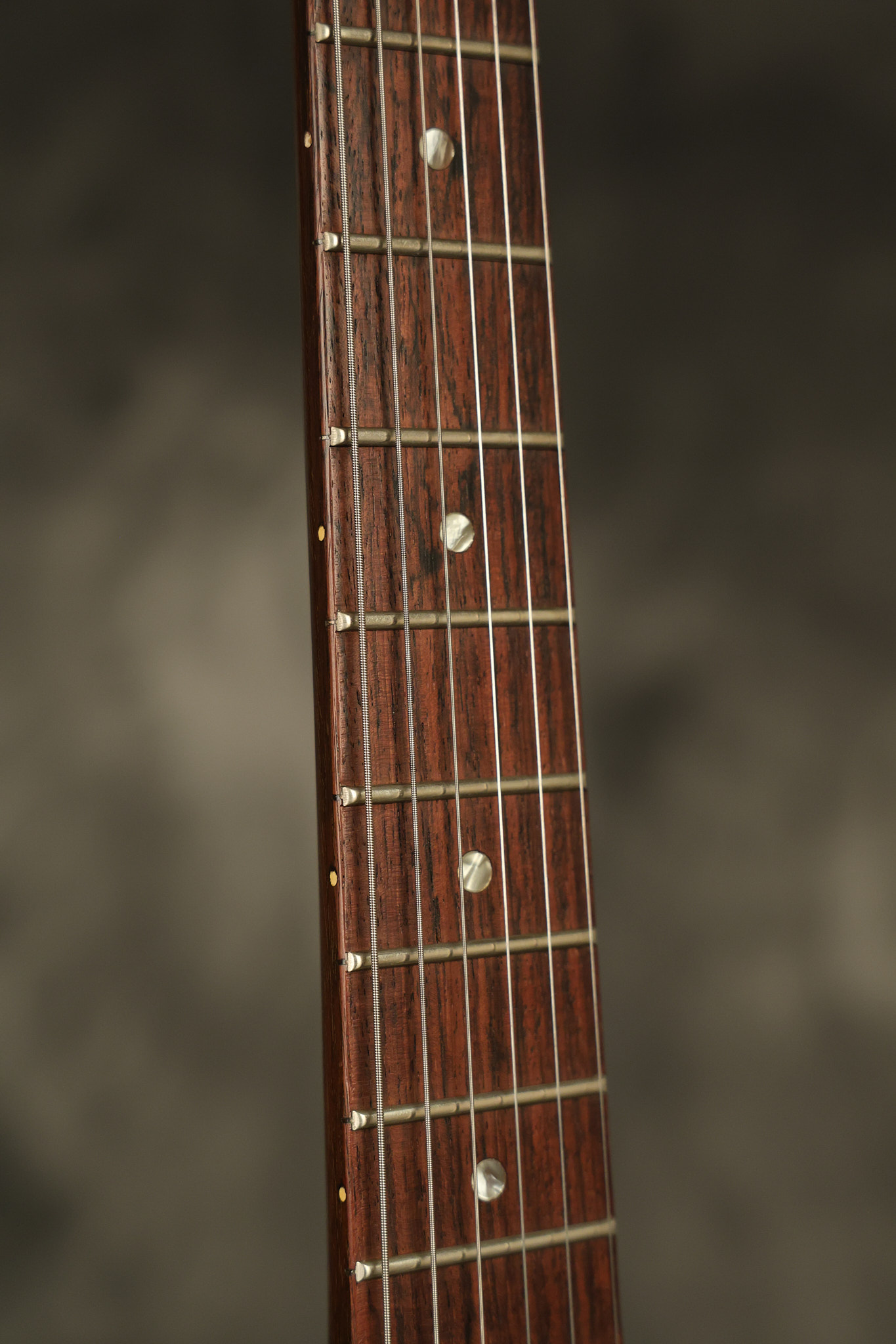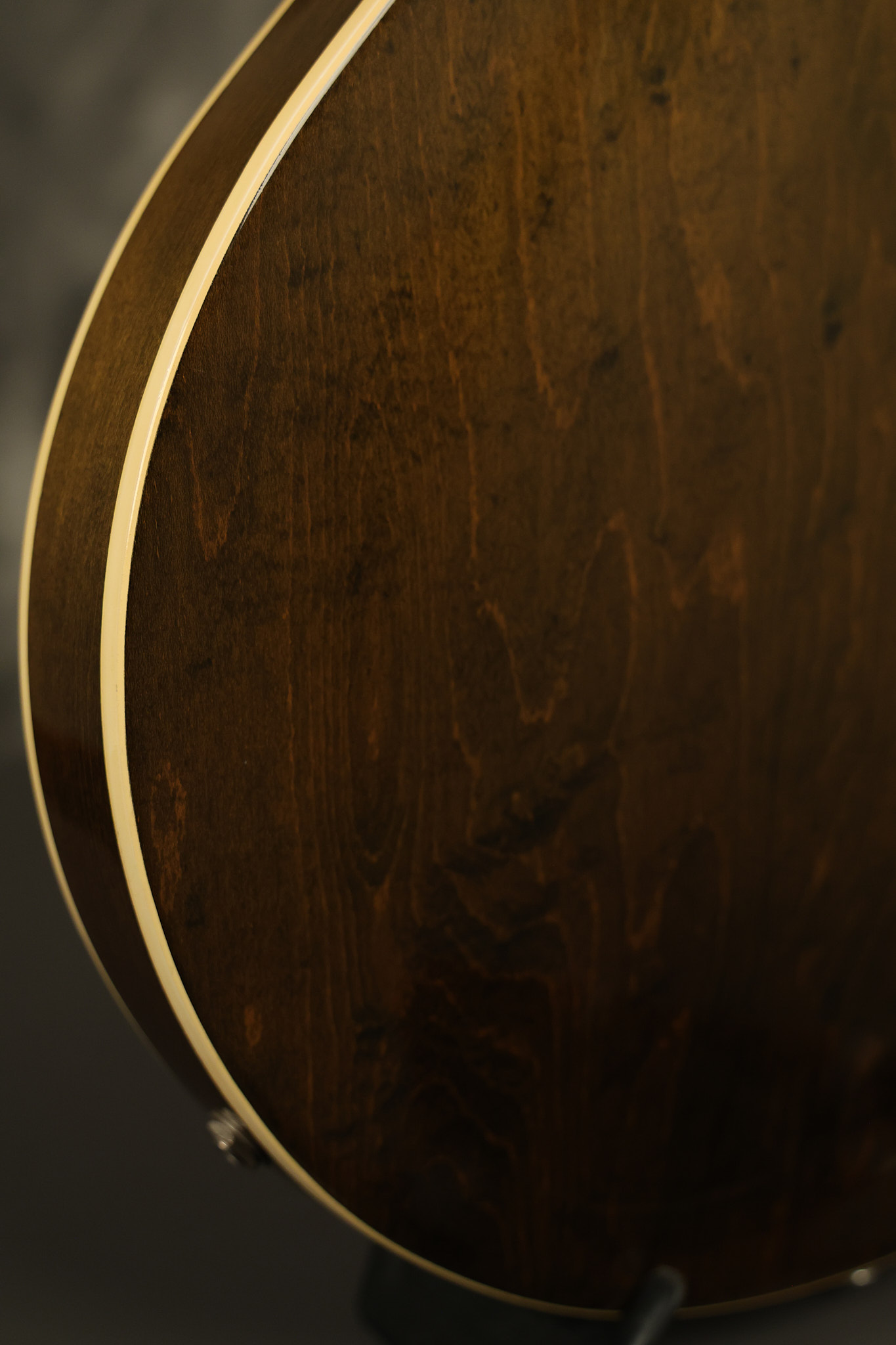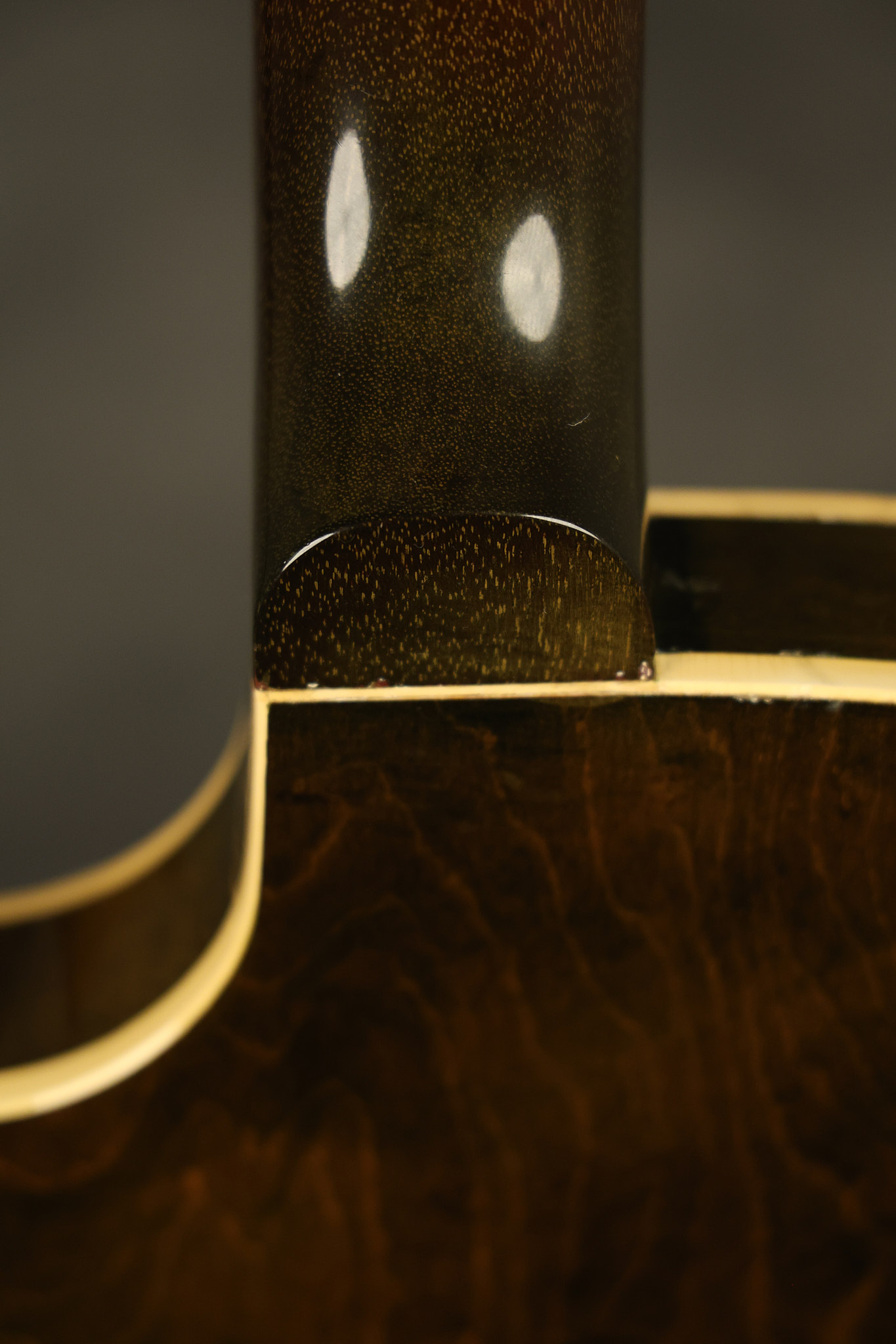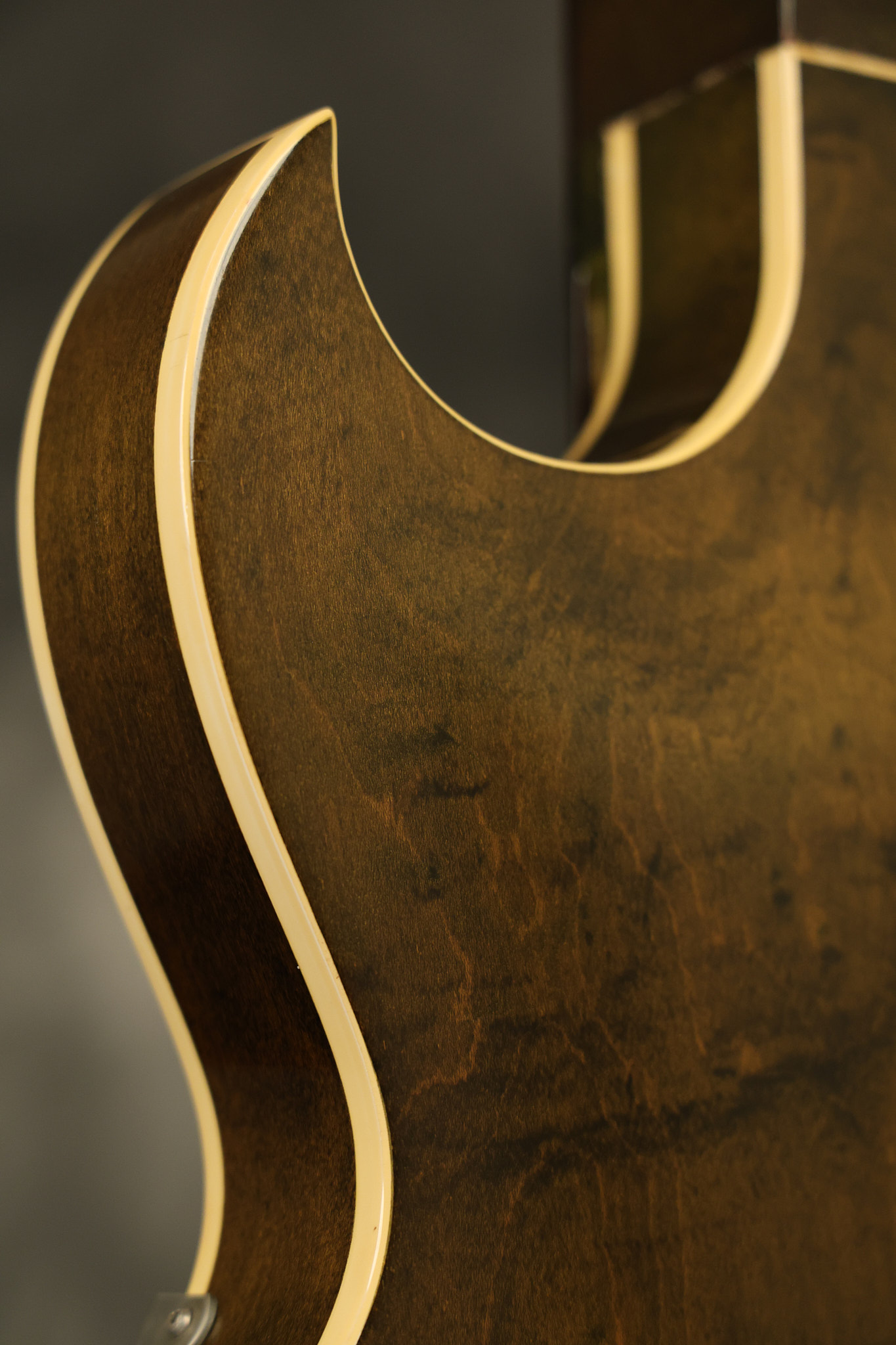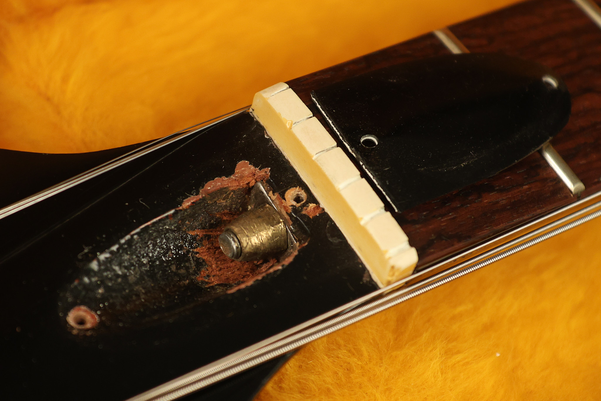1961 Epiphone Sorrento E452TD in its original Royal Olive finish. It has a great playing neck with great frets. It's all original with the exception of the bridge and the adjustment wheels. It is a later Gibson Patent # bridge that has been slightly filed down on the bottom. The pictured hardshell case is included. The neck has been professionally reset. It looks great with some nicks + dings and other cosmetic wear. There are two one inch hairline cracks running out from the jack, but it remains a cosmetic issue only as the guitar itself remains structurally sound. All electronics work and sound great with its original set of mini-humbuckers (one PAF and one Patent # sticker).