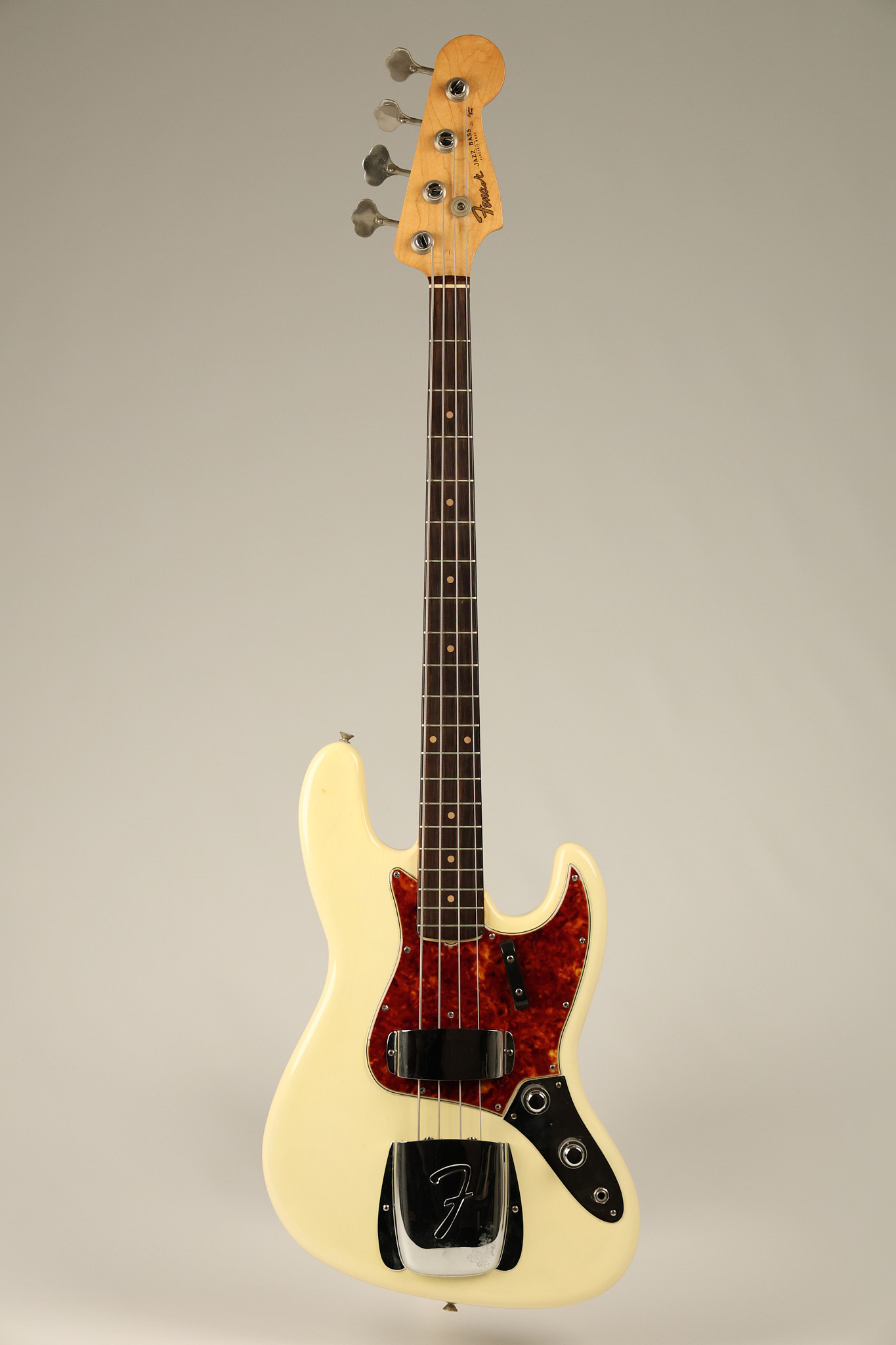 1961 Fender Jazz Bass "Stack Knob" with a body that has been refinished Blonde. Traces of original paint found underneath some parts indicate that it was originally Sunburst. The finish on the neck is original, but at the heel end of the neck the underside portion that is concealed in the neck pocket has been sanded. It has a great playing neck with great frets. Both pickups appear to have been rewound. All other parts appear to be original with the exception of one washer for one tuning key, one washer for one of the mutes and 3 of the 4 screws for the chrome covers. The original mutes are included along with the original Brown hardshell case. There are two areas on the back of the body where the finish was chipped/buffed out over the two factory dowels. There are nicks + dings, finish checking and other cosmetic wear including two faint rings in the finish of the back of the body. All electronics work and sound great, but the two original resistors have been removed. The weight is 8 lbs. 9 oz. without the covers.