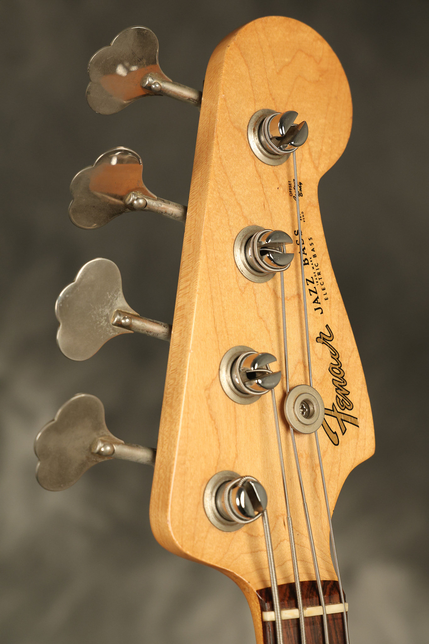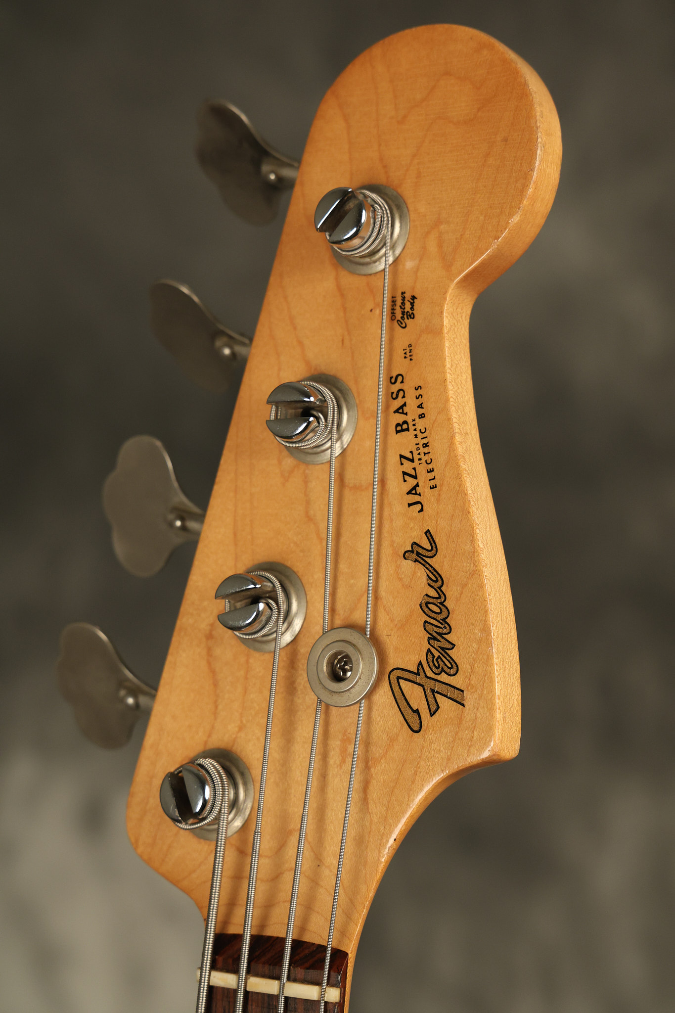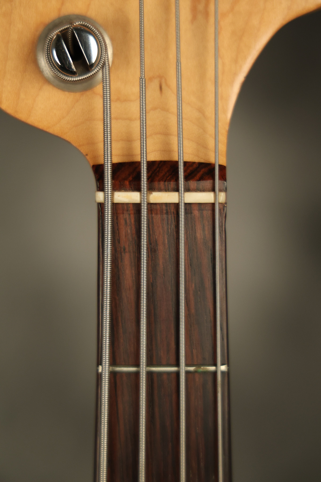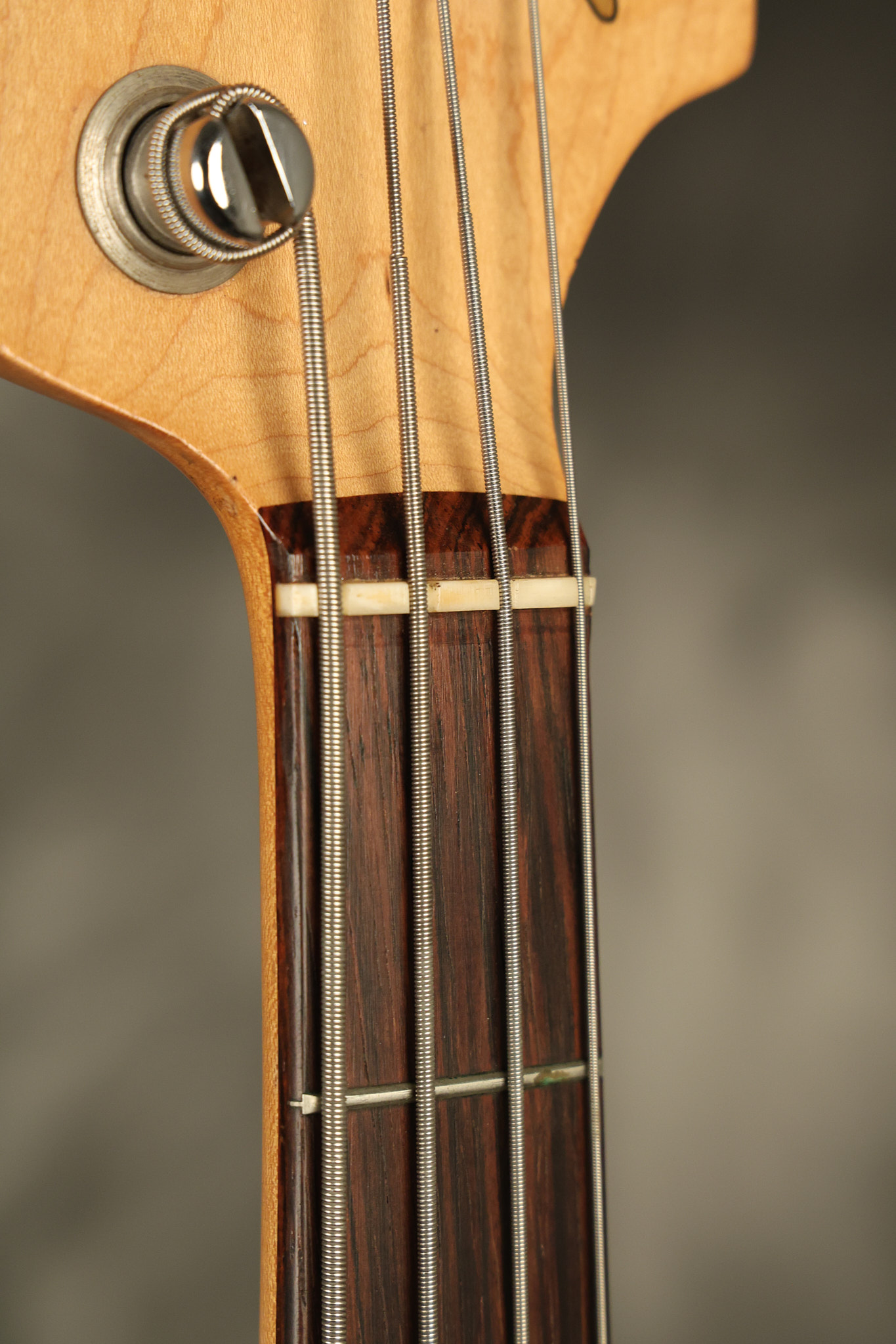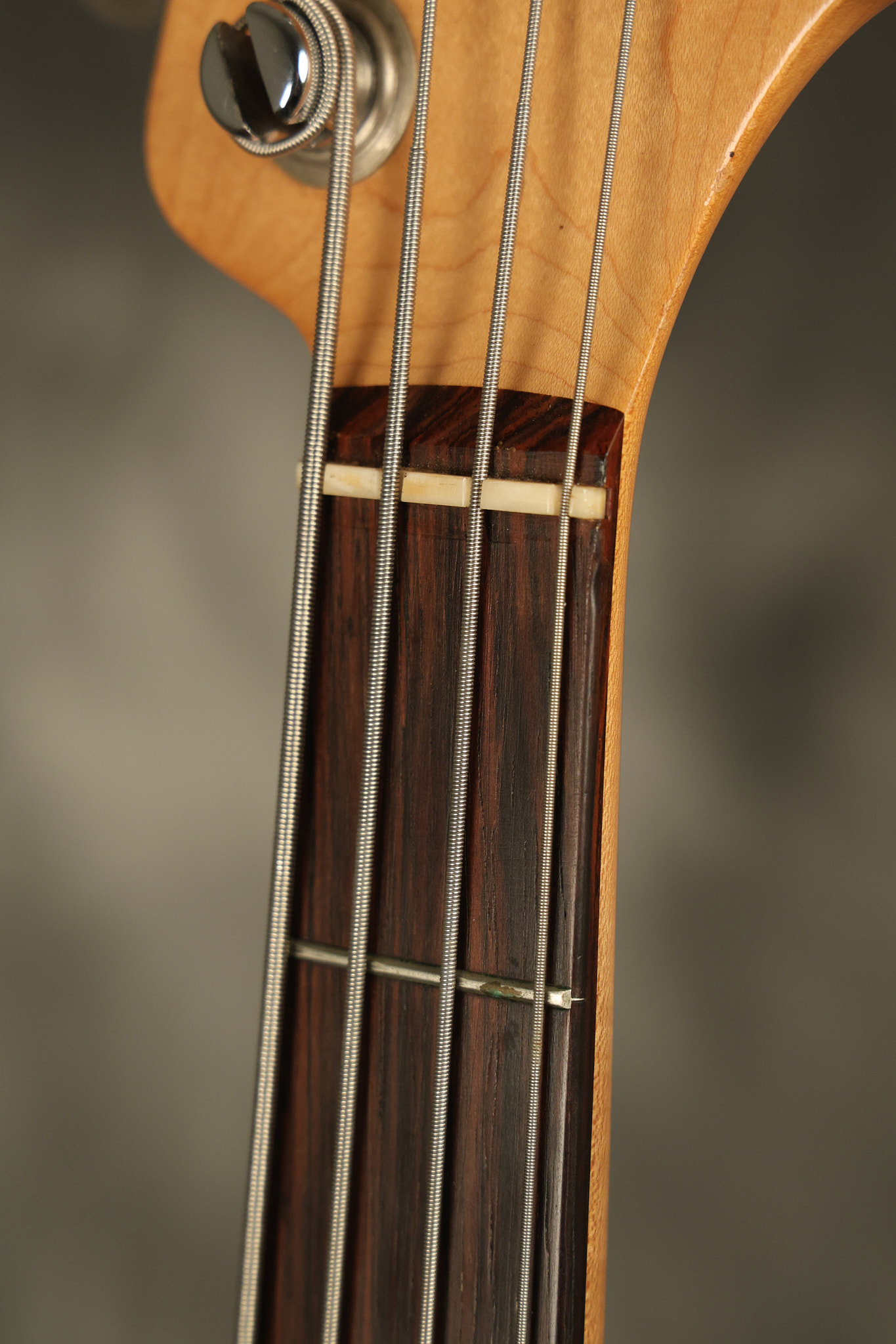 1961 Fender Jazz Bass "Stack Knob" with a body that has been refinished Blonde. Traces of original paint found underneath some parts indicate that it was originally Sunburst. The finish on the neck is original, but at the heel end of the neck the underside portion that is concealed in the neck pocket has been sanded. It has a great playing neck with great frets. Both pickups appear to have been rewound. All other parts appear to be original with the exception of one washer for one tuning key, one washer for one of the mutes and 3 of the 4 screws for the chrome covers. The original mutes are included along with the original Brown hardshell case. There are two areas on the back of the body where the finish was chipped/buffed out over the two factory dowels. There are nicks + dings, finish checking and other cosmetic wear including two faint rings in the finish of the back of the body. All electronics work and sound great, but the two original resistors have been removed. The weight is 8 lbs. 9 oz. without the covers.
