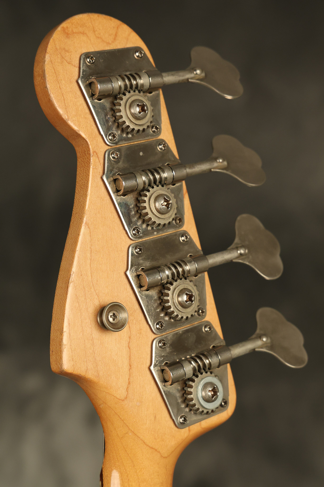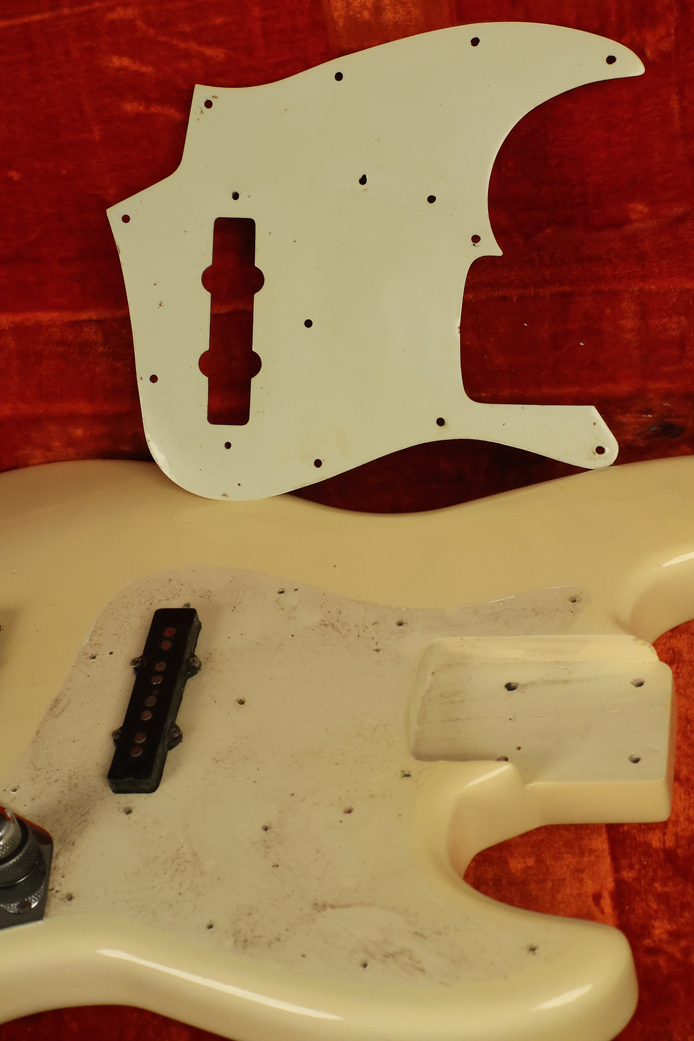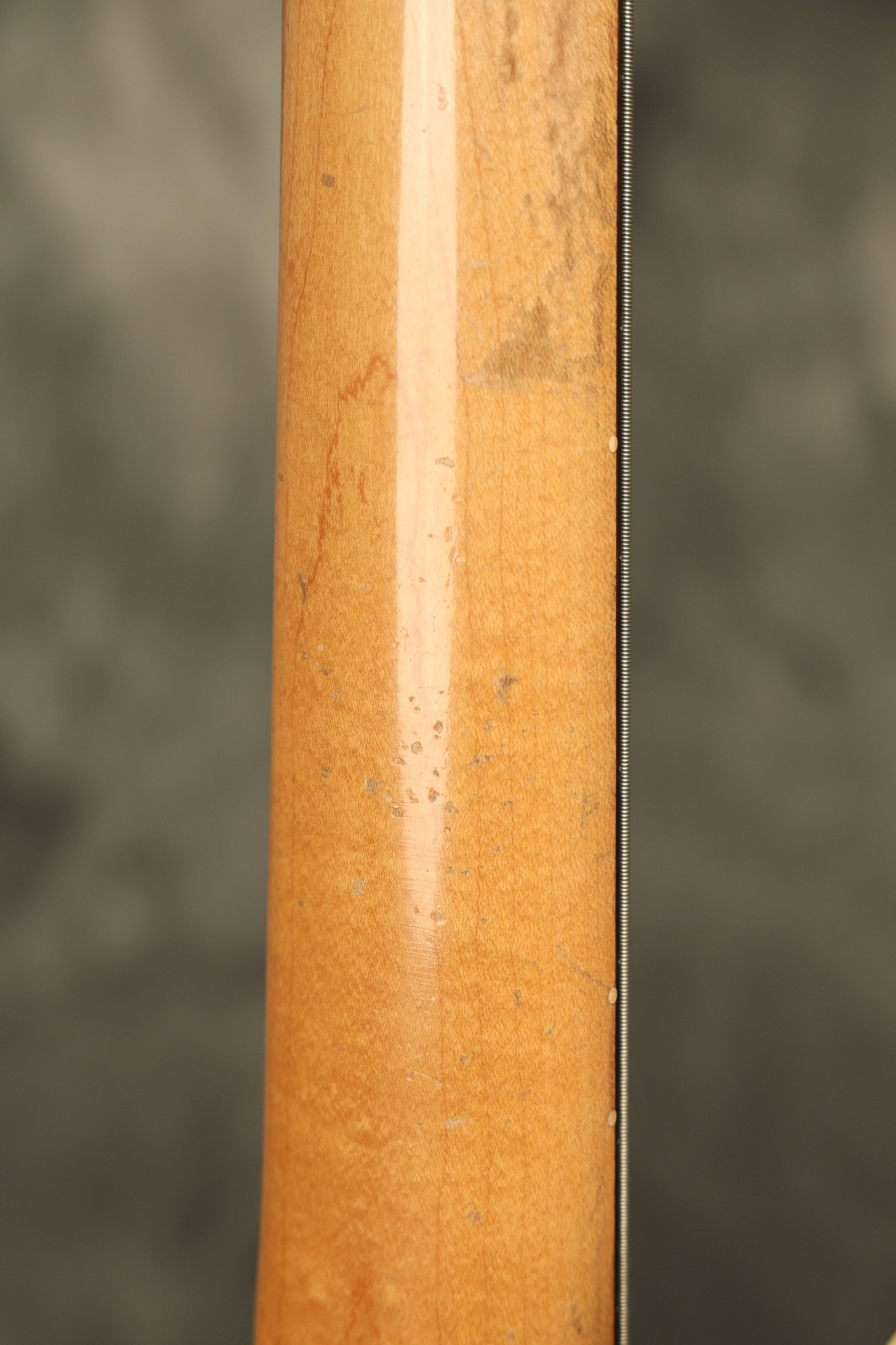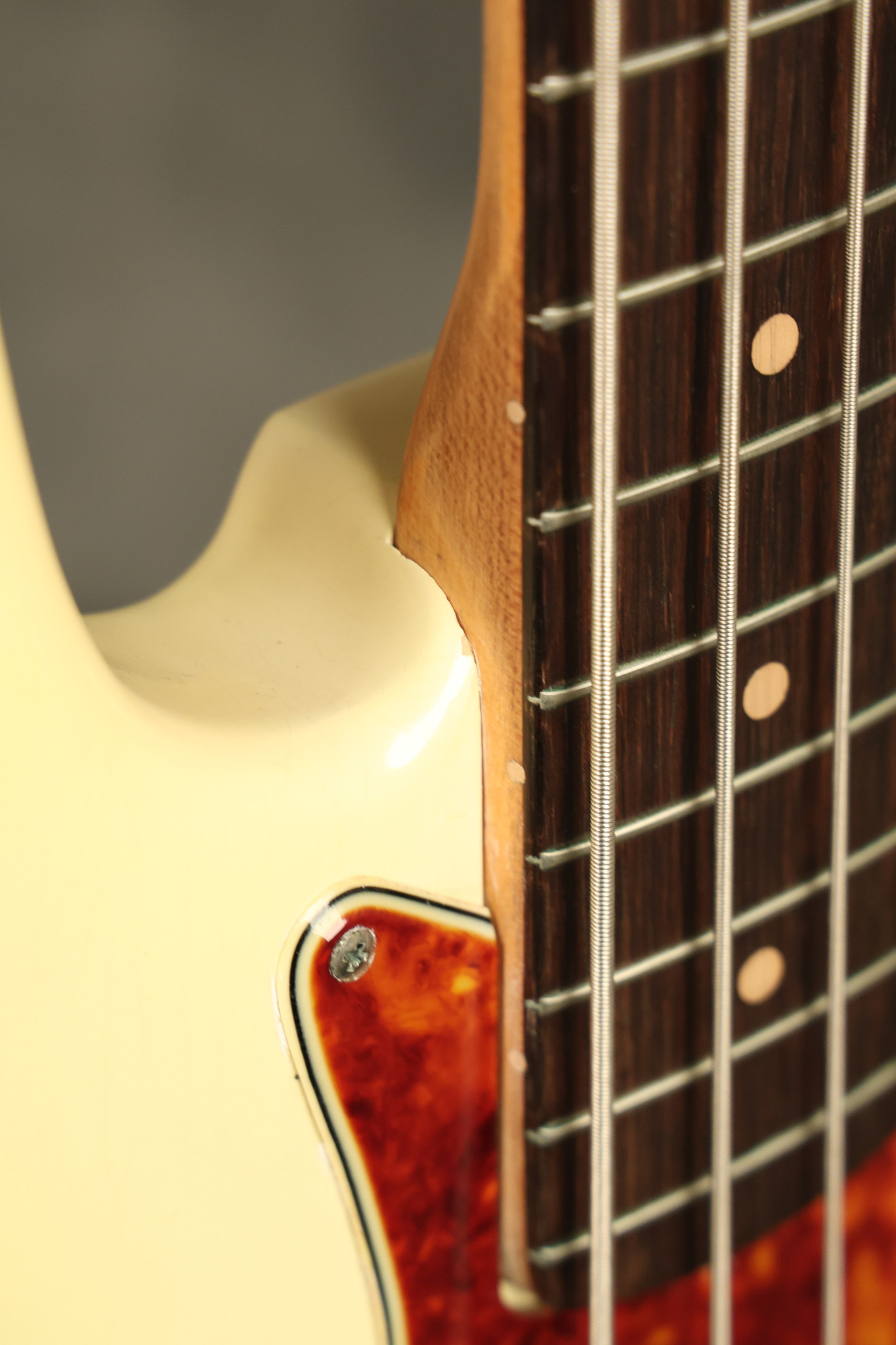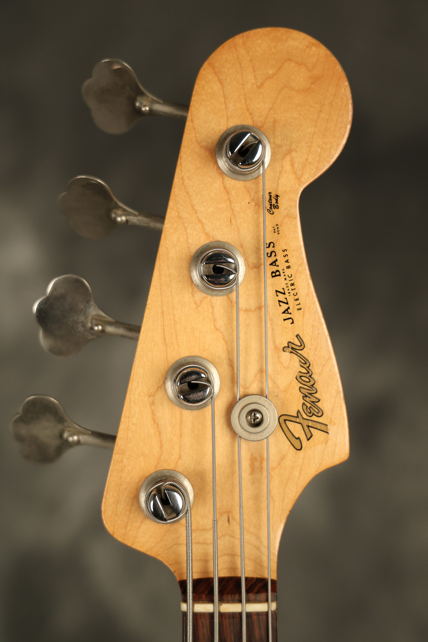 1961 Fender Jazz Bass "Stack Knob" with a body that has been refinished Blonde. Traces of original paint found underneath some parts indicate that it was originally Sunburst. The finish on the neck is original, but at the heel end of the neck the underside portion that is concealed in the neck pocket has been sanded. It has a great playing neck with great frets. Both pickups appear to have been rewound. All other parts appear to be original with the exception of one washer for one tuning key, one washer for one of the mutes and 3 of the 4 screws for the chrome covers. The original mutes are included along with the original Brown hardshell case. There are two areas on the back of the body where the finish was chipped/buffed out over the two factory dowels. There are nicks + dings, finish checking and other cosmetic wear including two faint rings in the finish of the back of the body. All electronics work and sound great, but the two original resistors have been removed. The weight is 8 lbs. 9 oz. without the covers.