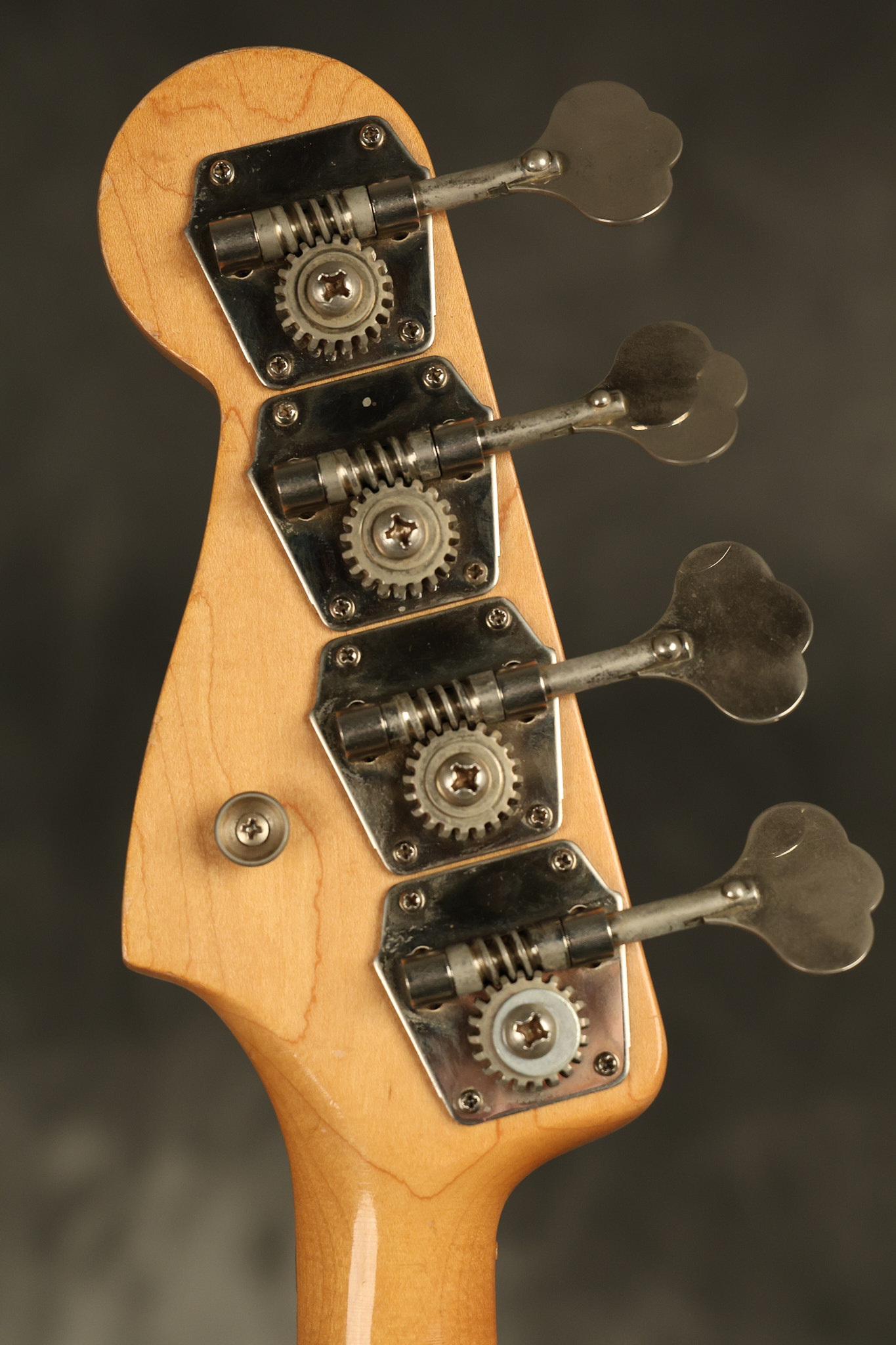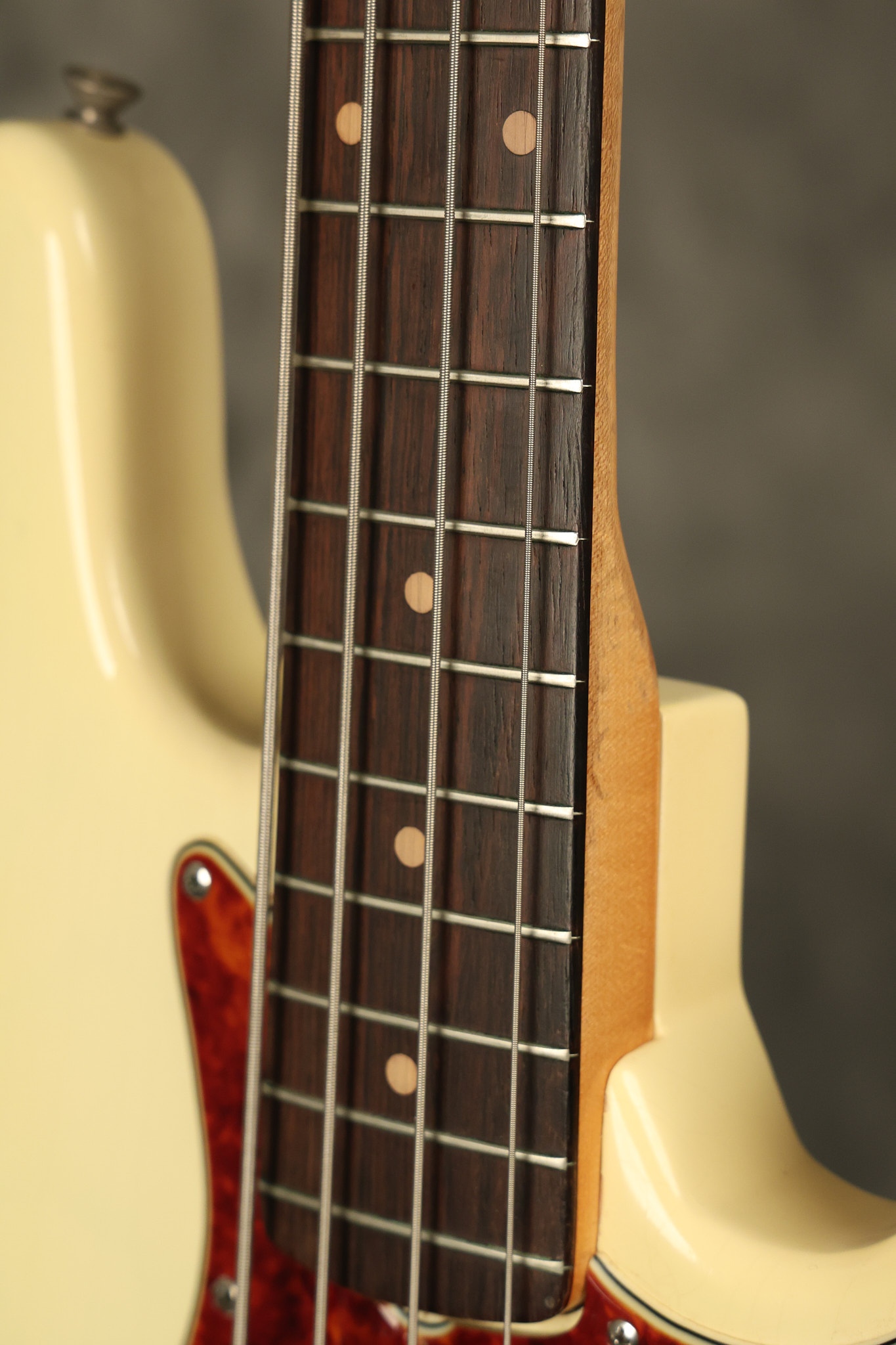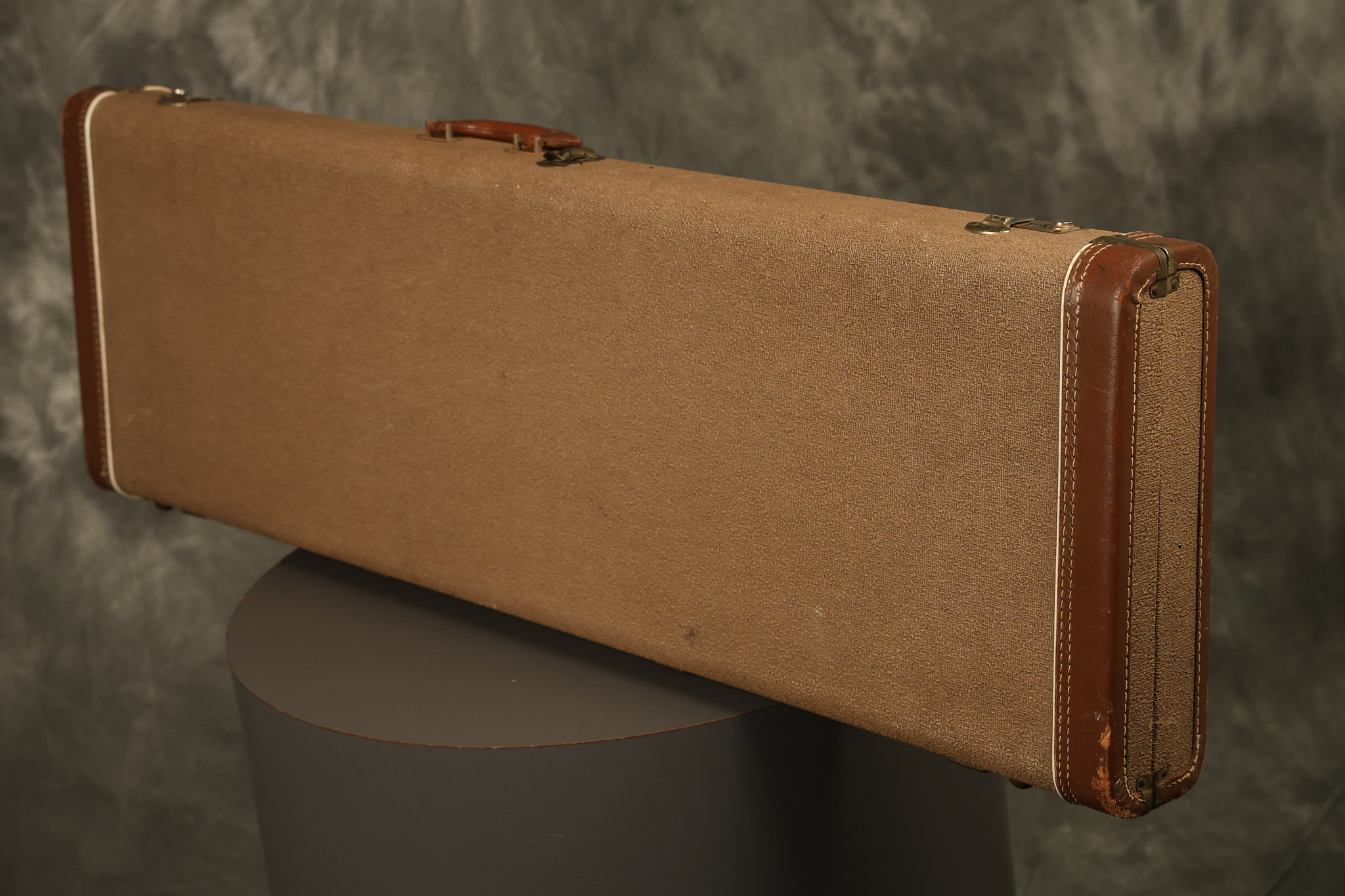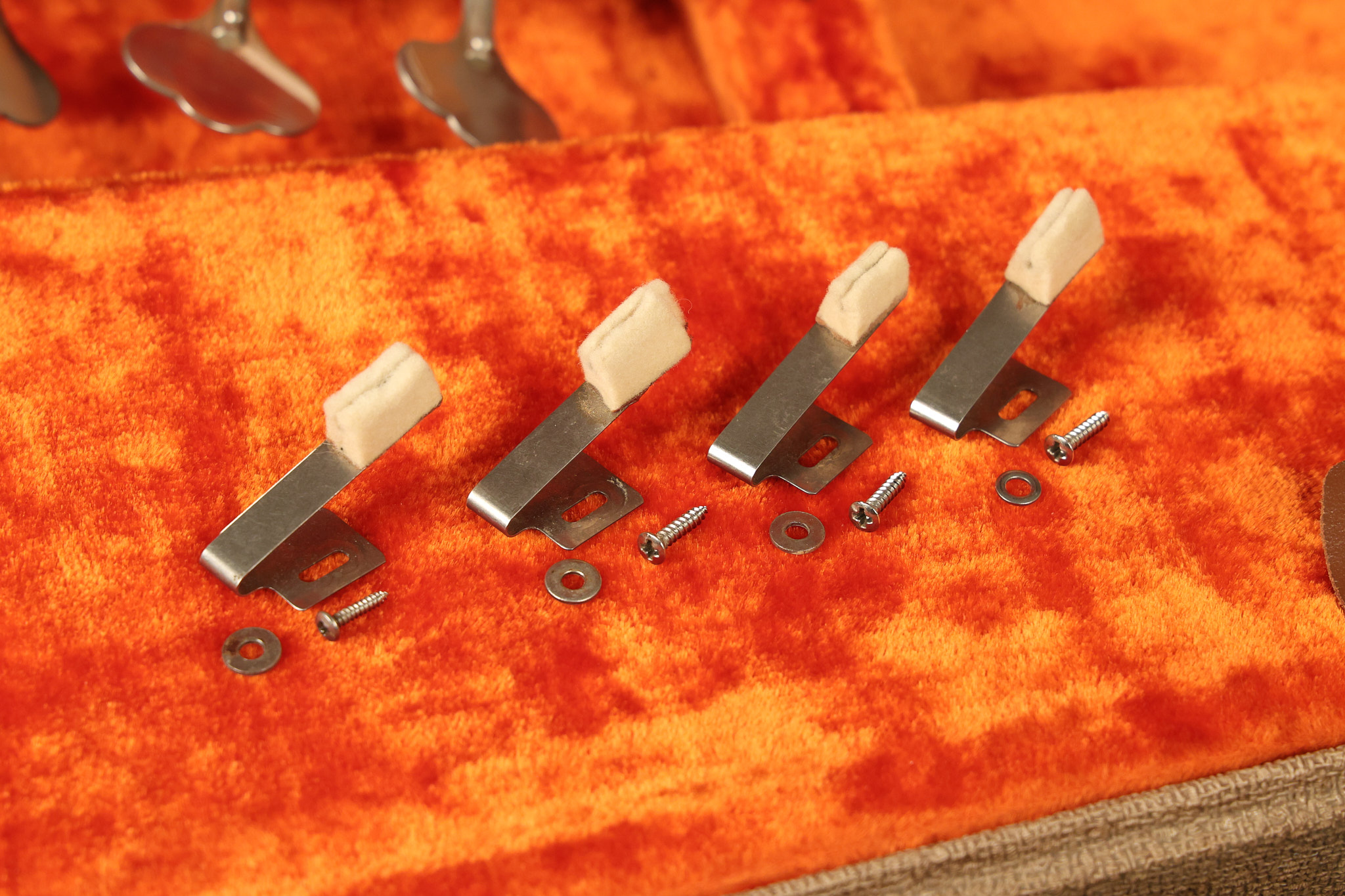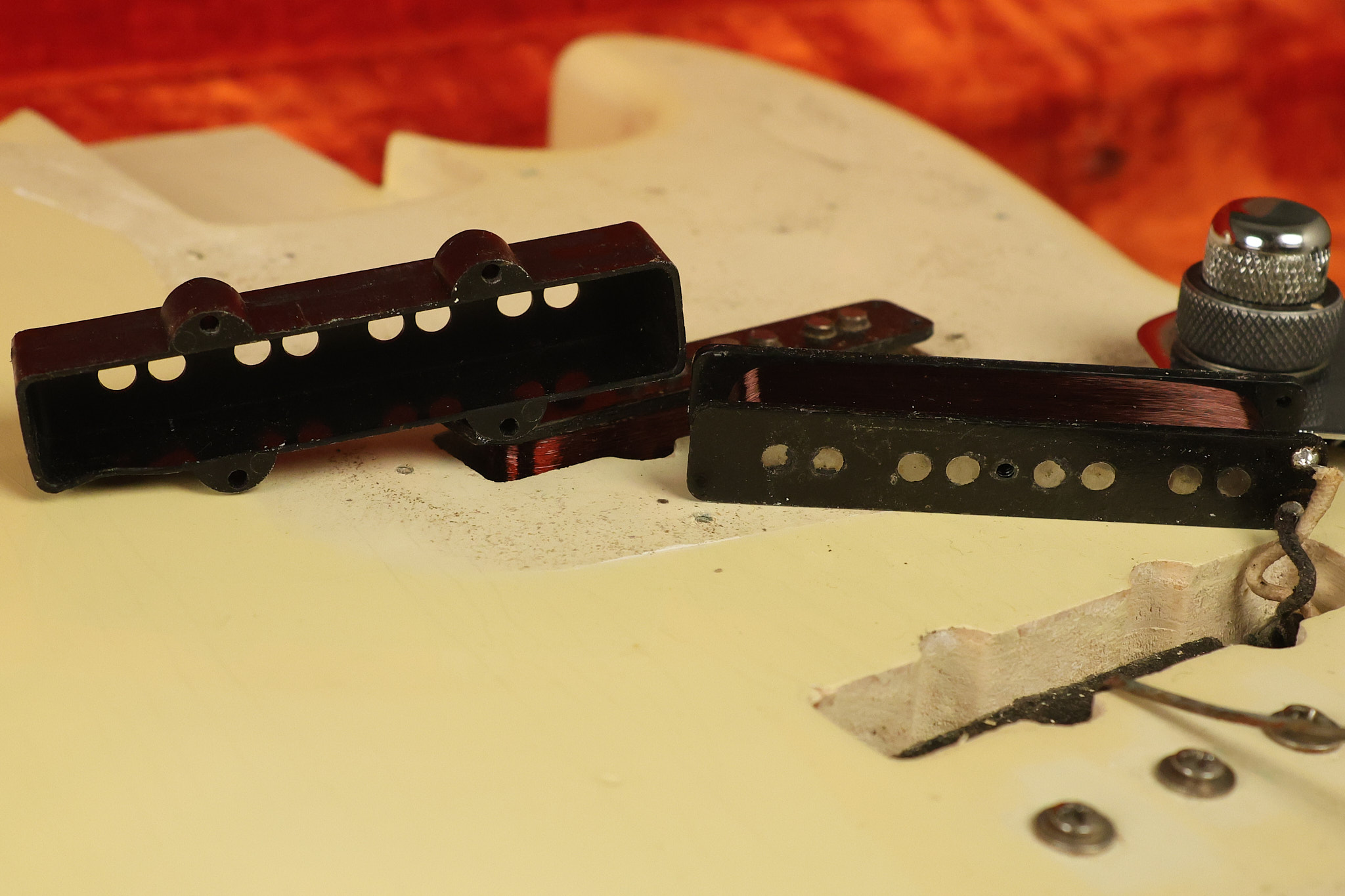 1961 Fender Jazz Bass "Stack Knob" with a body that has been refinished Blonde. Traces of original paint found underneath some parts indicate that it was originally Sunburst. The finish on the neck is original, but at the heel end of the neck the underside portion that is concealed in the neck pocket has been sanded. It has a great playing neck with great frets. Both pickups appear to have been rewound. All other parts appear to be original with the exception of one washer for one tuning key, one washer for one of the mutes and 3 of the 4 screws for the chrome covers. The original mutes are included along with the original Brown hardshell case. There are two areas on the back of the body where the finish was chipped/buffed out over the two factory dowels. There are nicks + dings, finish checking and other cosmetic wear including two faint rings in the finish of the back of the body. All electronics work and sound great, but the two original resistors have been removed. The weight is 8 lbs. 9 oz. without the covers.
