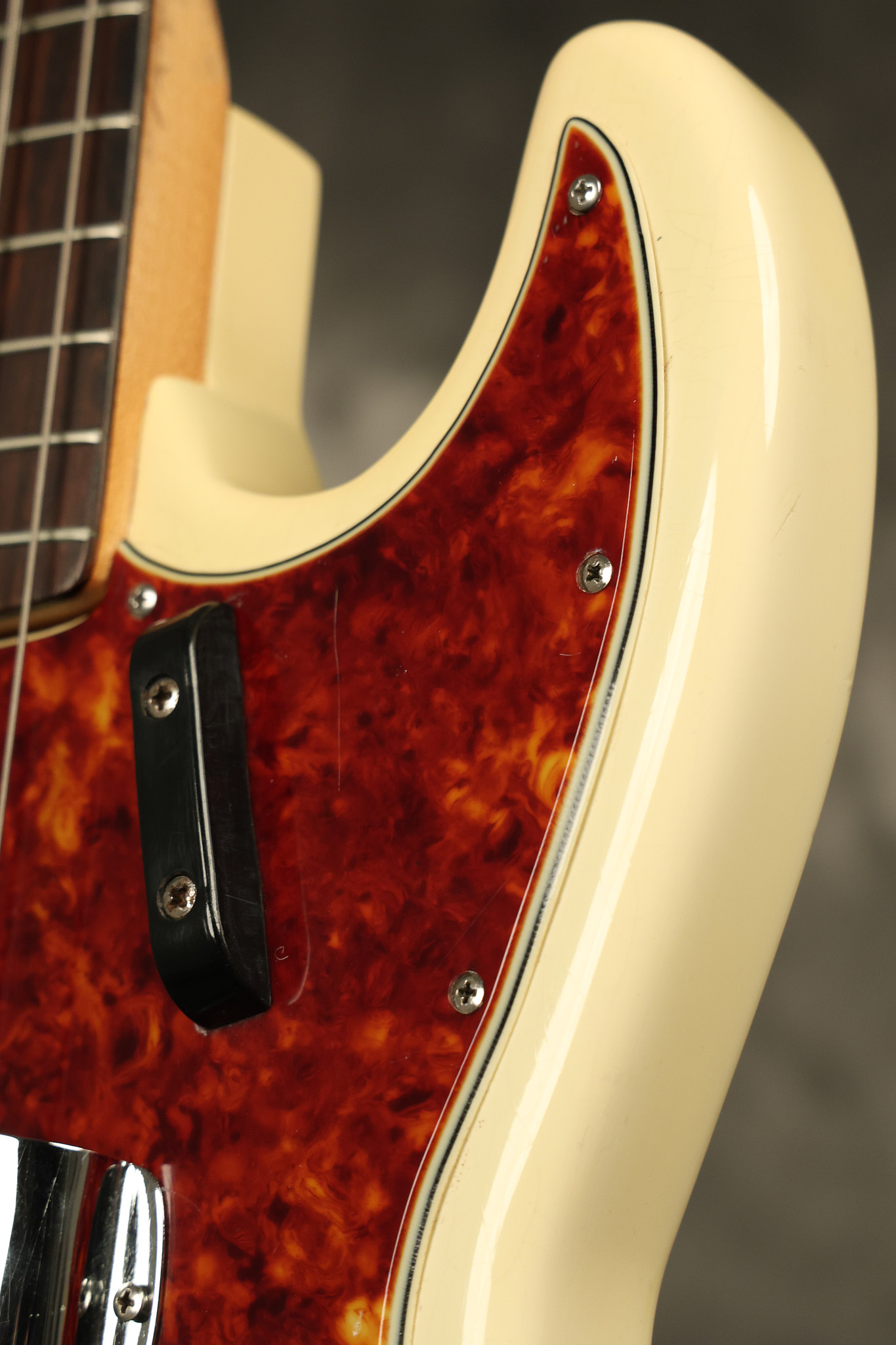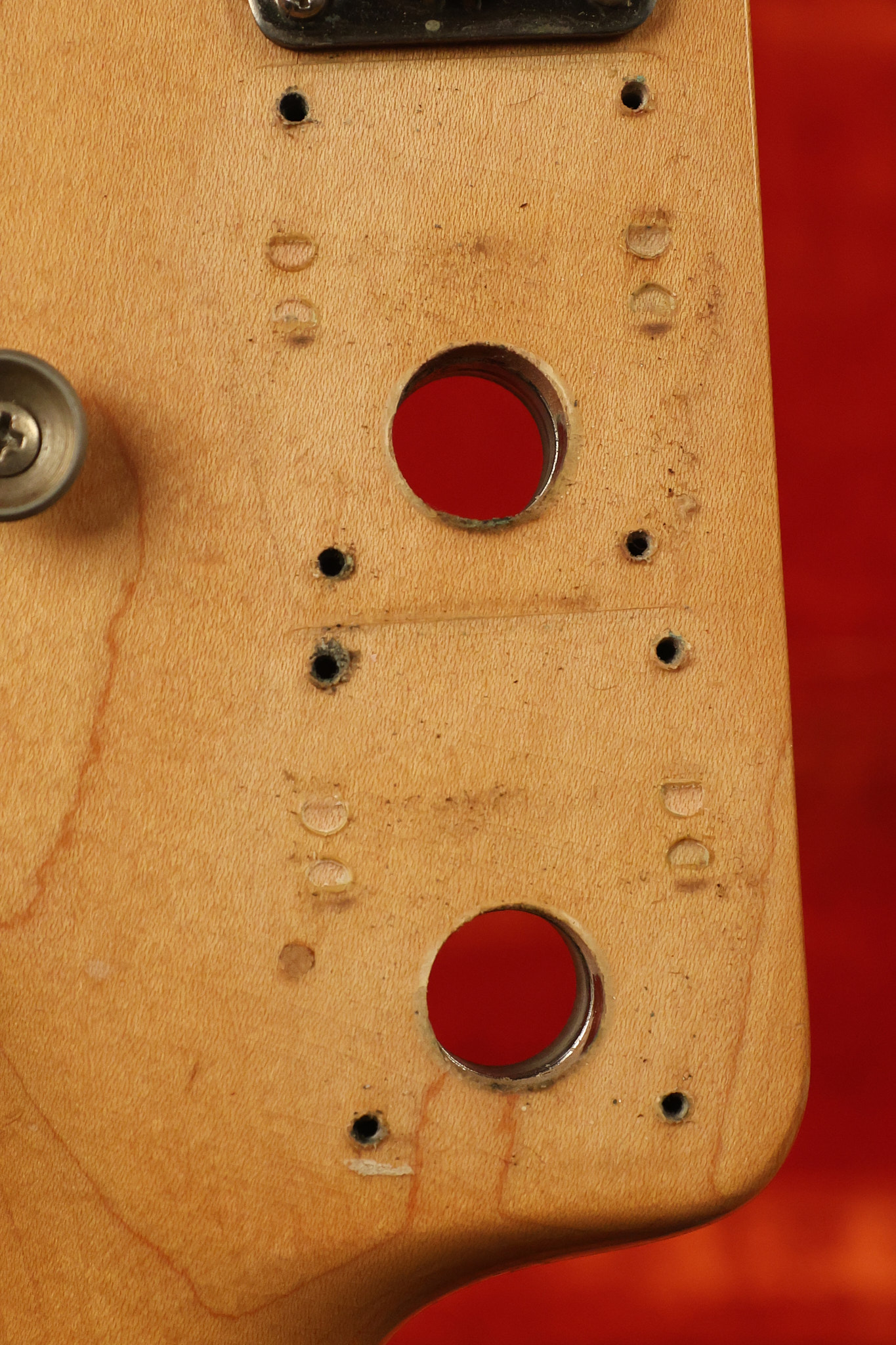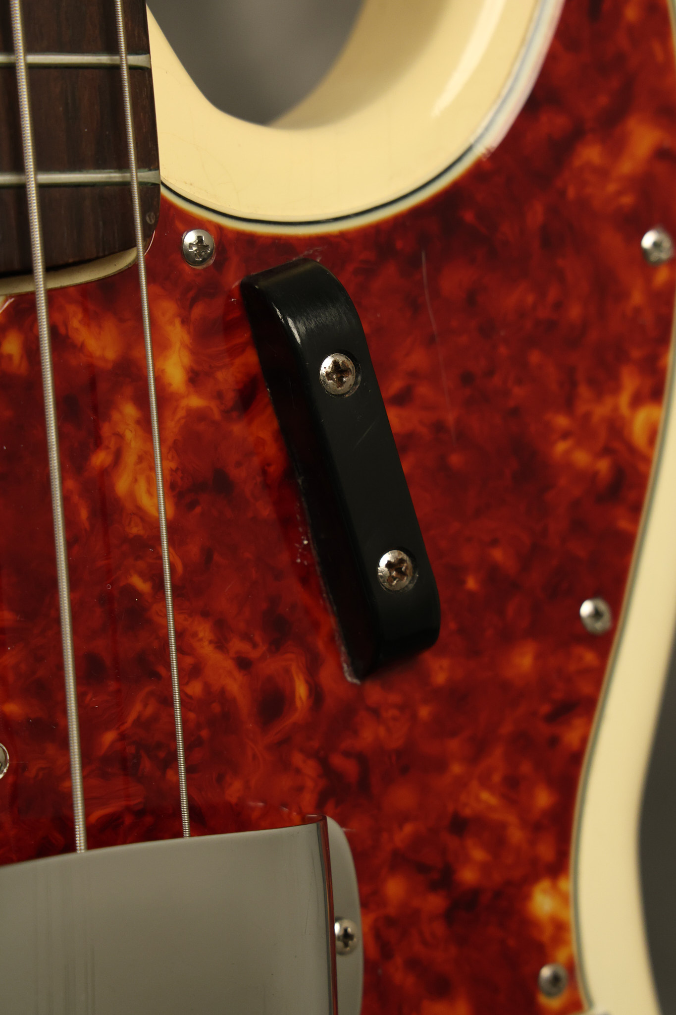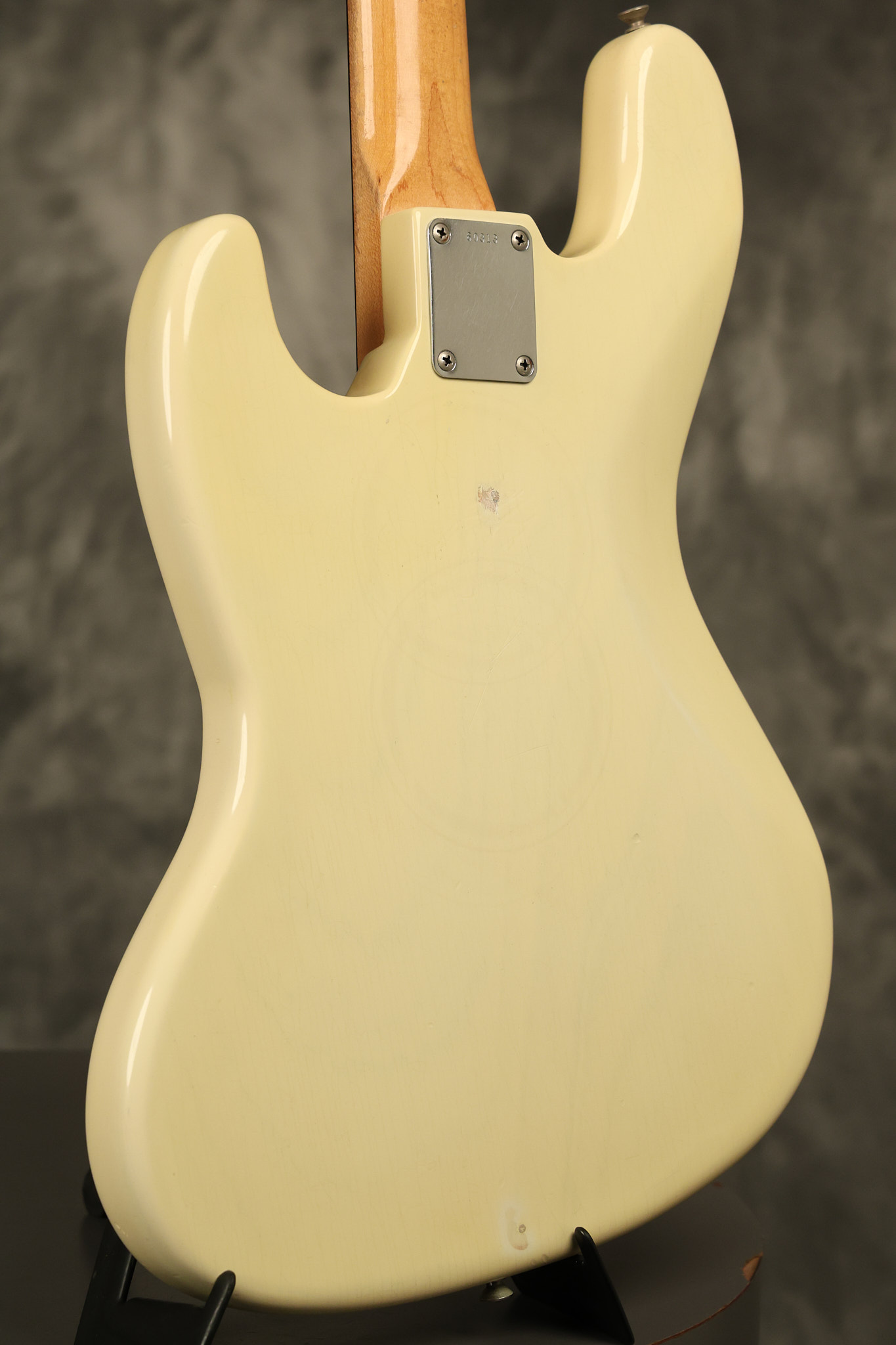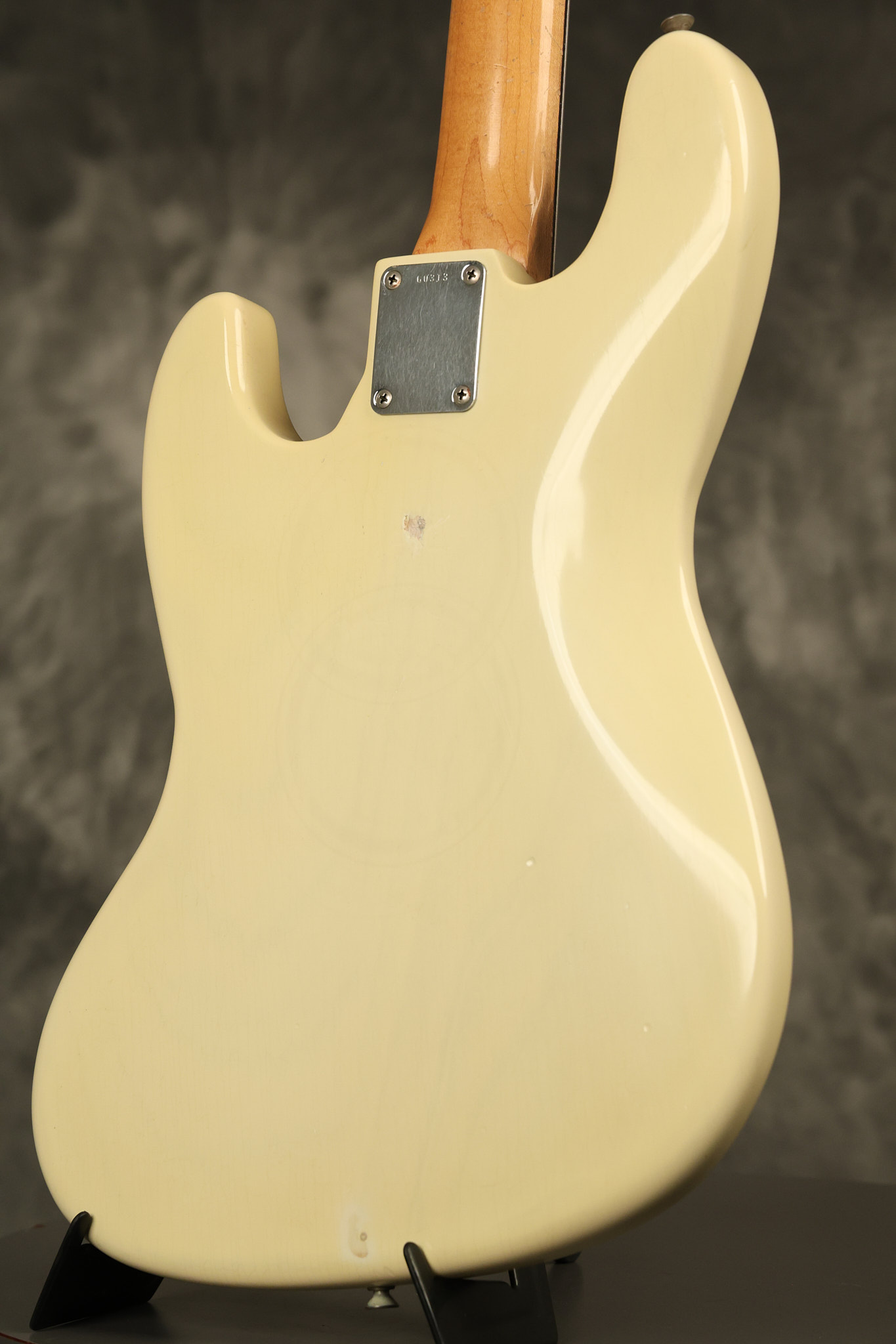 1961 Fender Jazz Bass "Stack Knob" with a body that has been refinished Blonde. Traces of original paint found underneath some parts indicate that it was originally Sunburst. The finish on the neck is original, but at the heel end of the neck the underside portion that is concealed in the neck pocket has been sanded. It has a great playing neck with great frets. Both pickups appear to have been rewound. All other parts appear to be original with the exception of one washer for one tuning key, one washer for one of the mutes and 3 of the 4 screws for the chrome covers. The original mutes are included along with the original Brown hardshell case. There are two areas on the back of the body where the finish was chipped/buffed out over the two factory dowels. There are nicks + dings, finish checking and other cosmetic wear including two faint rings in the finish of the back of the body. All electronics work and sound great, but the two original resistors have been removed. The weight is 8 lbs. 9 oz. without the covers.