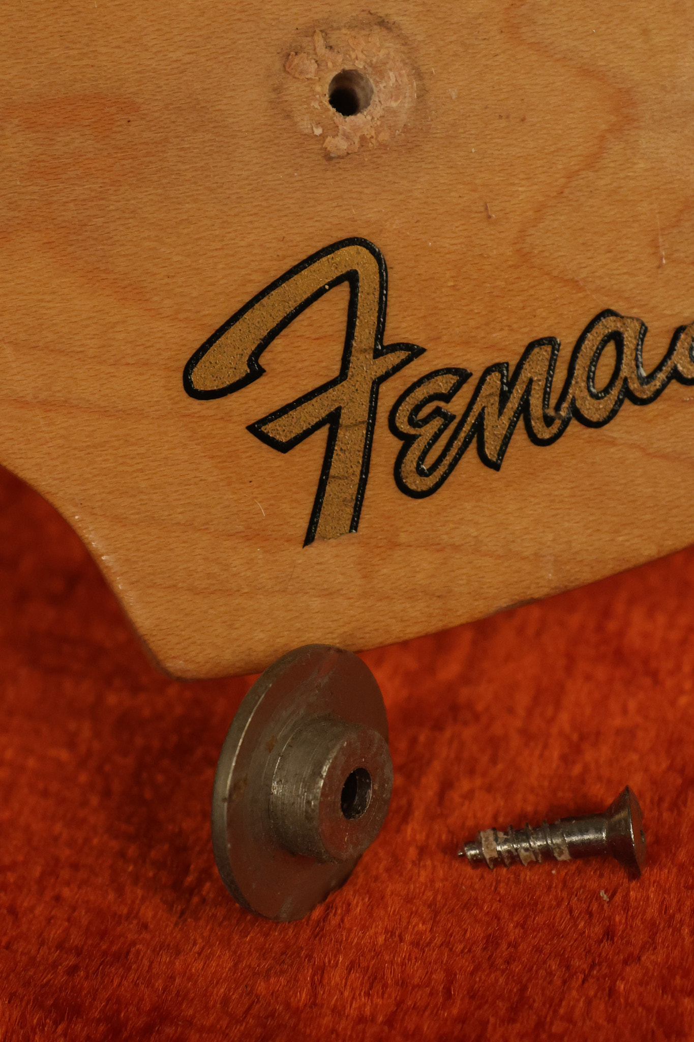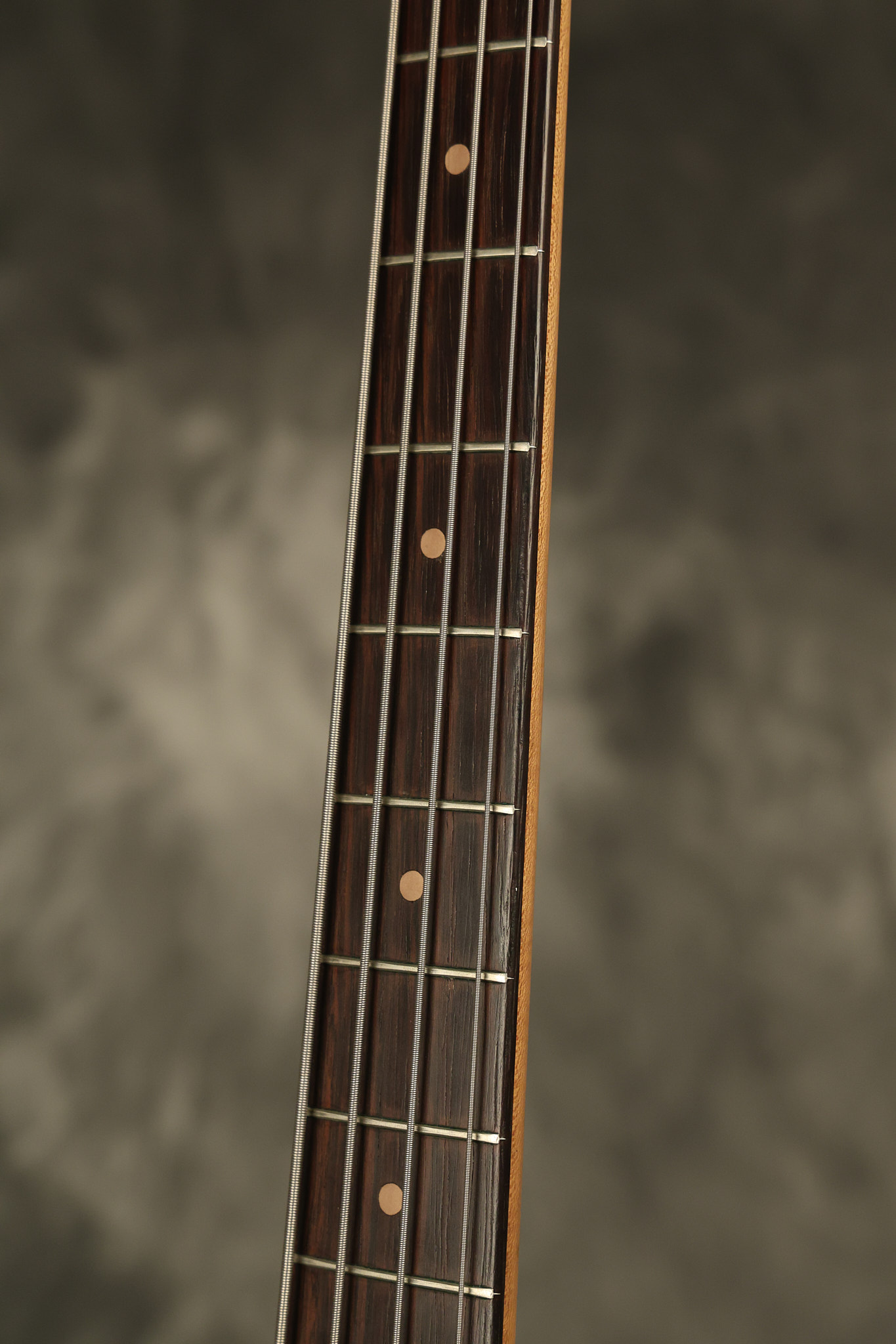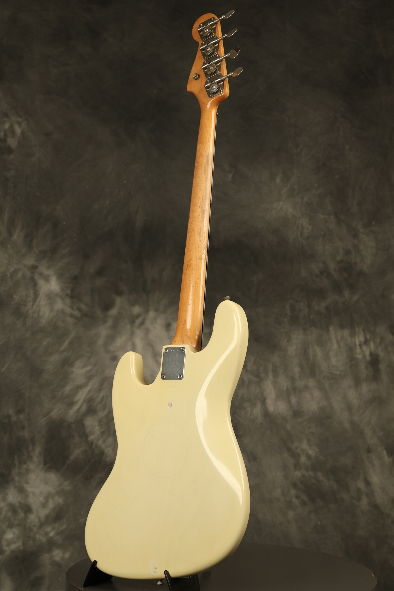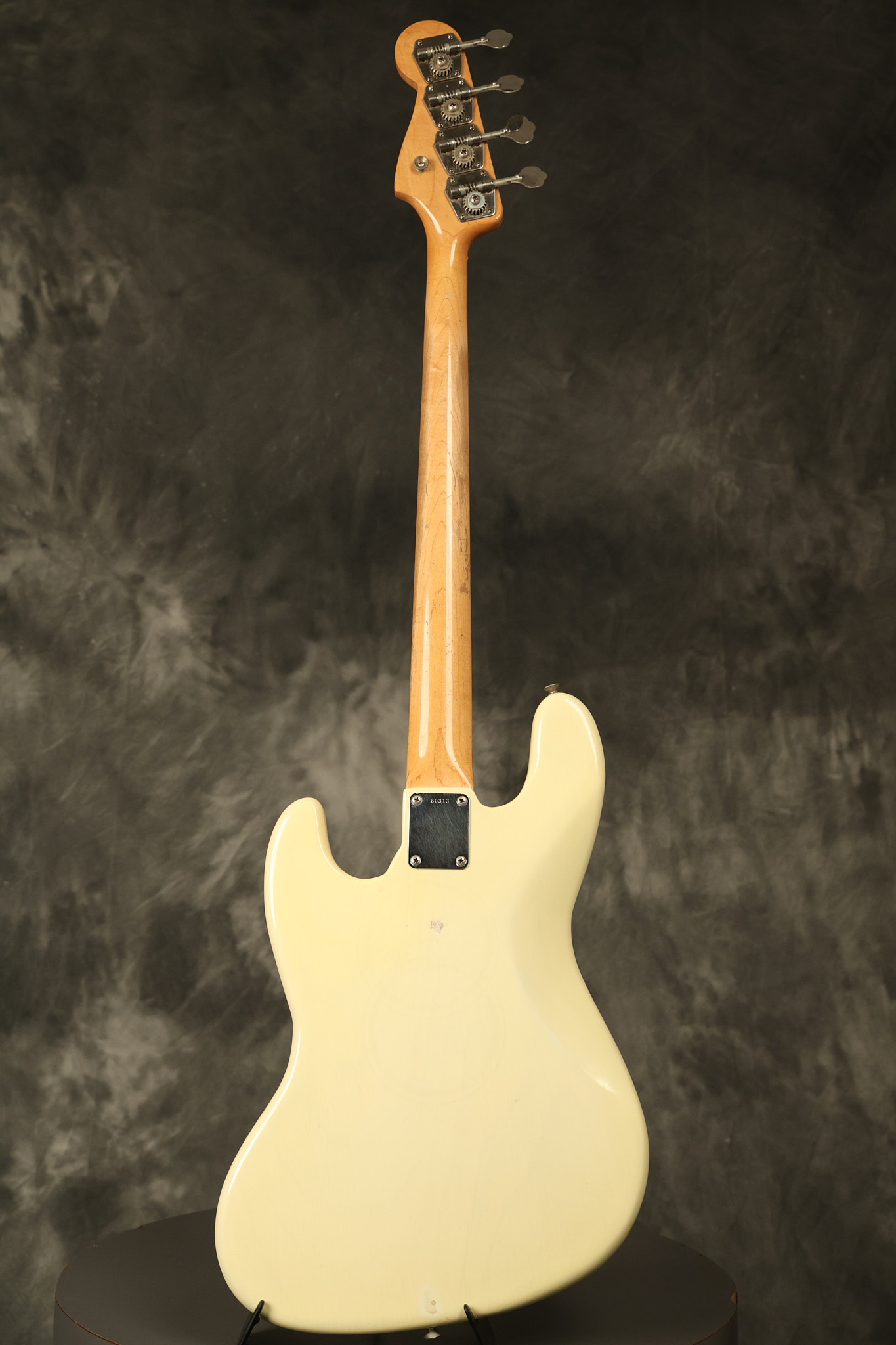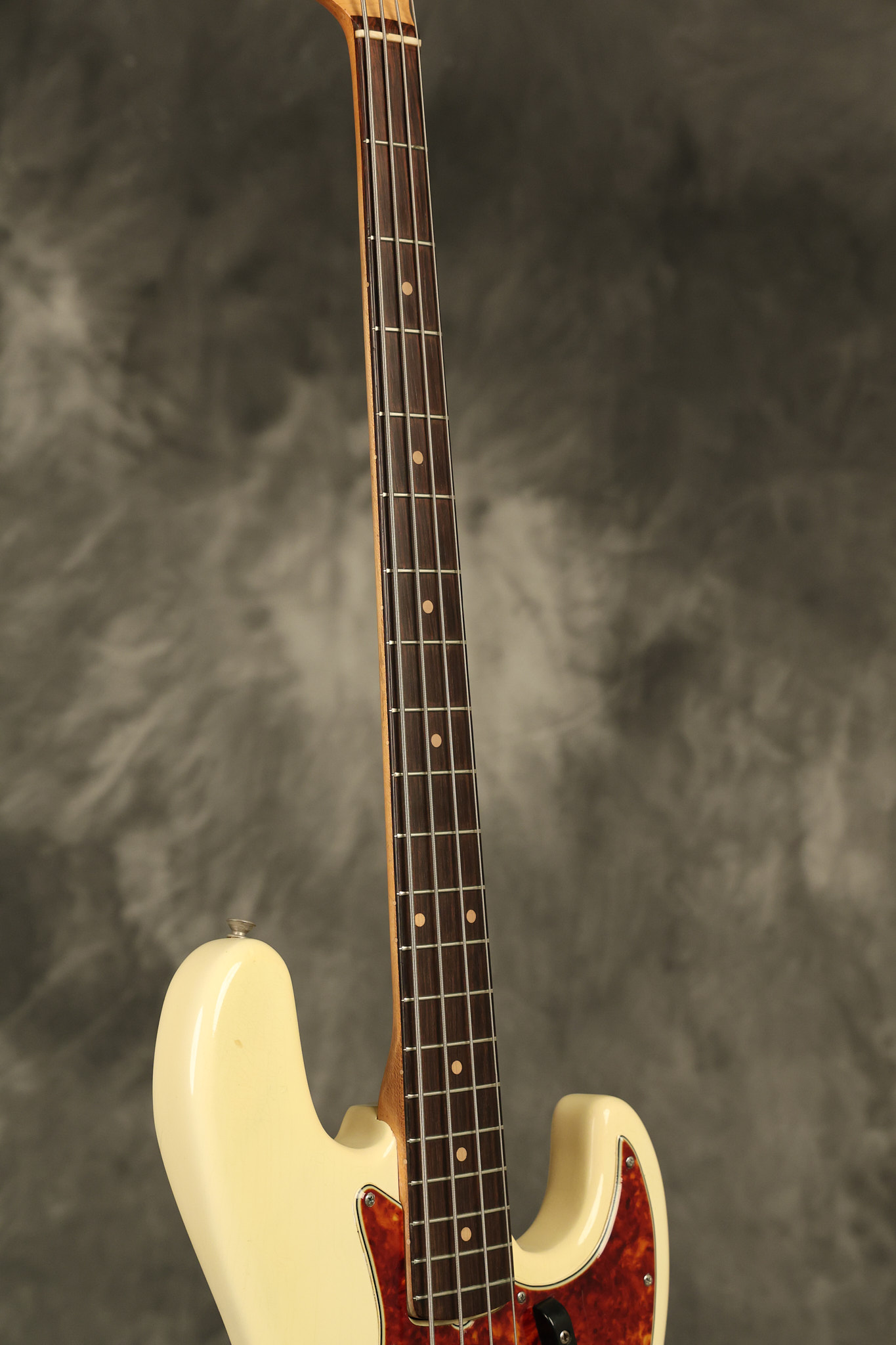 1961 Fender Jazz Bass "Stack Knob" with a body that has been refinished Blonde. Traces of original paint found underneath some parts indicate that it was originally Sunburst. The finish on the neck is original, but at the heel end of the neck the underside portion that is concealed in the neck pocket has been sanded. It has a great playing neck with great frets. Both pickups appear to have been rewound. All other parts appear to be original with the exception of one washer for one tuning key, one washer for one of the mutes and 3 of the 4 screws for the chrome covers. The original mutes are included along with the original Brown hardshell case. There are two areas on the back of the body where the finish was chipped/buffed out over the two factory dowels. There are nicks + dings, finish checking and other cosmetic wear including two faint rings in the finish of the back of the body. All electronics work and sound great, but the two original resistors have been removed. The weight is 8 lbs. 9 oz. without the covers.