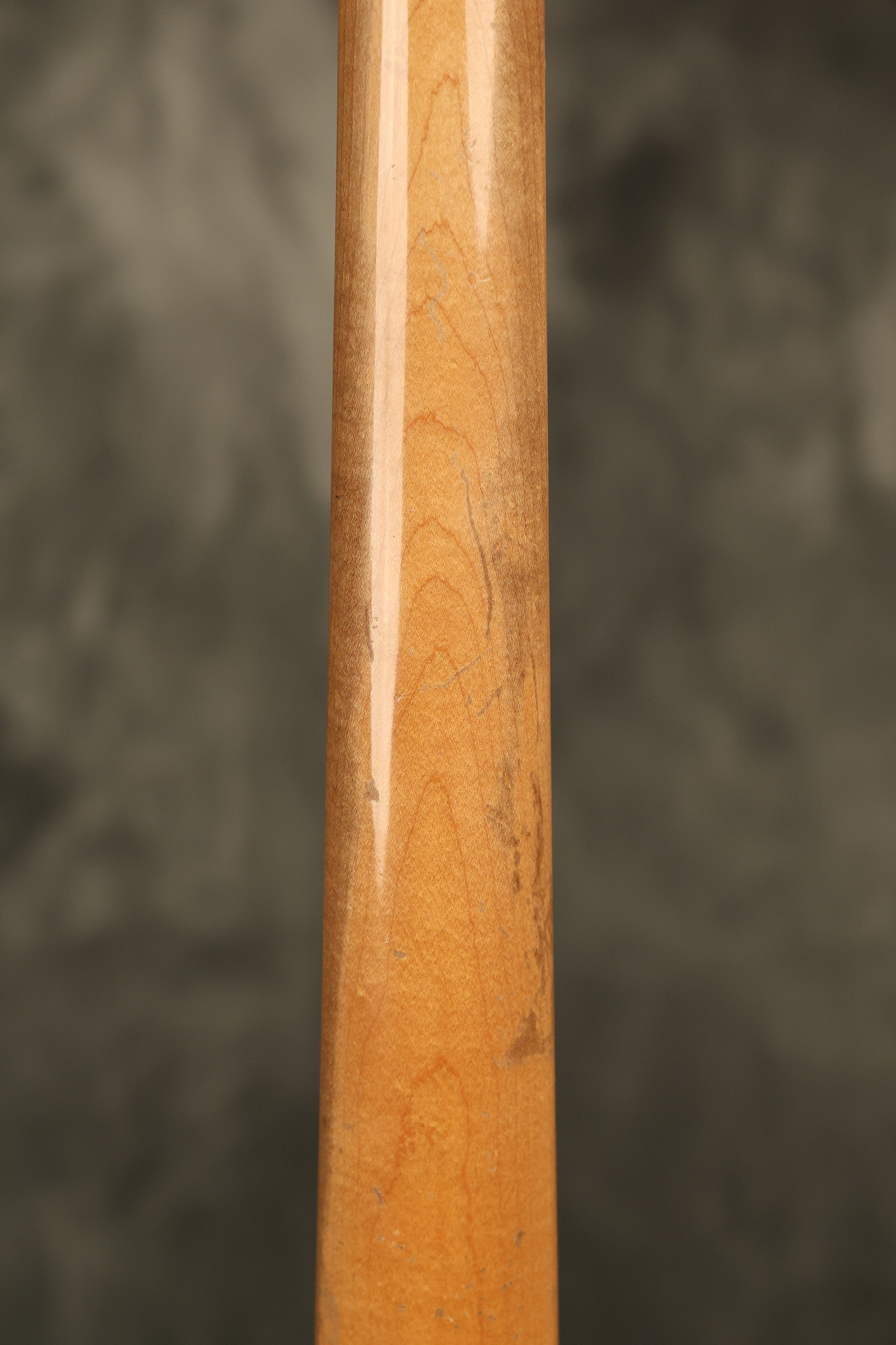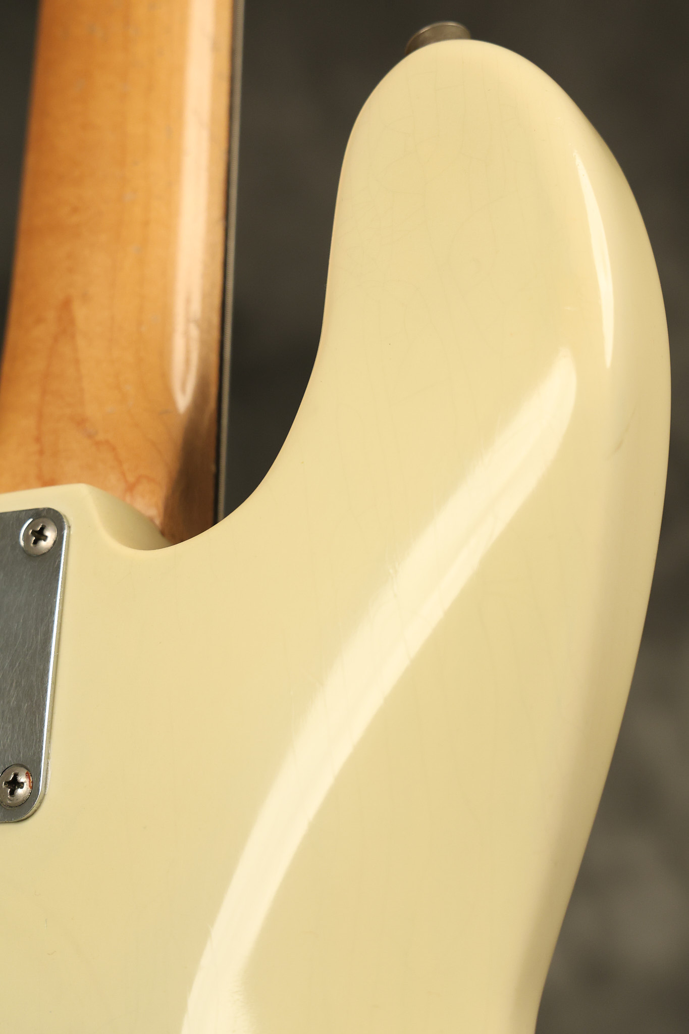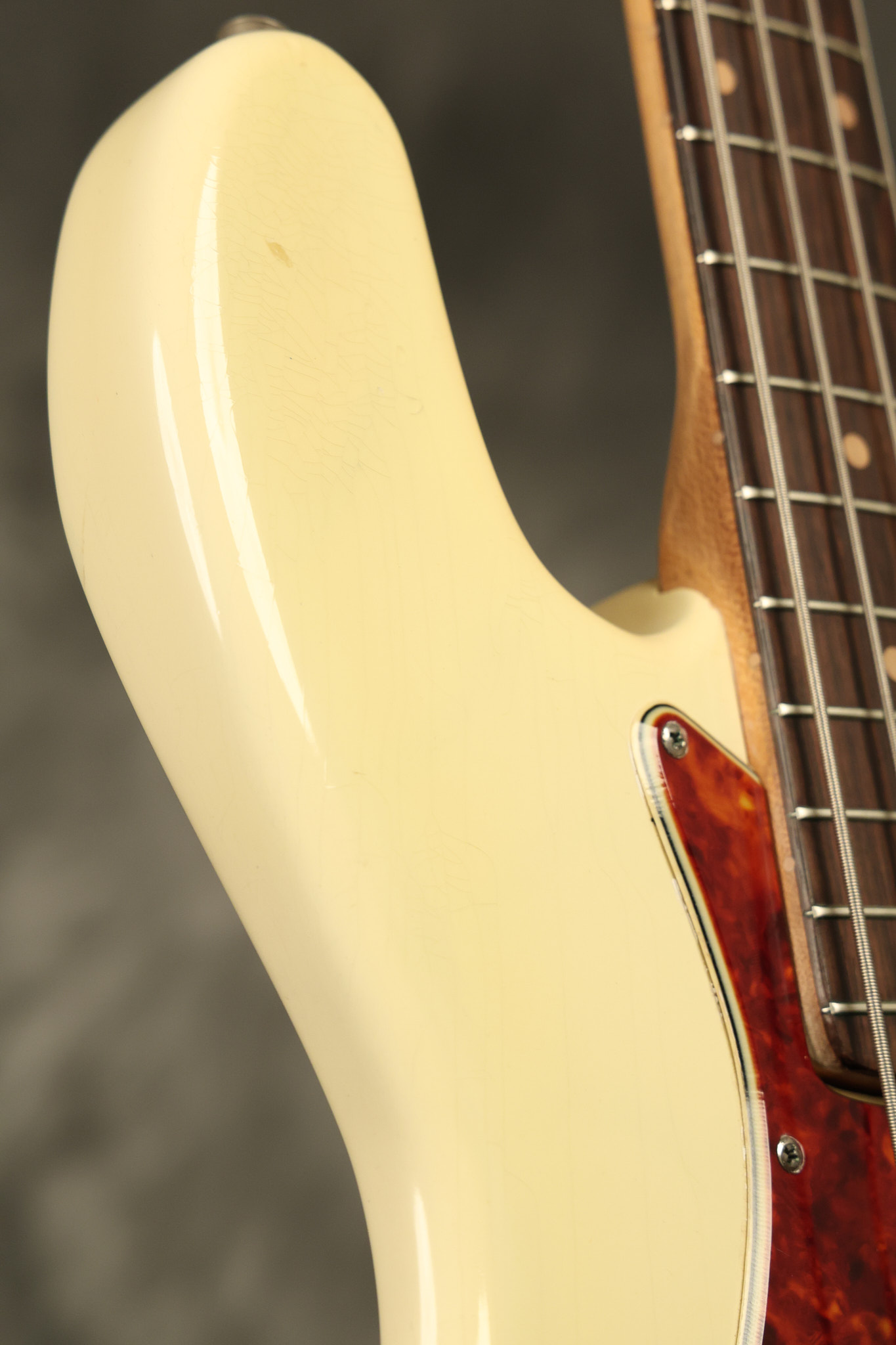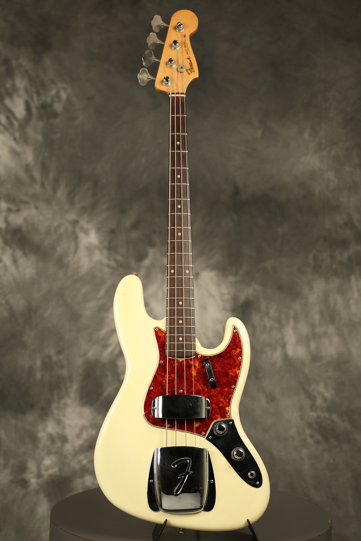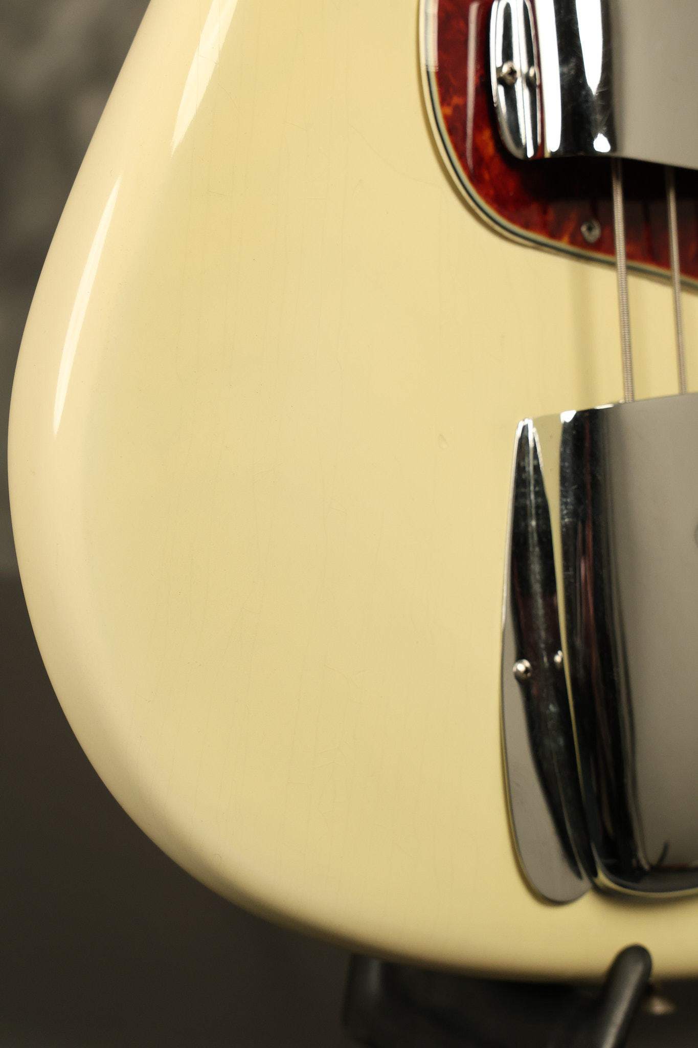 1961 Fender Jazz Bass "Stack Knob" with a body that has been refinished Blonde. Traces of original paint found underneath some parts indicate that it was originally Sunburst. The finish on the neck is original, but at the heel end of the neck the underside portion that is concealed in the neck pocket has been sanded. It has a great playing neck with great frets. Both pickups appear to have been rewound. All other parts appear to be original with the exception of one washer for one tuning key, one washer for one of the mutes and 3 of the 4 screws for the chrome covers. The original mutes are included along with the original Brown hardshell case. There are two areas on the back of the body where the finish was chipped/buffed out over the two factory dowels. There are nicks + dings, finish checking and other cosmetic wear including two faint rings in the finish of the back of the body. All electronics work and sound great, but the two original resistors have been removed. The weight is 8 lbs. 9 oz. without the covers.