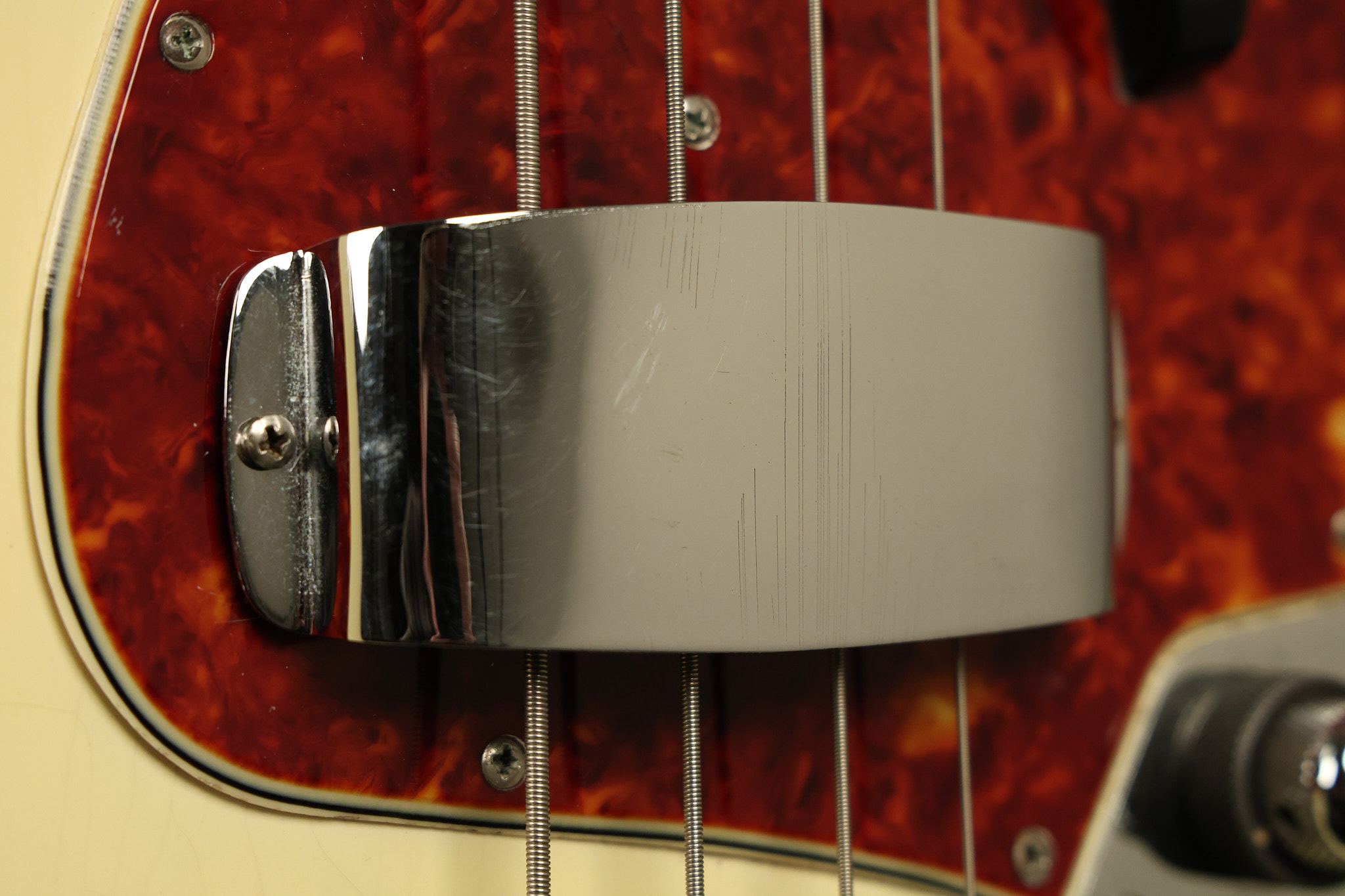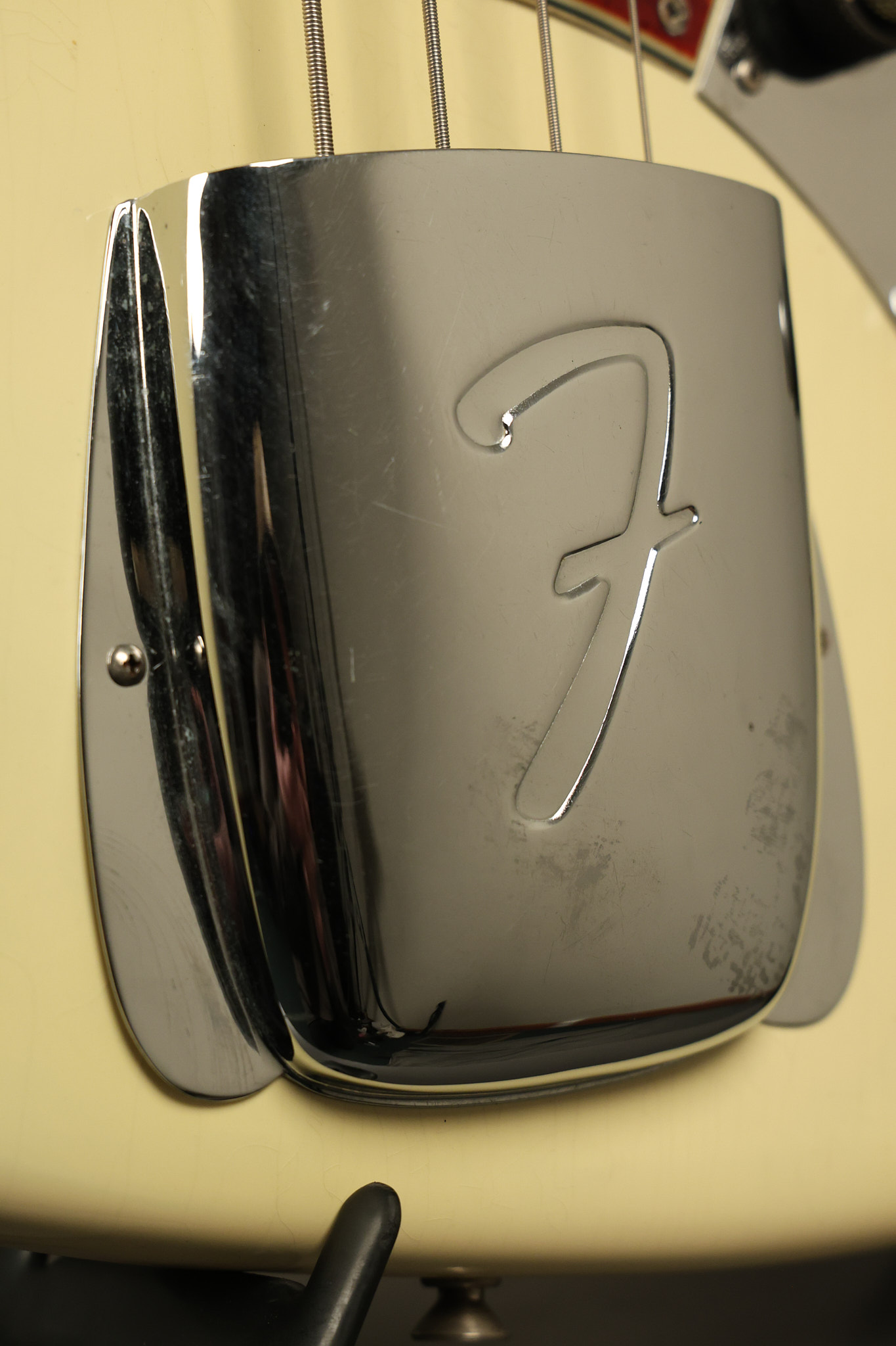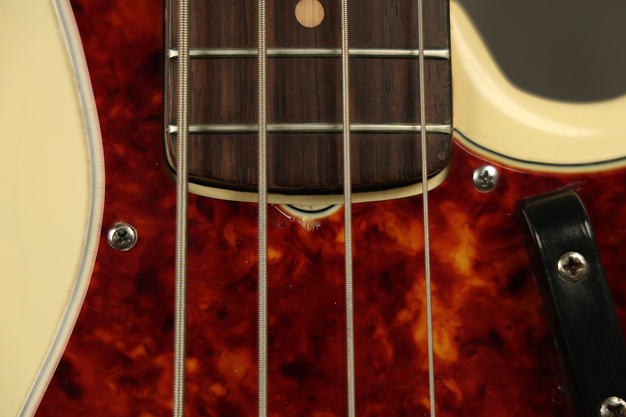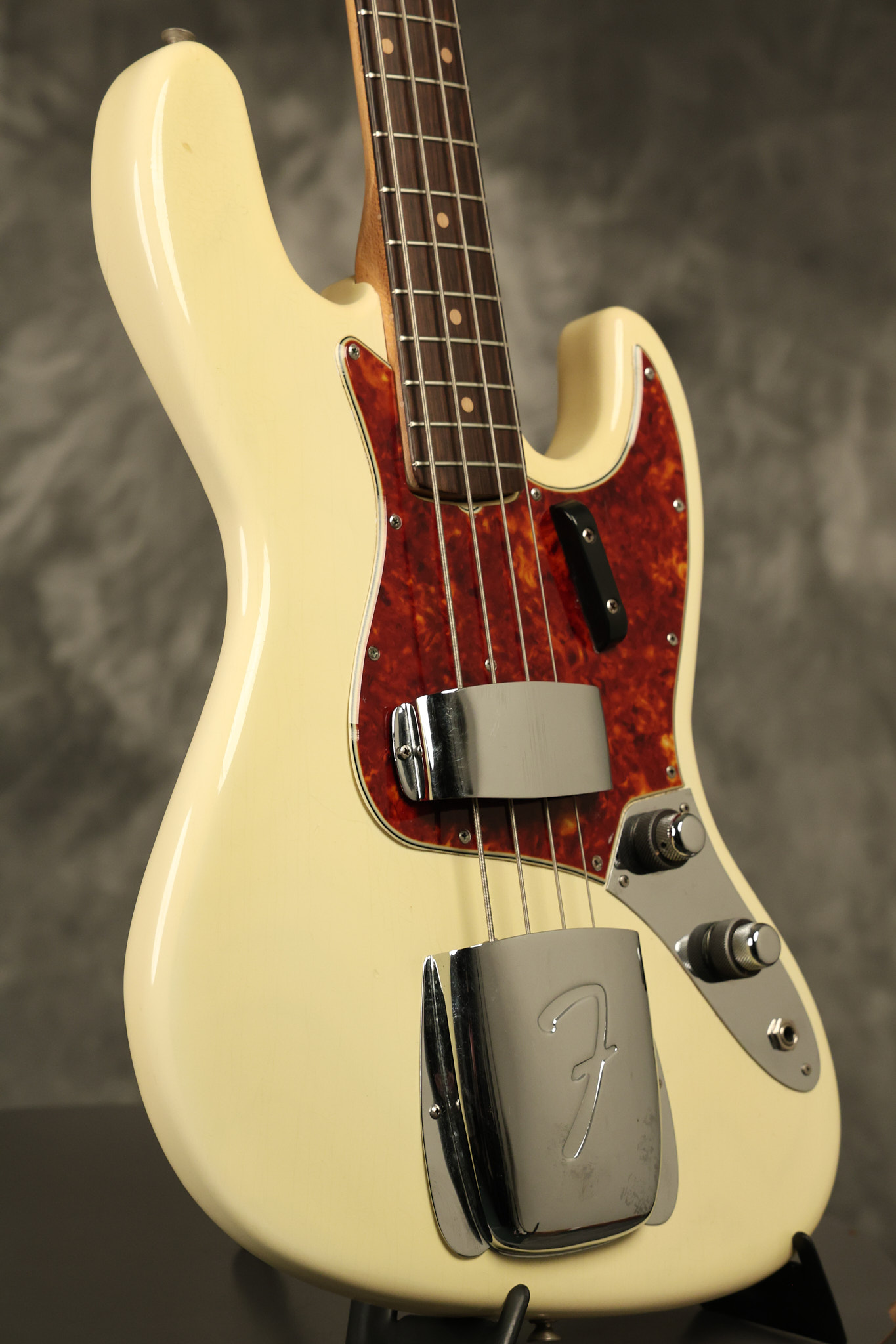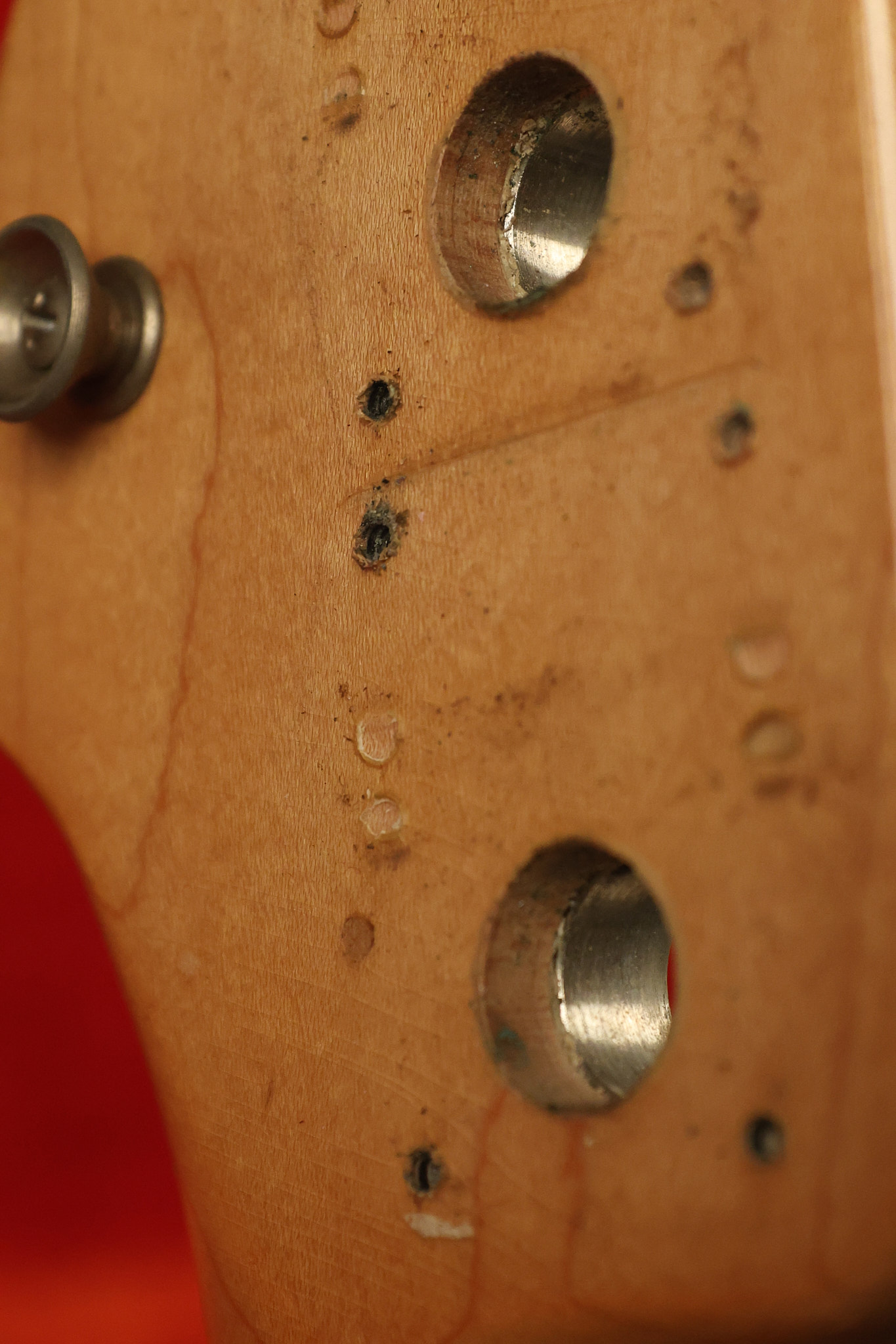 1961 Fender Jazz Bass "Stack Knob" with a body that has been refinished Blonde. Traces of original paint found underneath some parts indicate that it was originally Sunburst. The finish on the neck is original, but at the heel end of the neck the underside portion that is concealed in the neck pocket has been sanded. It has a great playing neck with great frets. Both pickups appear to have been rewound. All other parts appear to be original with the exception of one washer for one tuning key, one washer for one of the mutes and 3 of the 4 screws for the chrome covers. The original mutes are included along with the original Brown hardshell case. There are two areas on the back of the body where the finish was chipped/buffed out over the two factory dowels. There are nicks + dings, finish checking and other cosmetic wear including two faint rings in the finish of the back of the body. All electronics work and sound great, but the two original resistors have been removed. The weight is 8 lbs. 9 oz. without the covers.