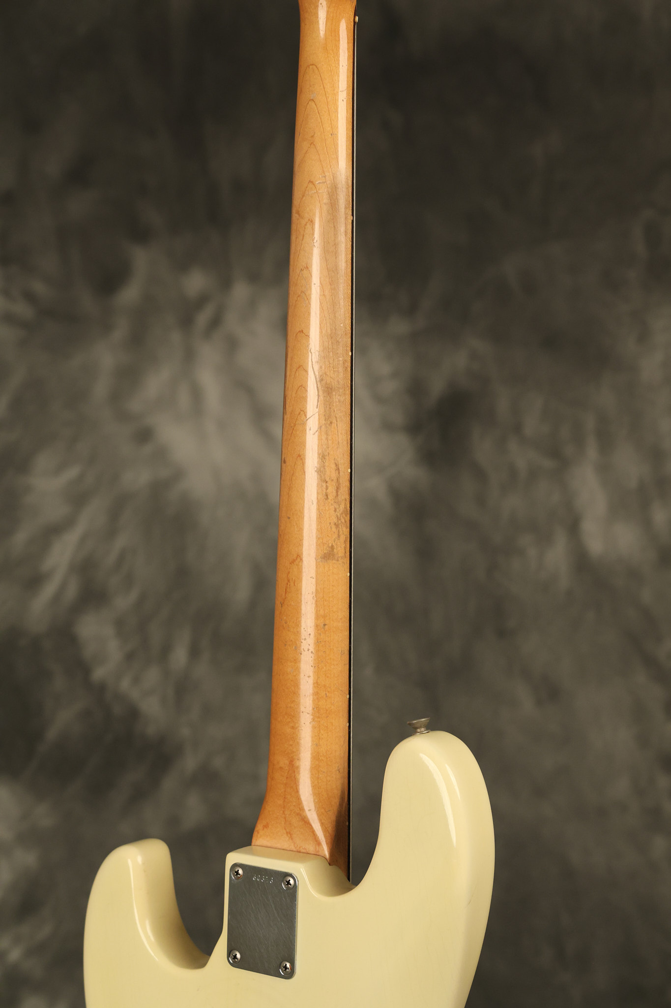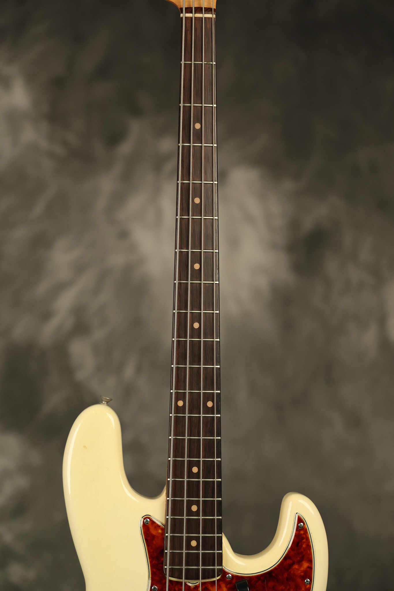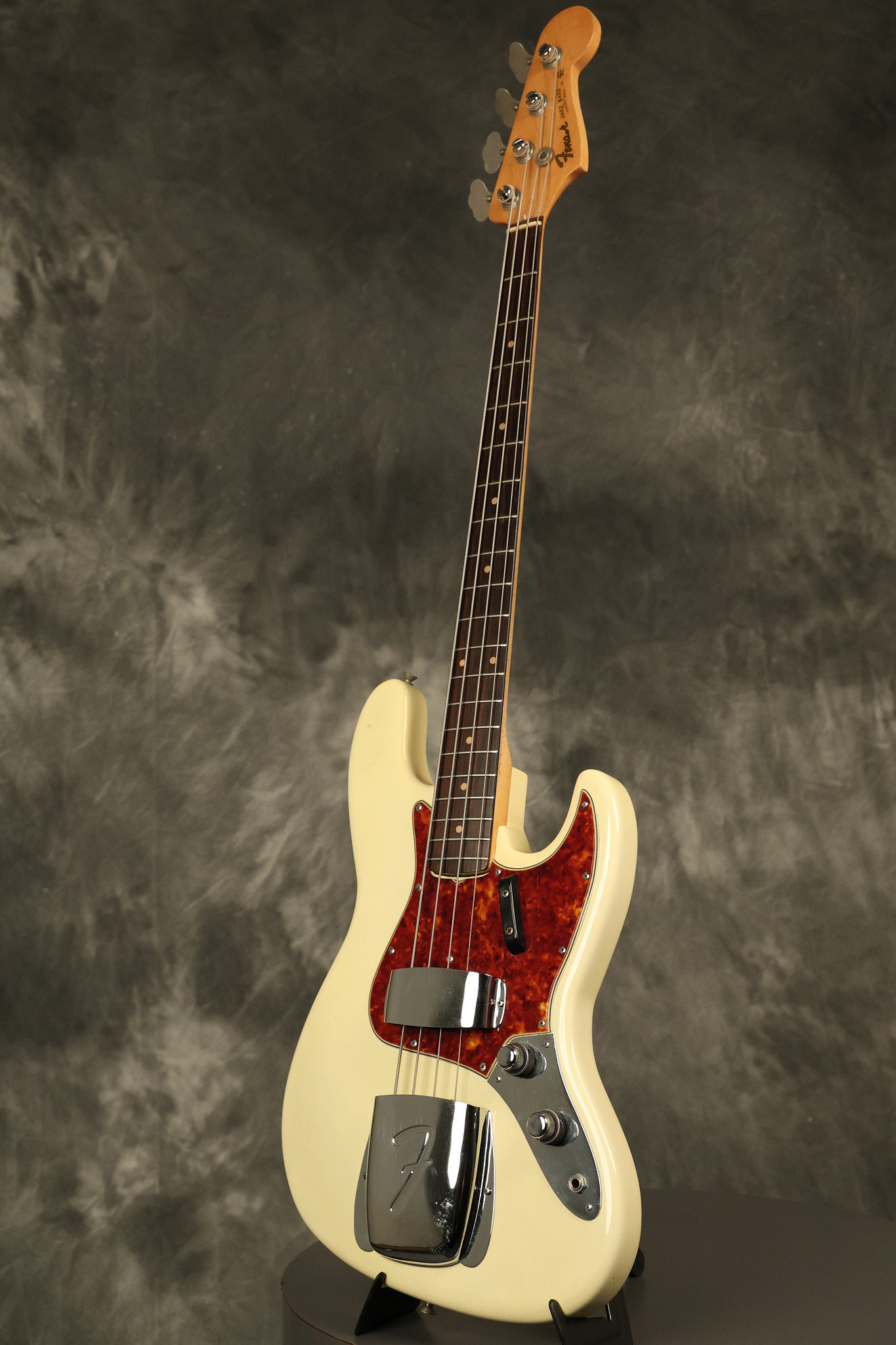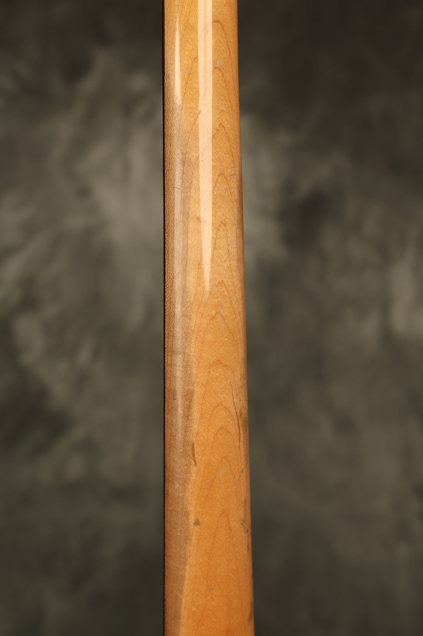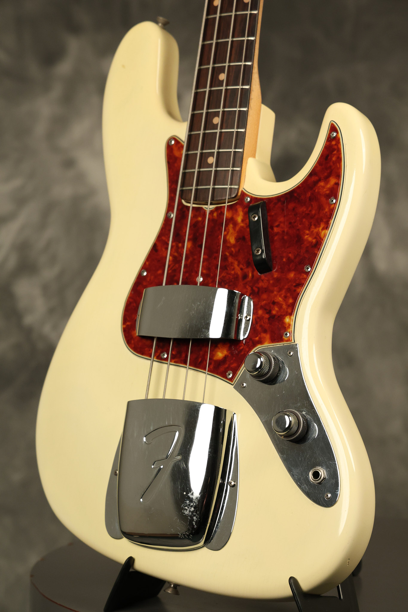 1961 Fender Jazz Bass "Stack Knob" with a body that has been refinished Blonde. Traces of original paint found underneath some parts indicate that it was originally Sunburst. The finish on the neck is original, but at the heel end of the neck the underside portion that is concealed in the neck pocket has been sanded. It has a great playing neck with great frets. Both pickups appear to have been rewound. All other parts appear to be original with the exception of one washer for one tuning key, one washer for one of the mutes and 3 of the 4 screws for the chrome covers. The original mutes are included along with the original Brown hardshell case. There are two areas on the back of the body where the finish was chipped/buffed out over the two factory dowels. There are nicks + dings, finish checking and other cosmetic wear including two faint rings in the finish of the back of the body. All electronics work and sound great, but the two original resistors have been removed. The weight is 8 lbs. 9 oz. without the covers.