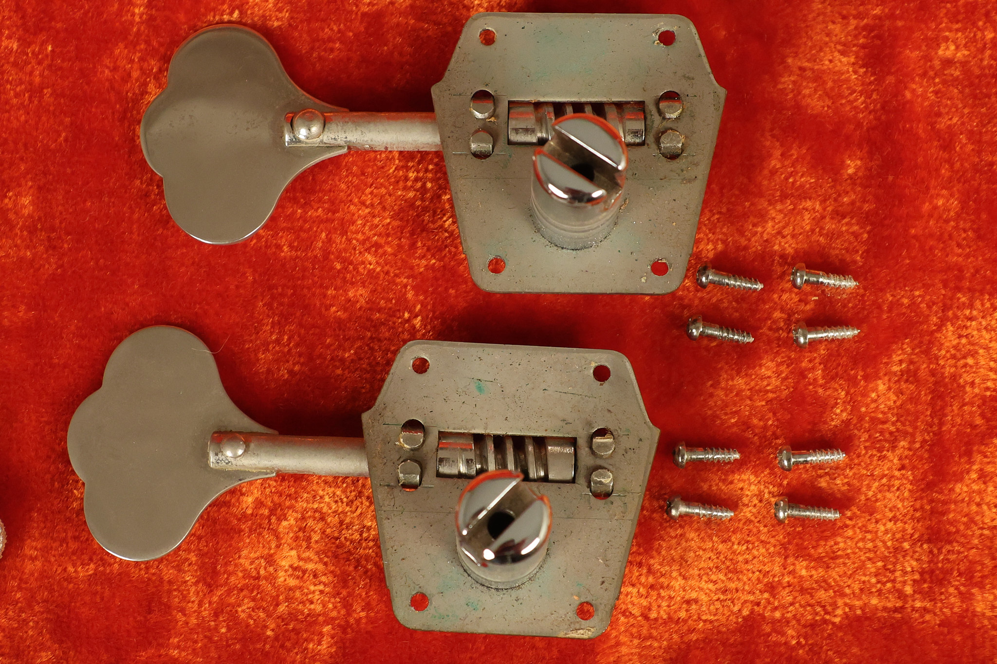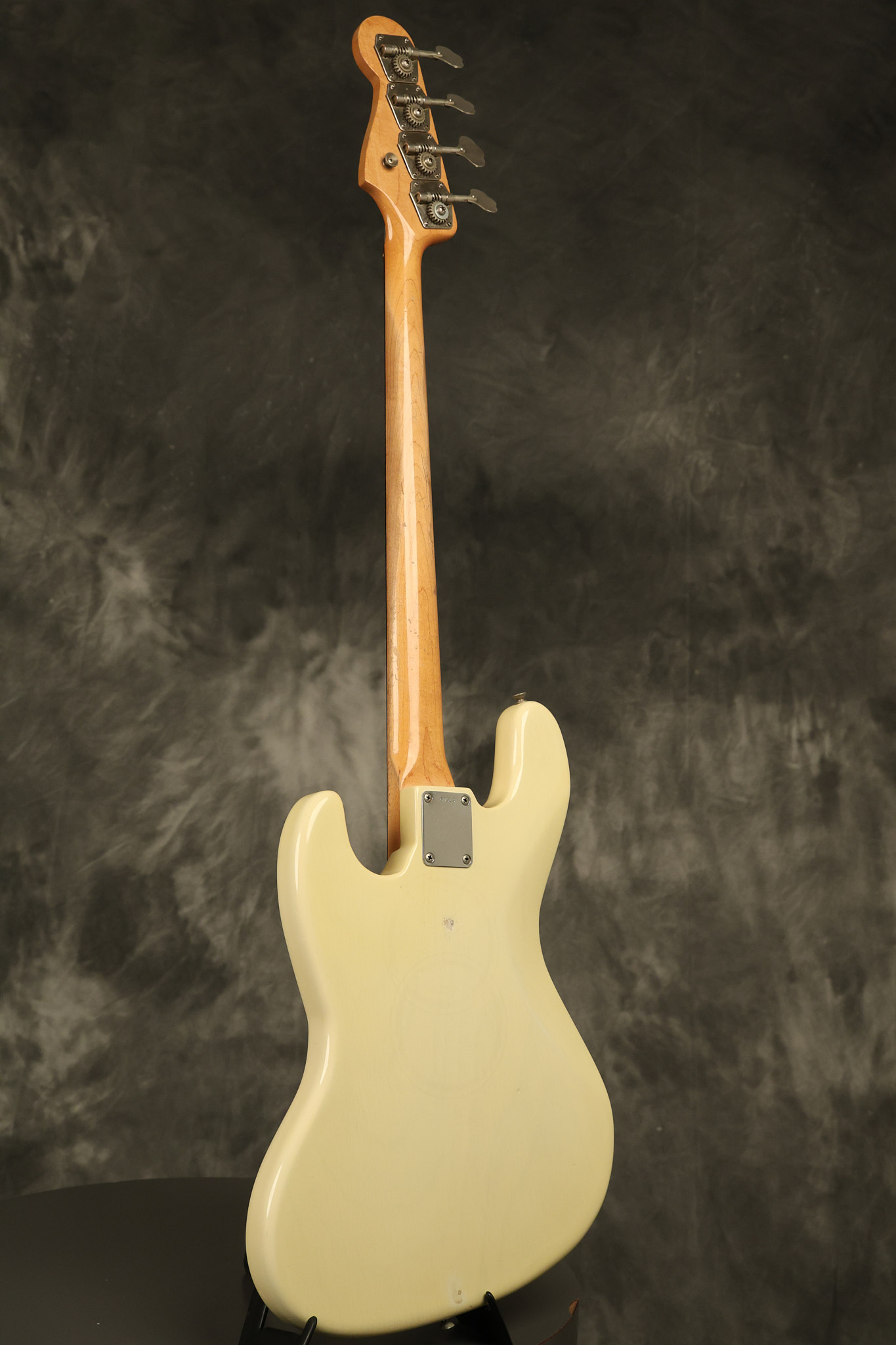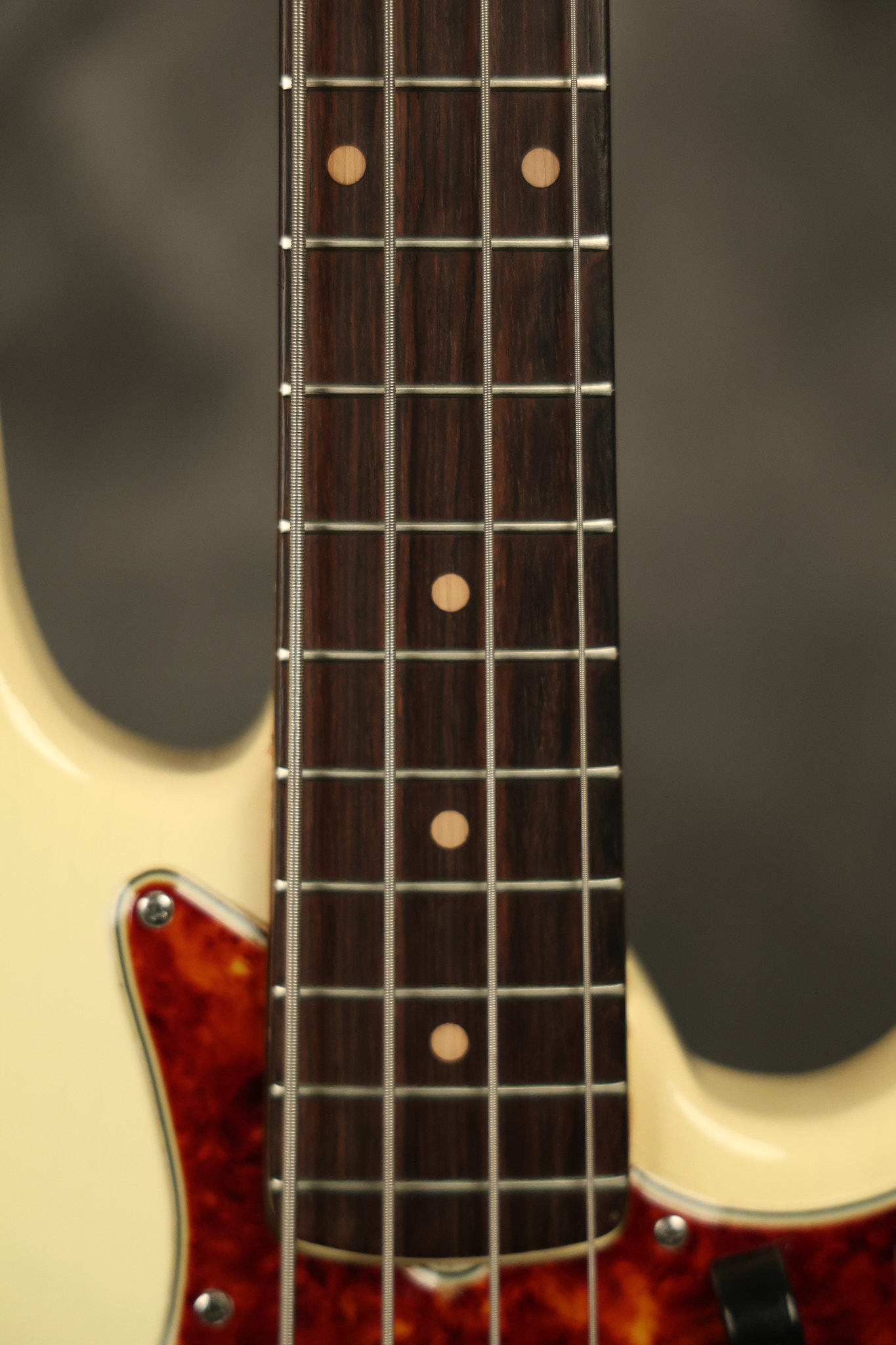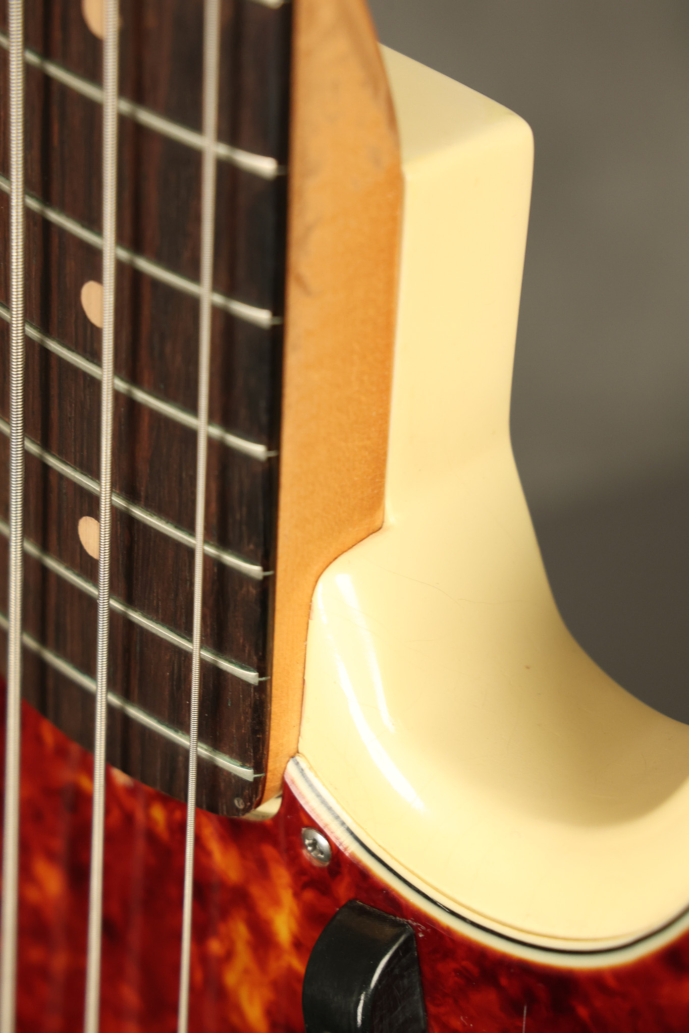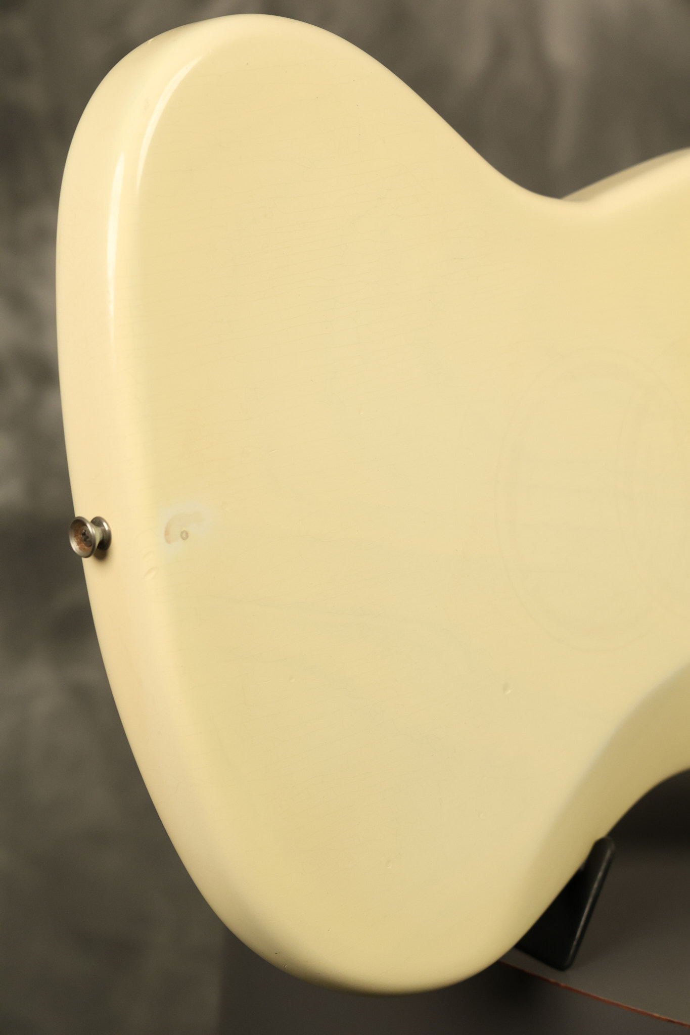 1961 Fender Jazz Bass "Stack Knob" with a body that has been refinished Blonde. Traces of original paint found underneath some parts indicate that it was originally Sunburst. The finish on the neck is original, but at the heel end of the neck the underside portion that is concealed in the neck pocket has been sanded. It has a great playing neck with great frets. Both pickups appear to have been rewound. All other parts appear to be original with the exception of one washer for one tuning key, one washer for one of the mutes and 3 of the 4 screws for the chrome covers. The original mutes are included along with the original Brown hardshell case. There are two areas on the back of the body where the finish was chipped/buffed out over the two factory dowels. There are nicks + dings, finish checking and other cosmetic wear including two faint rings in the finish of the back of the body. All electronics work and sound great, but the two original resistors have been removed. The weight is 8 lbs. 9 oz. without the covers.