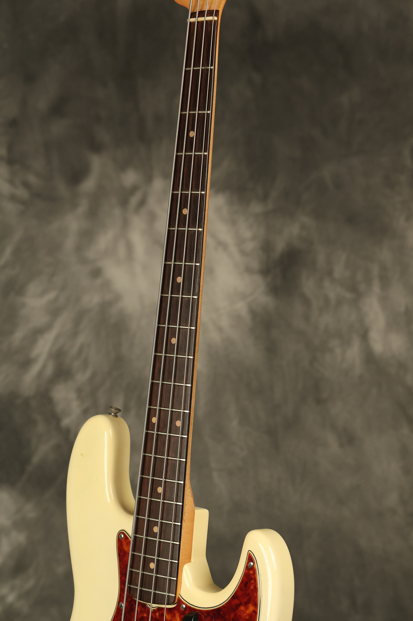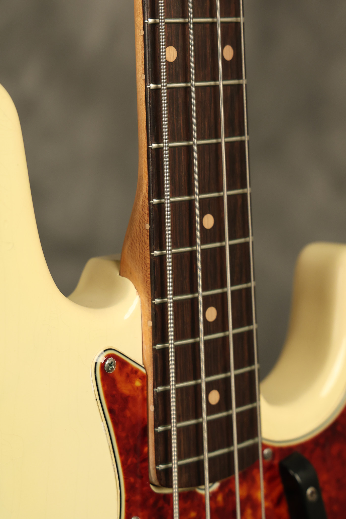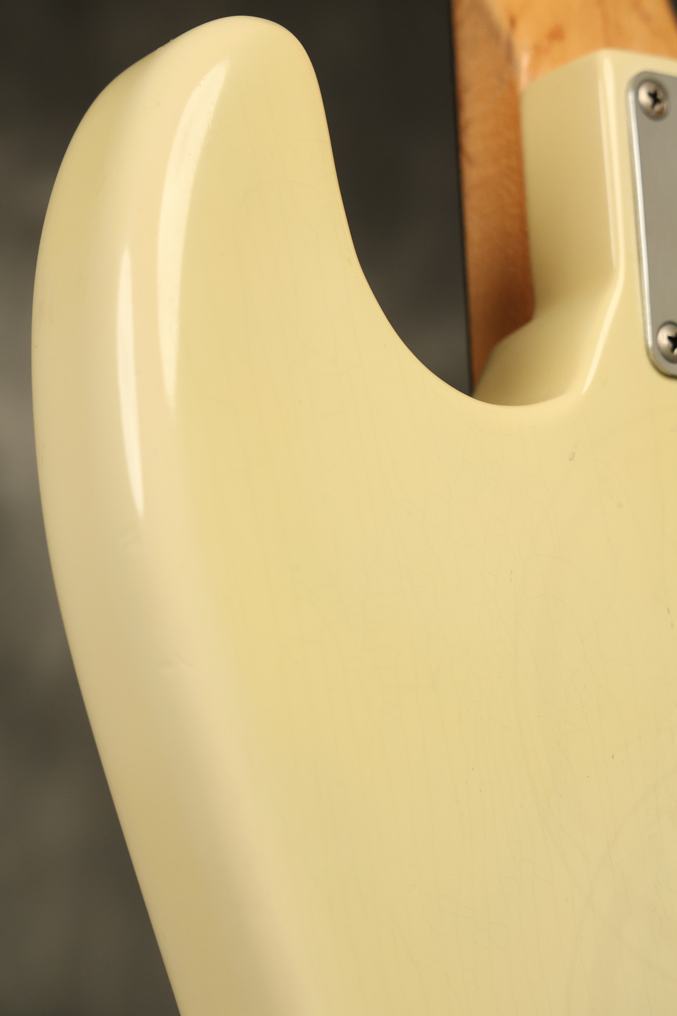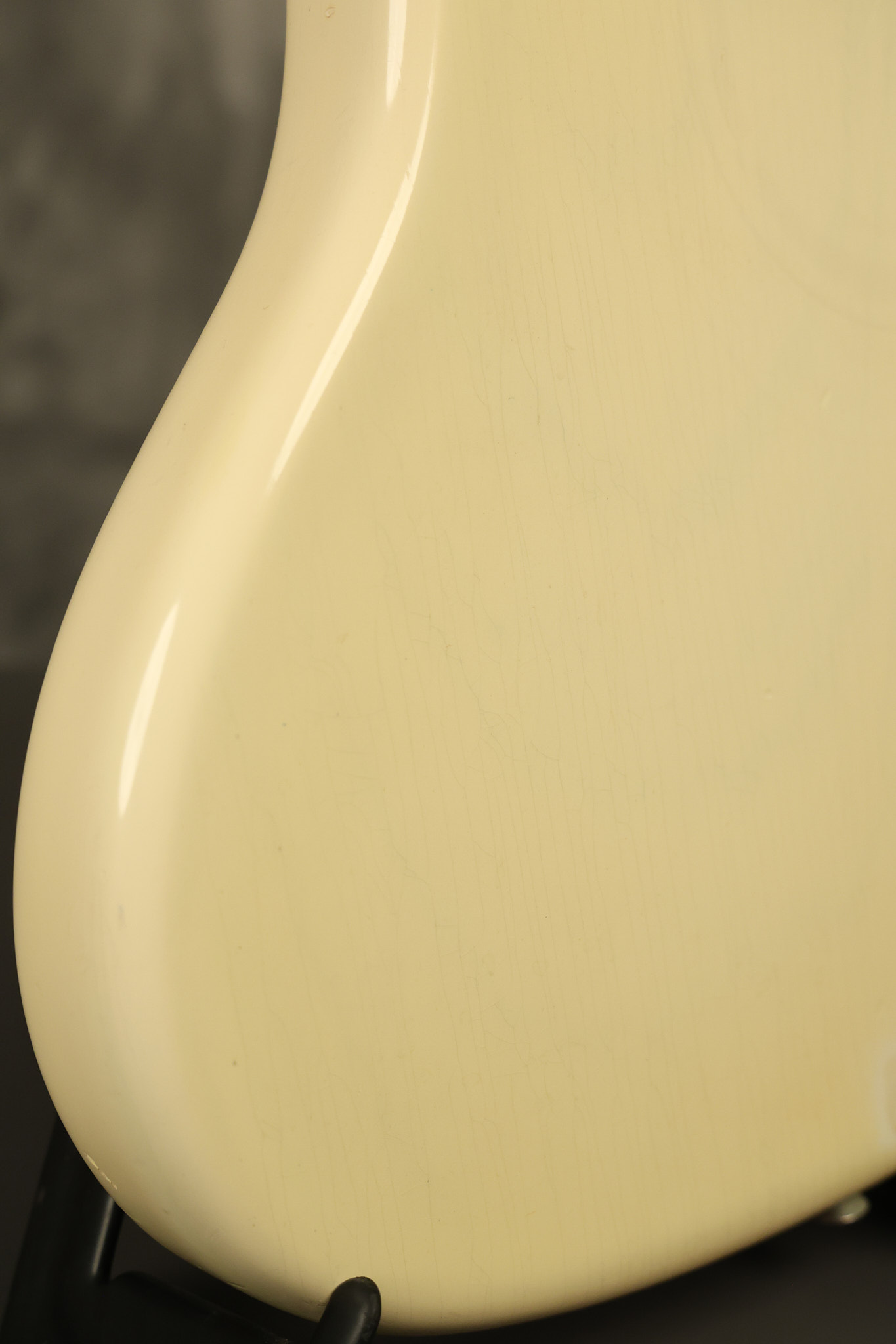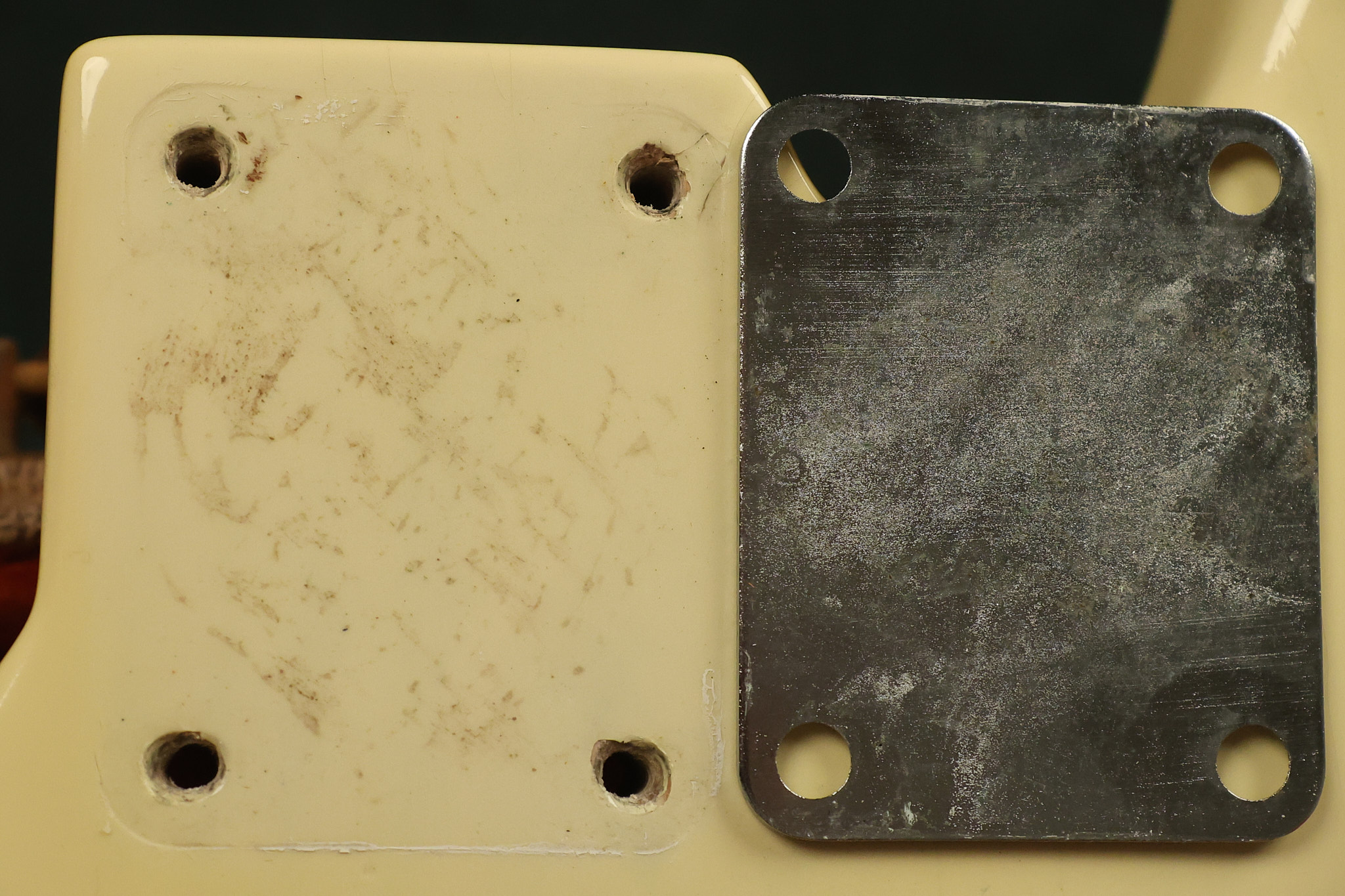1961 Fender Jazz Bass "Stack Knob" with a body that has been refinished Blonde. Traces of original paint found underneath some parts indicate that it was originally Sunburst. The finish on the neck is original, but at the heel end of the neck the underside portion that is concealed in the neck pocket has been sanded. It has a great playing neck with great frets. Both pickups appear to have been rewound. All other parts appear to be original with the exception of one washer for one tuning key, one washer for one of the mutes and 3 of the 4 screws for the chrome covers. The original mutes are included along with the original Brown hardshell case. There are two areas on the back of the body where the finish was chipped/buffed out over the two factory dowels. There are nicks + dings, finish checking and other cosmetic wear including two faint rings in the finish of the back of the body. All electronics work and sound great, but the two original resistors have been removed. The weight is 8 lbs. 9 oz. without the covers.