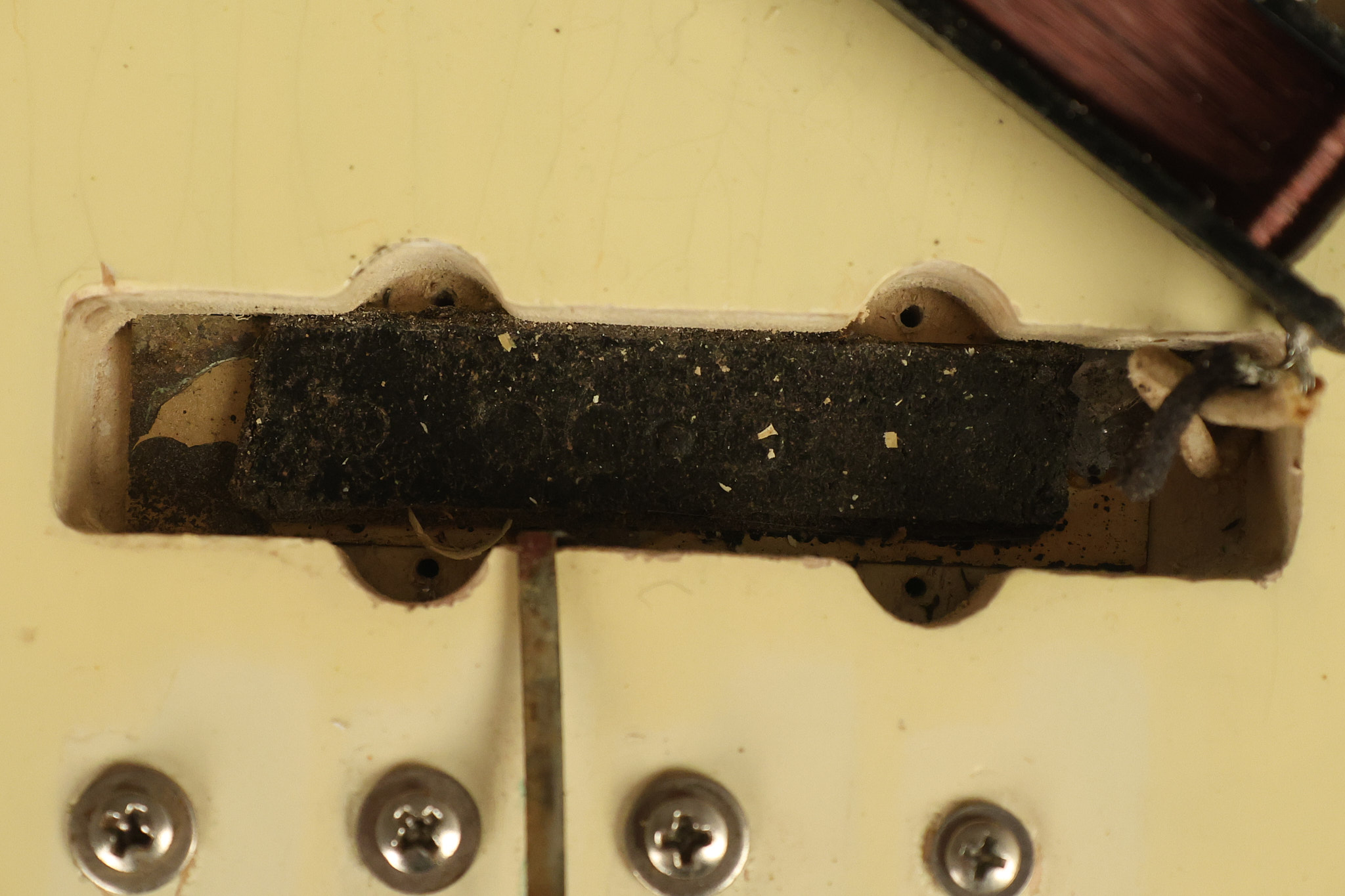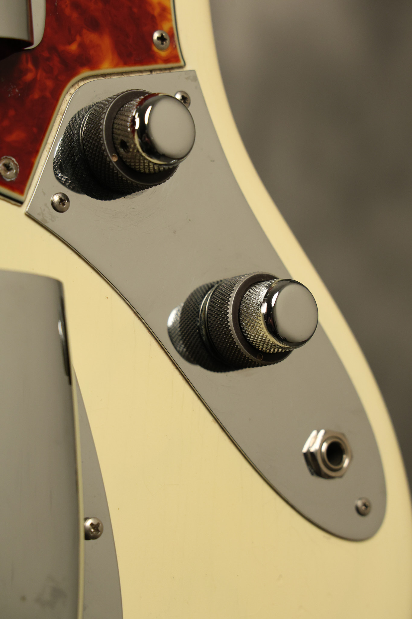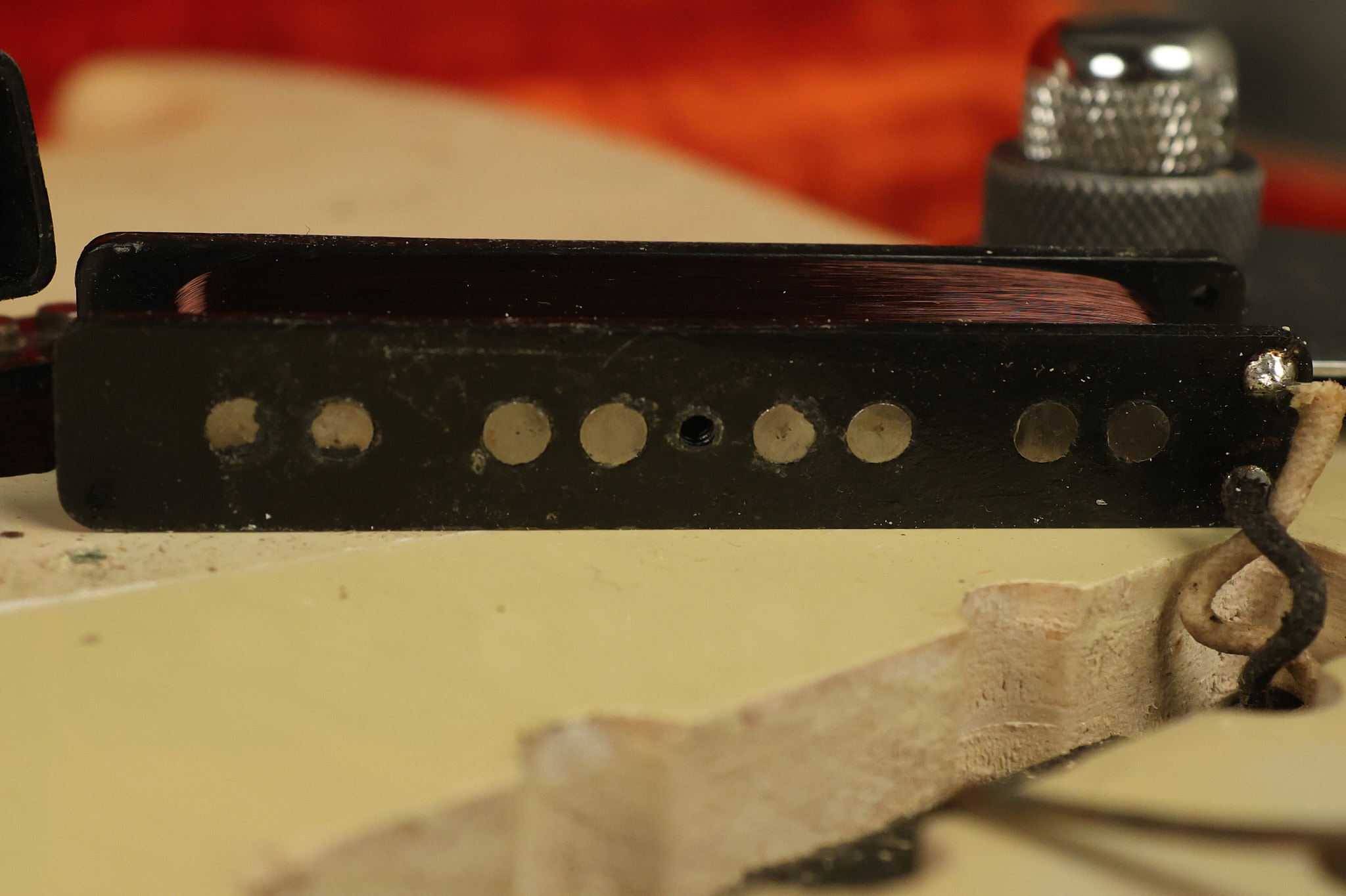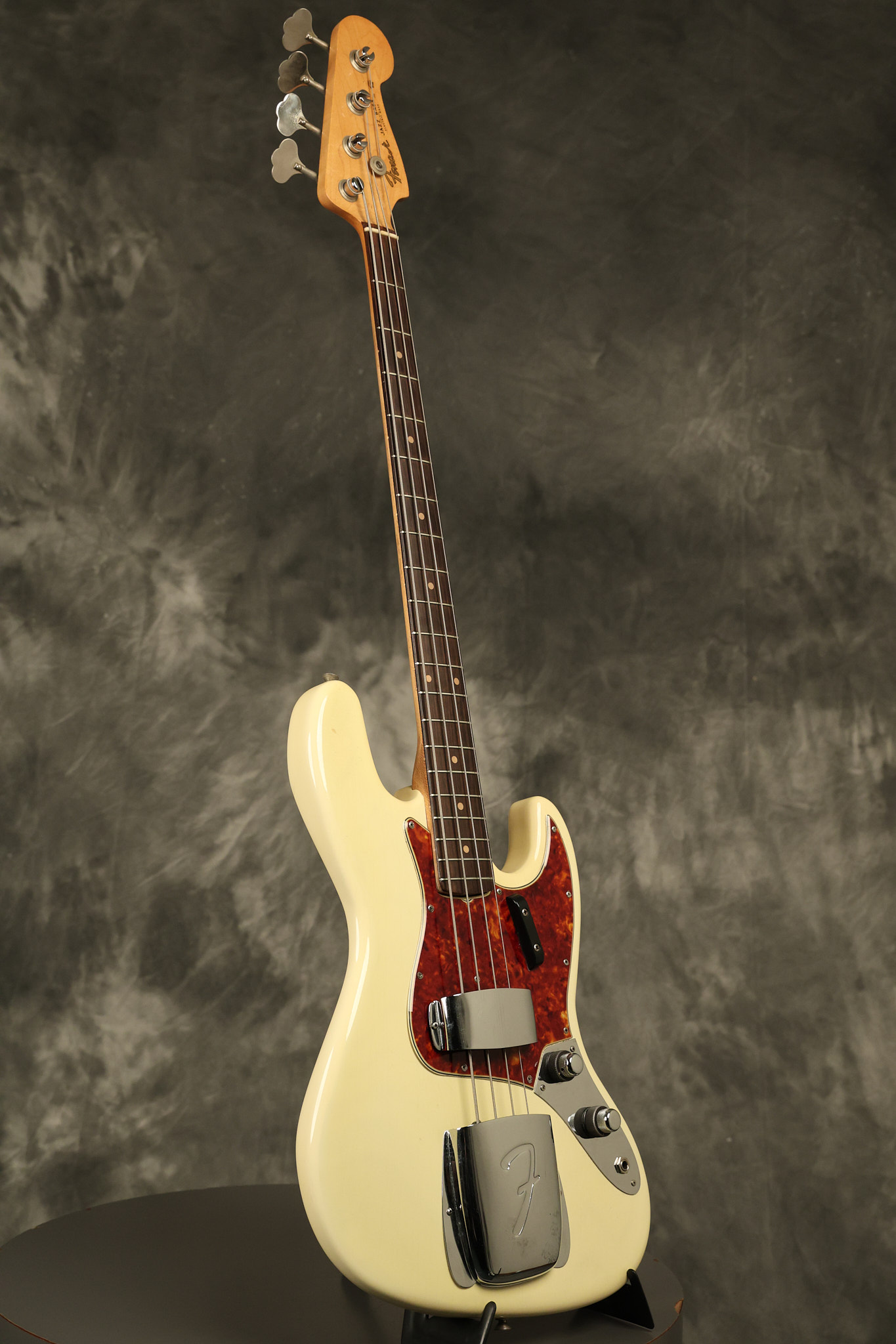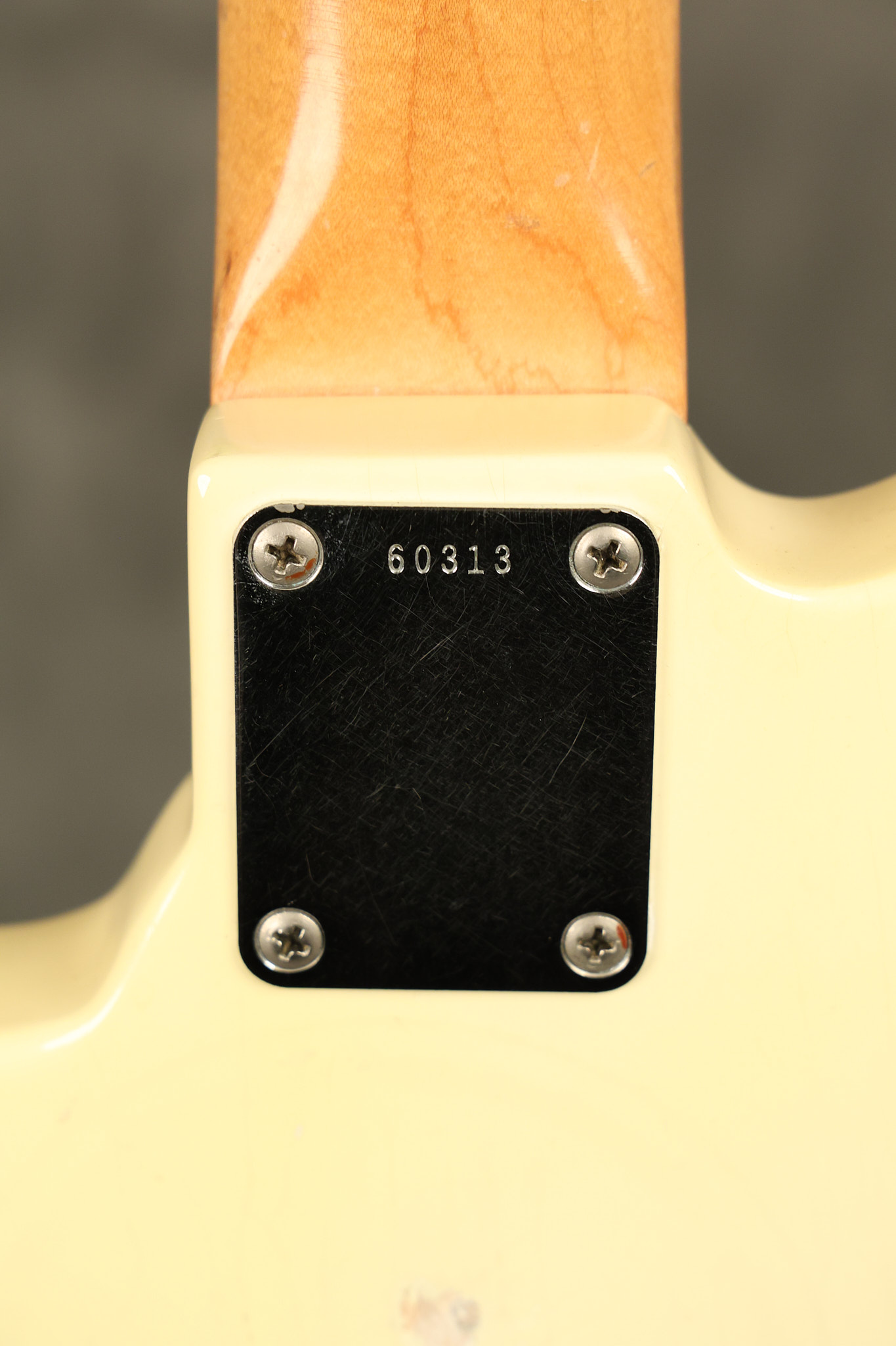 1961 Fender Jazz Bass "Stack Knob" with a body that has been refinished Blonde. Traces of original paint found underneath some parts indicate that it was originally Sunburst. The finish on the neck is original, but at the heel end of the neck the underside portion that is concealed in the neck pocket has been sanded. It has a great playing neck with great frets. Both pickups appear to have been rewound. All other parts appear to be original with the exception of one washer for one tuning key, one washer for one of the mutes and 3 of the 4 screws for the chrome covers. The original mutes are included along with the original Brown hardshell case. There are two areas on the back of the body where the finish was chipped/buffed out over the two factory dowels. There are nicks + dings, finish checking and other cosmetic wear including two faint rings in the finish of the back of the body. All electronics work and sound great, but the two original resistors have been removed. The weight is 8 lbs. 9 oz. without the covers.